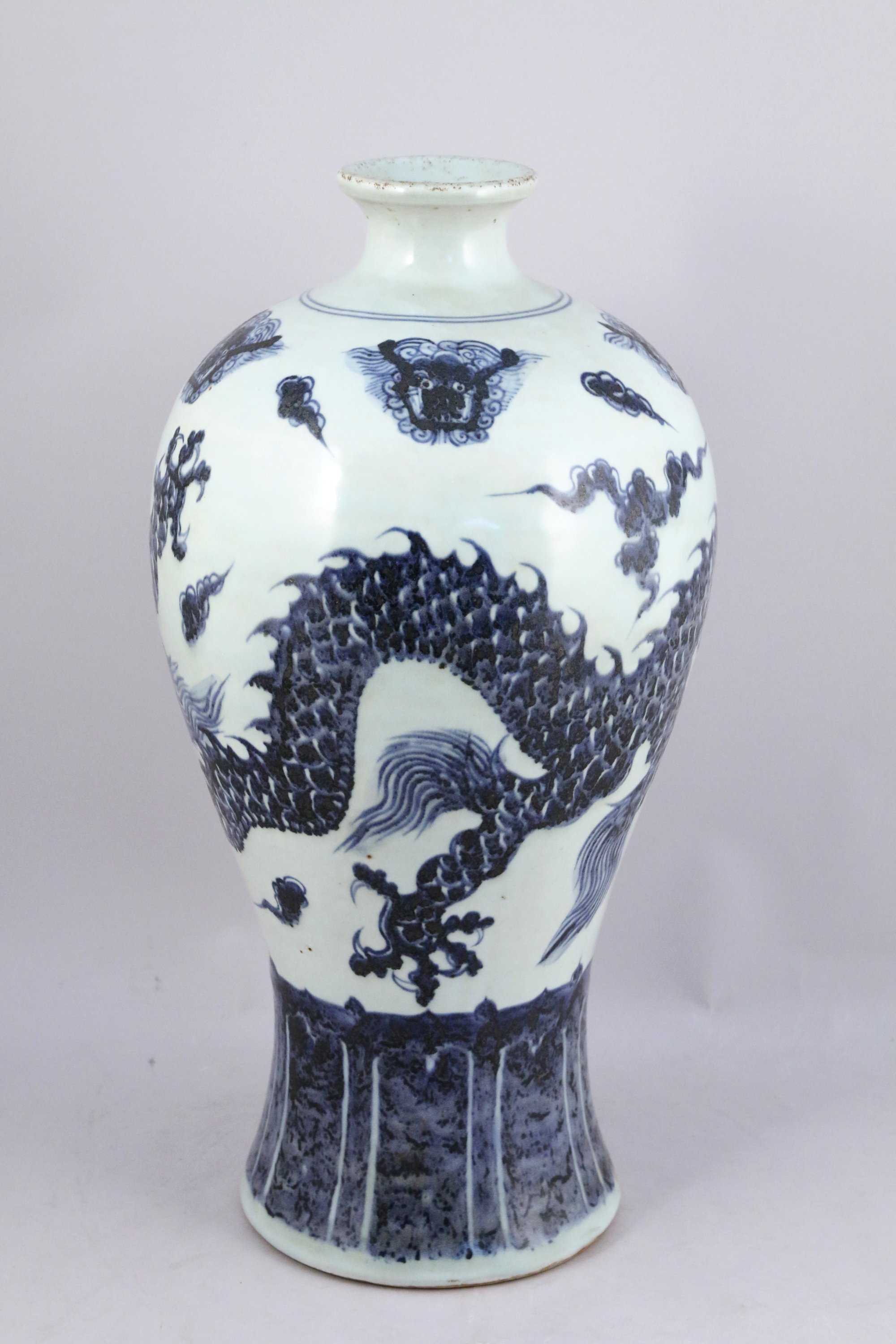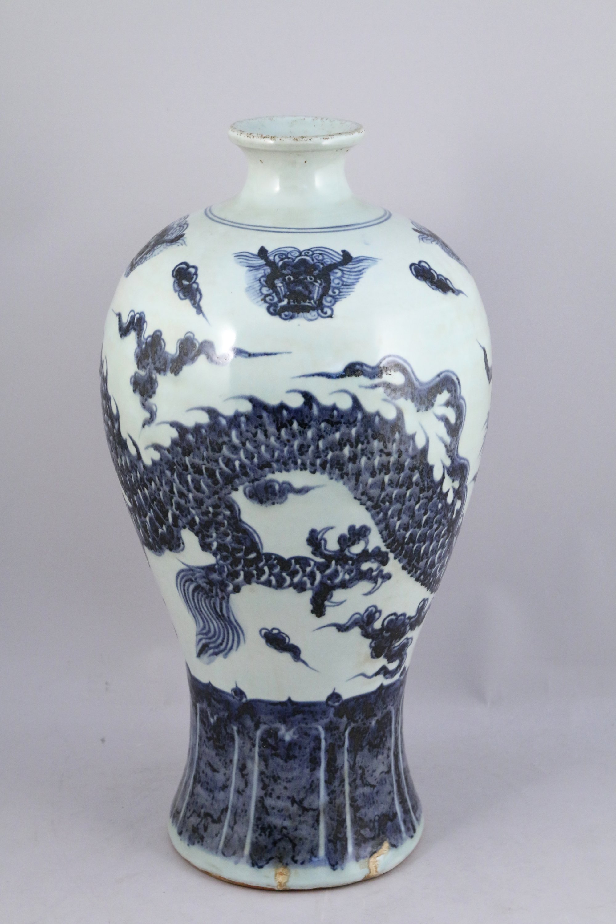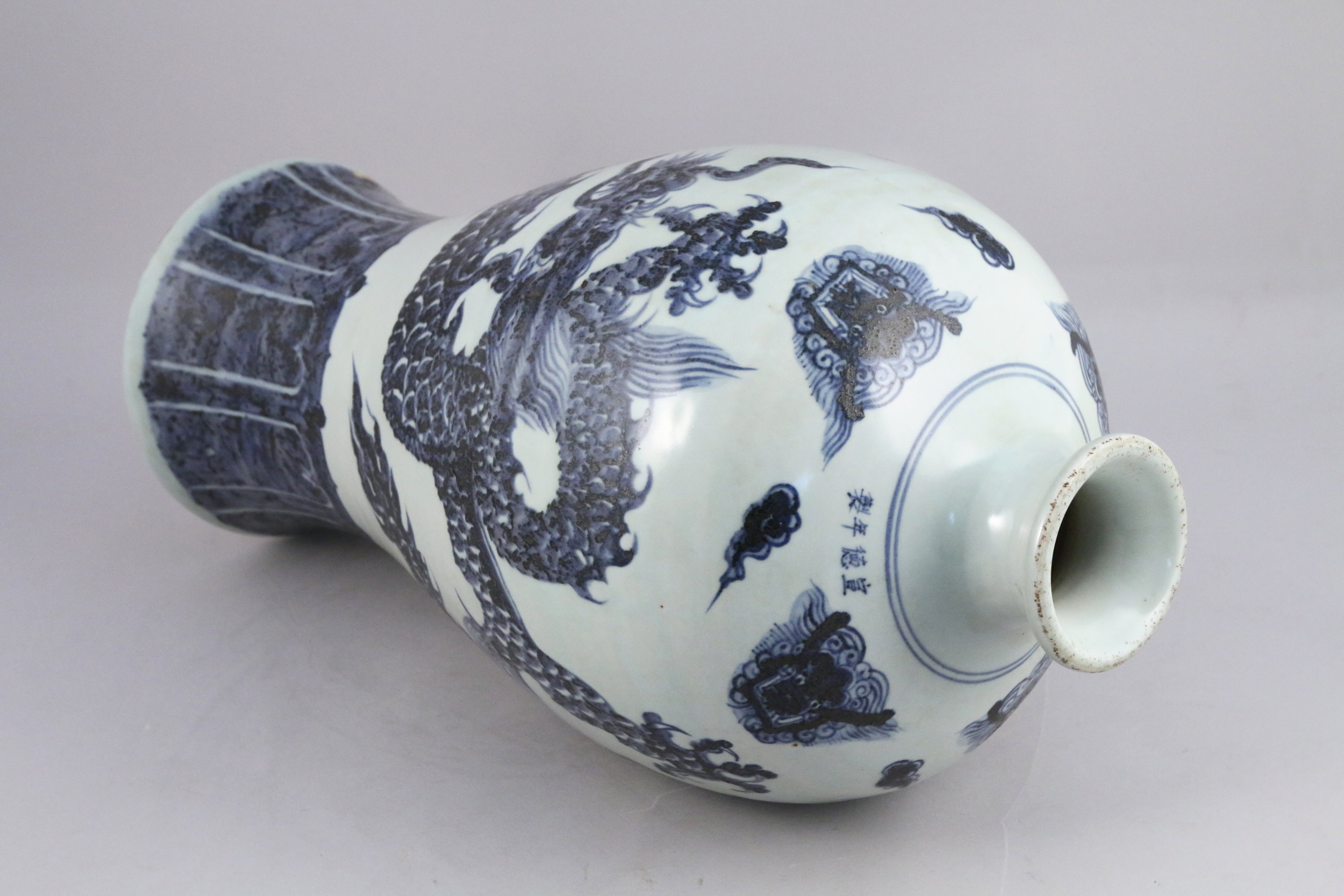 VASE Meiping en porcelaine bleu et blanc à décor d'un dragon à cinq griffes, marque à quatre caractères.