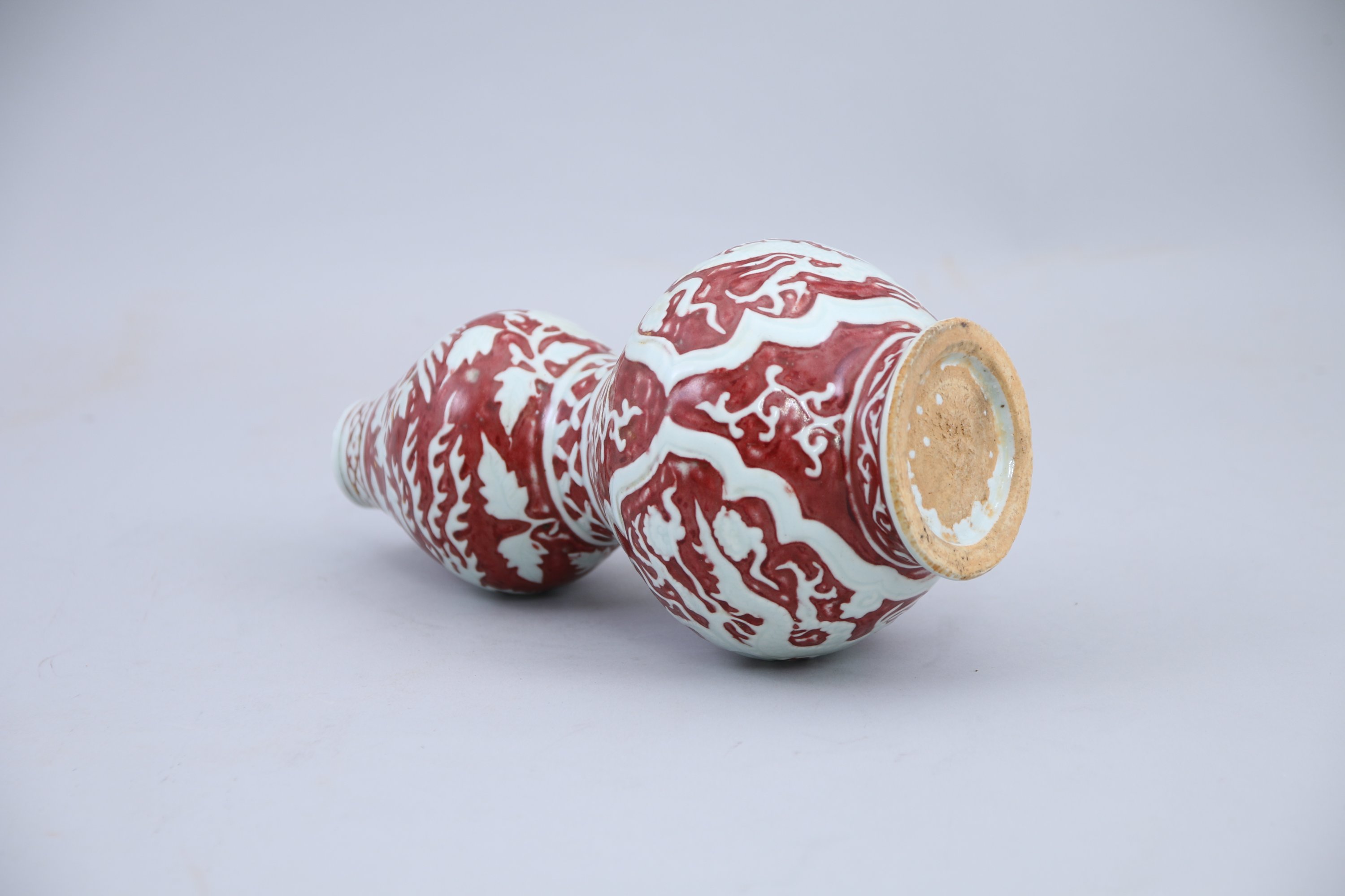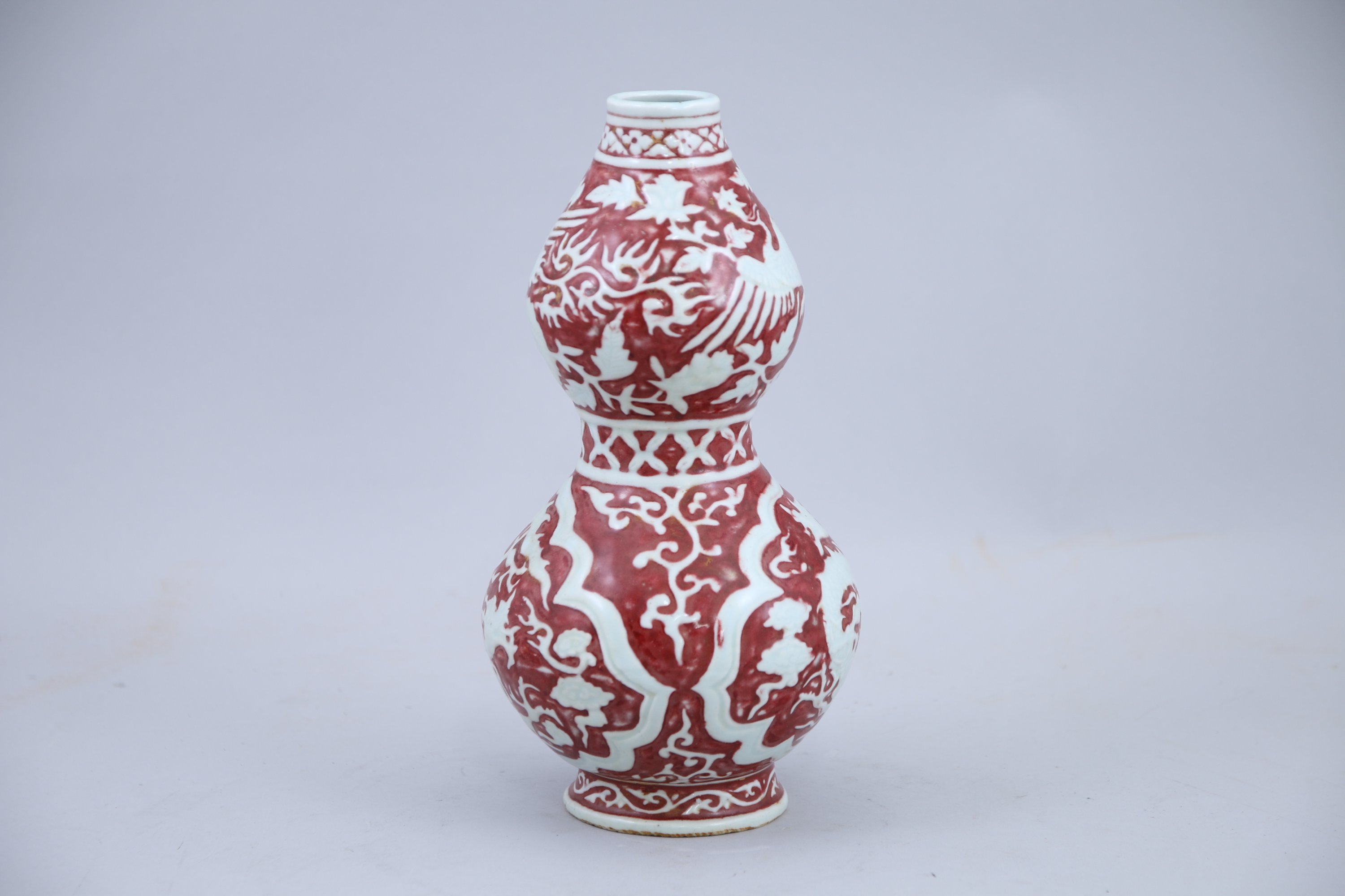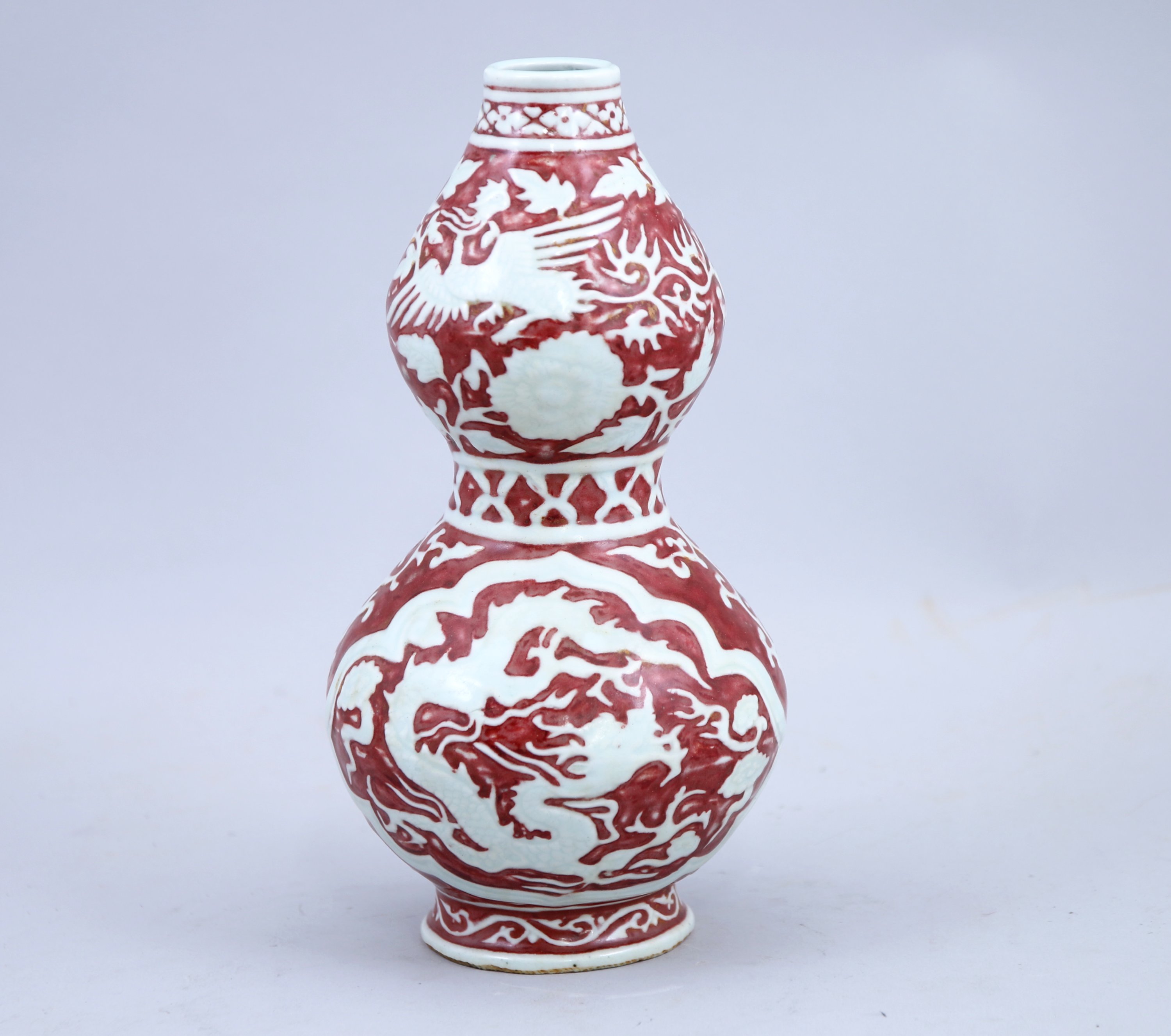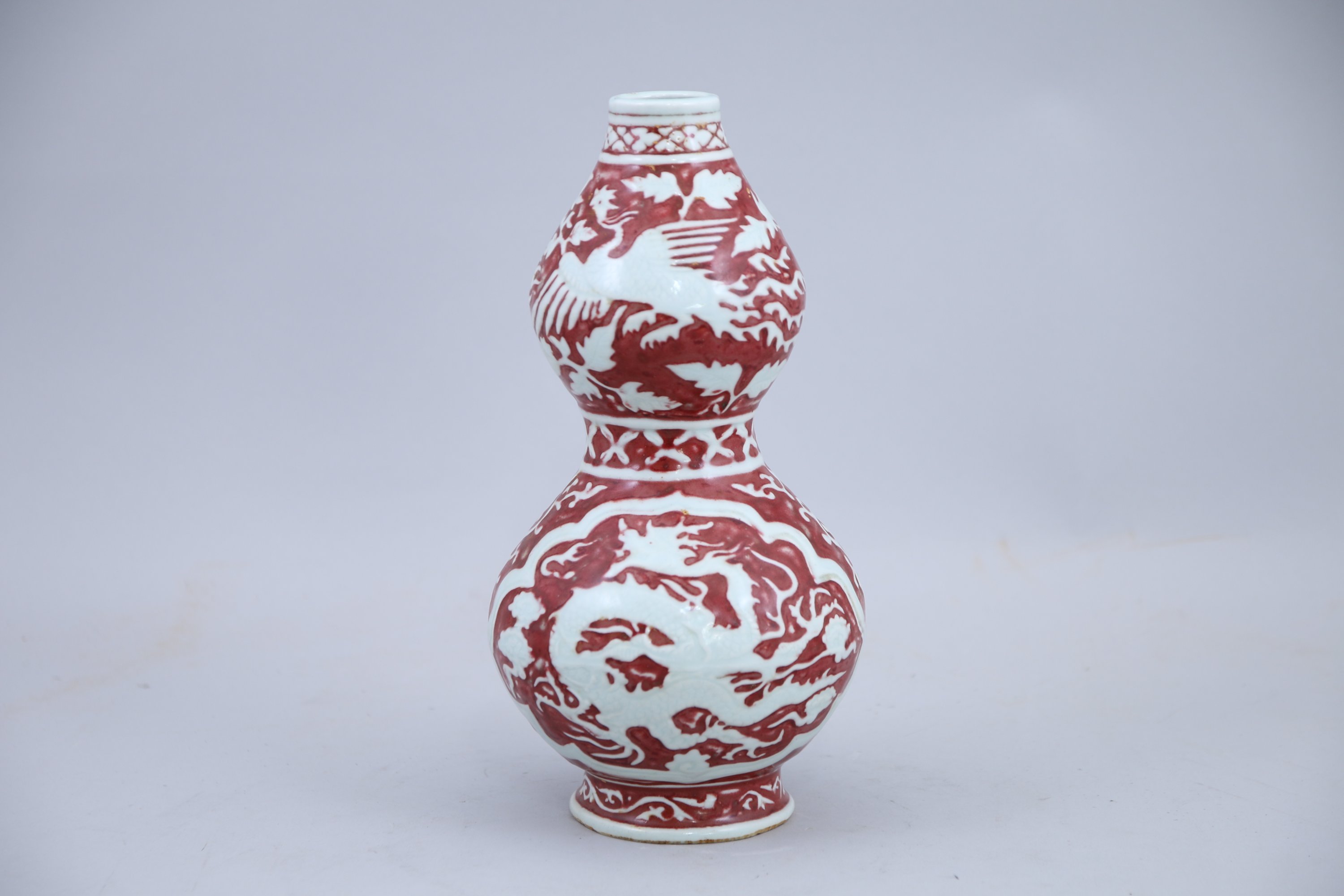 VASE de forme double gourde en porcelaine décorée en rouge de cuivre sur la panse de dragon pourchassant la perle sacrée et sur le col d'un phénix en partie haute. Frise à croisillons en partie médiane et entrelacs sur le pied.