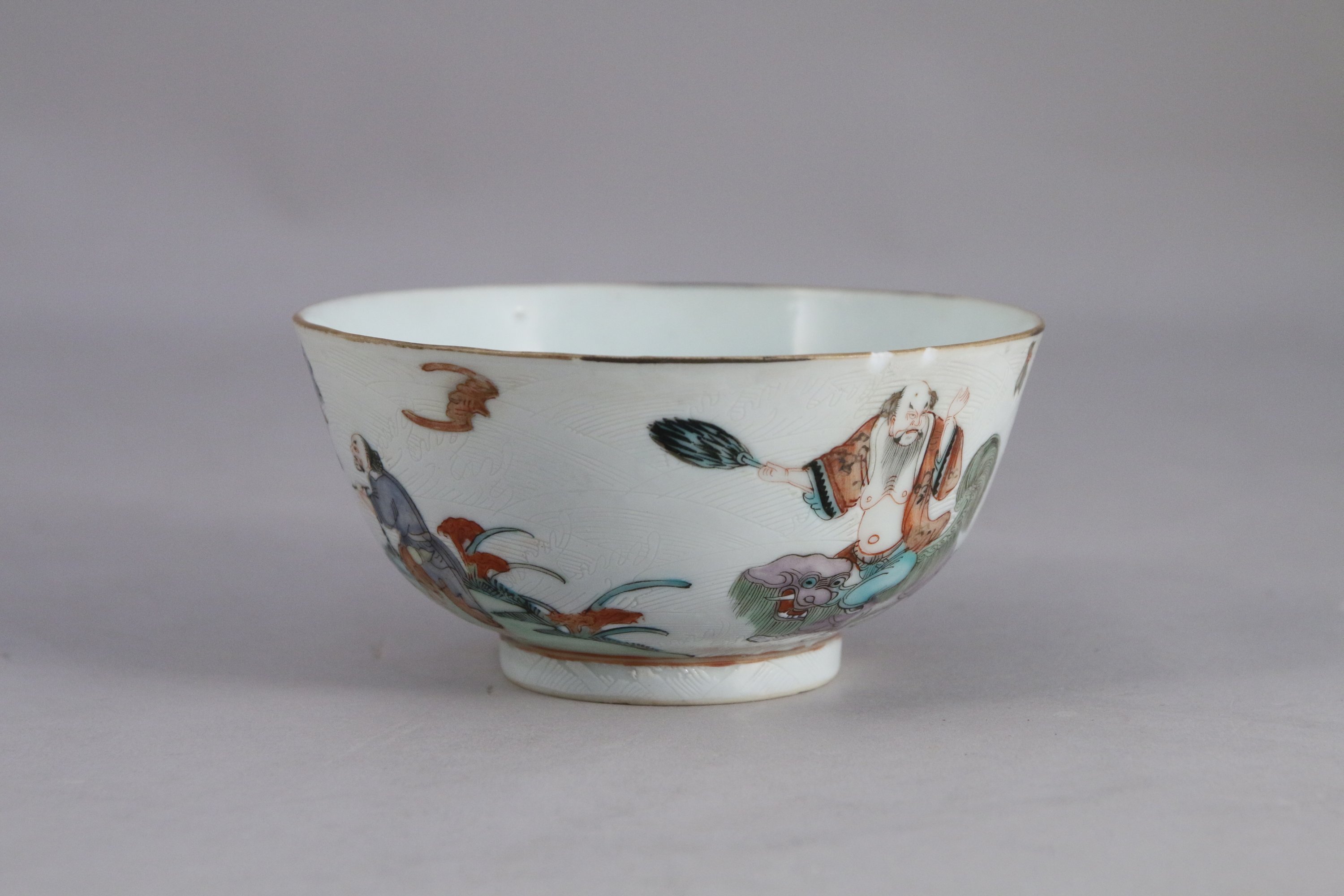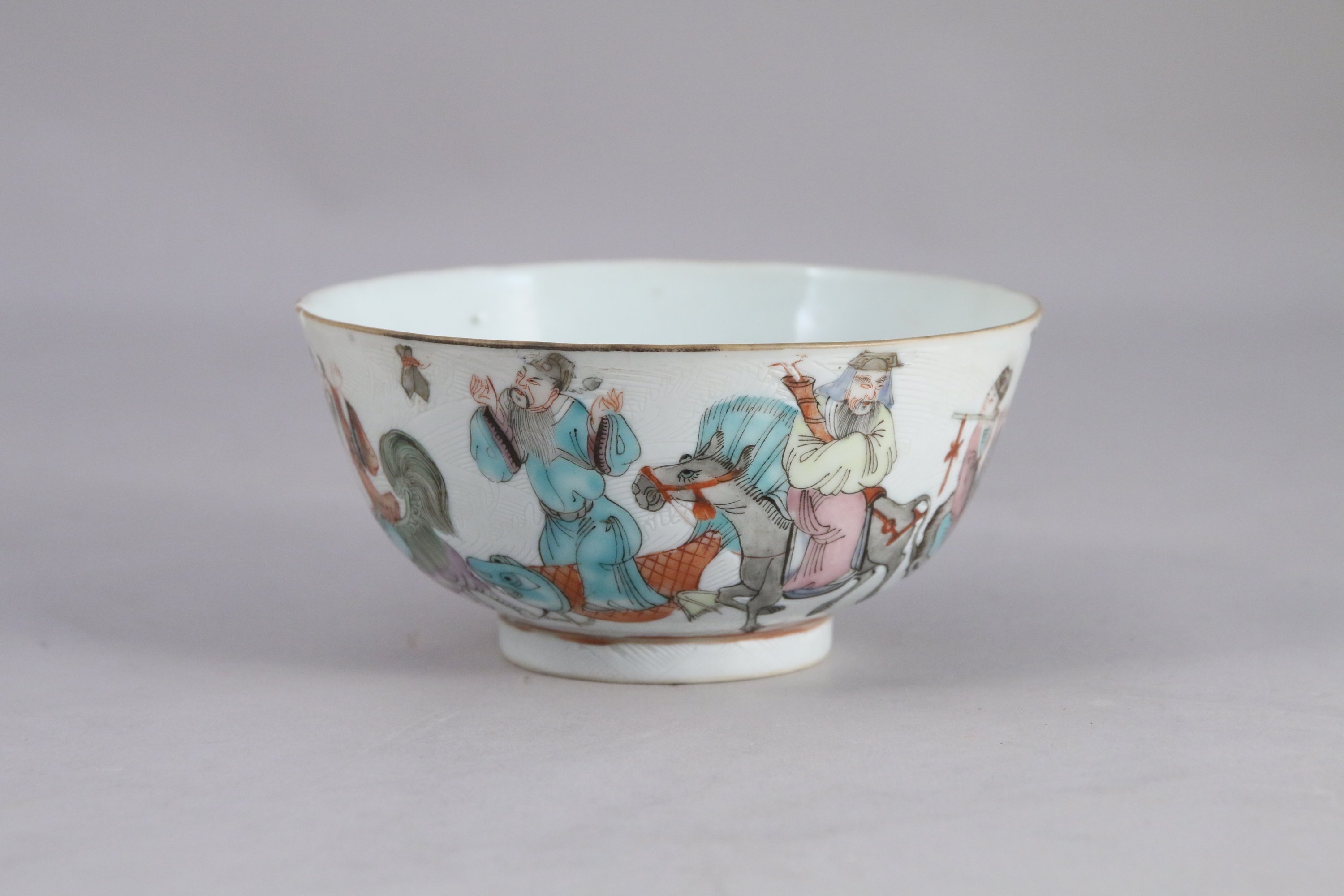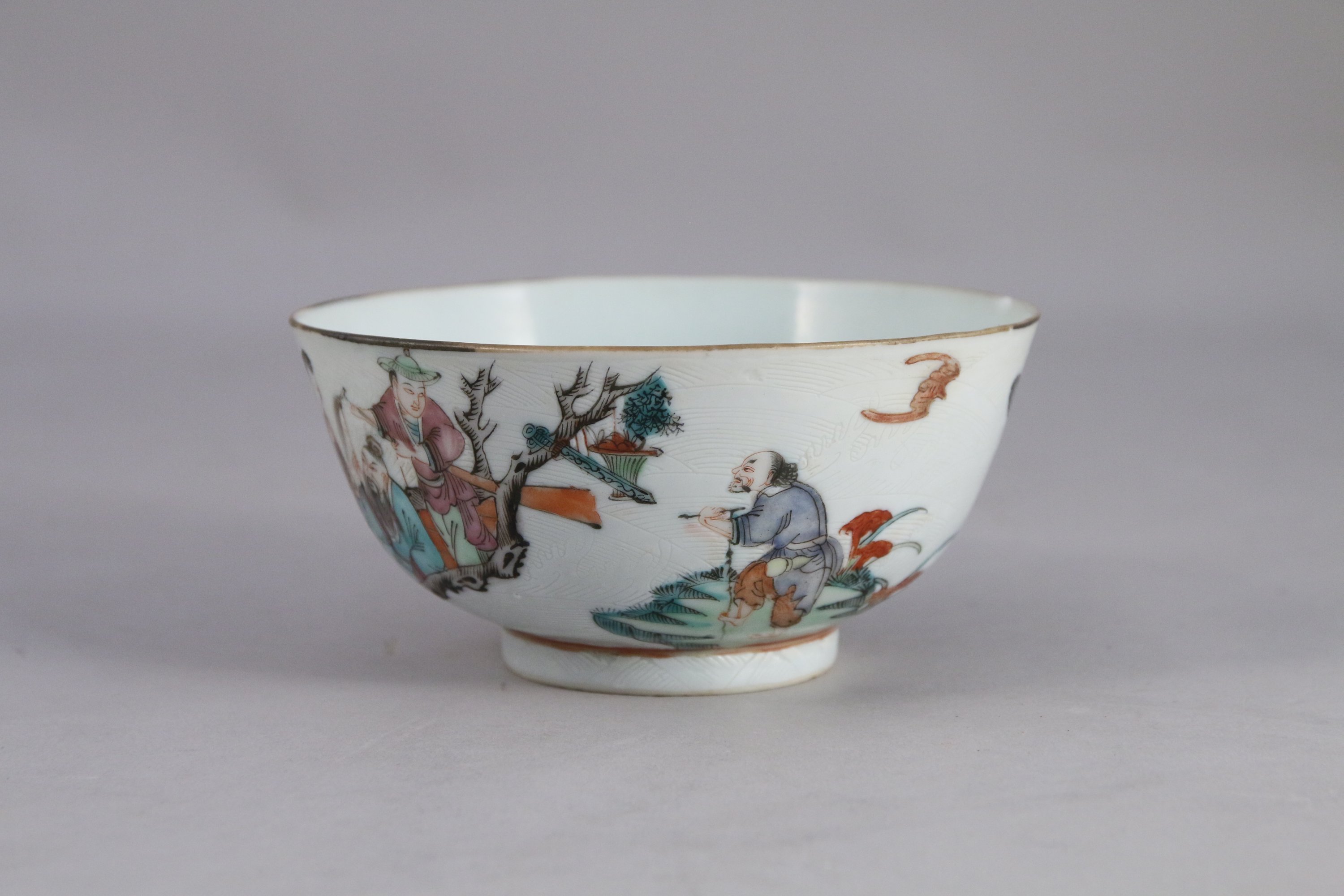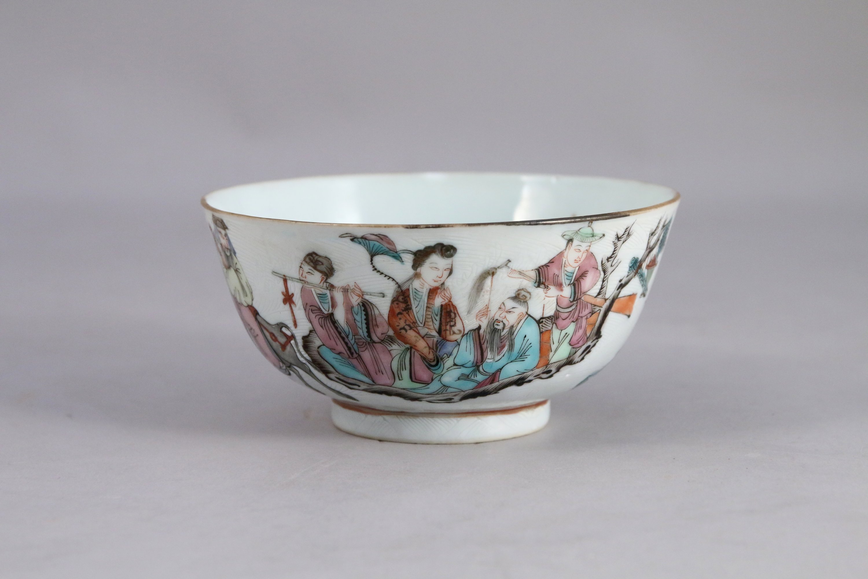 BOL en porcelaine à décor émaillé de musiciens, le fond incisé en sgraffiato. Marque rouge à six caractères.