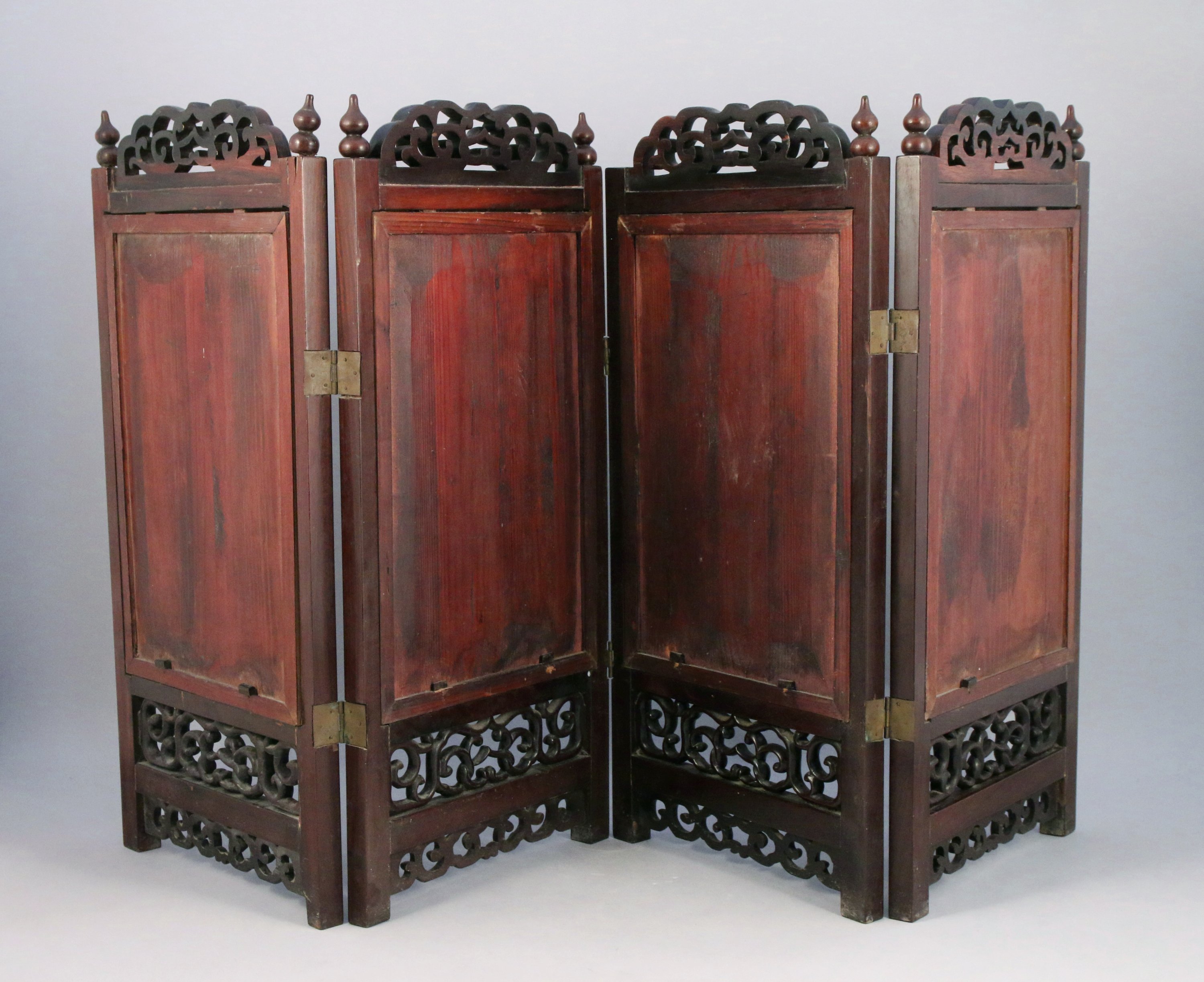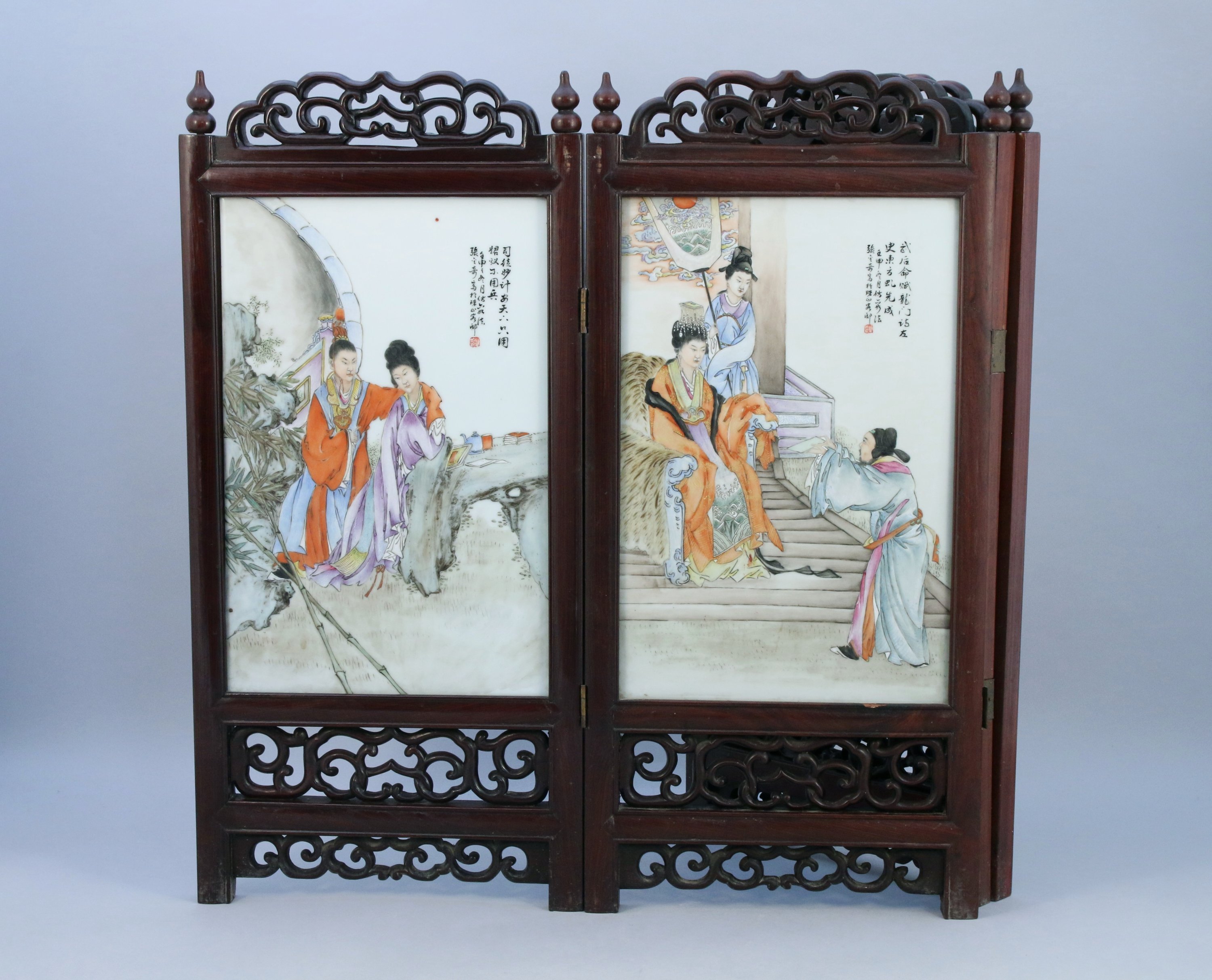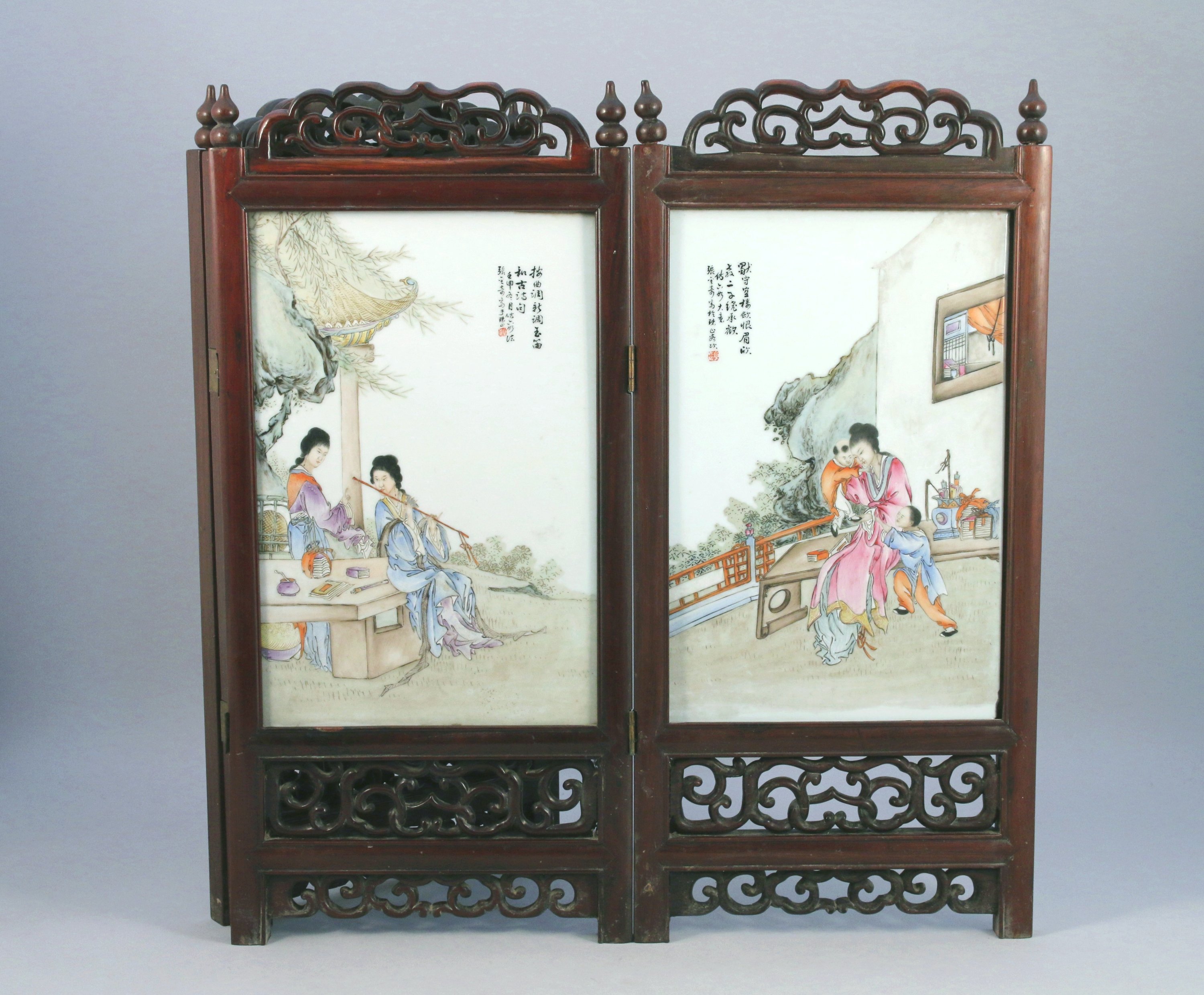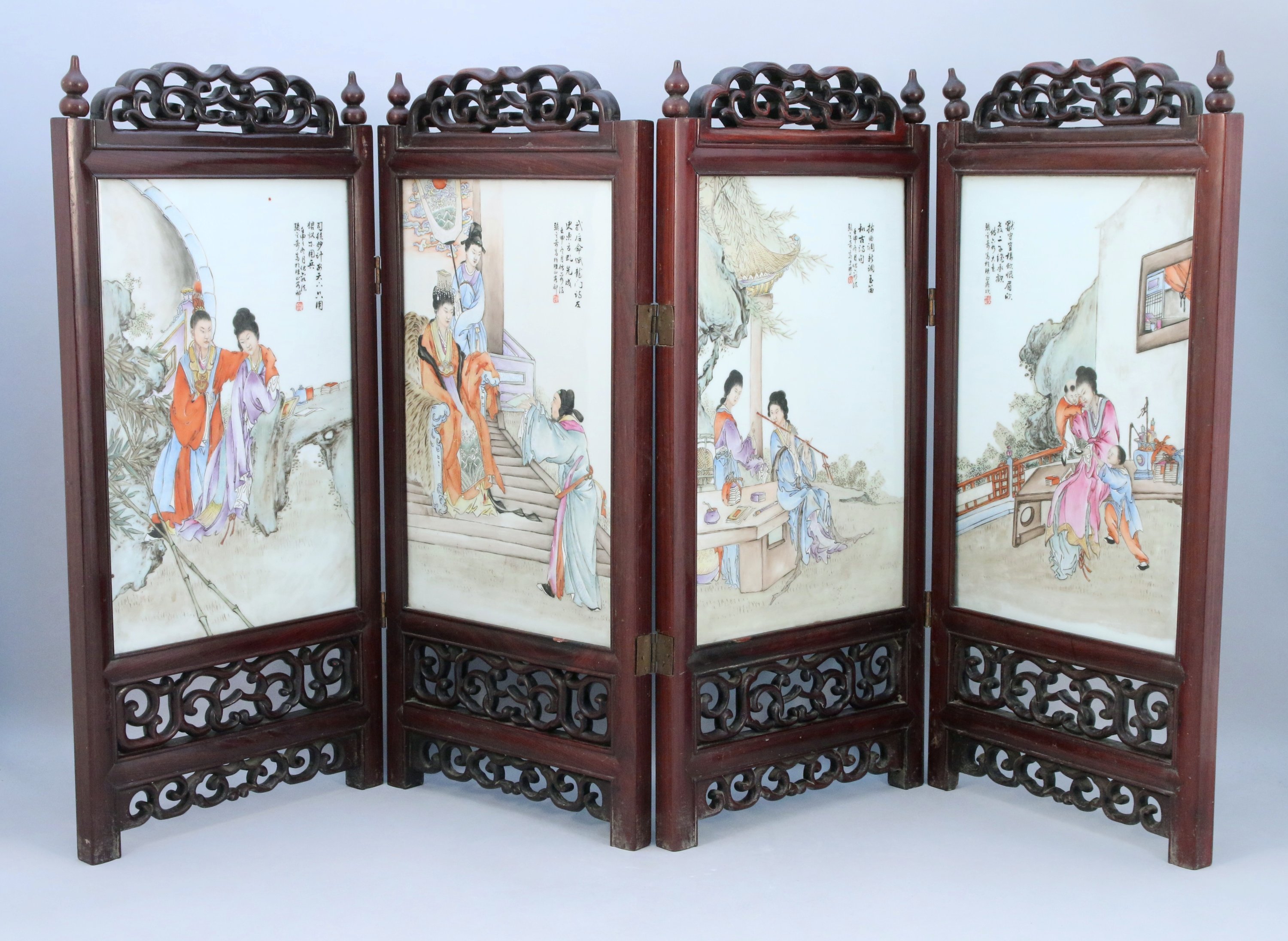 PARAVENT à quatre feuilles en bois, chaque feuille à décor incrusté de quatre plaques de porcelaine émaillée polychrome de jeunes femmes et enfants. Signé ZHANG Yunqi.