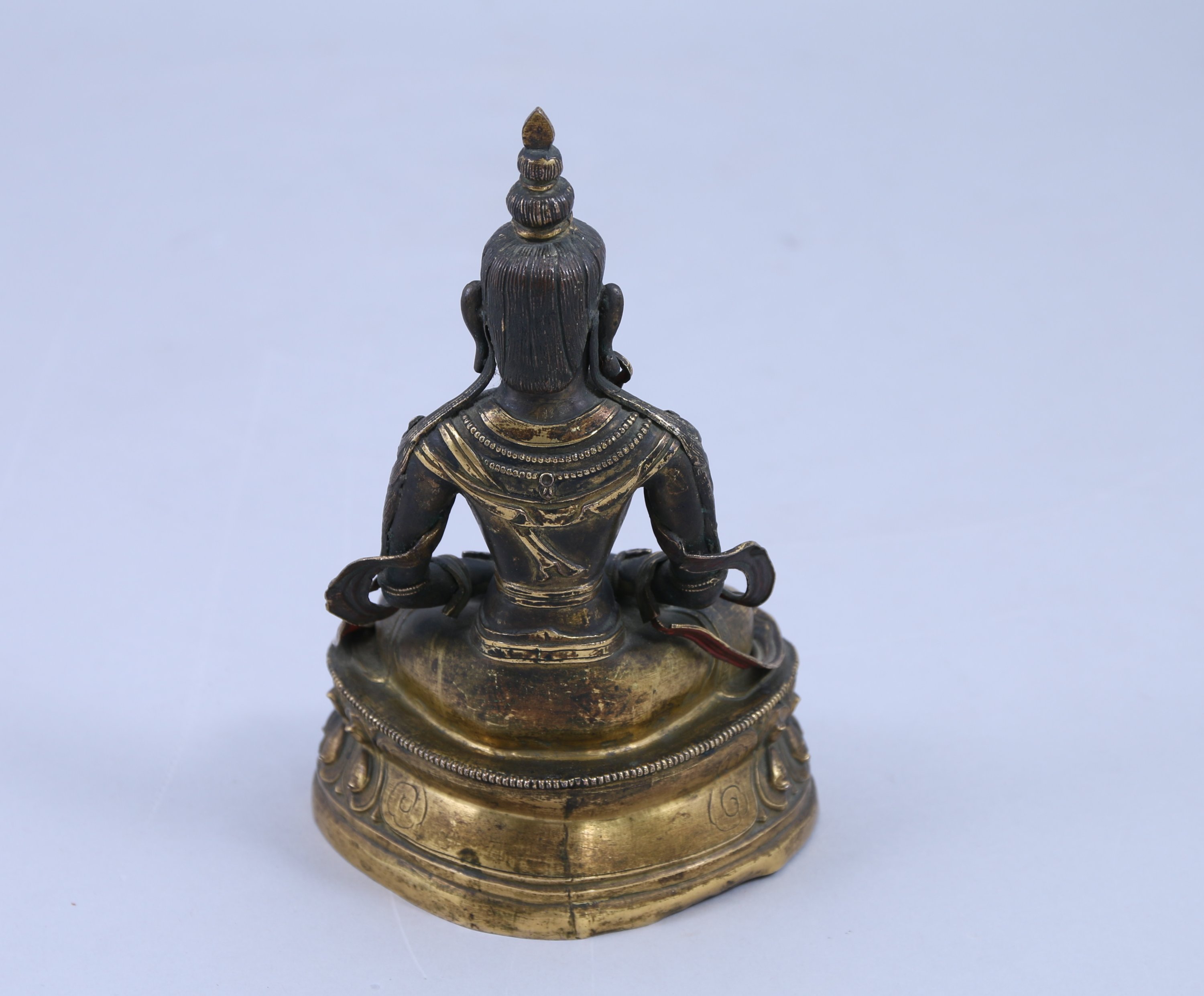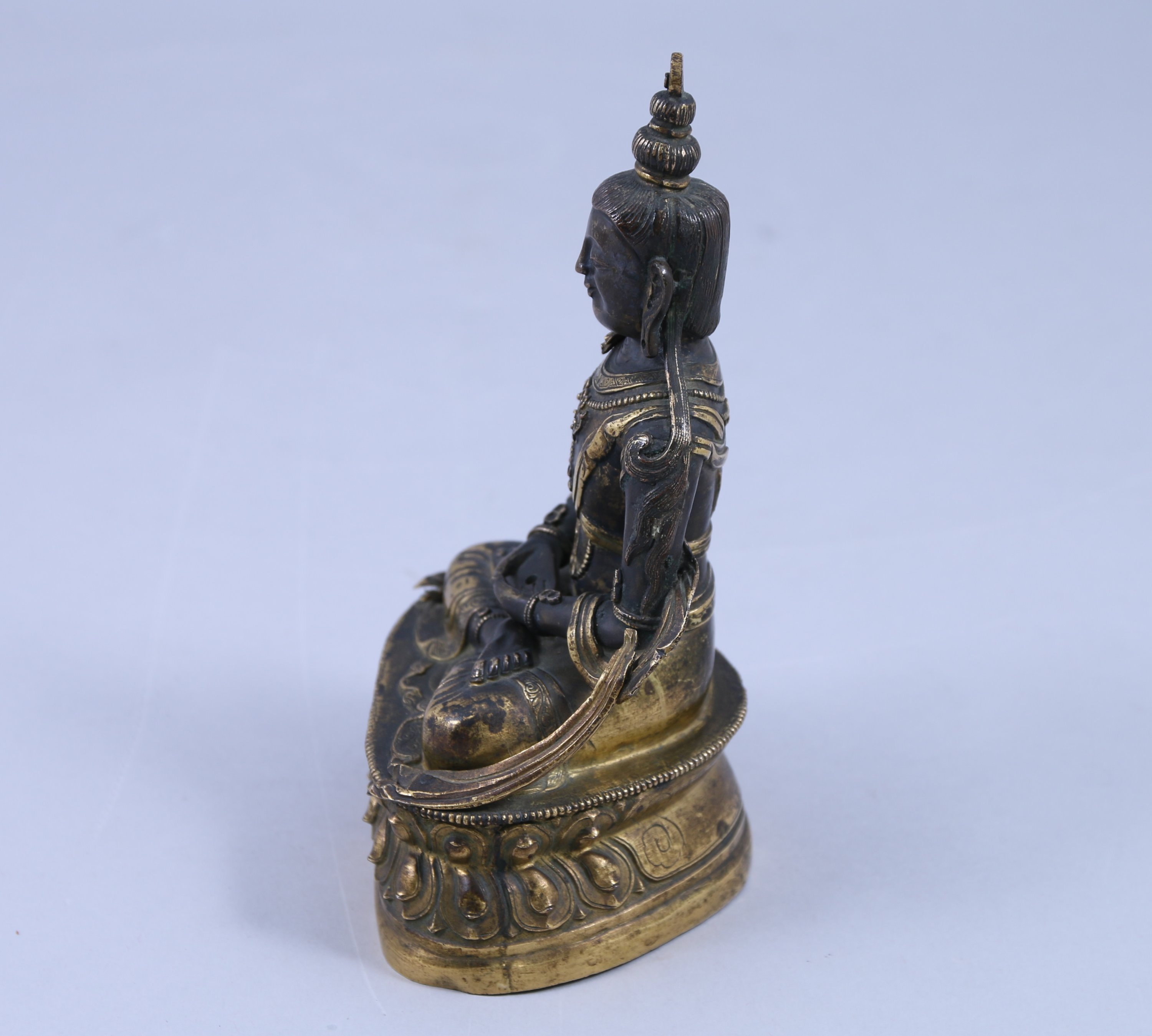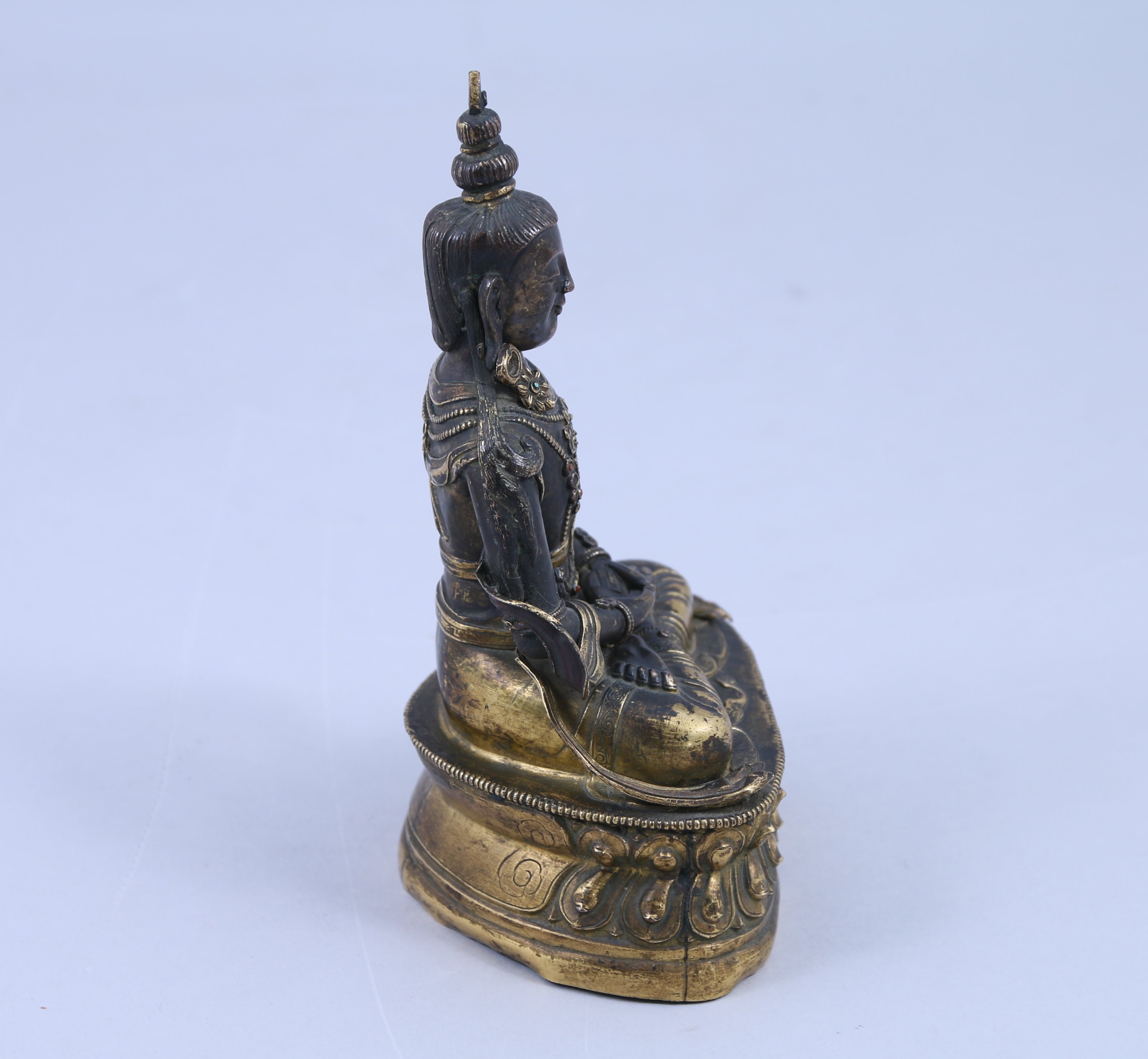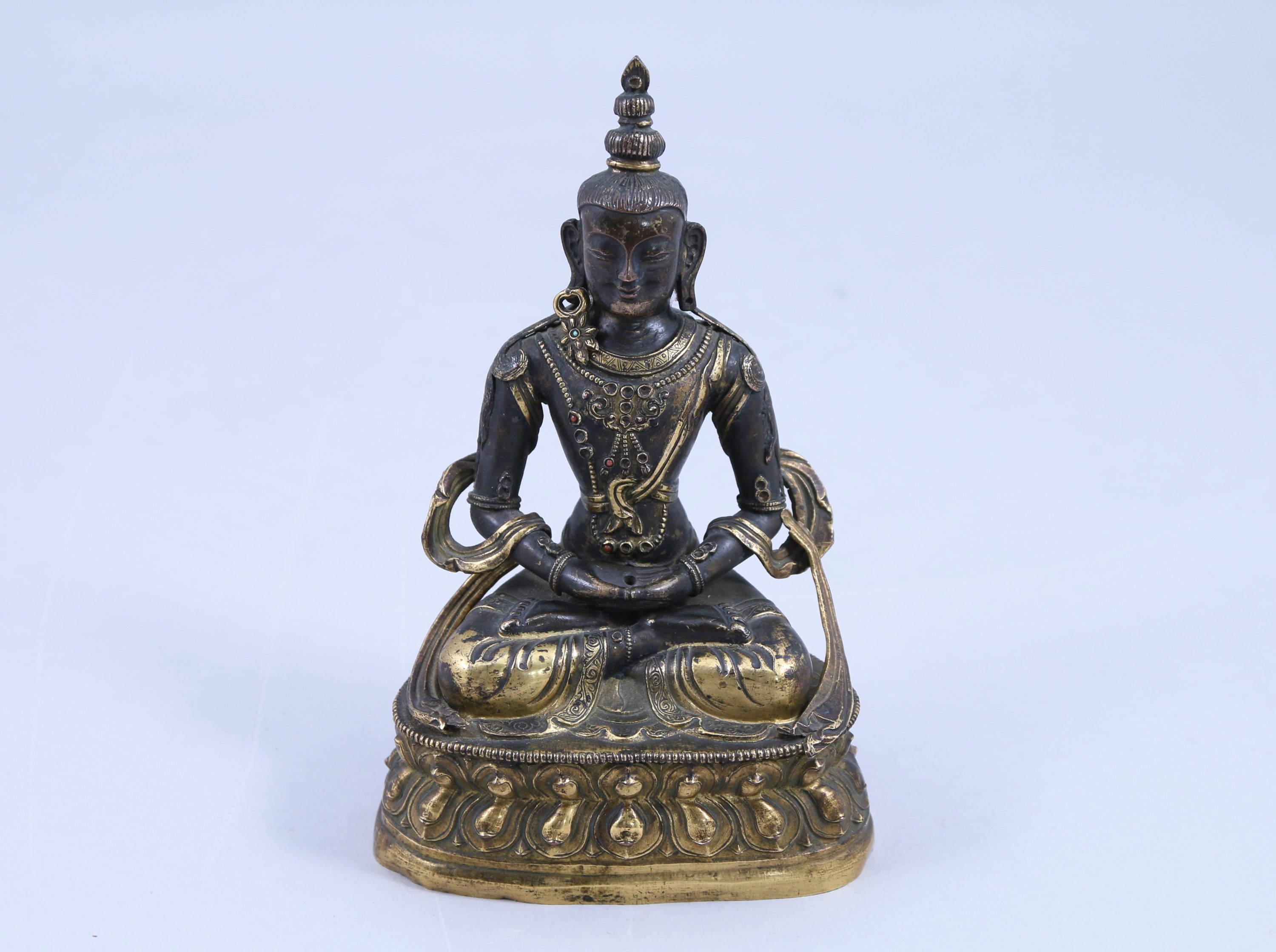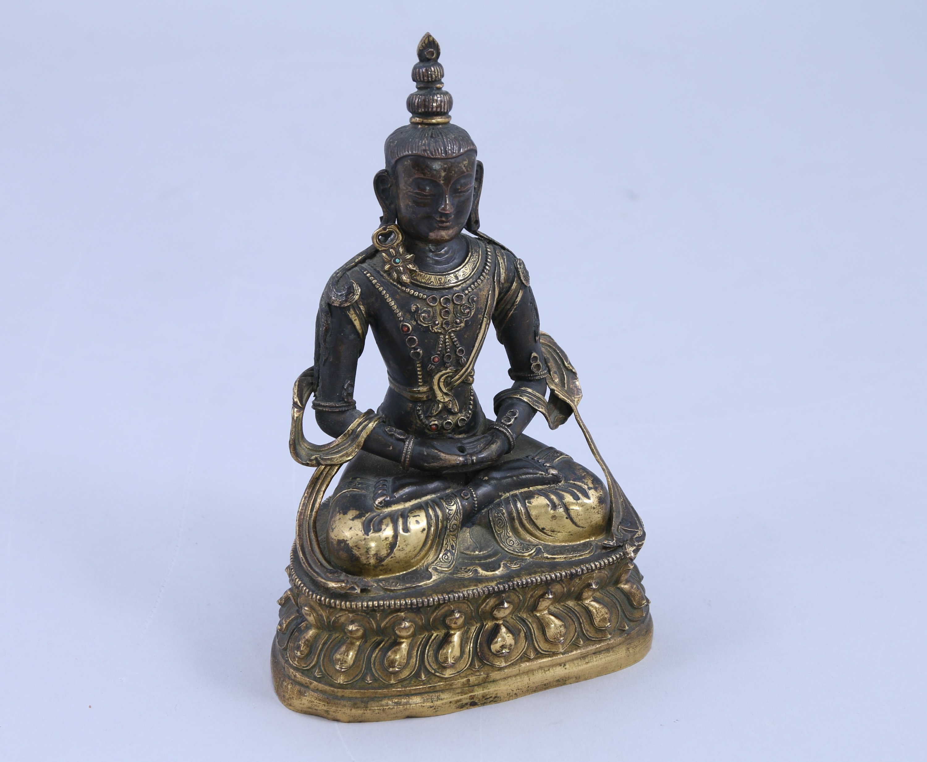 STATUETTE de boddhisattva en cuivre doré et incrustations de cabochons de corail, assis en padmasana sur un double socle invers, les mains en dhyana mudra (geste de la prière).