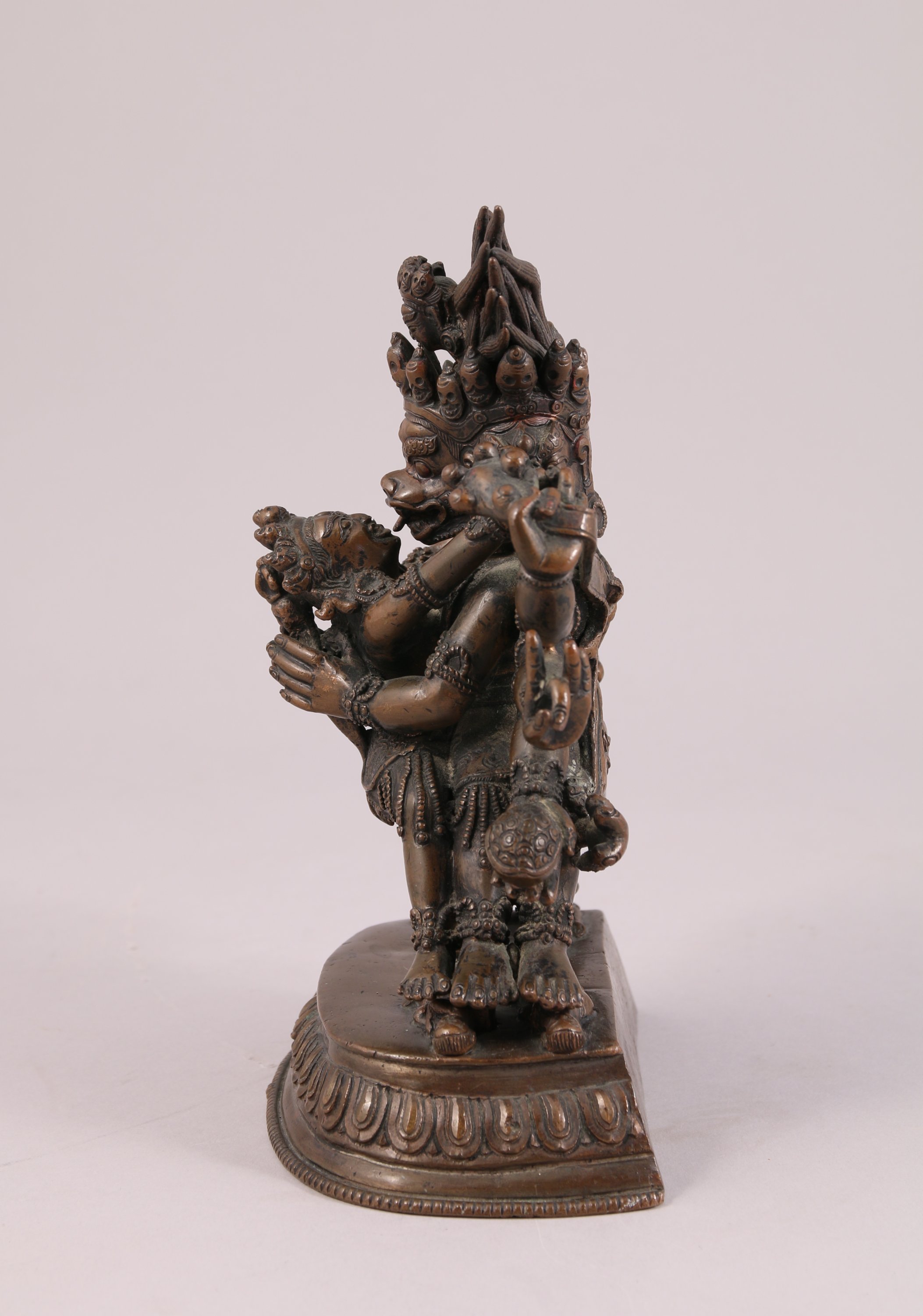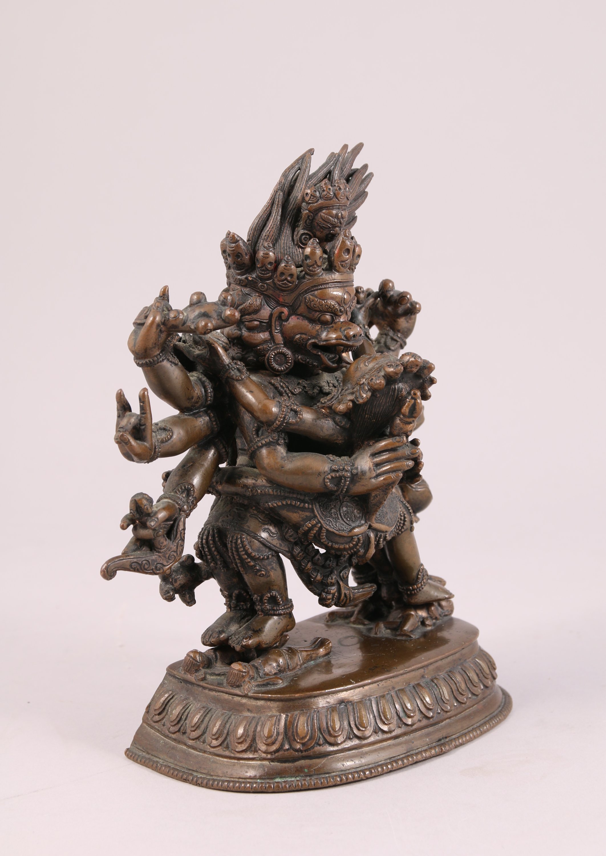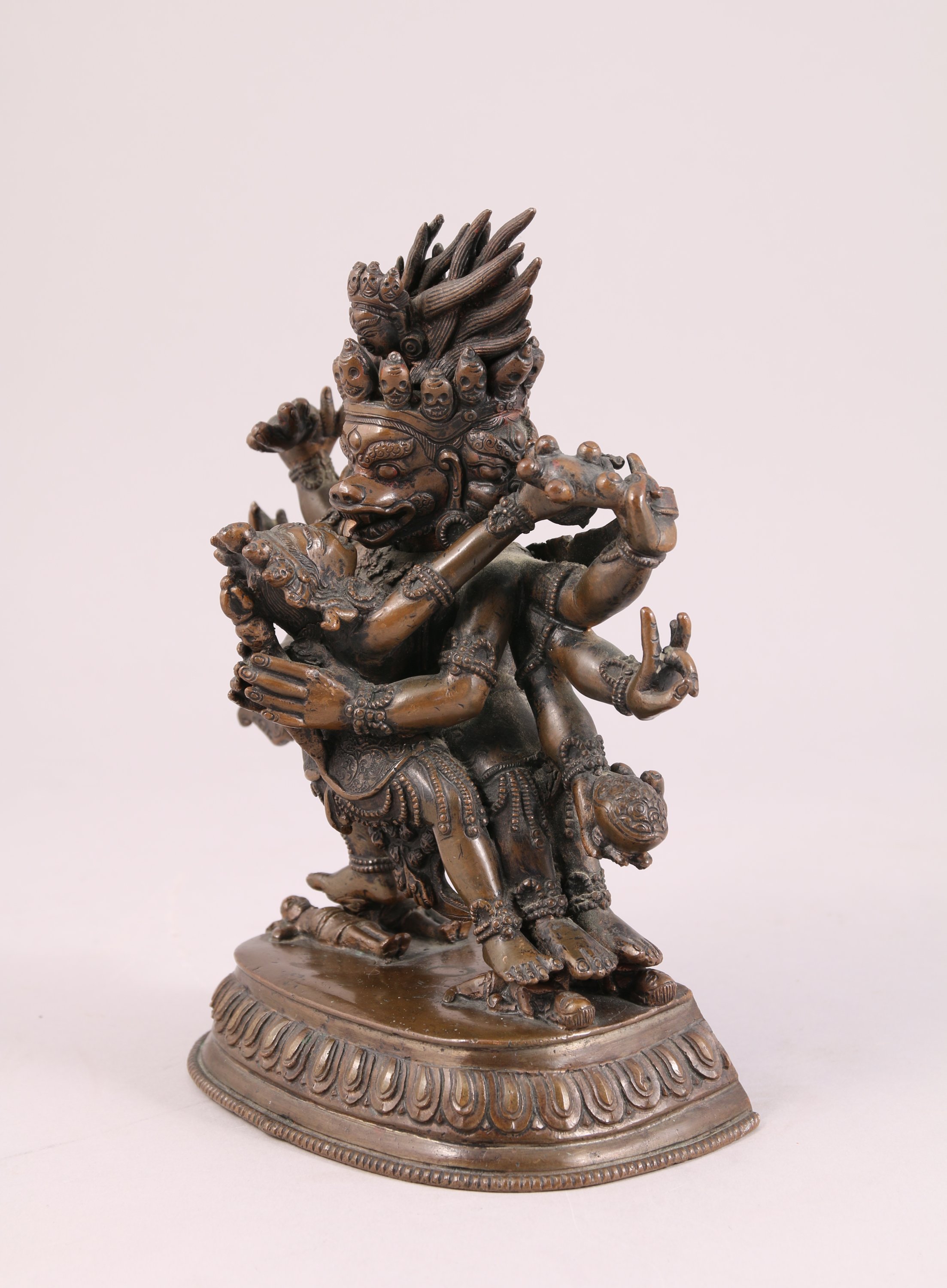 STATUETTE de YAMANTAKA en bronze à patine brune, à trois têtes, huit bras et quatre jambes, debout sur des démons en yab-yum avec sa Sakti tenant ces attributs.