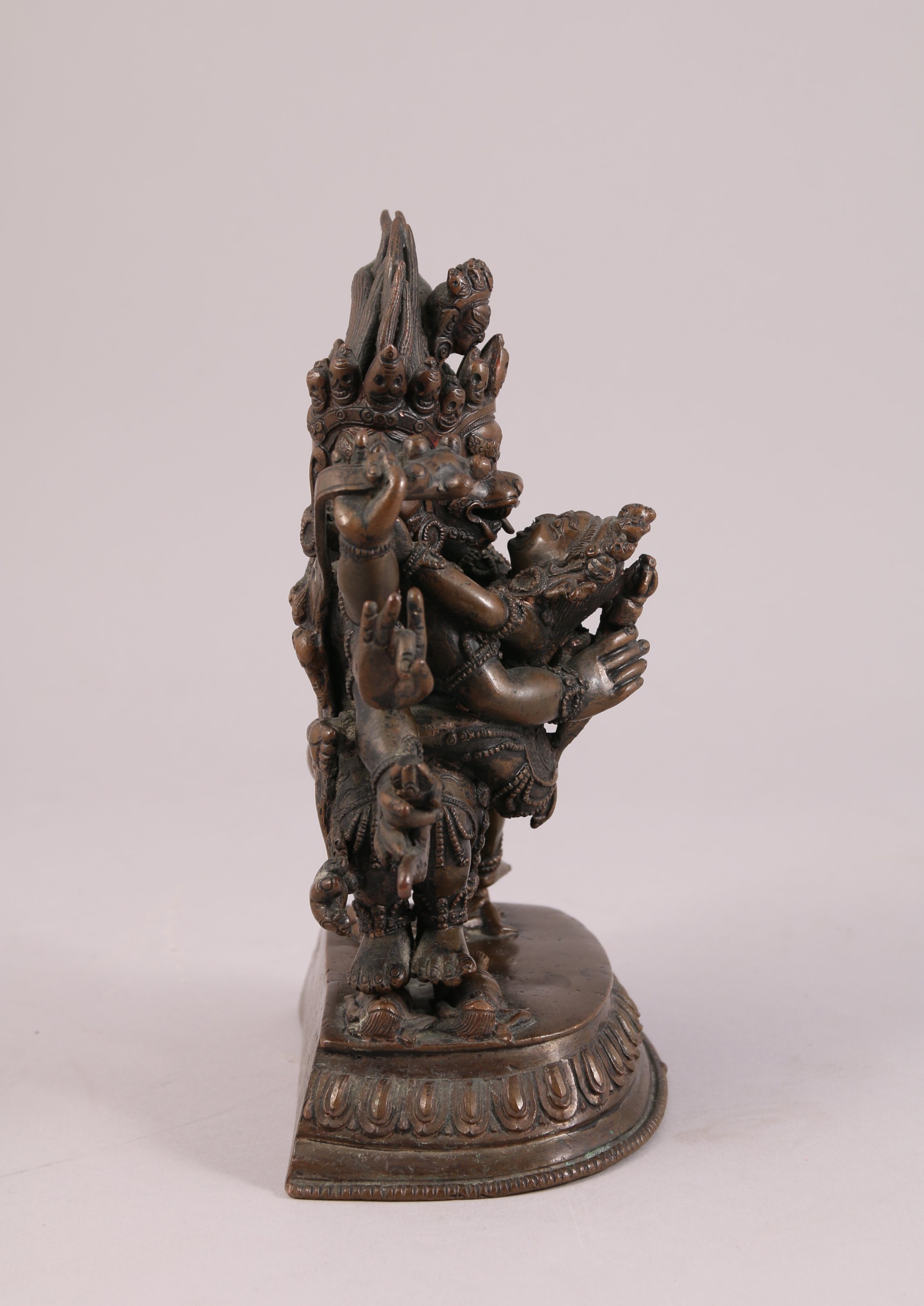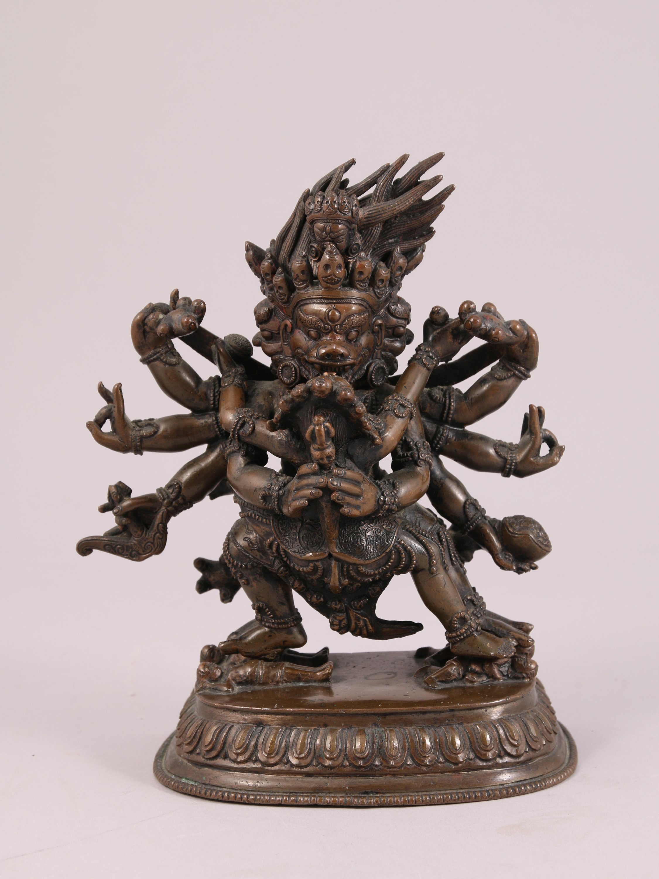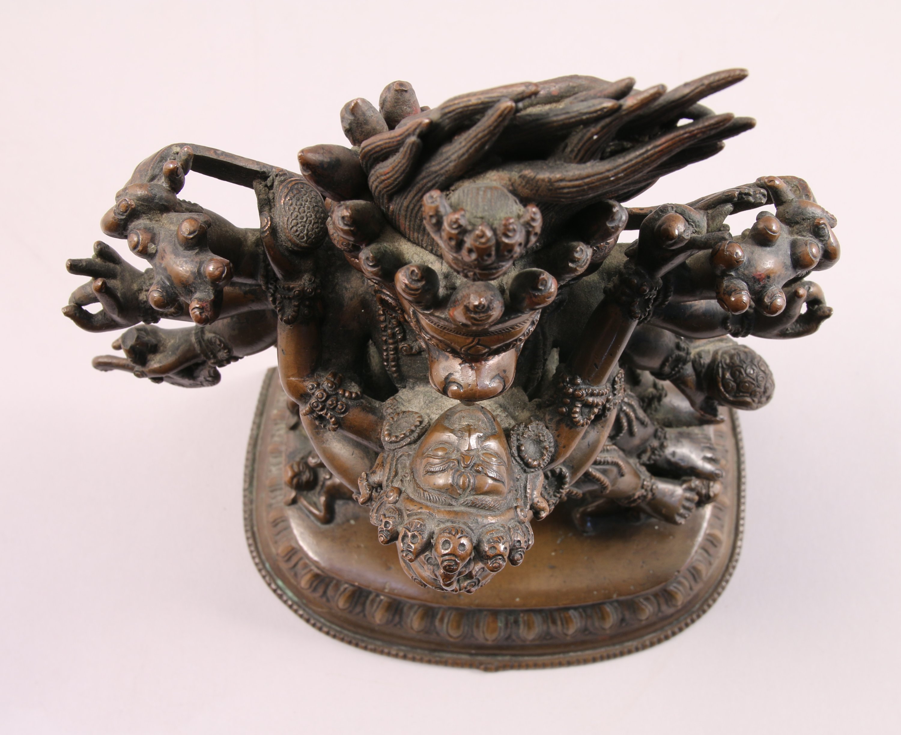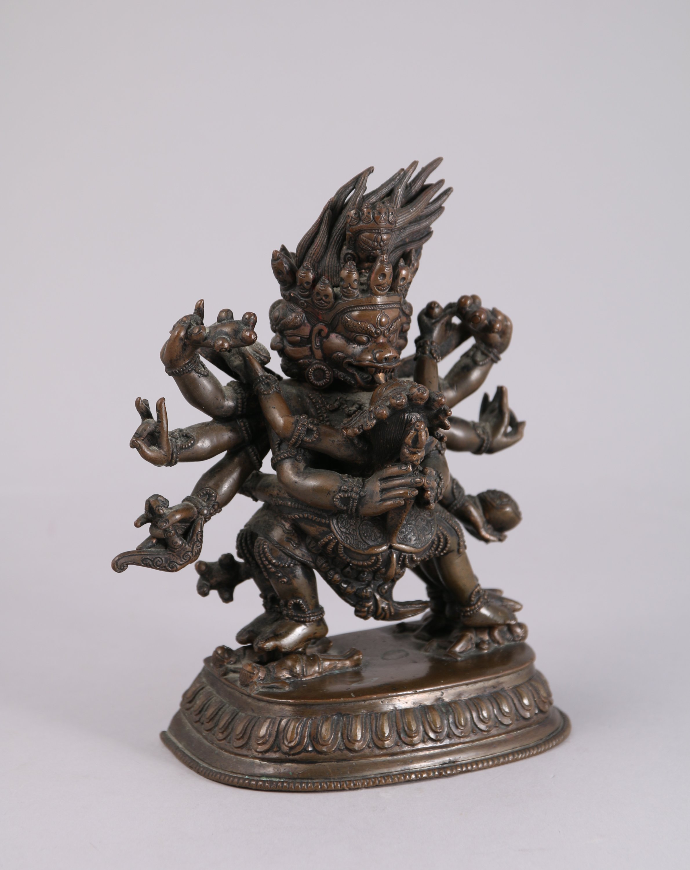 STATUETTE de YAMANTAKA en bronze à patine brune, à trois têtes, huit bras et quatre jambes, debout sur des démons en yab-yum avec sa Sakti tenant ces attributs.