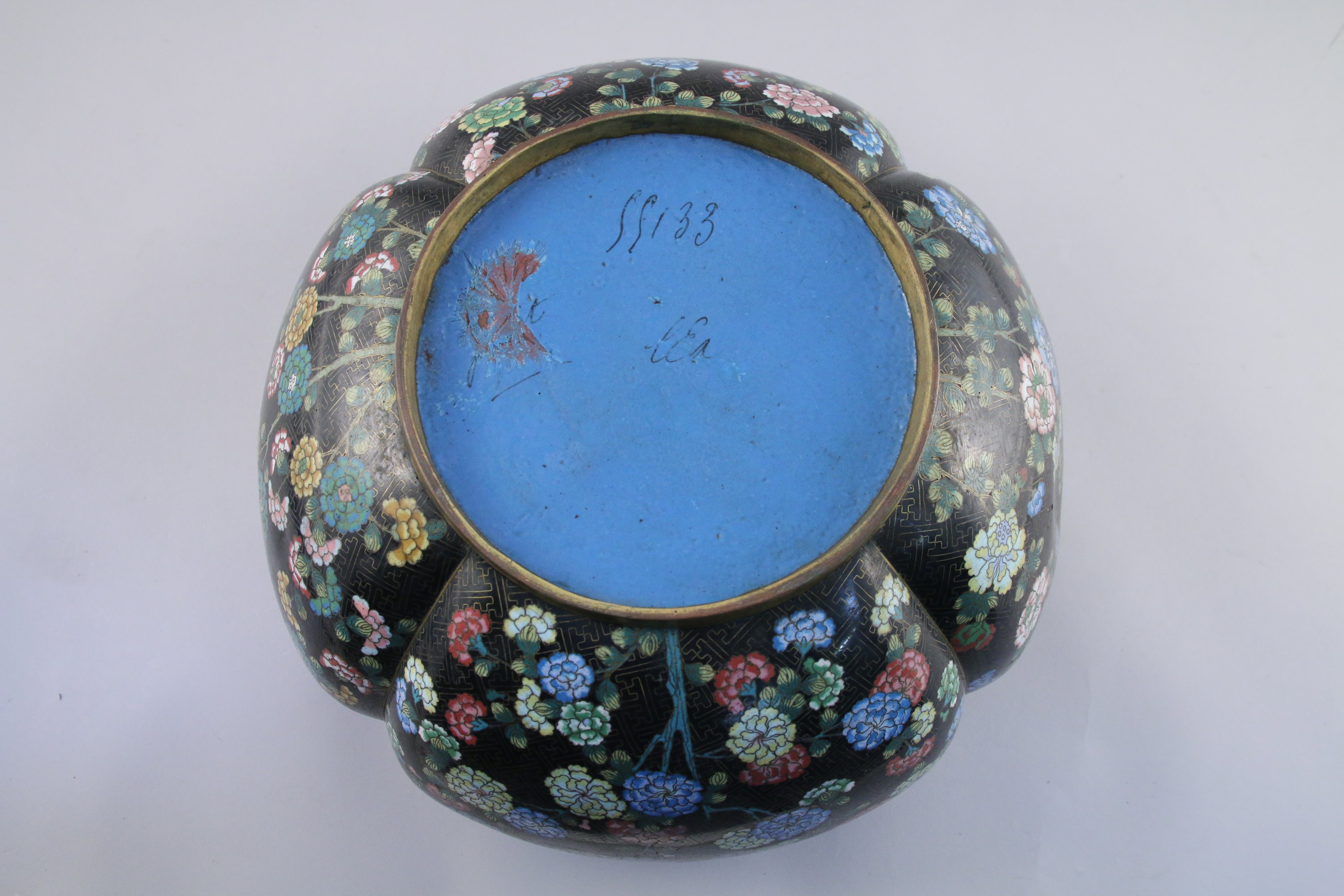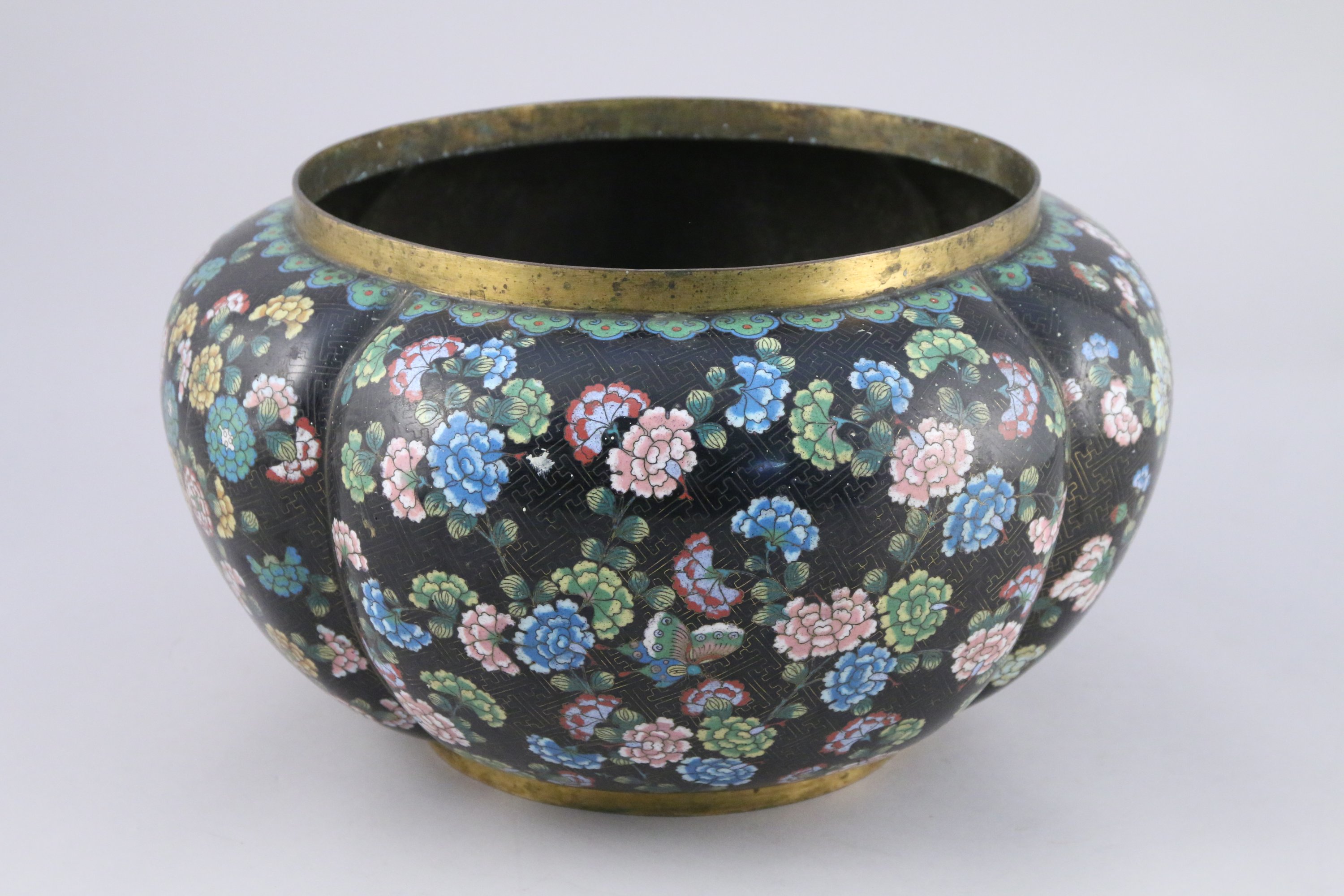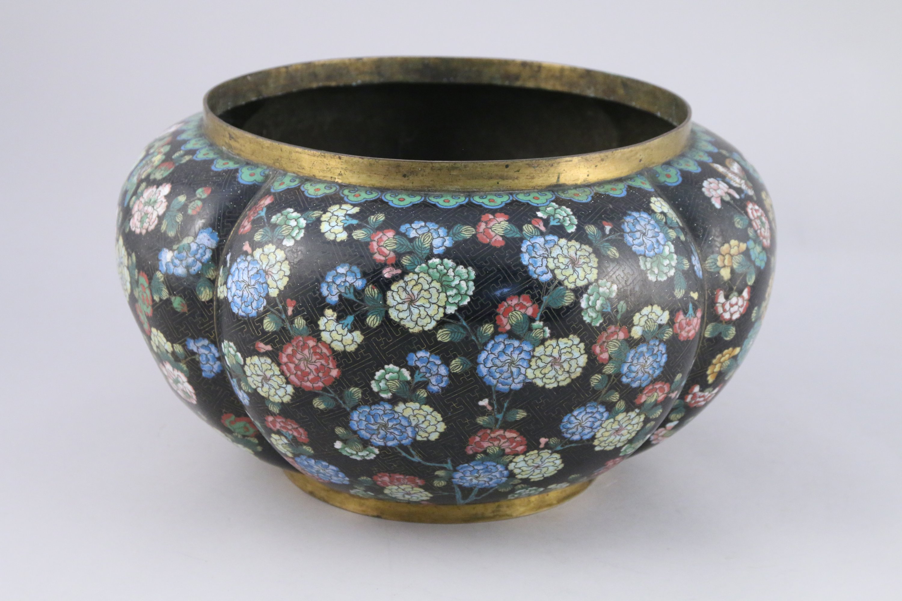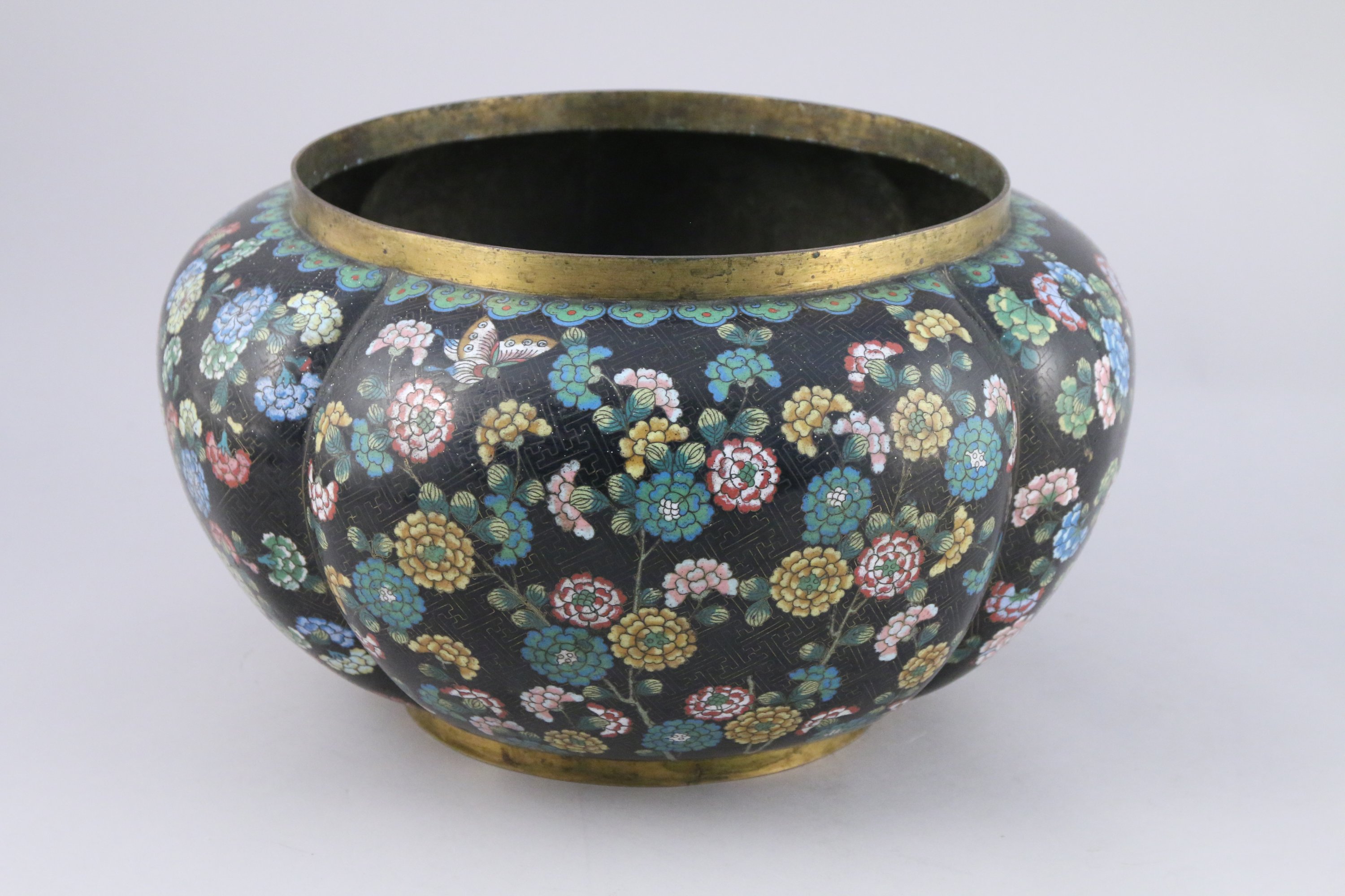 VASQUE polylobée en bronze et émaux cloisonnés à décor de pivoines et papillons sur fond noir de motif de svastika, l'épaule ornée de motifs de ruyi.