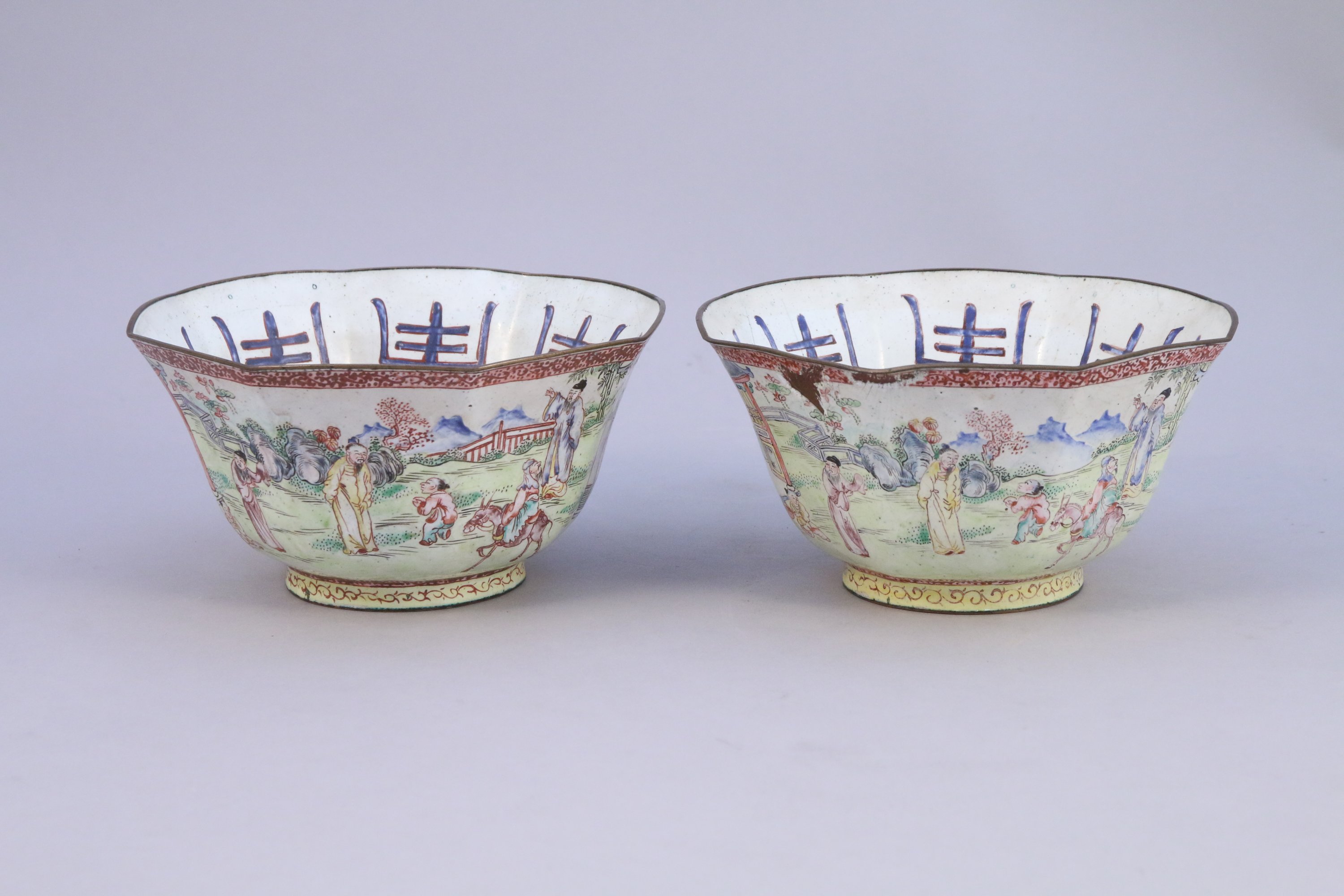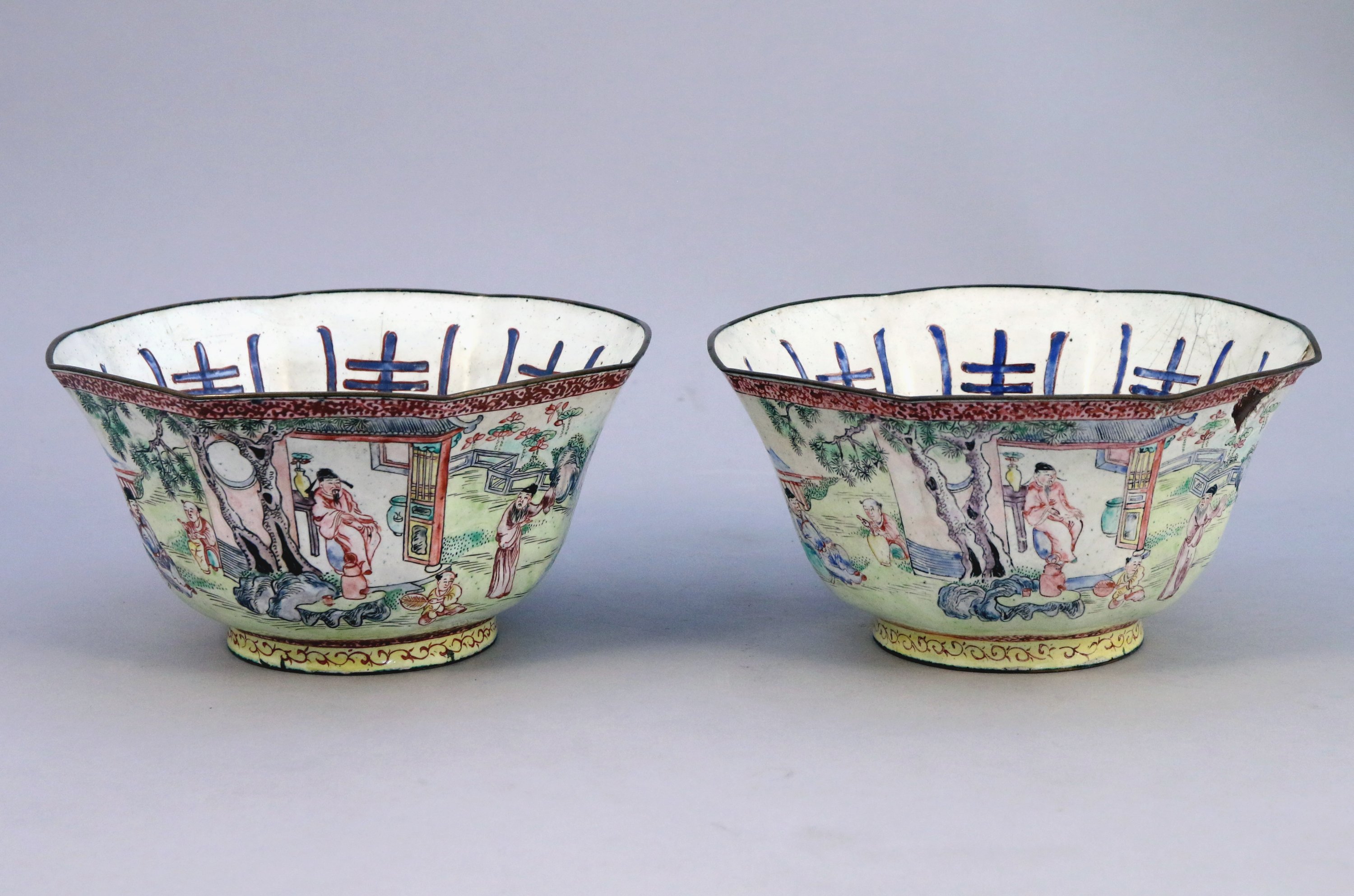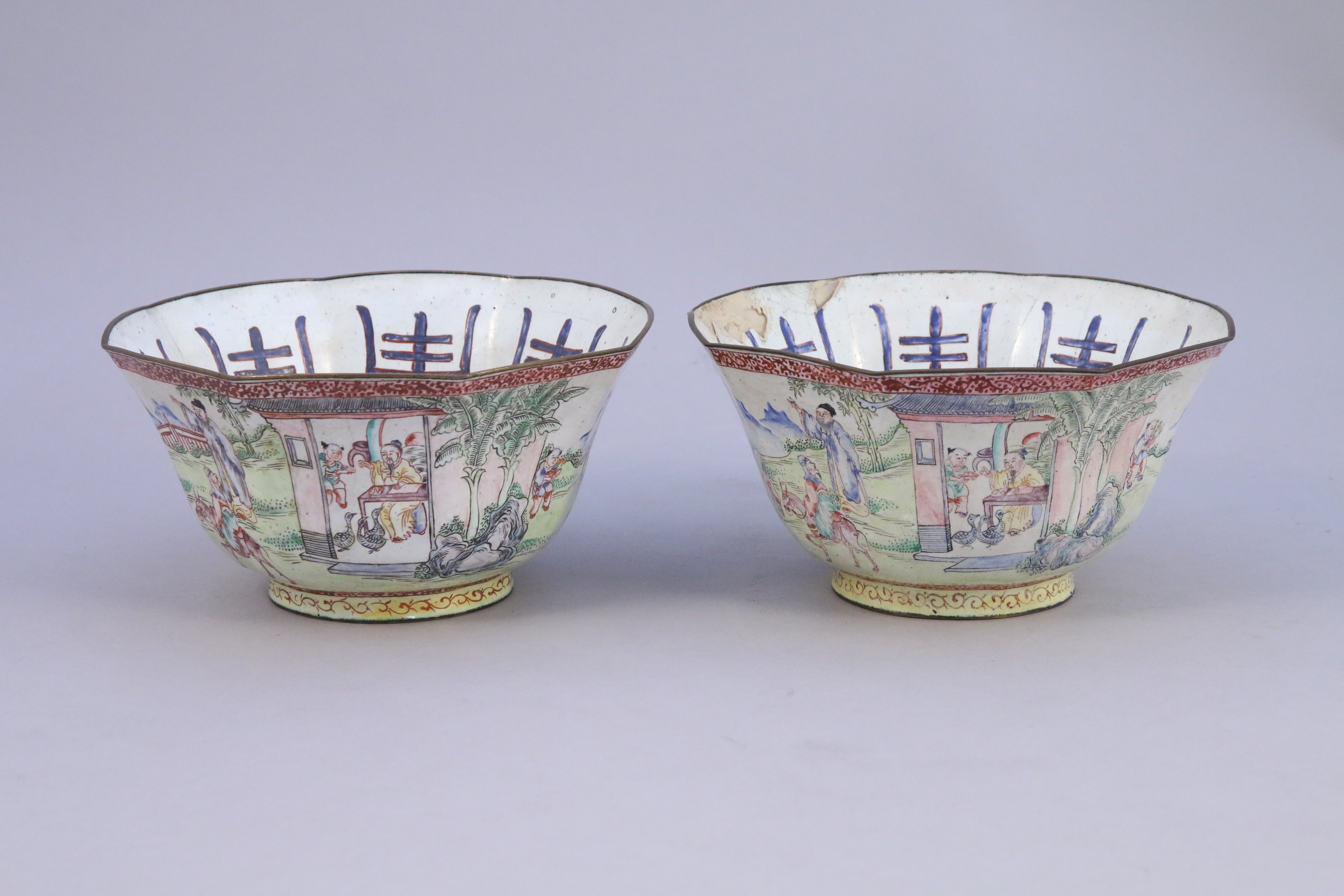 DEUX BOLS légèrement polylobés à facettes en cuivre et émaux peints à décor de lettrés et enfants dans des intérieurs et jardin sous les pins et bananiers dans un paysage montagneux, l'intérieur orné des caractères shou.