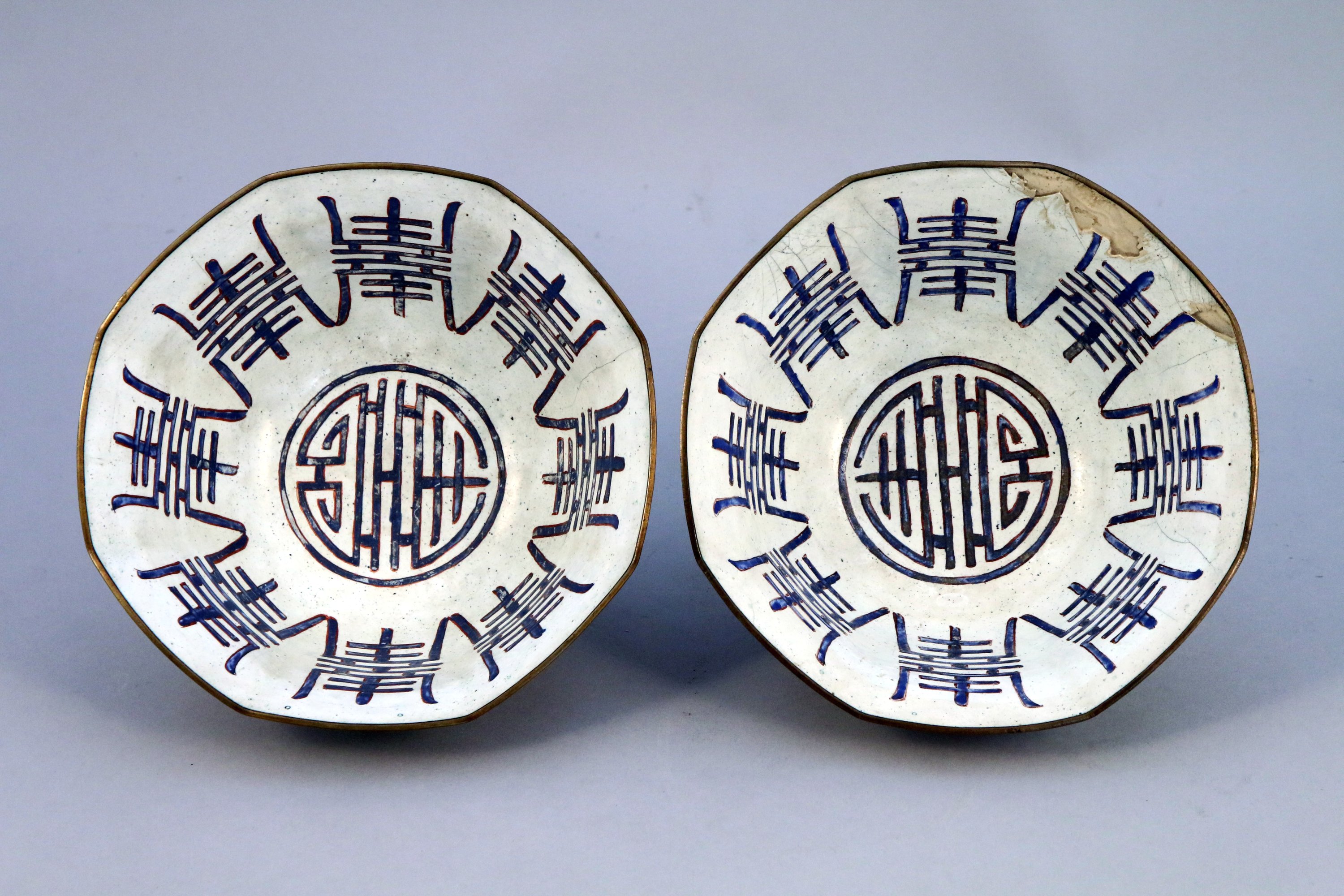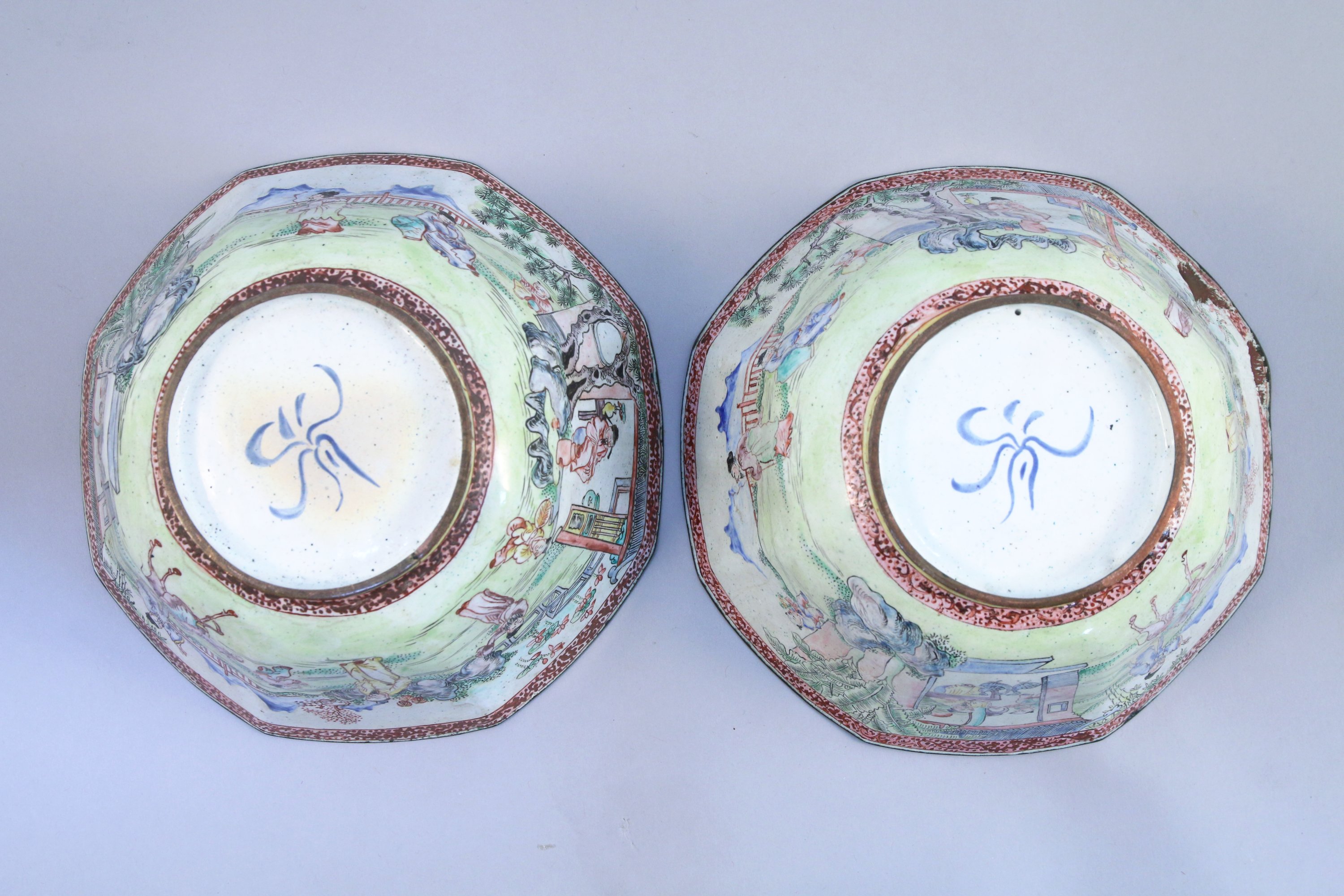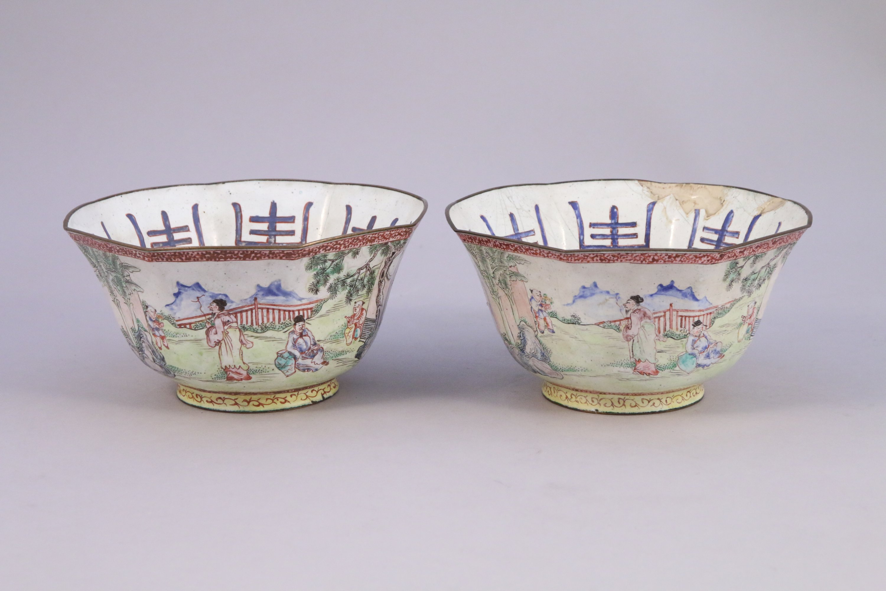 DEUX BOLS légèrement polylobés à facettes en cuivre et émaux peints à décor de lettrés et enfants dans des intérieurs et jardin sous les pins et bananiers dans un paysage montagneux, l'intérieur orné des caractères shou.
