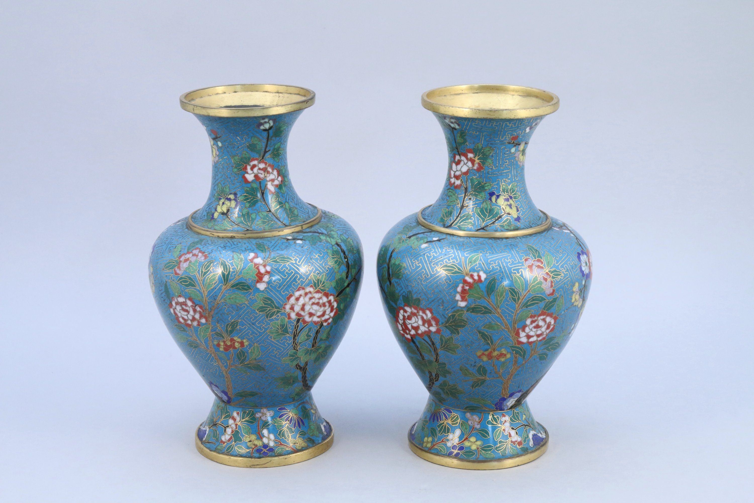 Paire de VASES BALUSTRES en bronze et émaux cloisonnés à décor d'oiseaux et fleurs épanouies sur fond turquoise à motifs de svastika.