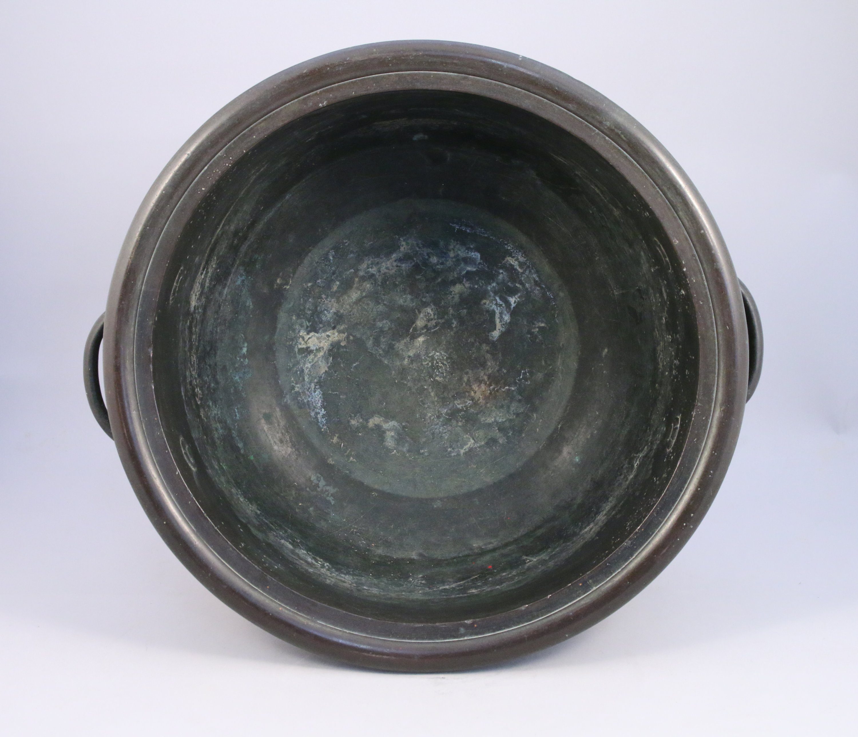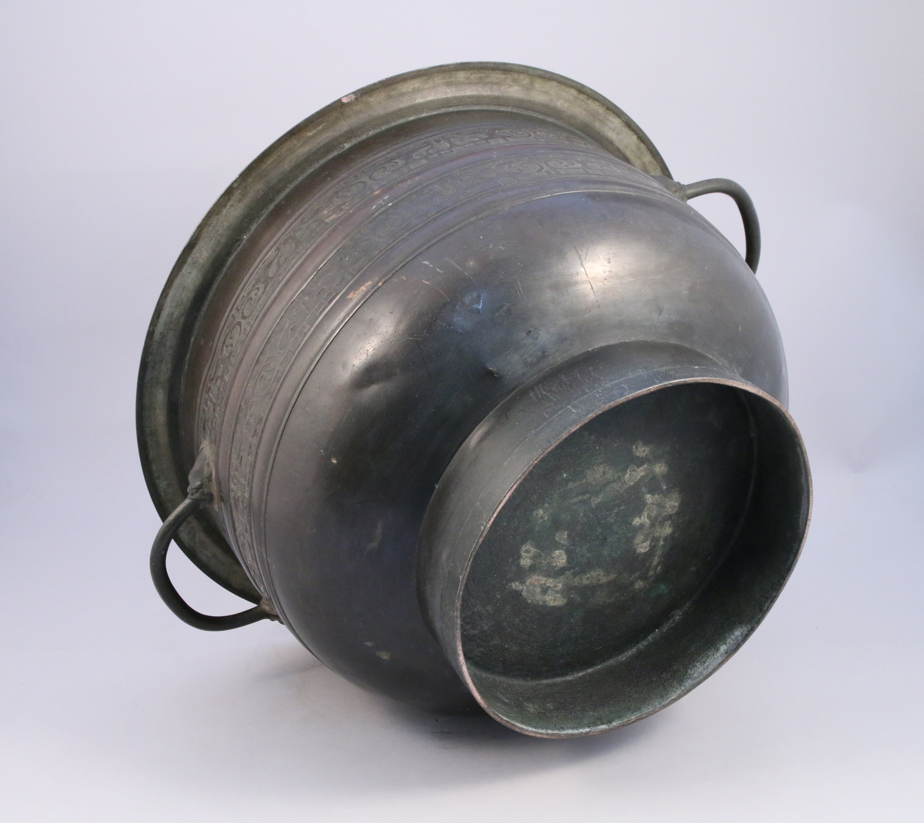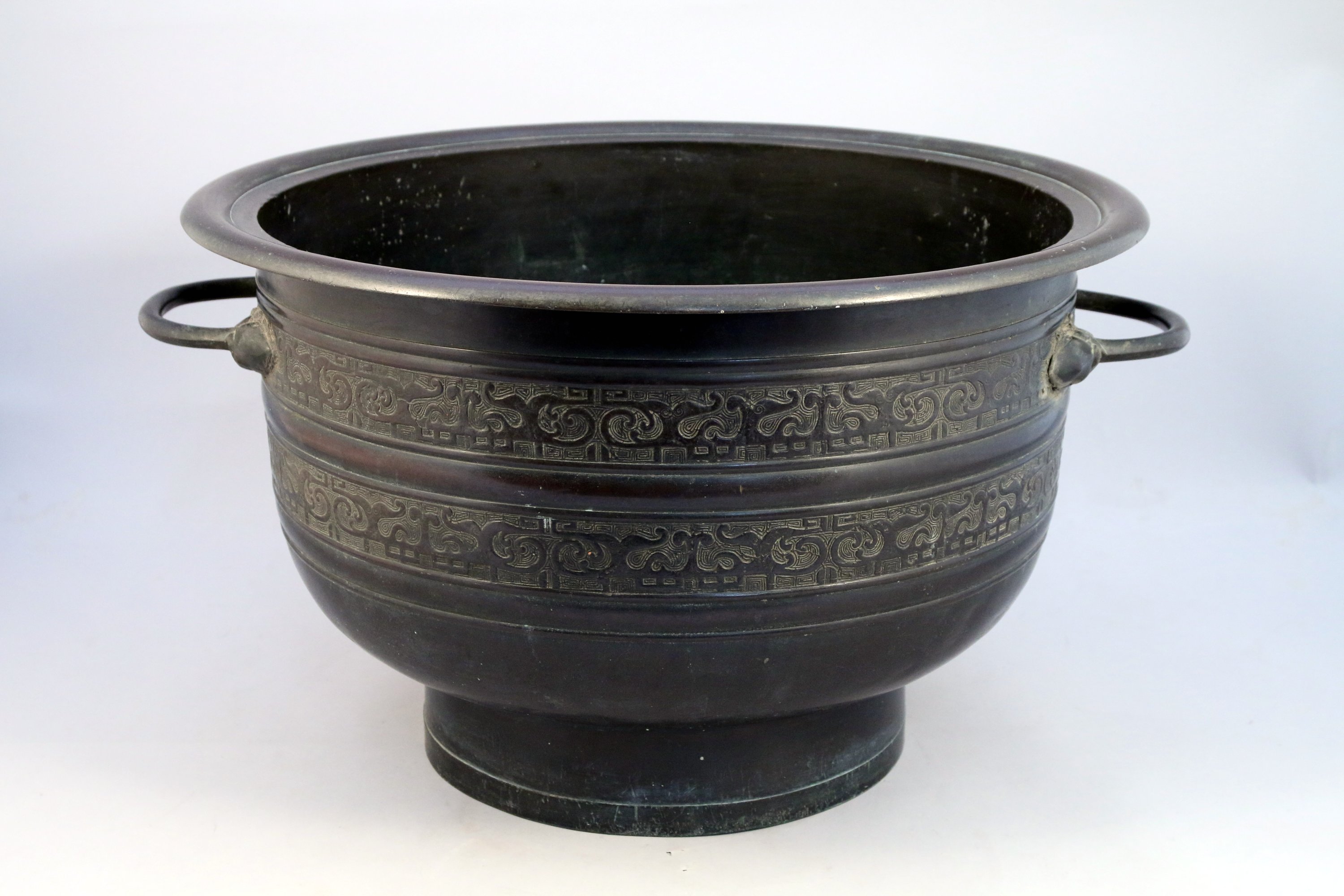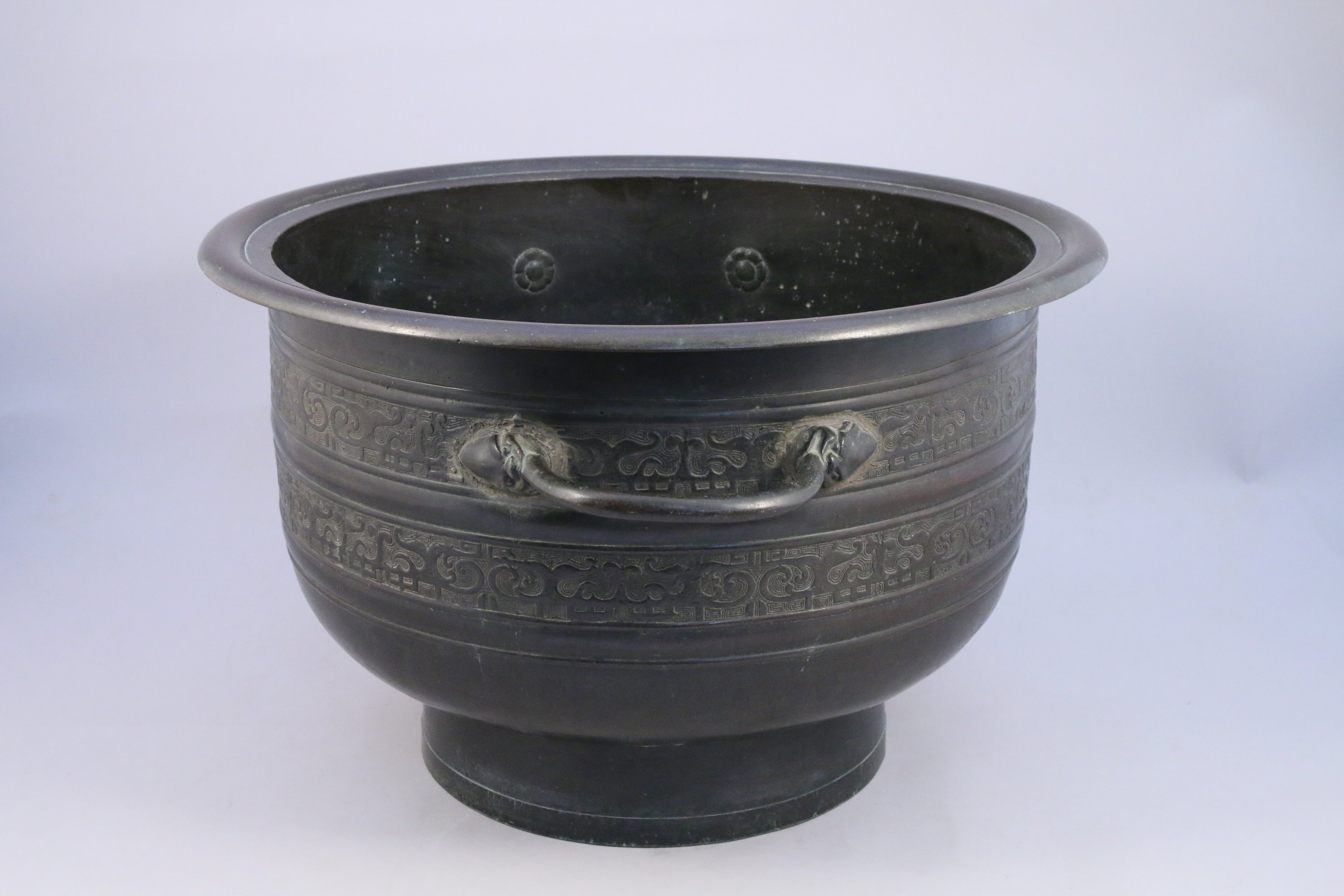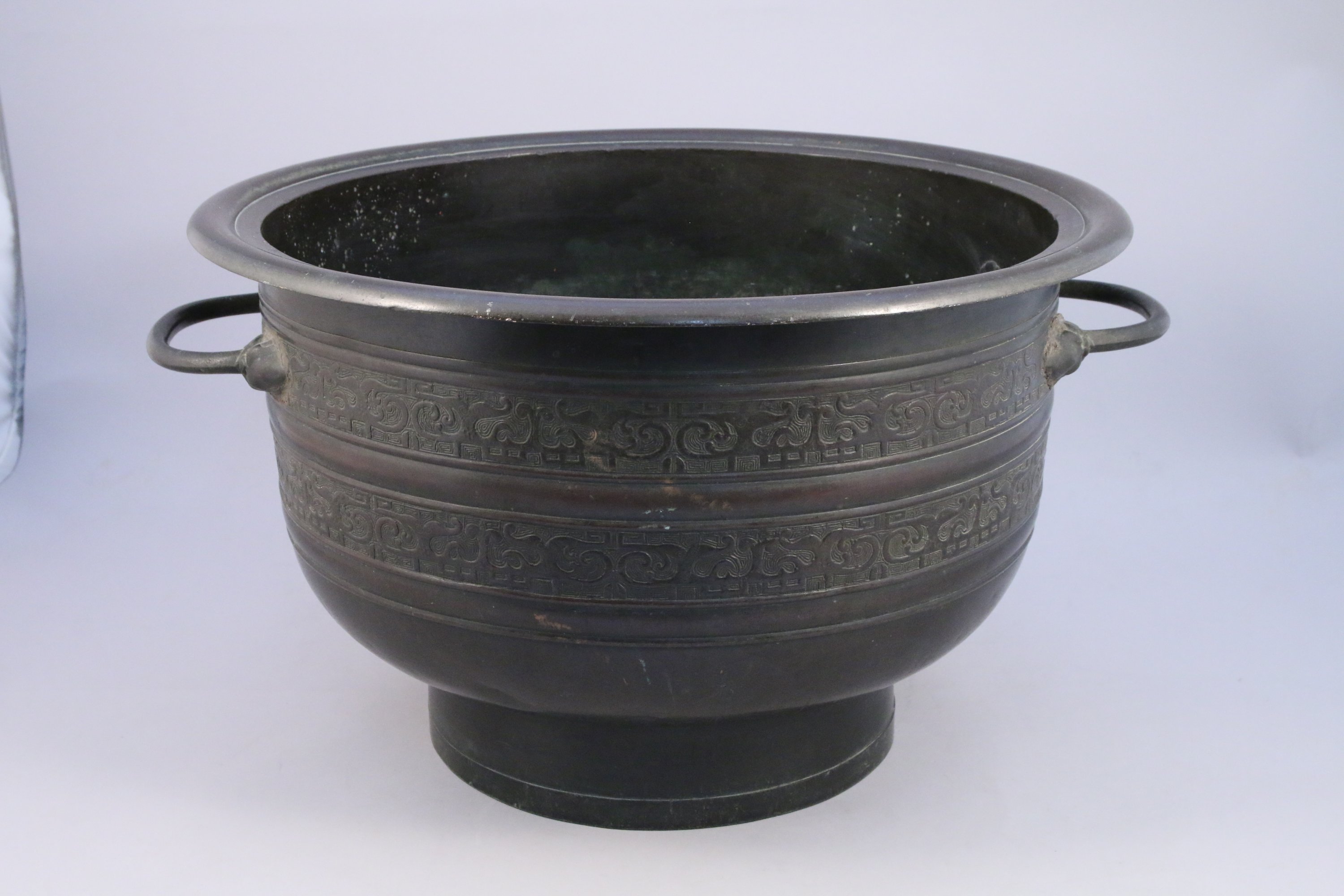 VASQUE à deux anses en bronze à patine brune à décor ciselé sur la panse de motifs archaïsants sur fond de spirales.
