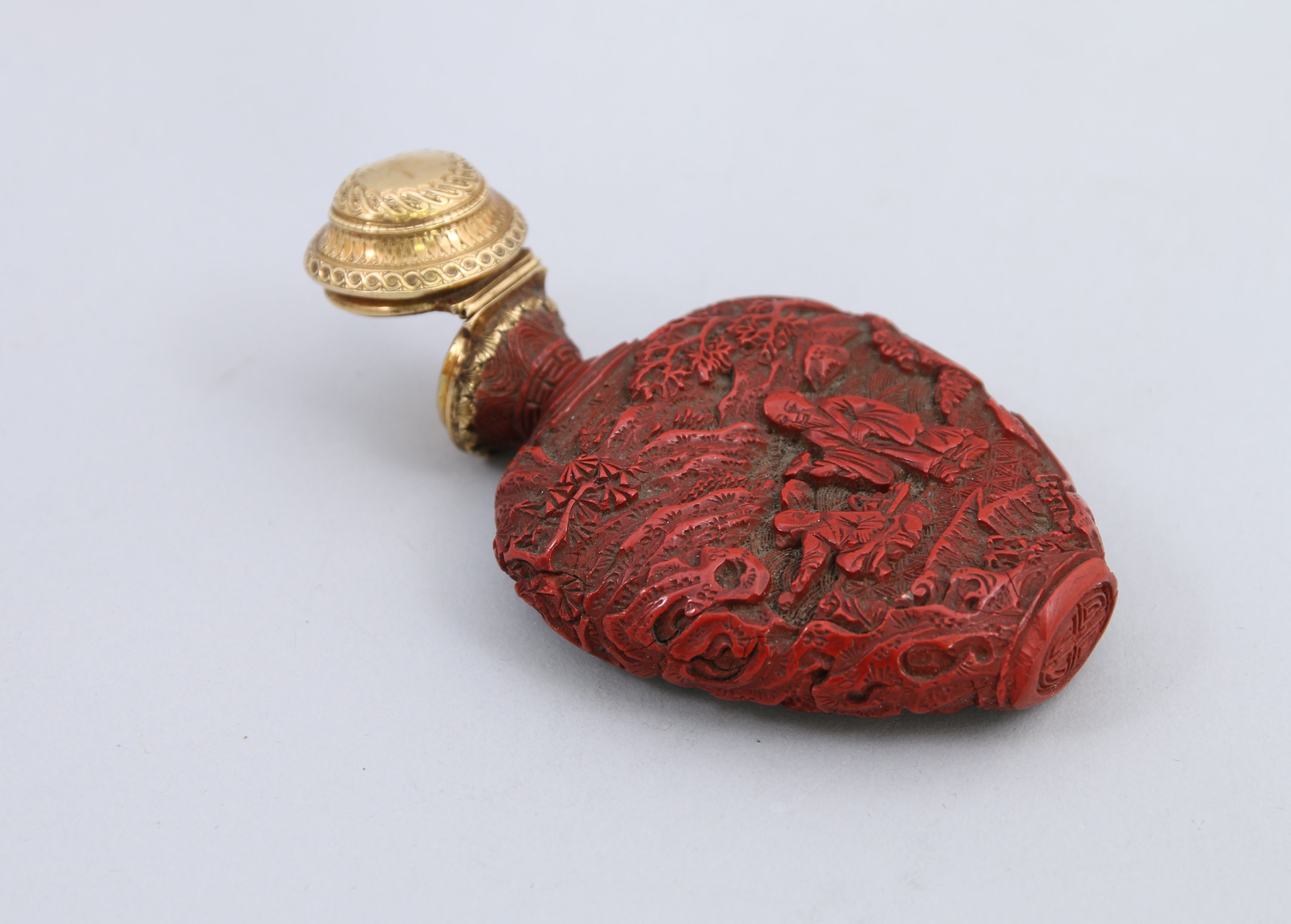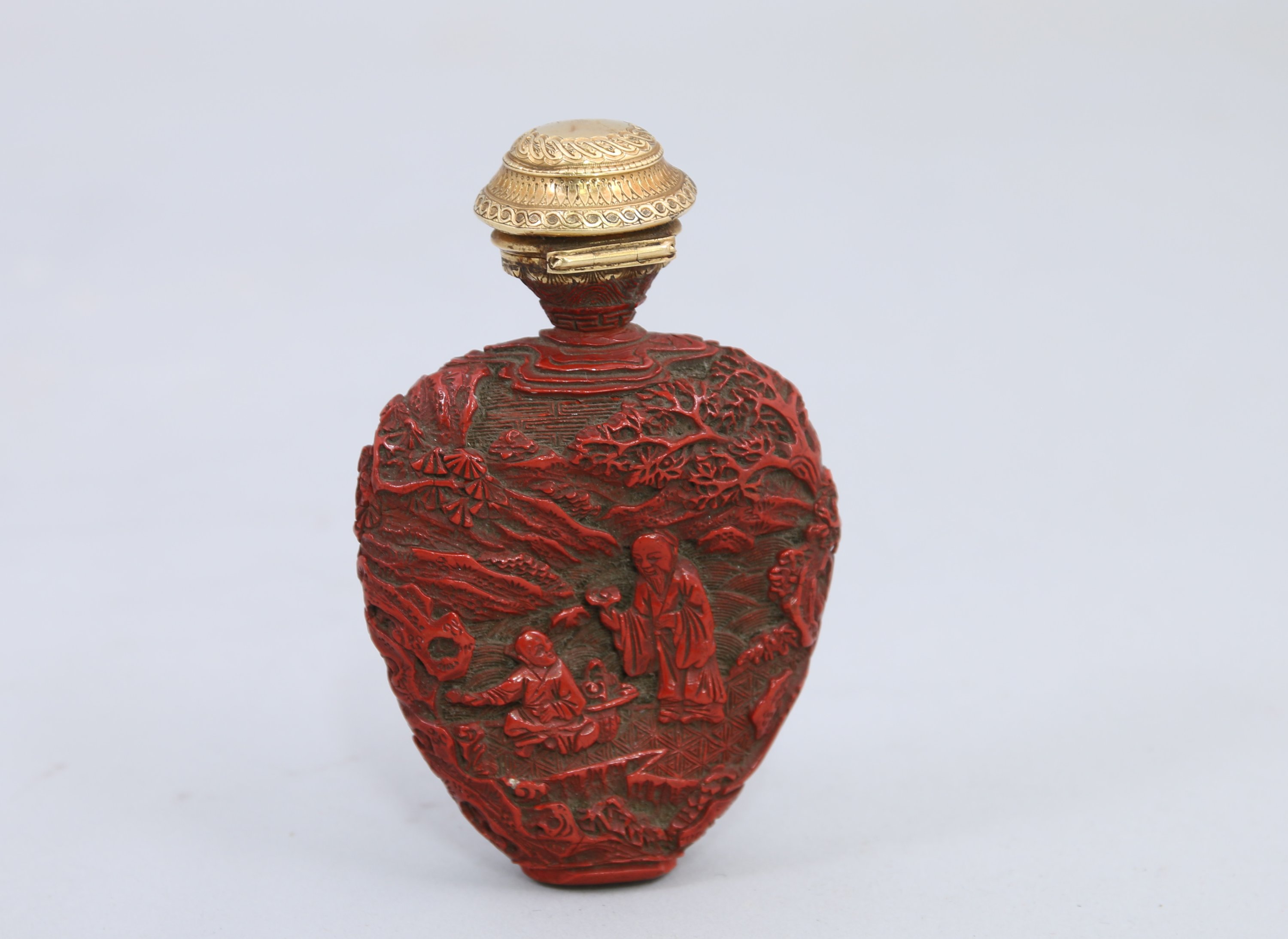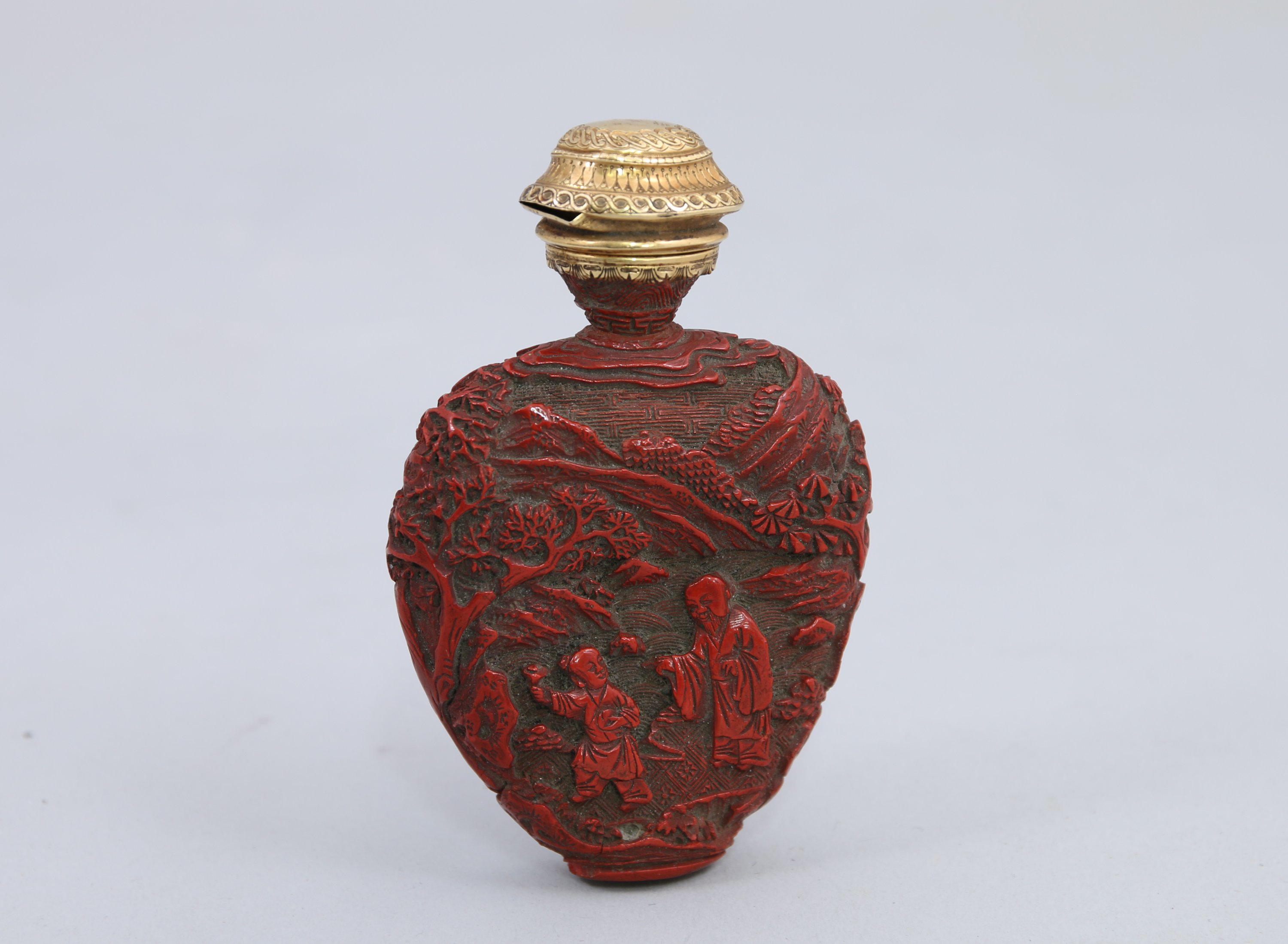 FLACON TABATIÈRE de forme écusson en laque rouge cinabre à décor sur chaque face d'un enfant et d'un vieillard sous les pins dans un paysage montagneux, sur fond de croisillons de fleurons. Bouchon en or cerclant le col à décor de vaguelettes, petites palmes.
