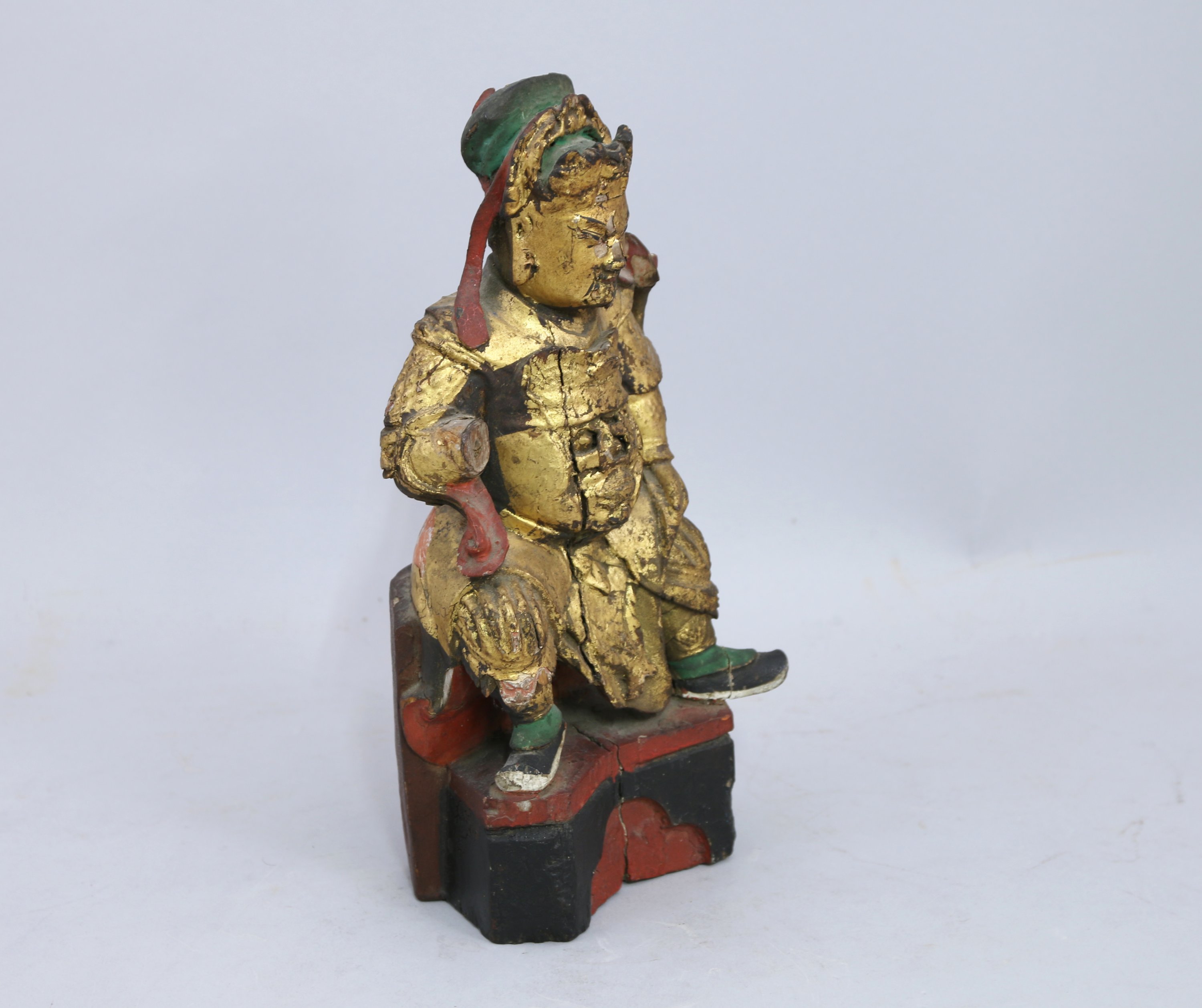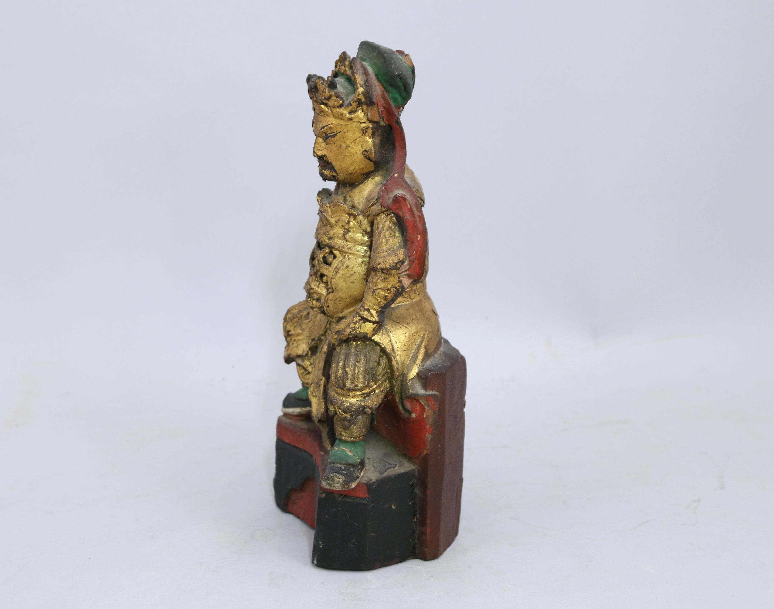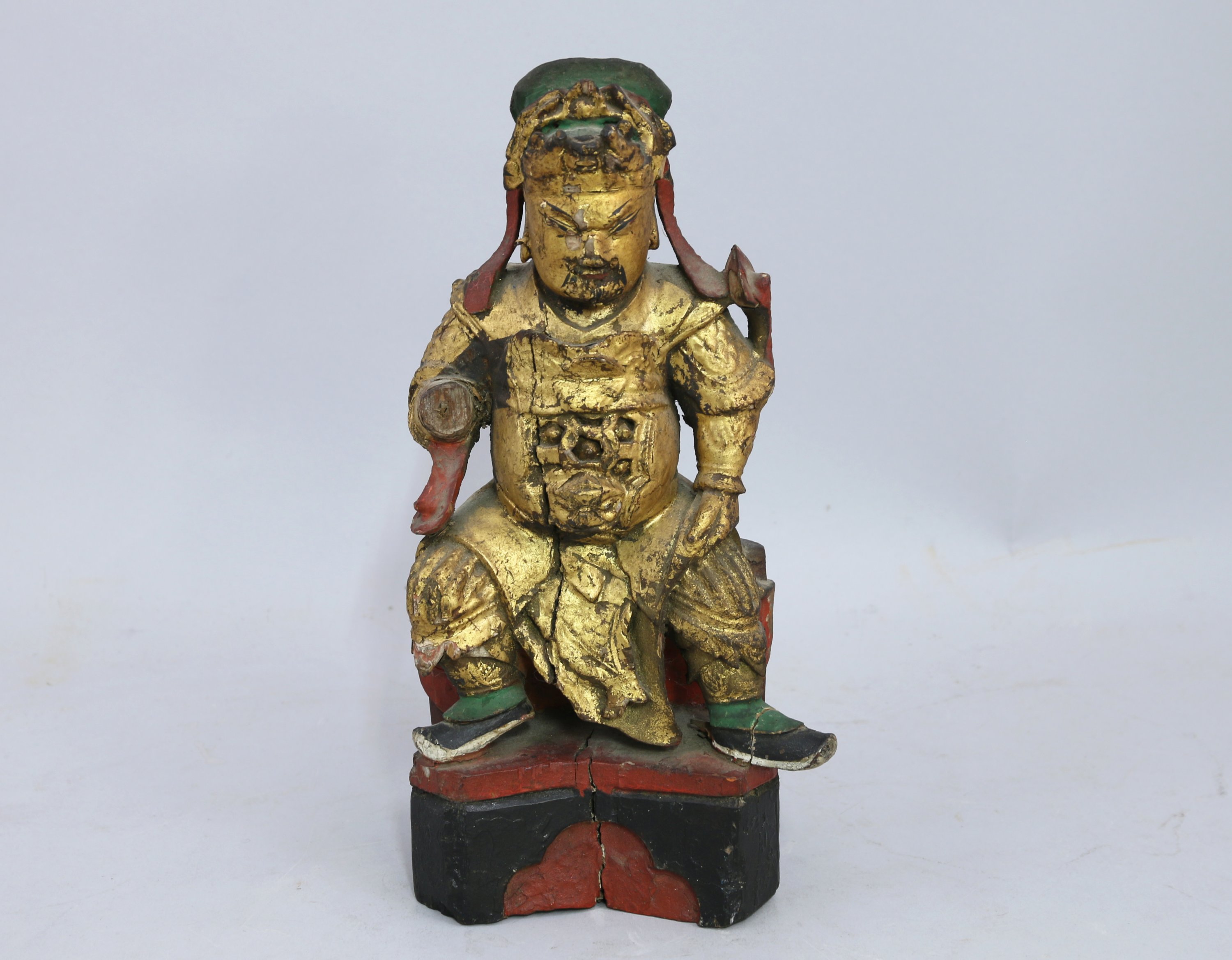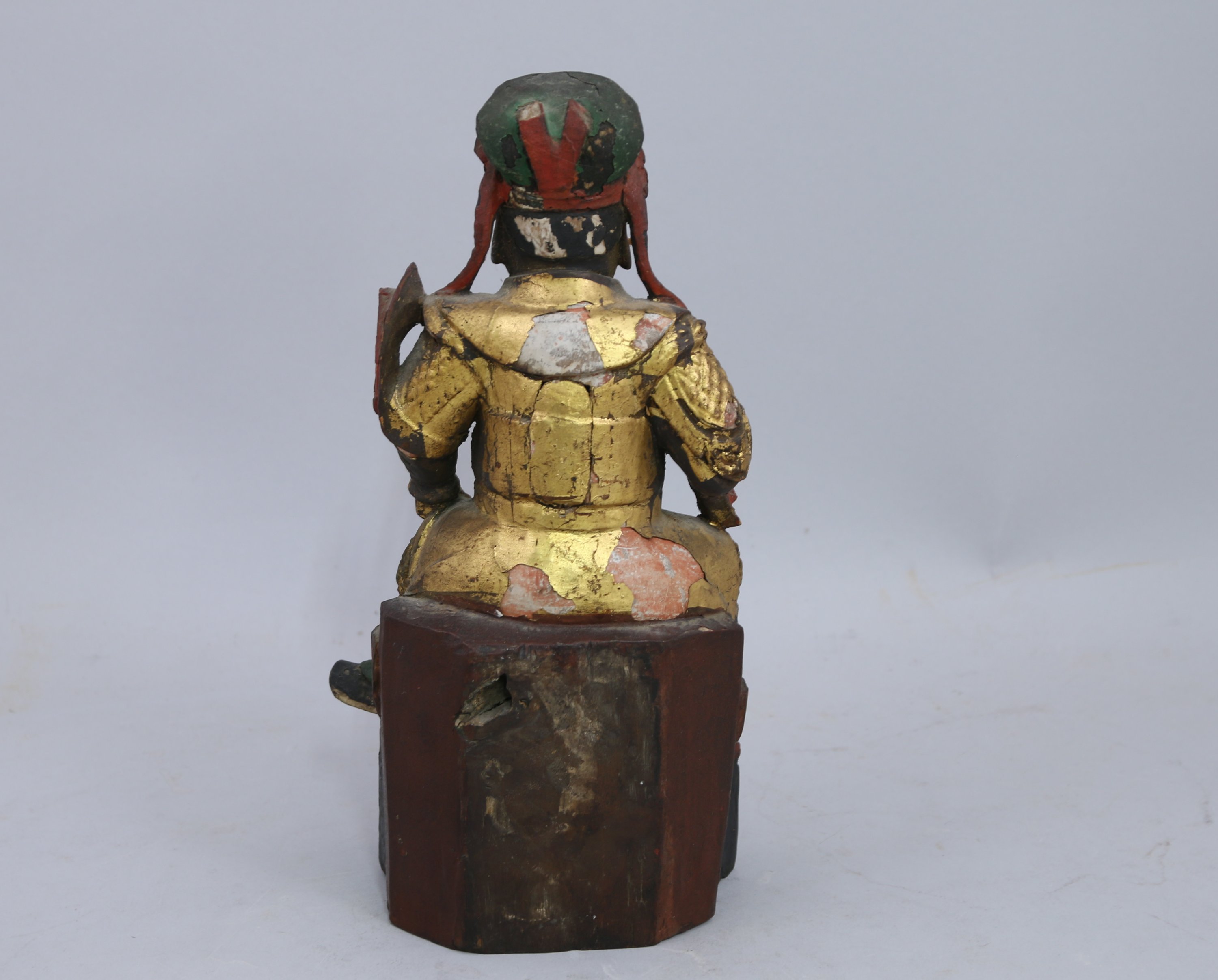 STATUETTE de GUANYU en bois sculpté et laqué polychrome et or.