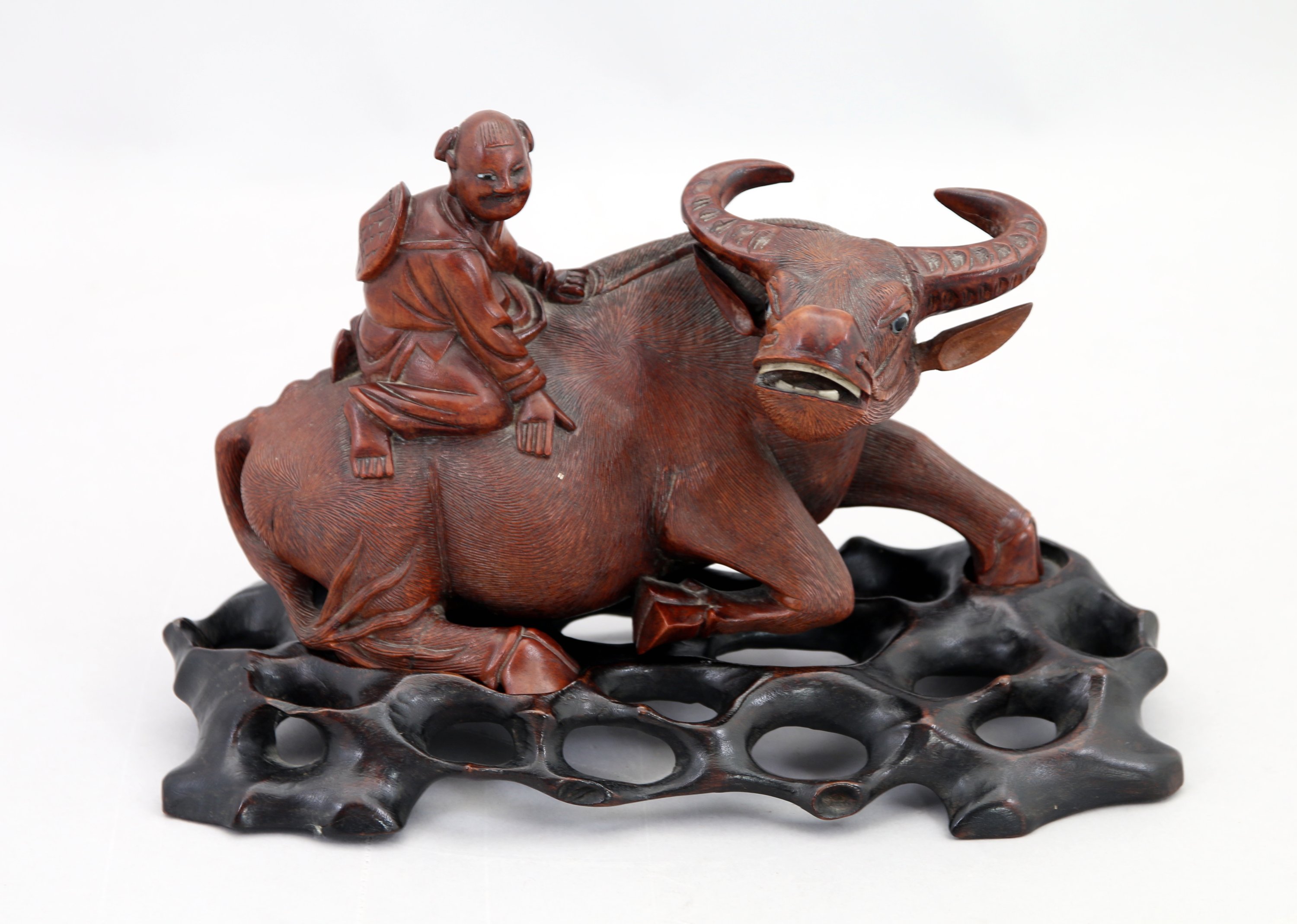 GROUPE EN BOIS, enfant sur un buffle couché. Les yeux du buffle et de l'enfant en billes de verre et dents du buffle en os.