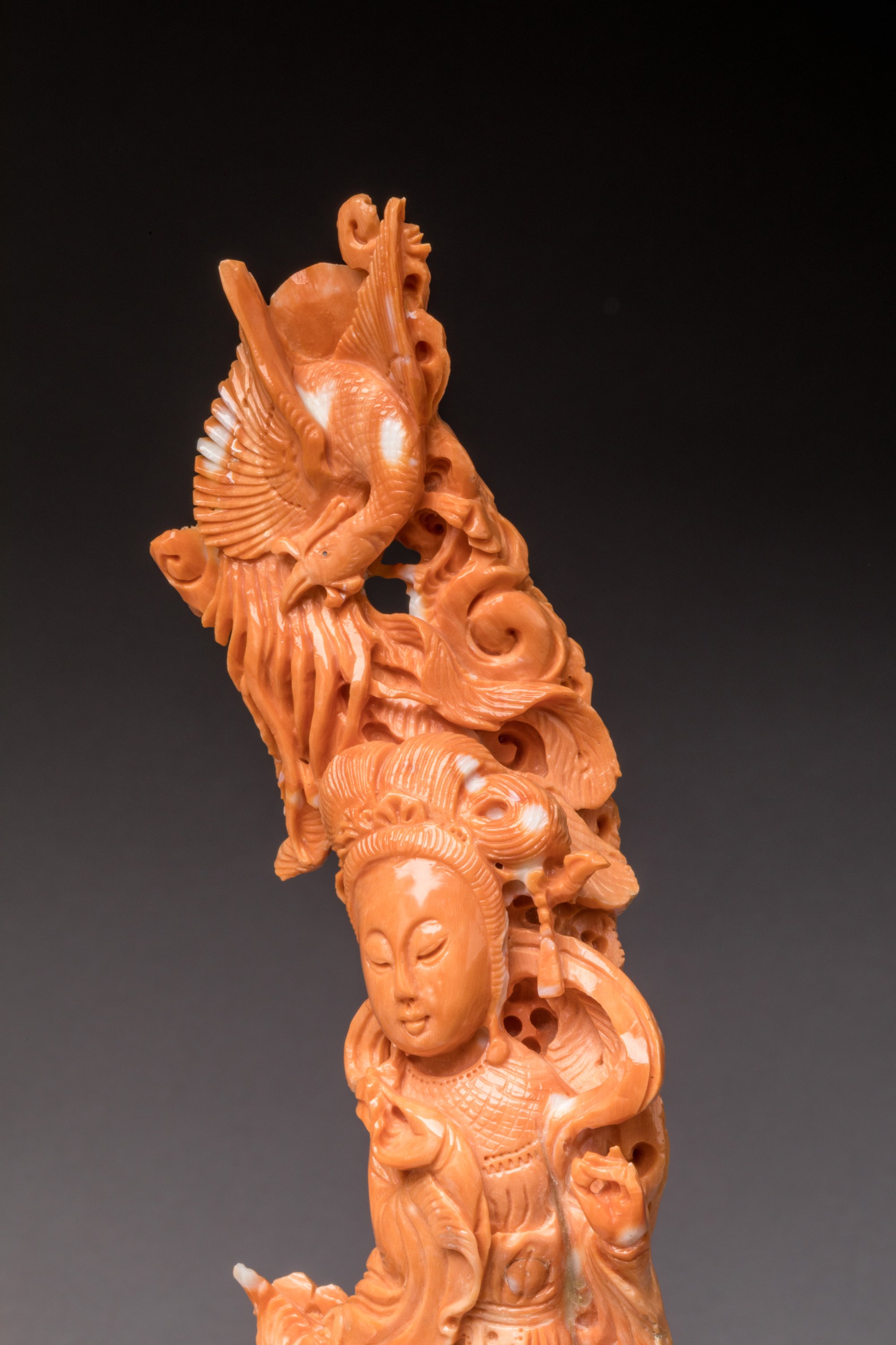 GROUPE EN CORAIL rose, deux jeunes femmes sur un muret orné de fleurs et accompagnées de phénix et lapin. Socle en bois.