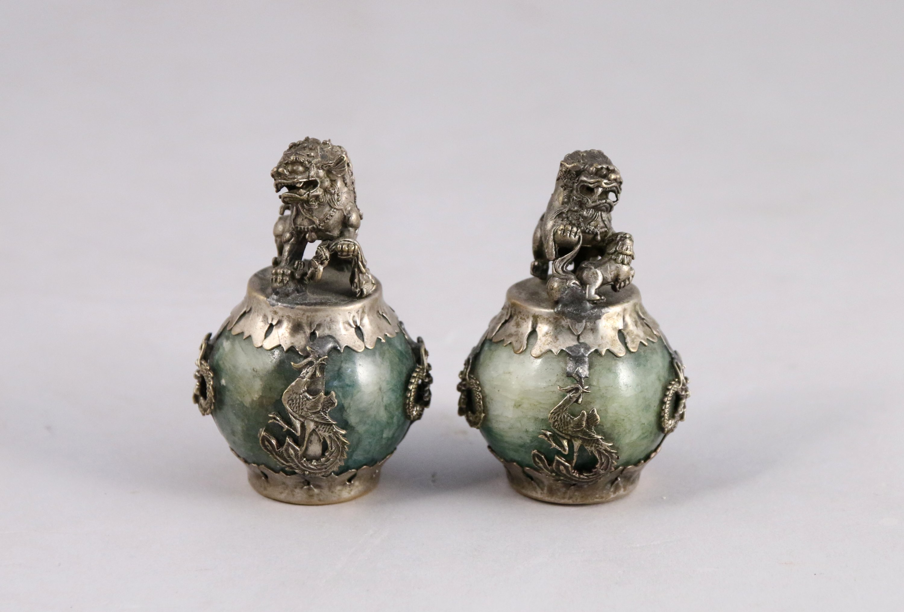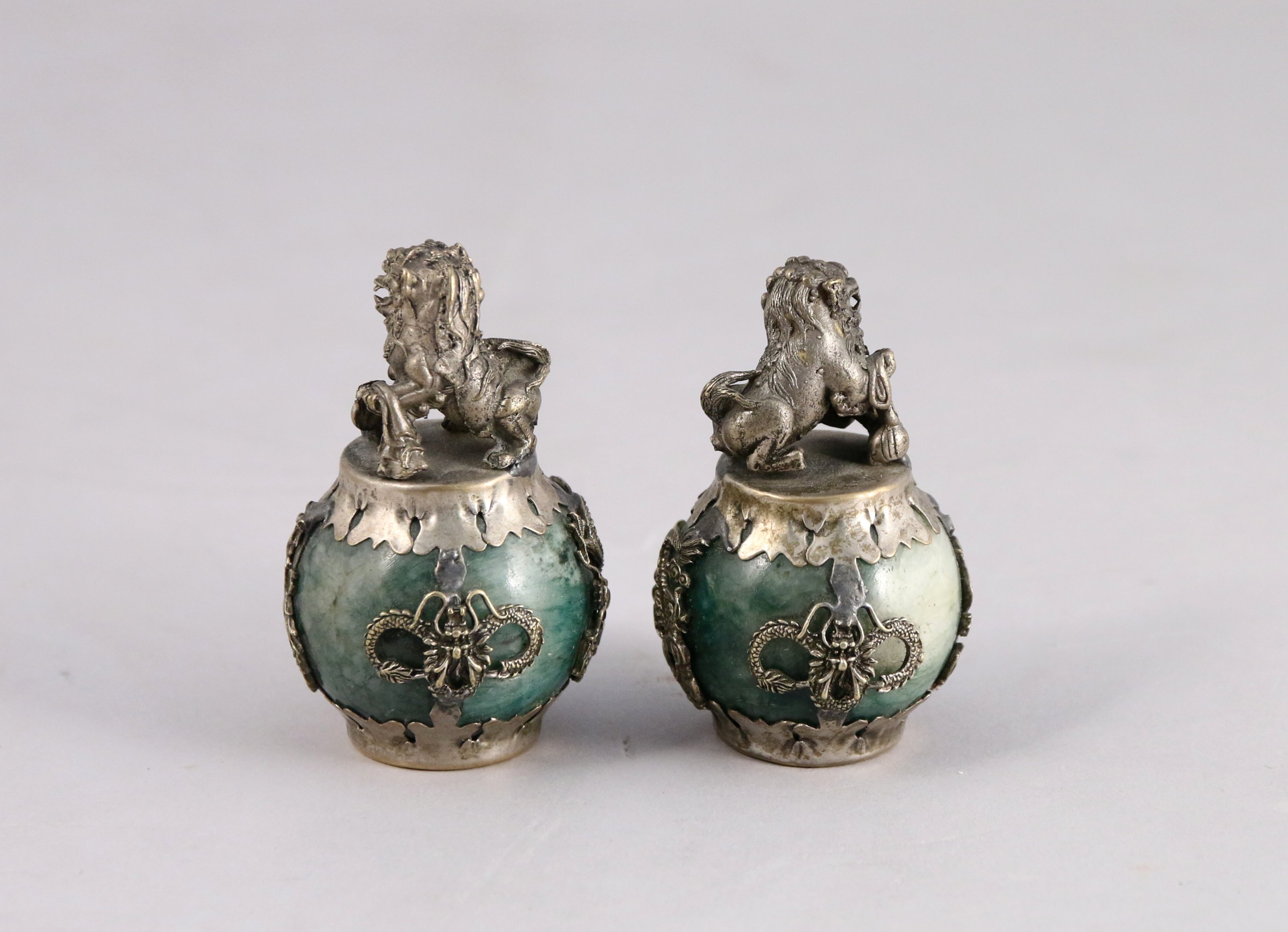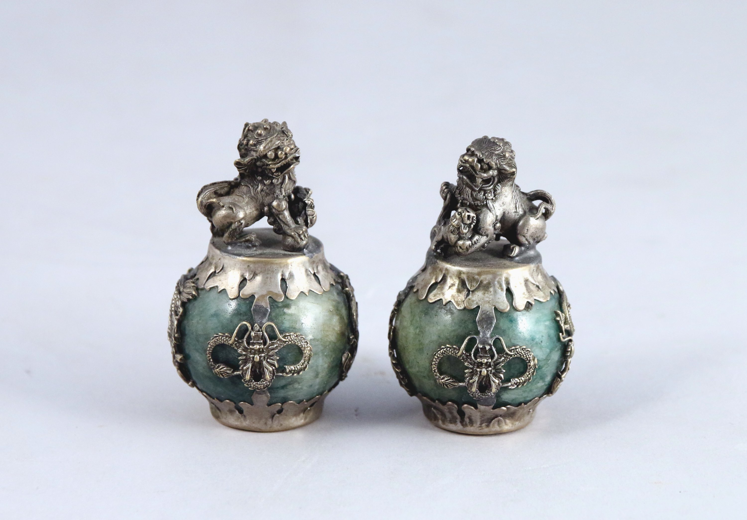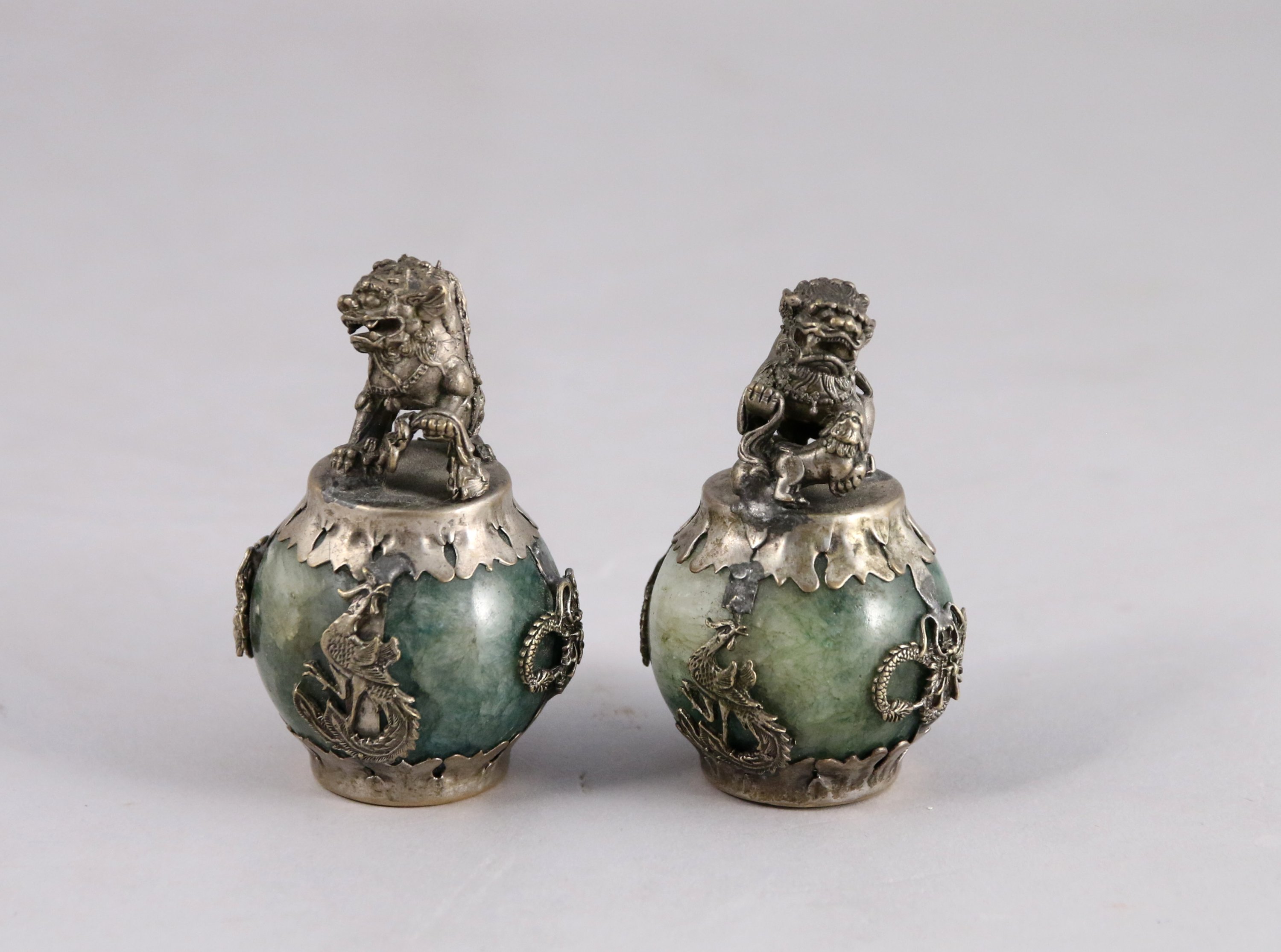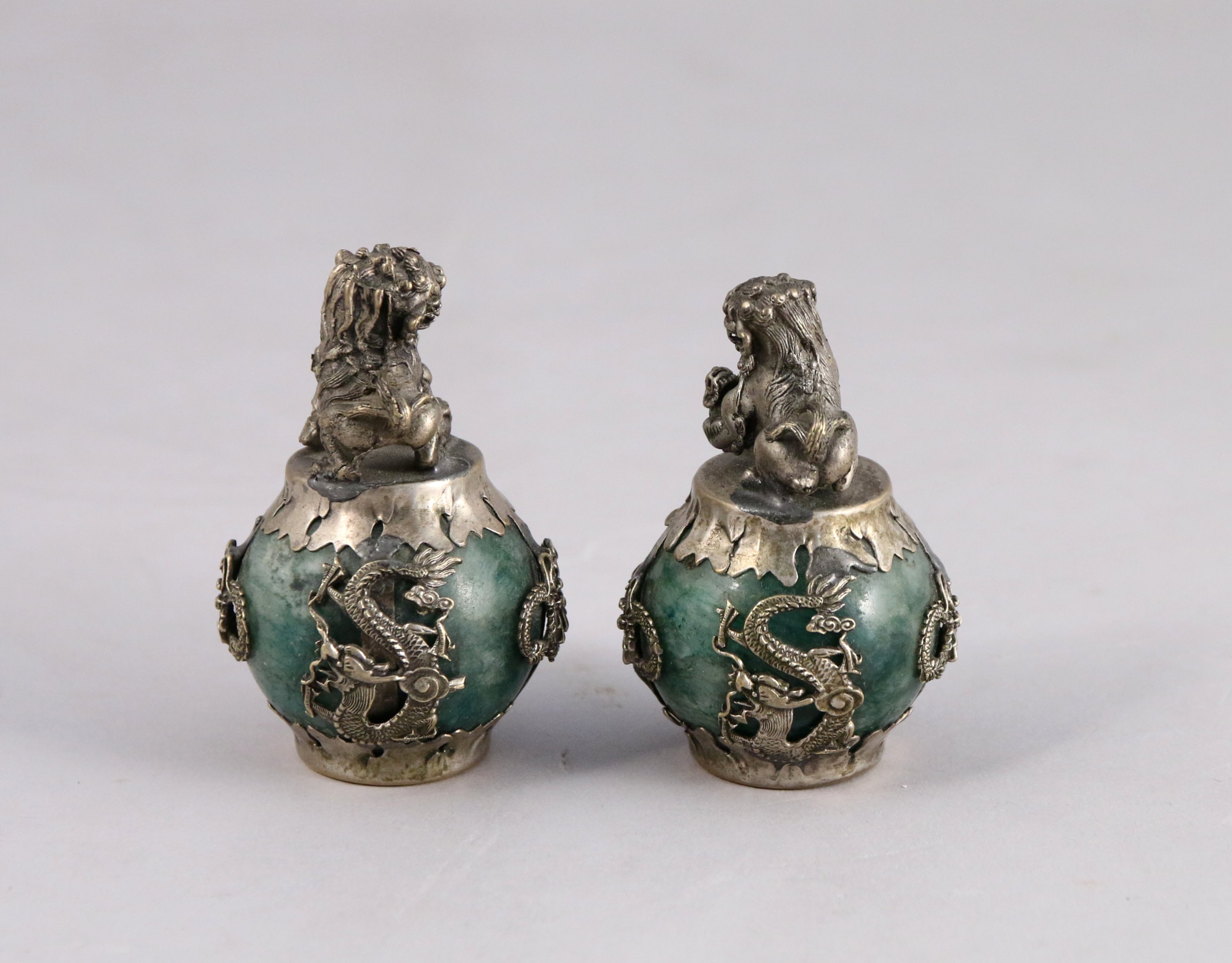 Deux ORNEMENTS formés par deux boules en serpentine verte montés en métal, ornés de dragons et surmontés de lions assis.