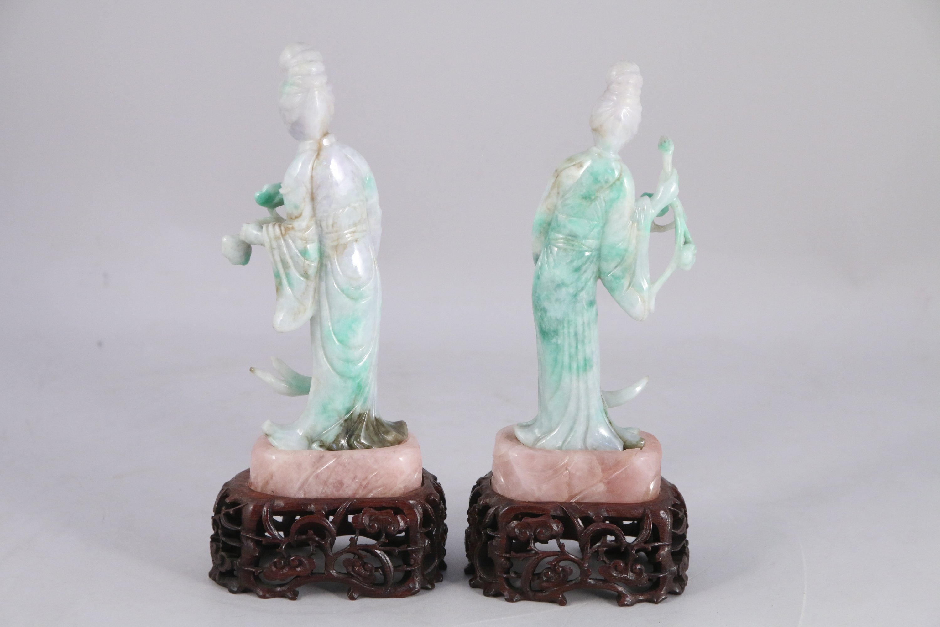Deux STATUETTES de jeunes femmes debout, en jadéite vert pomme tenant des branches. Socles en quartz rose.