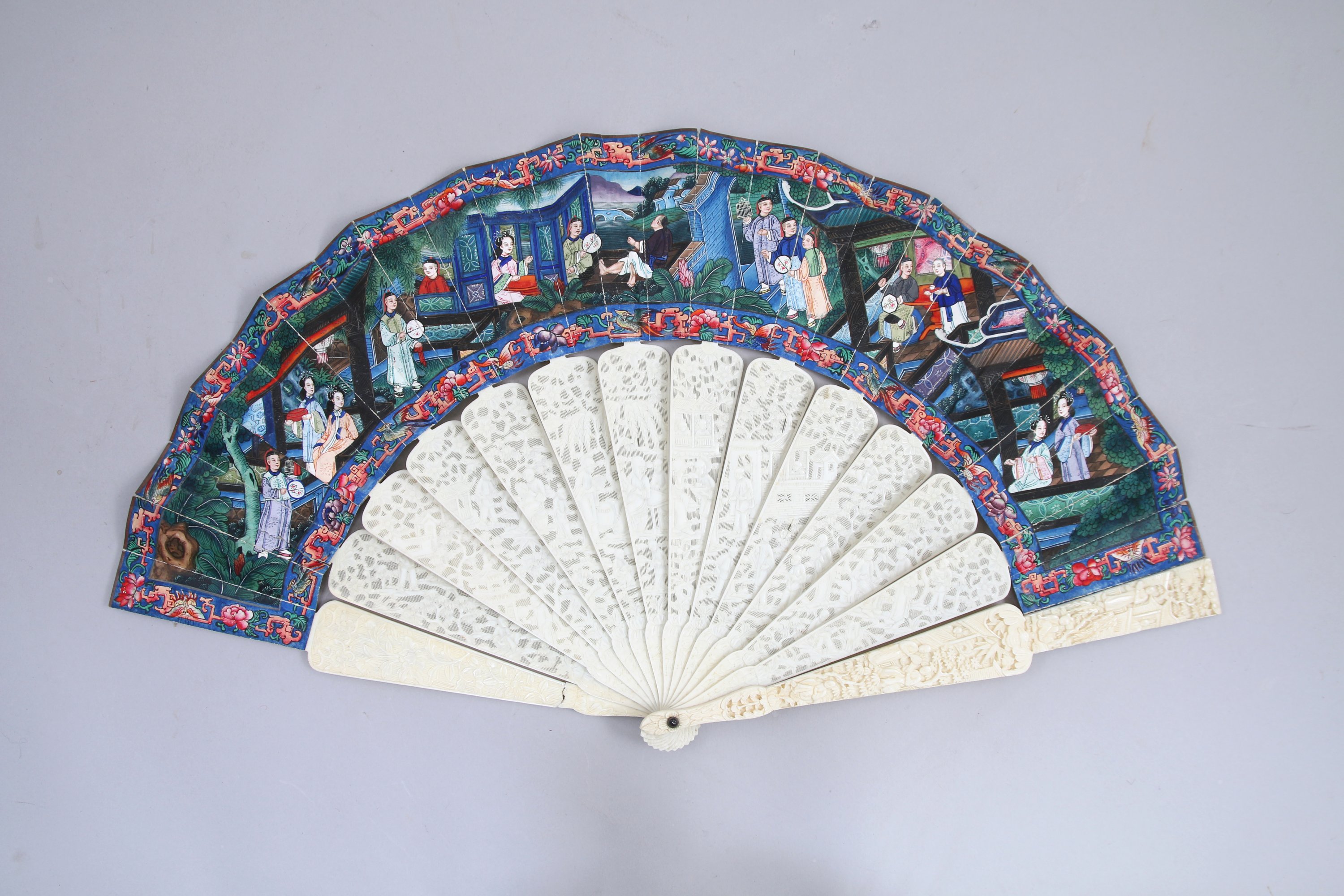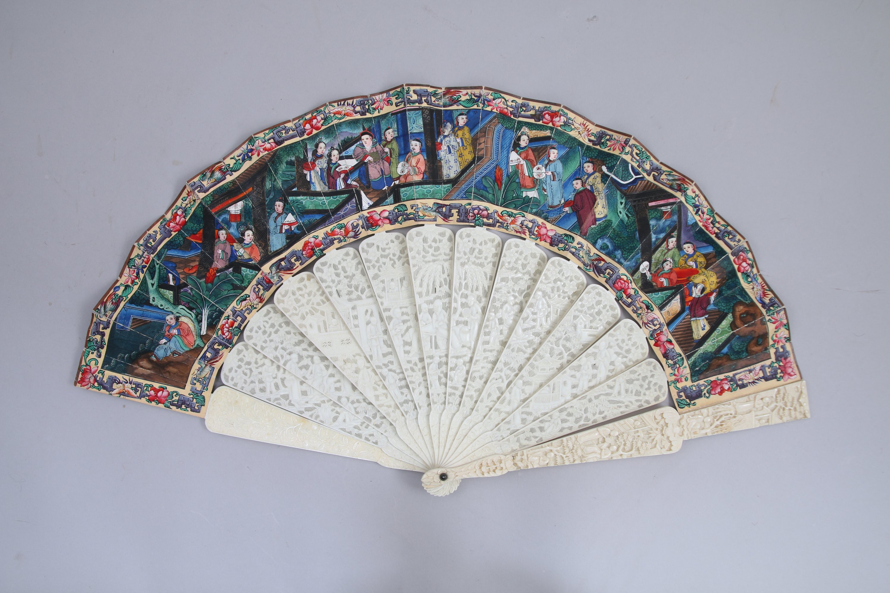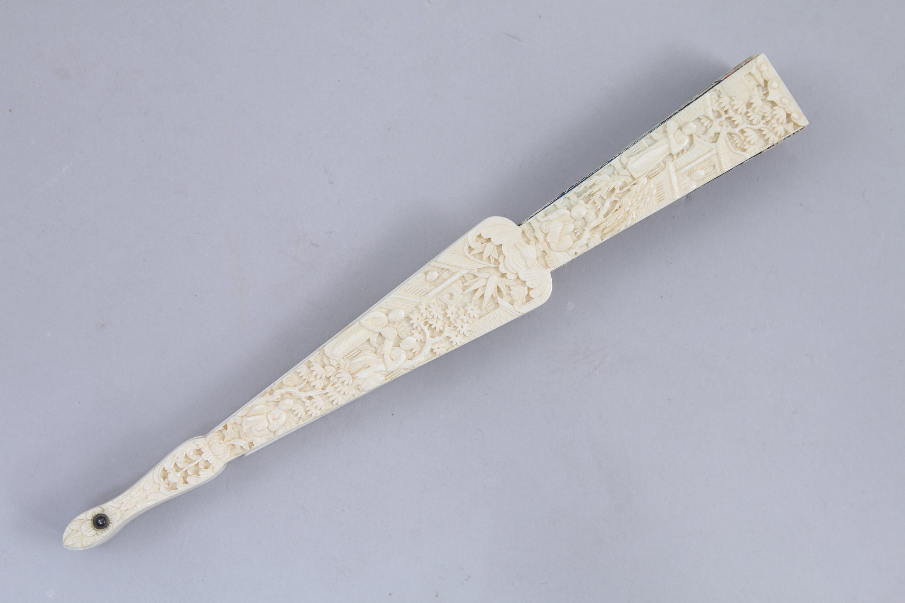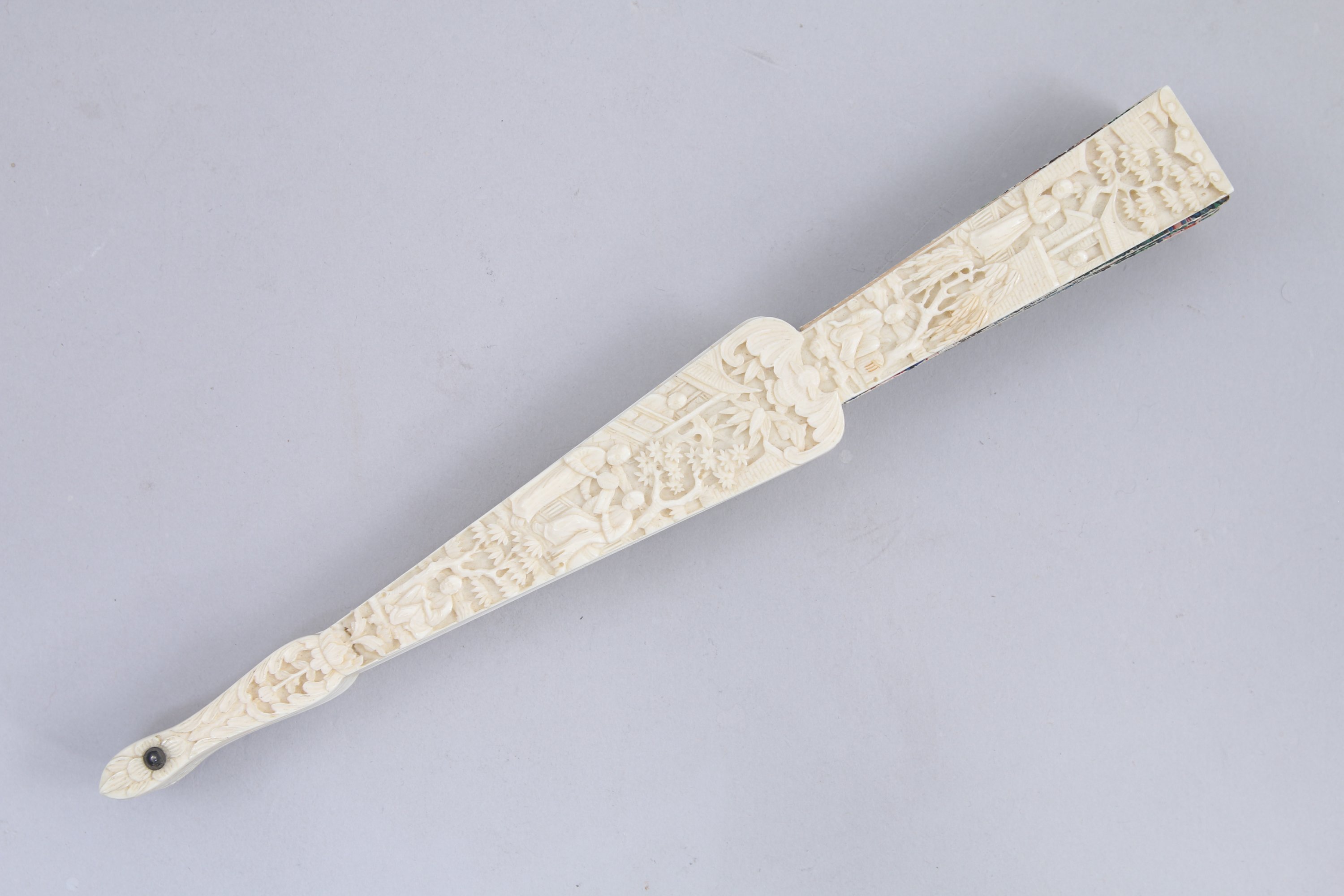 ÉVENTAIL à quinze branches en ivoire sculpté de personnages et peint de scènes de vie quotidienne de personnages dans des palais, les têtes en ivoire peint sur une face.