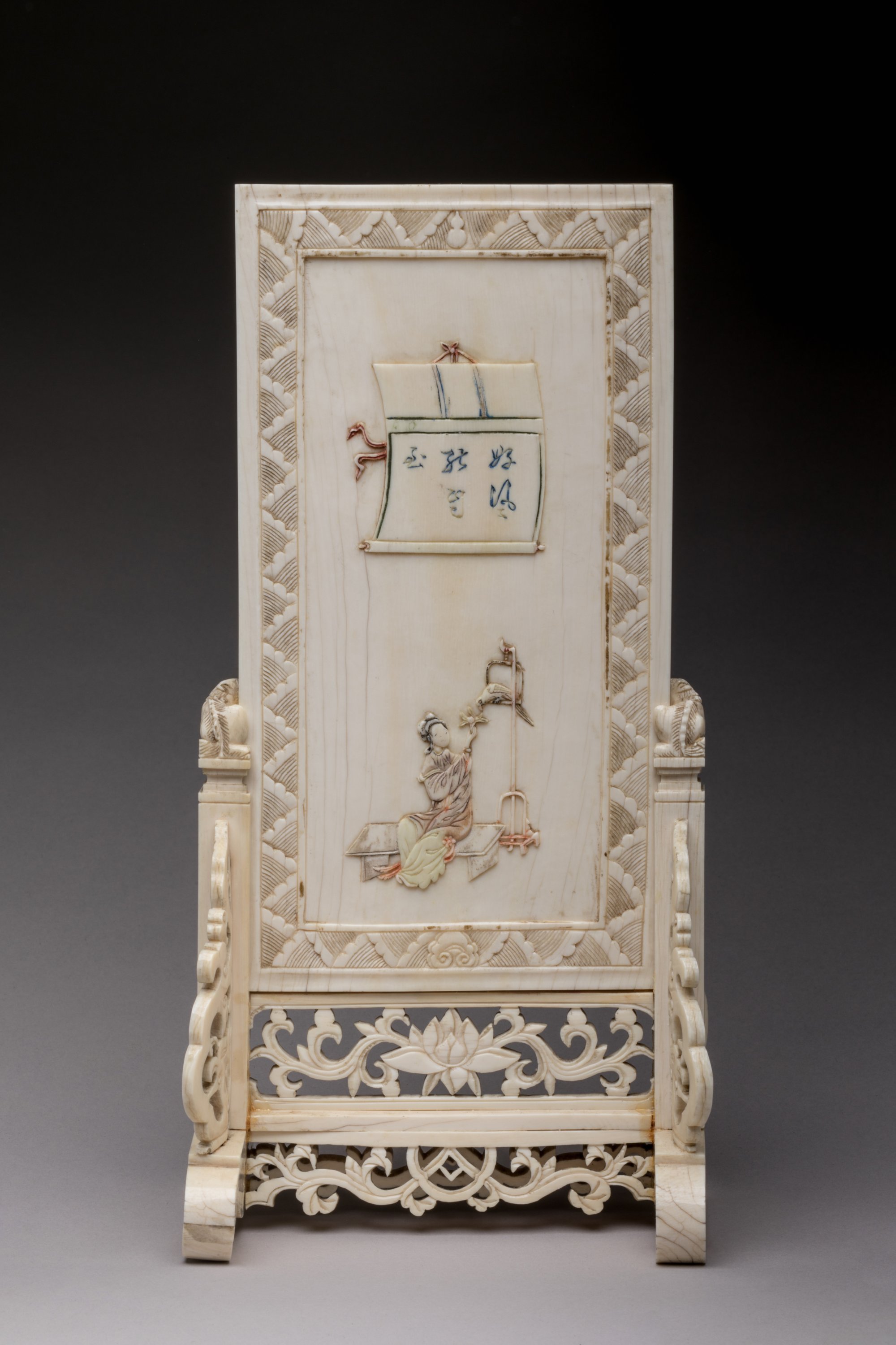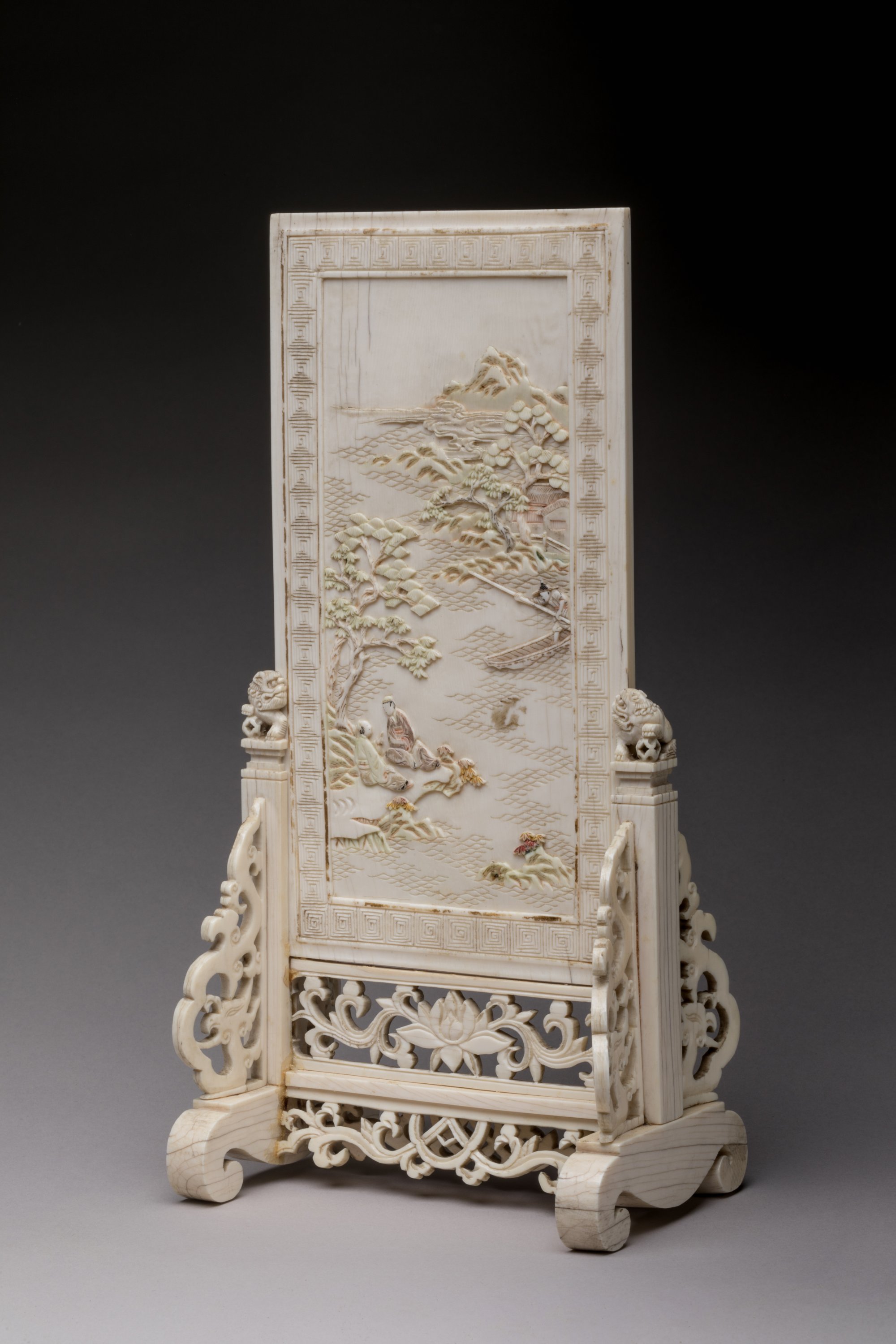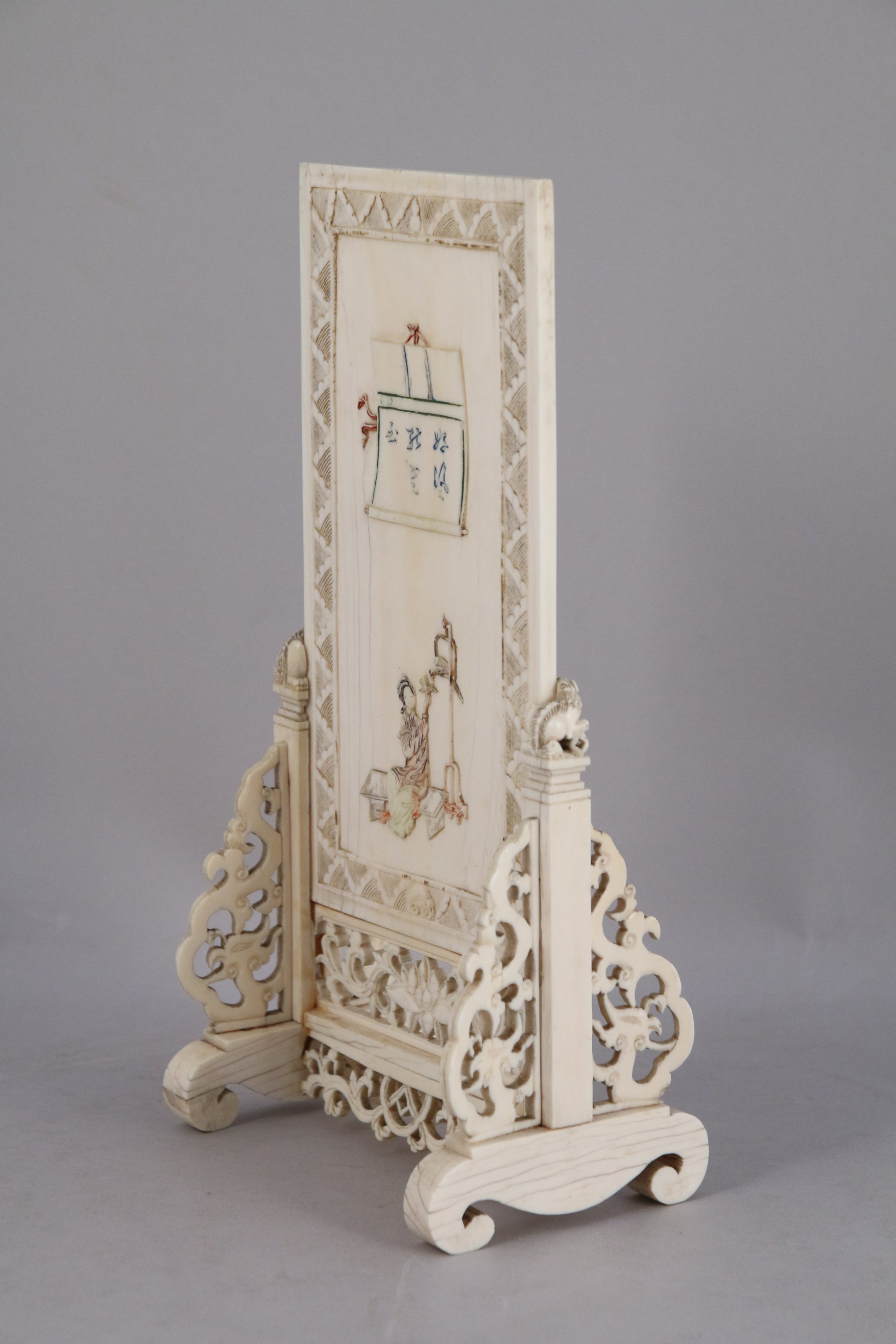 ÉCRAN DE TABLE en ivoire, à traces de polychromie, sculpté en bas-relief sur une face de deux lettrés près d'une rive et d'un pêcheur en barque, sur l'autre face d'une jeune femme nourrissant un perroquet sur son perchoir sous un rouleau déplié orné d'un poème. Le socle ajouré de lotus.