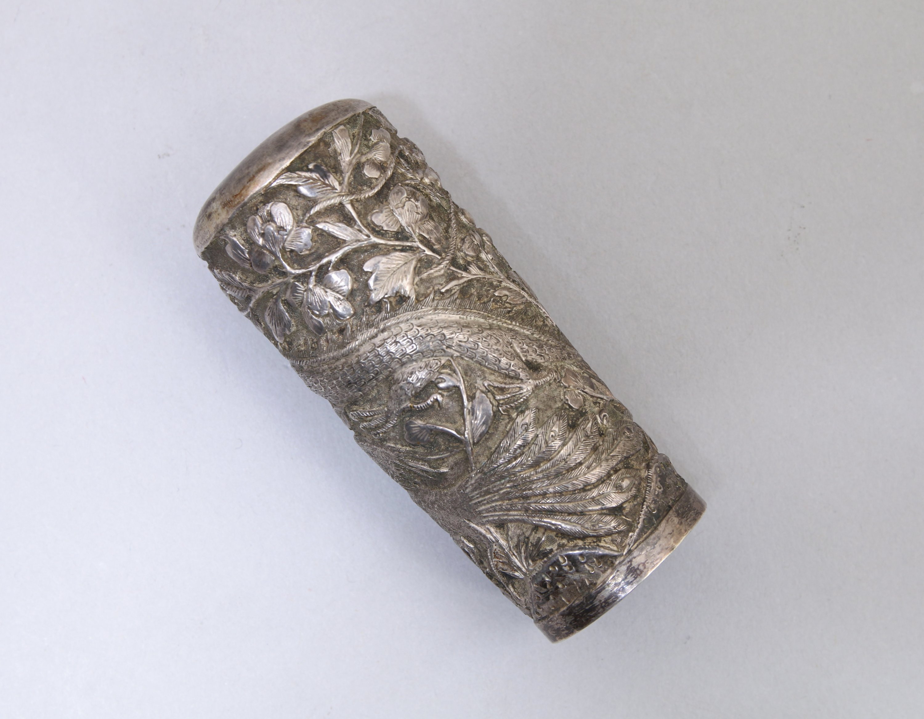 POMMEAU d'OMBRELLE en argent. Aux motifs de dragons au repoussé.
