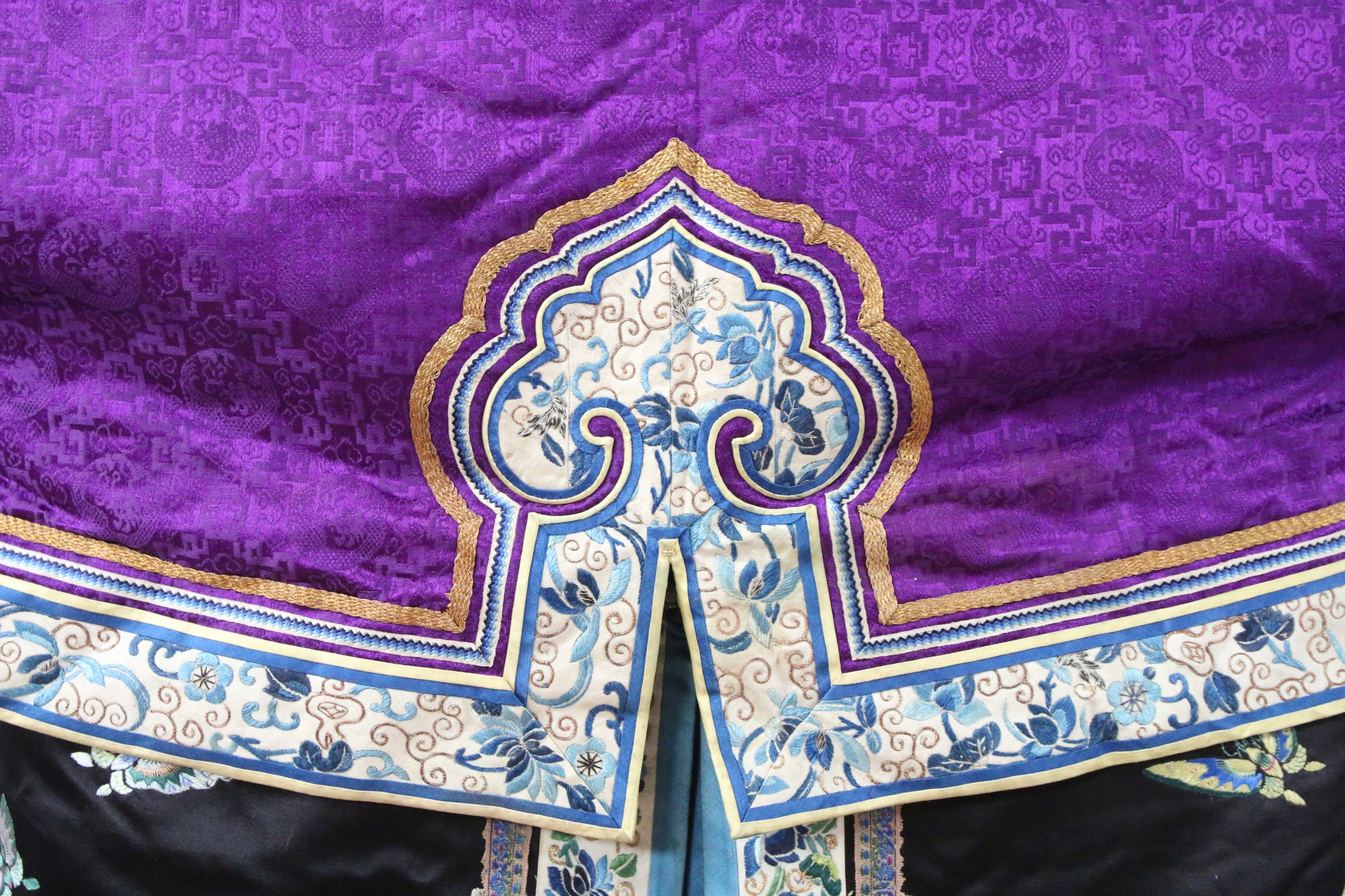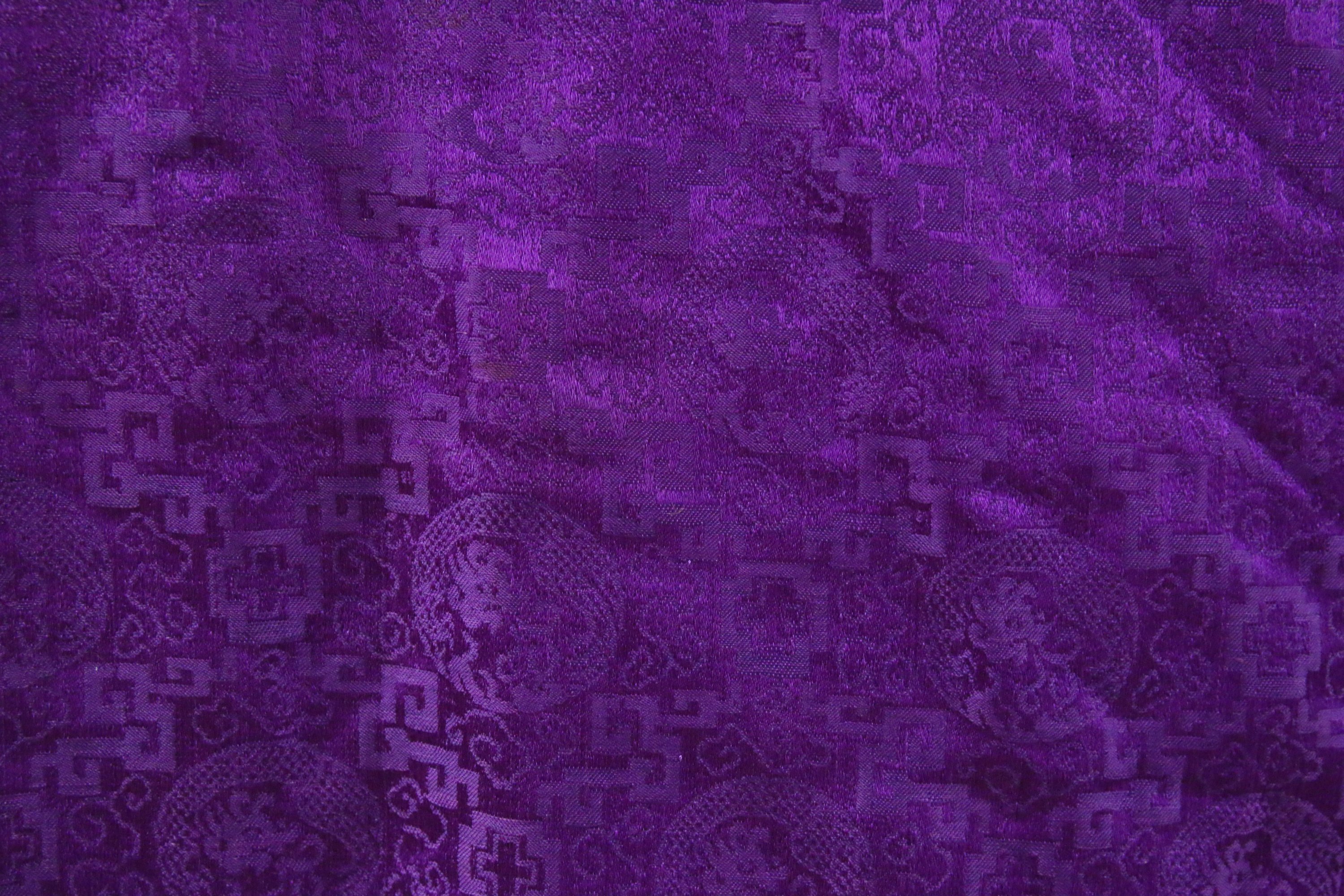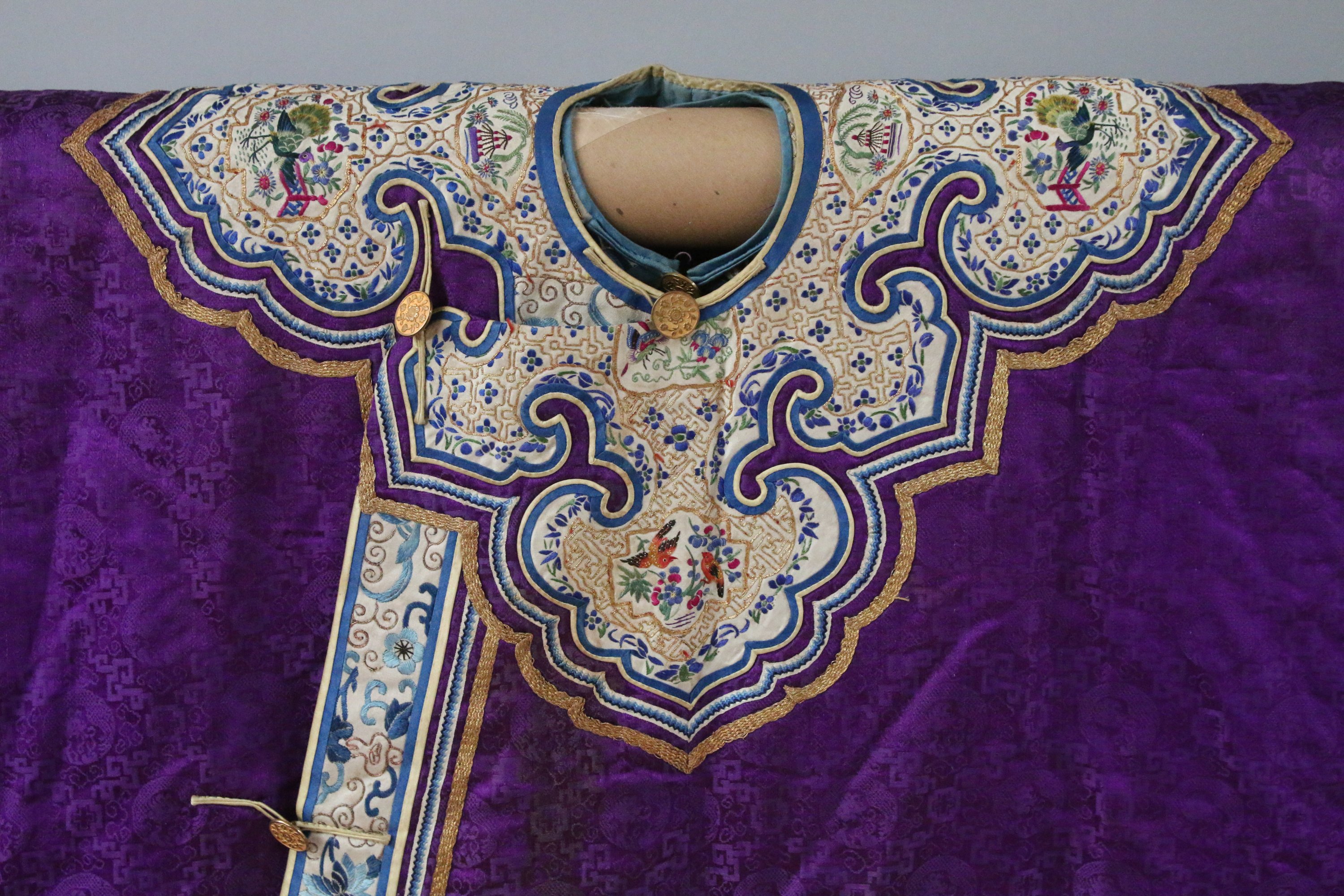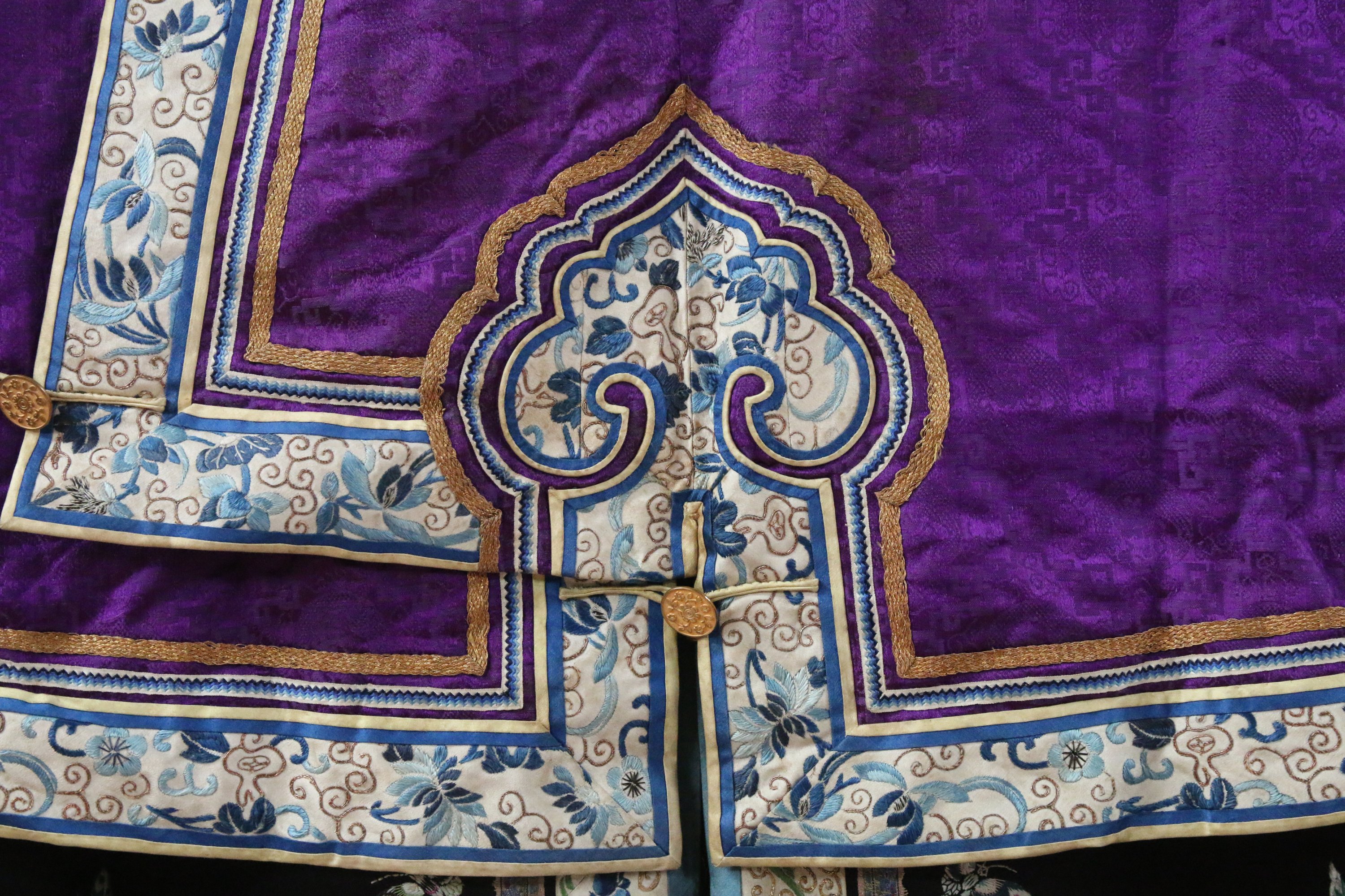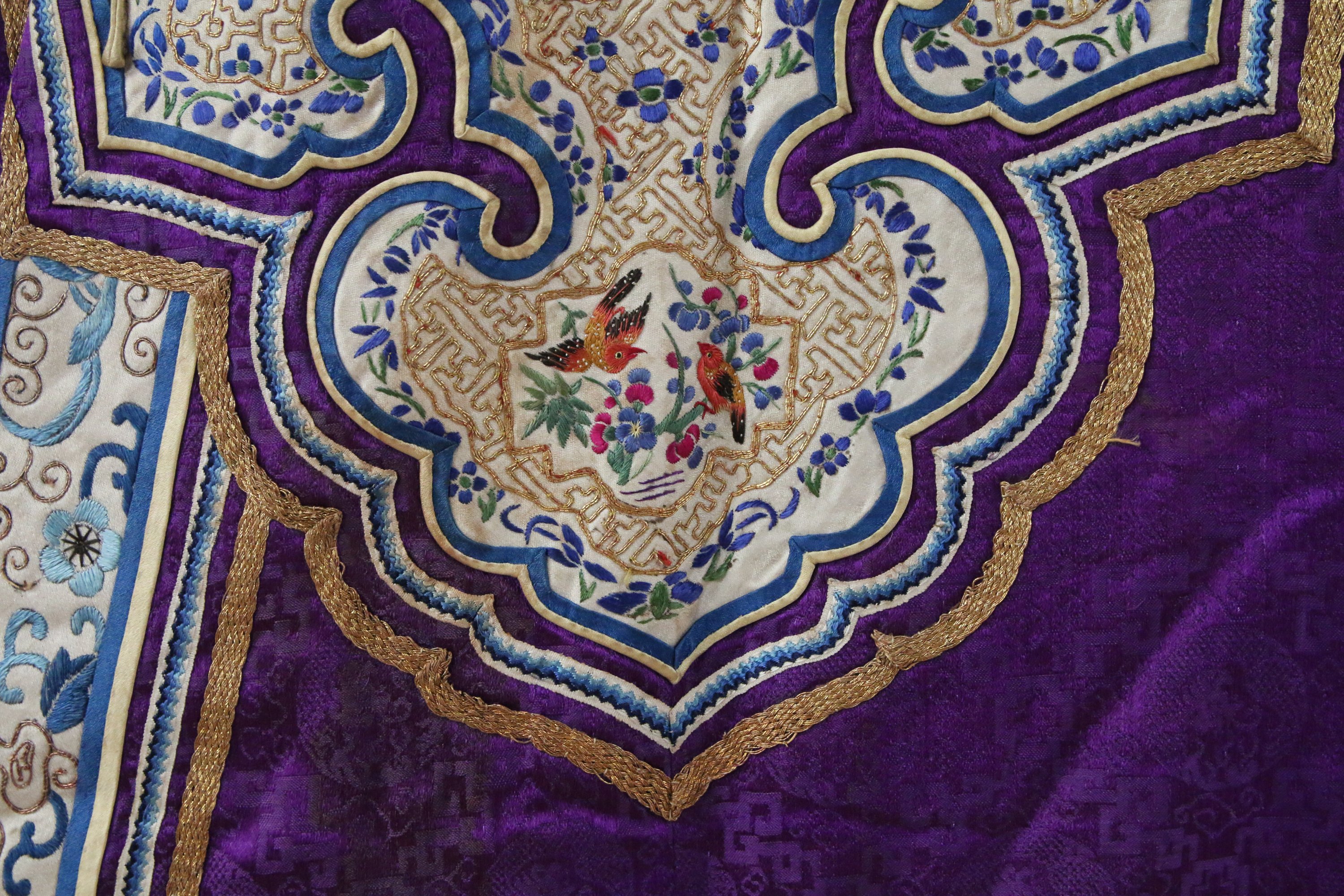 - VESTE fermée sur le côté? en soie violette damassée de dragons, les bordures en soie écrue brodée aux fils polychromes et dorée de fleurs et oiseaux. Rembourrée de coton, doublure en soie bleue.