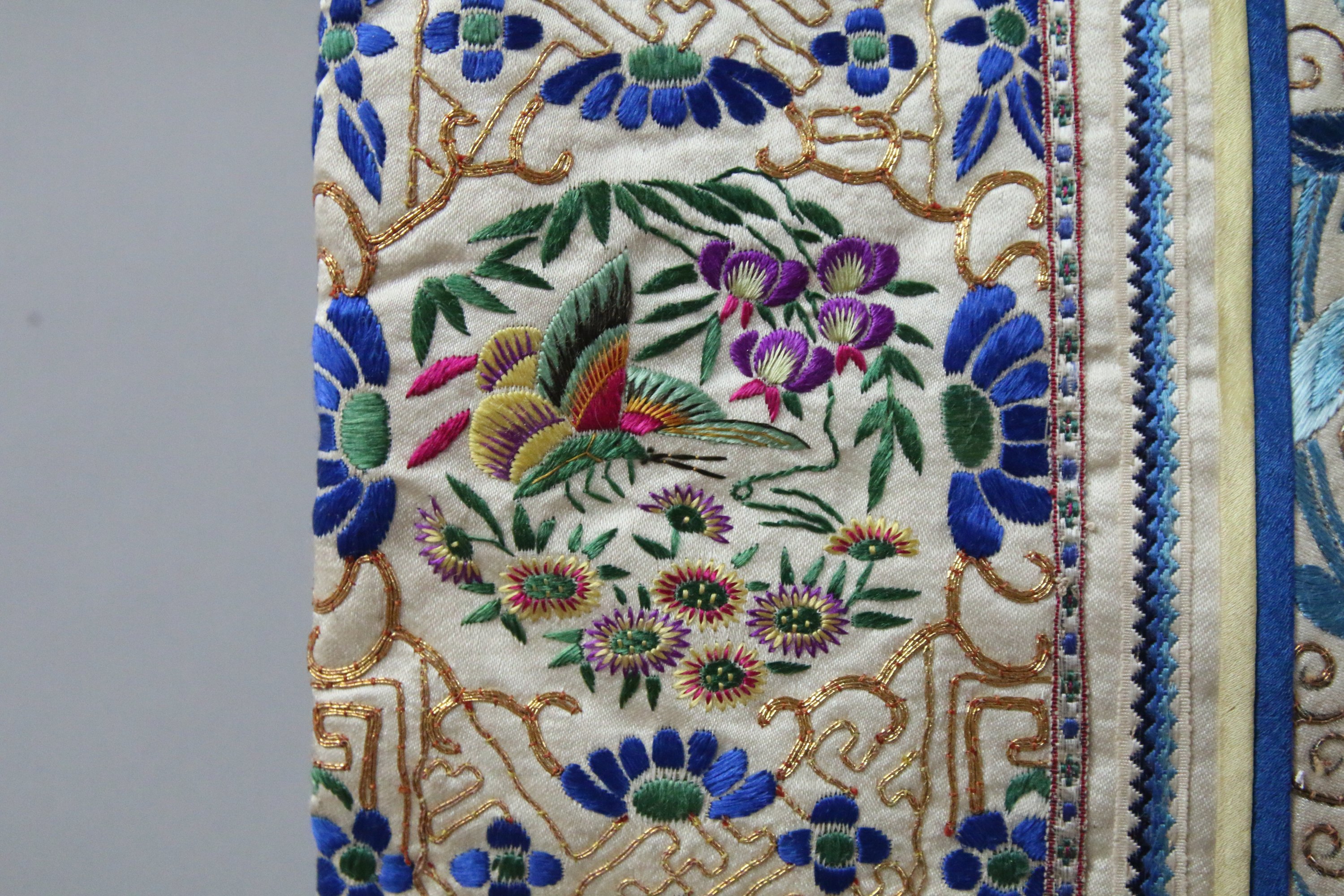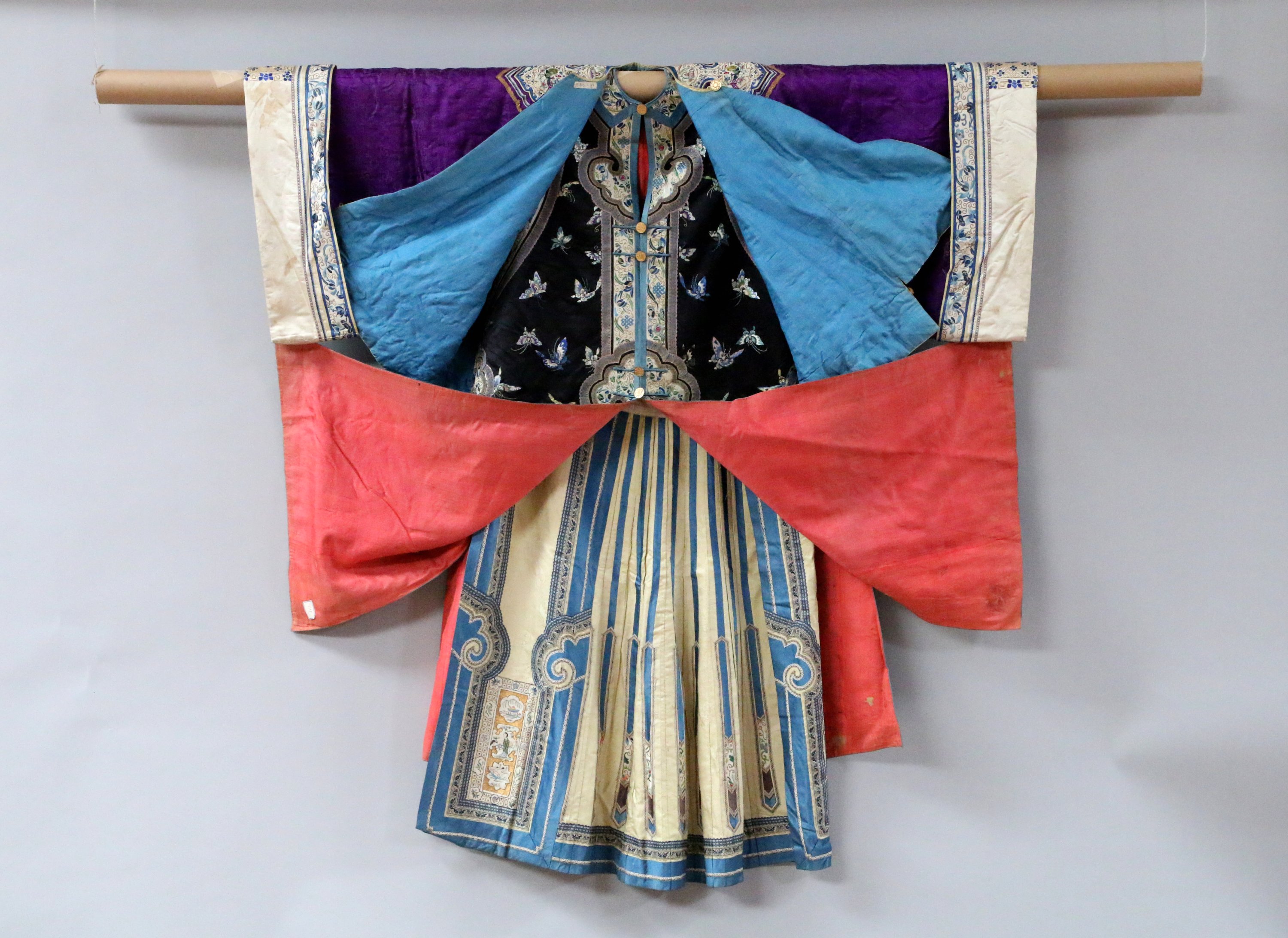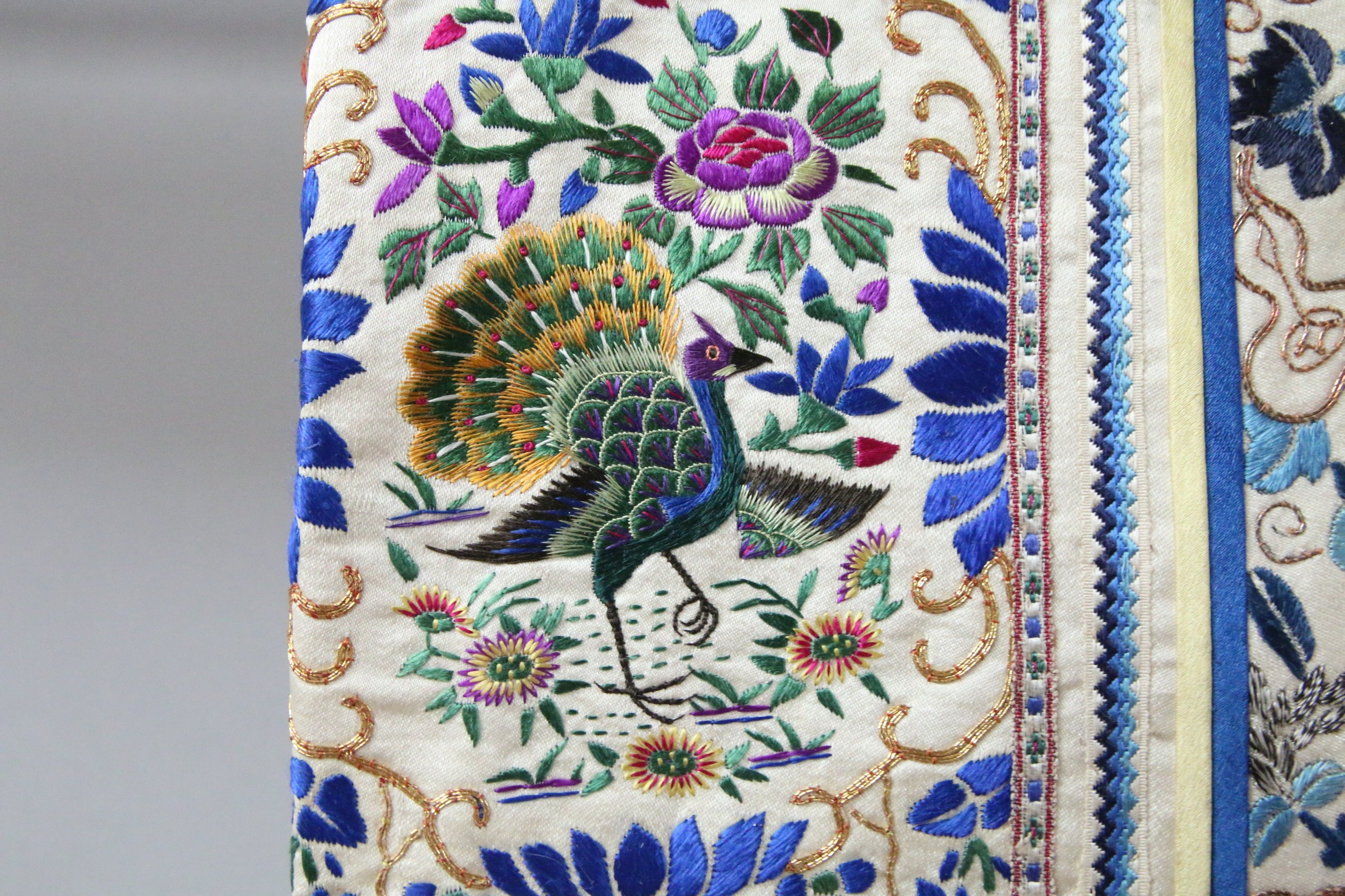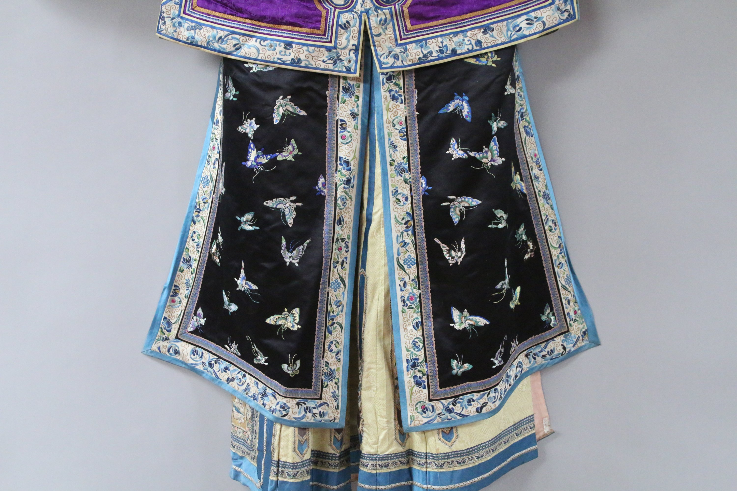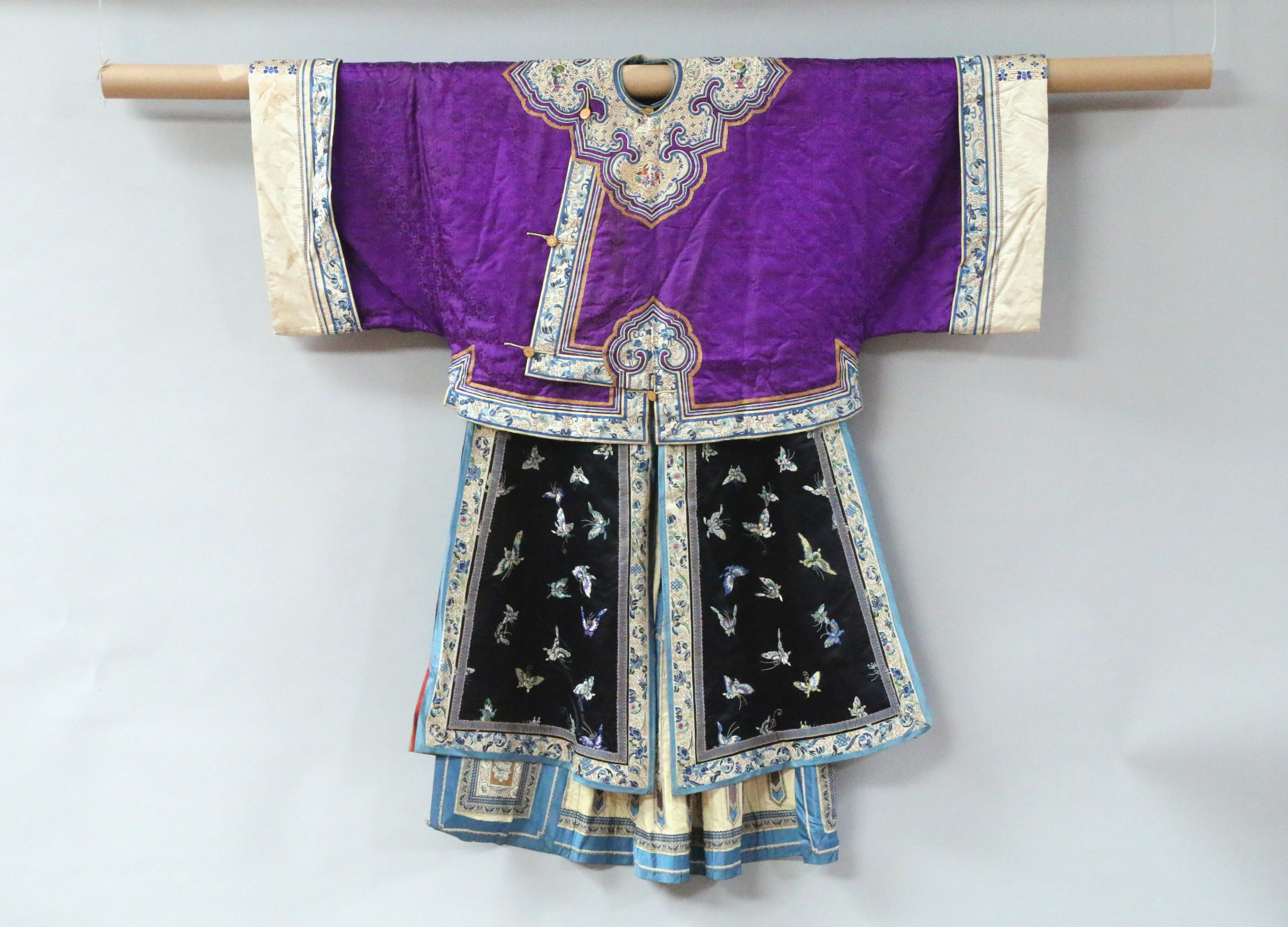 - VESTE fermée sur le côté? en soie violette damassée de dragons, les bordures en soie écrue brodée aux fils polychromes et dorée de fleurs et oiseaux. Rembourrée de coton, doublure en soie bleue.