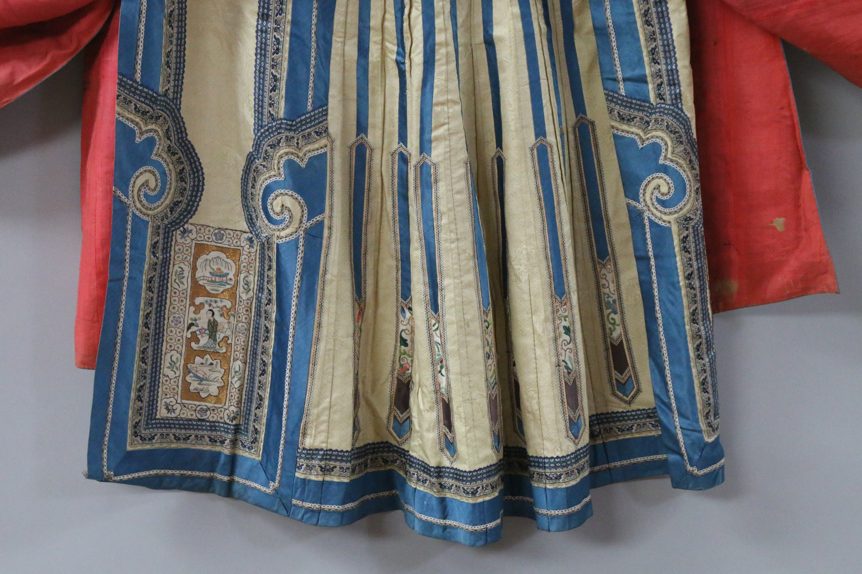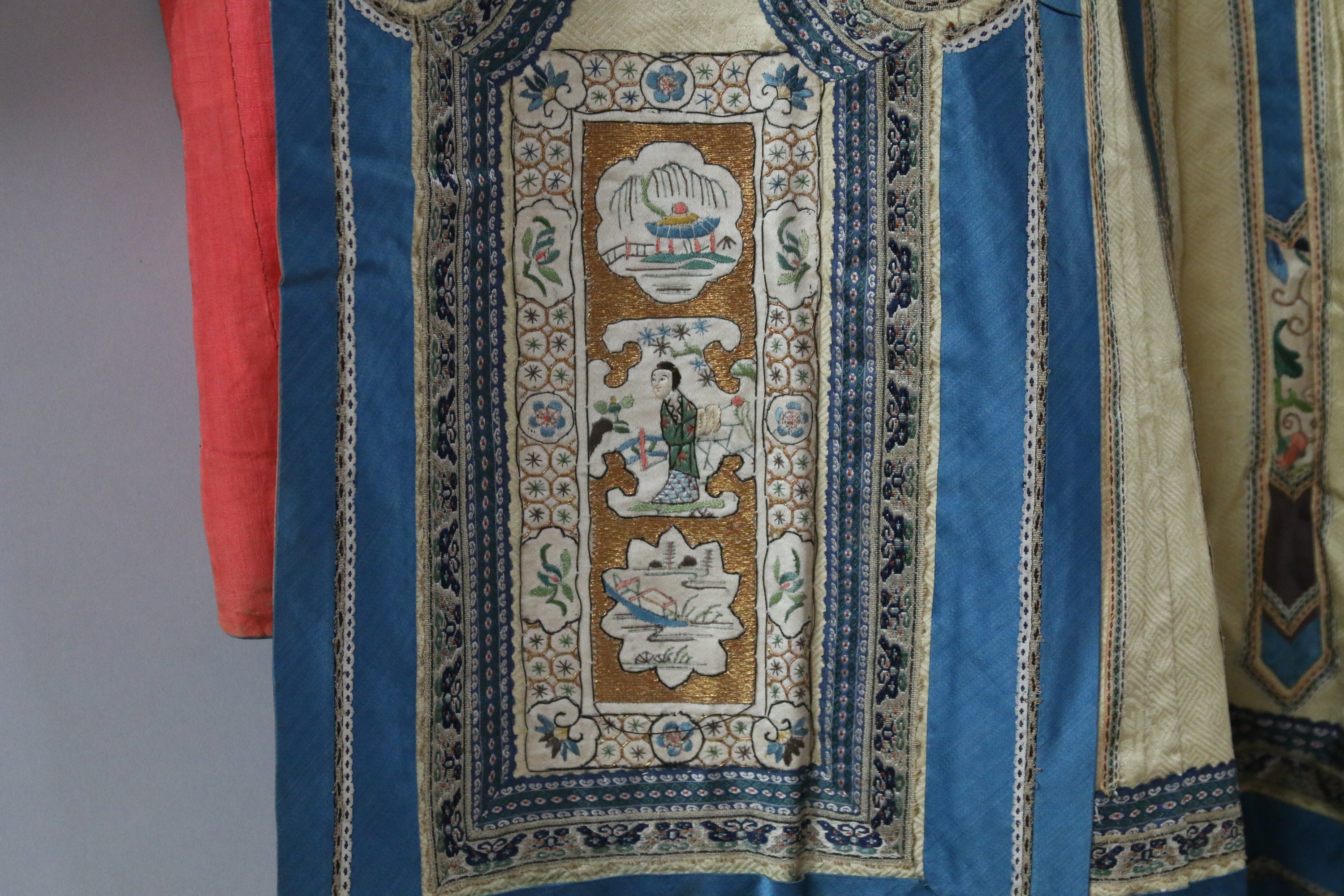 - JUPE en soie jaune damassée de fleurs, à décor brodé de personnages et fleurs.