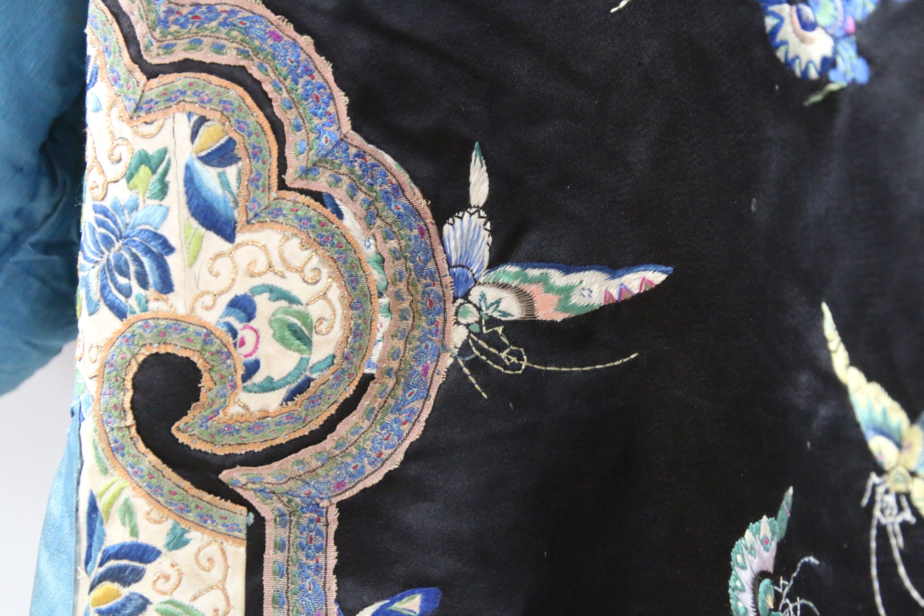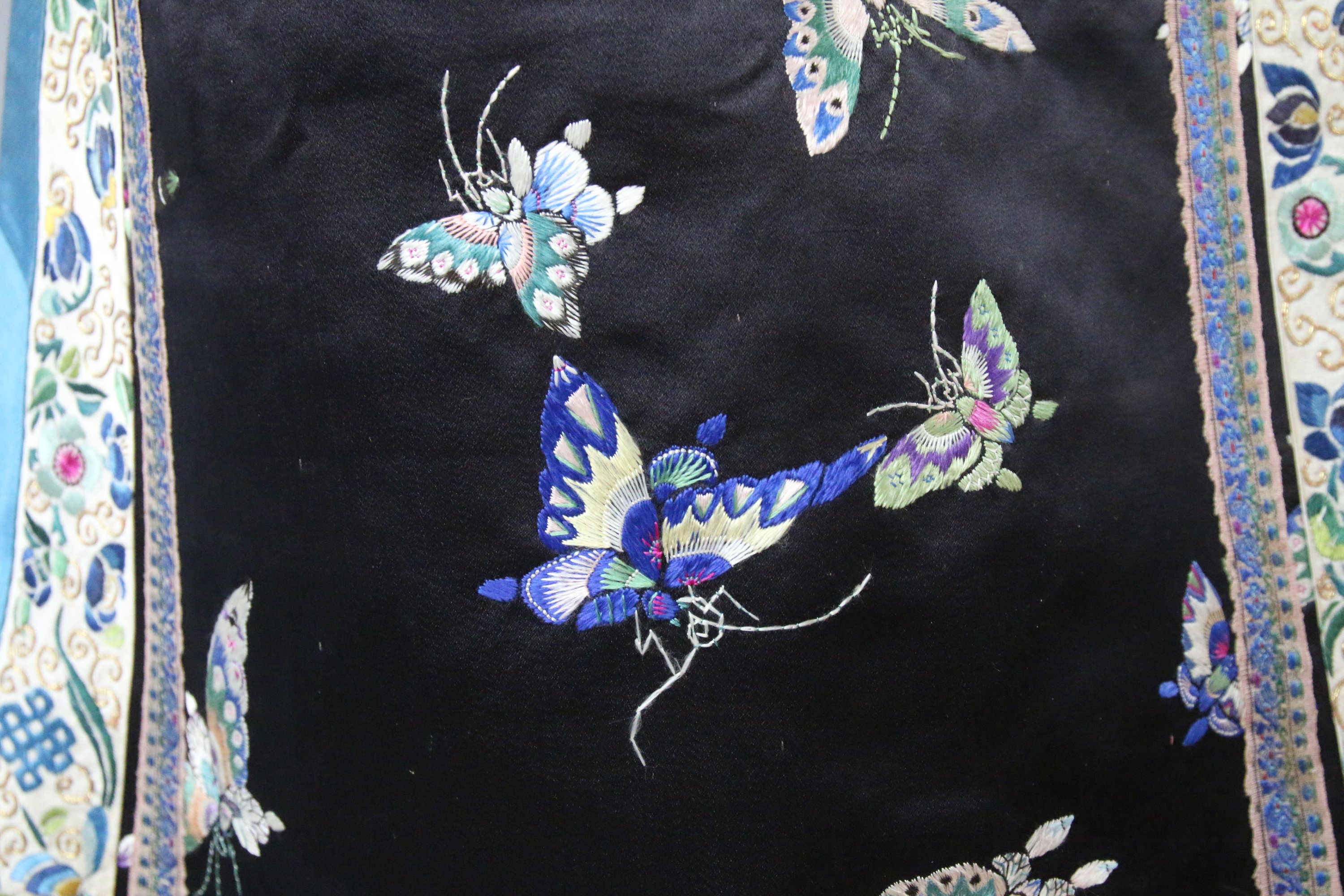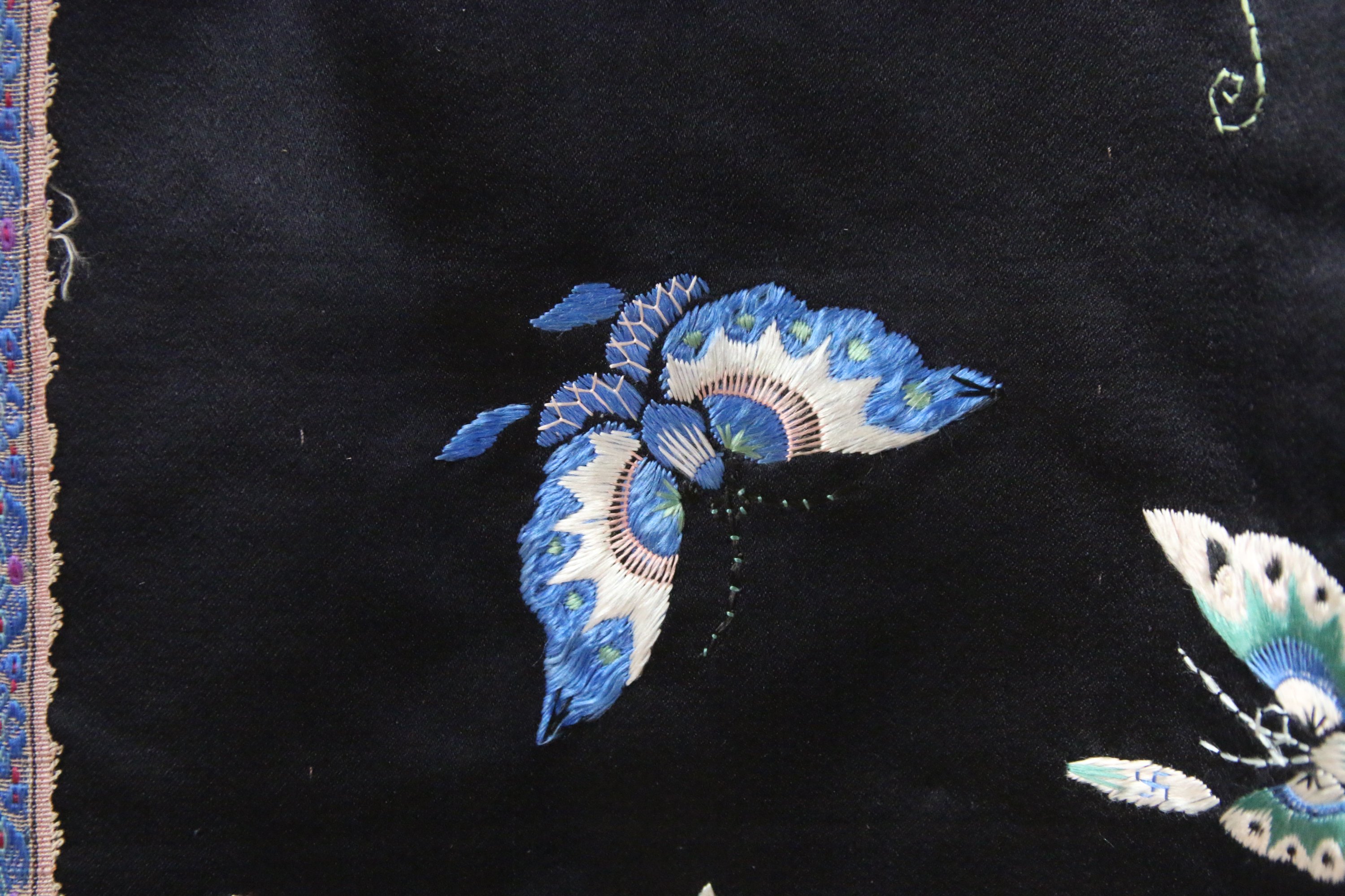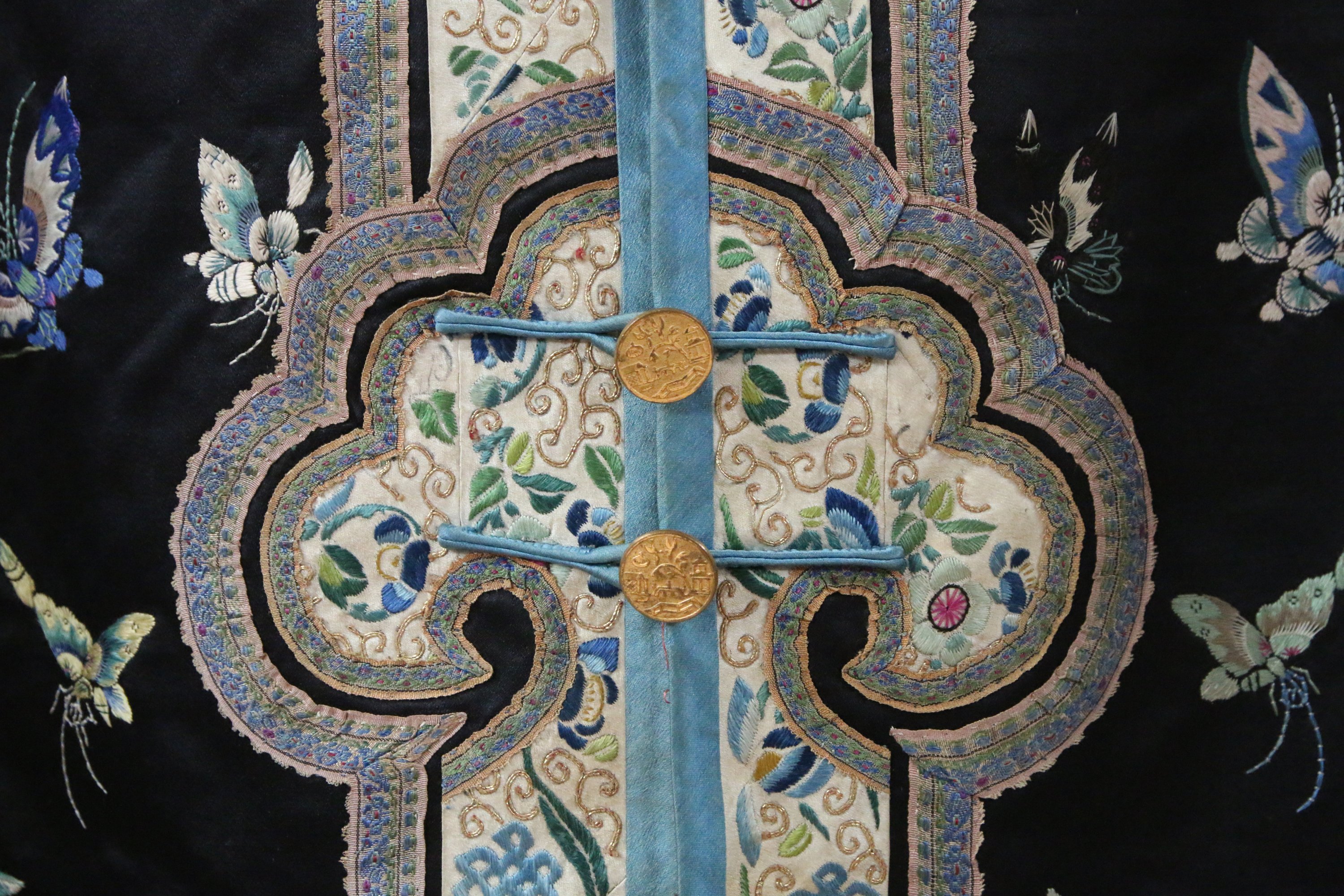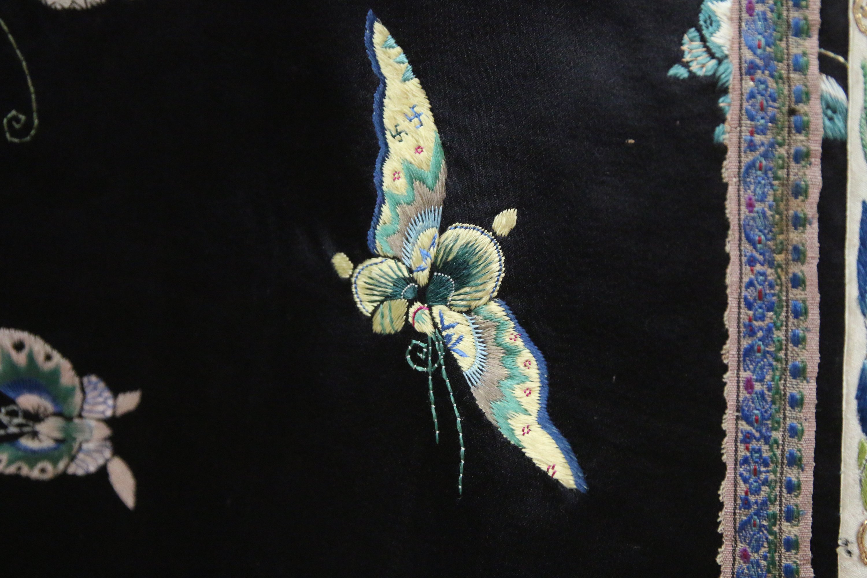 - GILET en soie noire, brodé aux fils polychromes de papillons, les bordures en soie écrue brodée de fleurs, doublure en soie rouge.