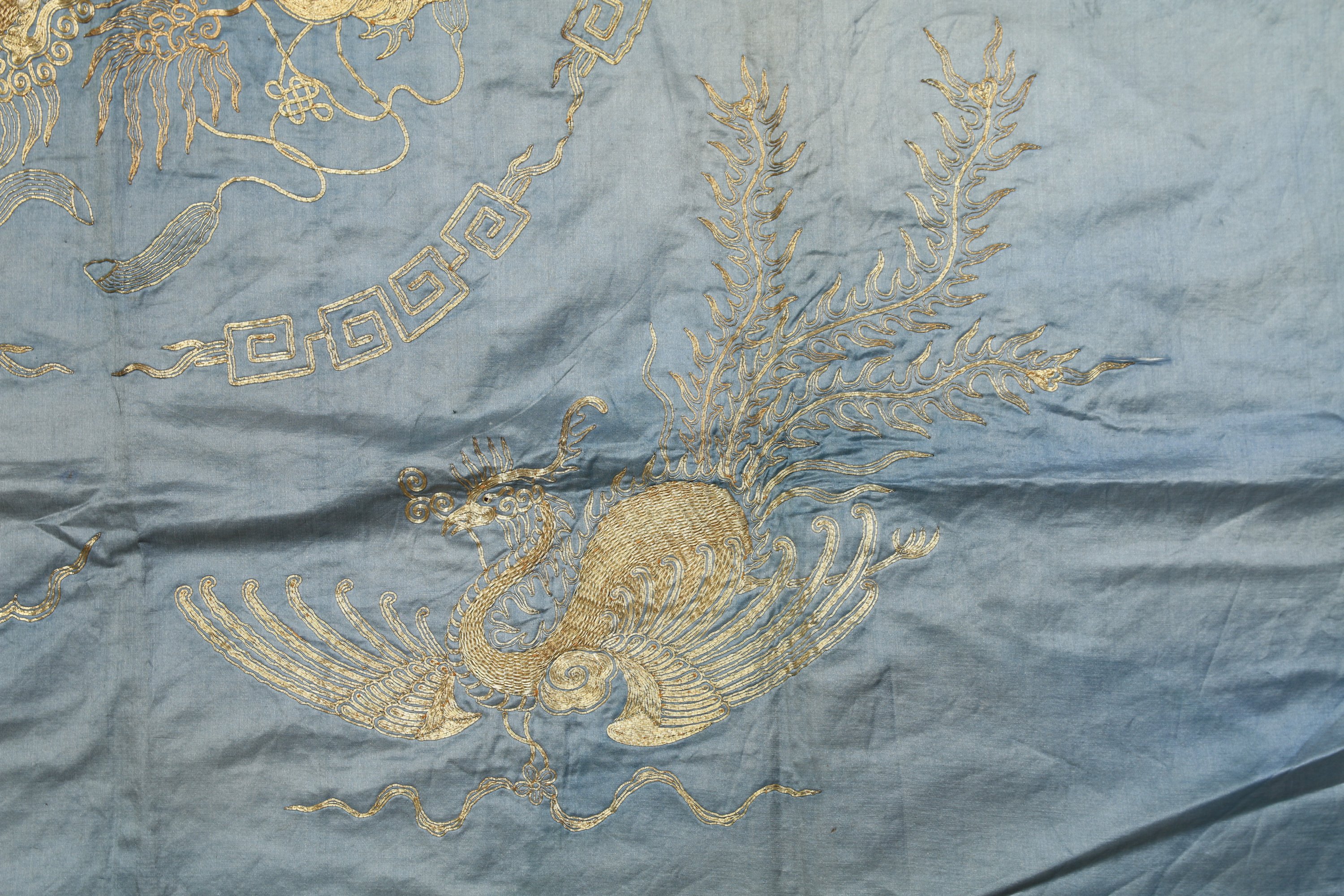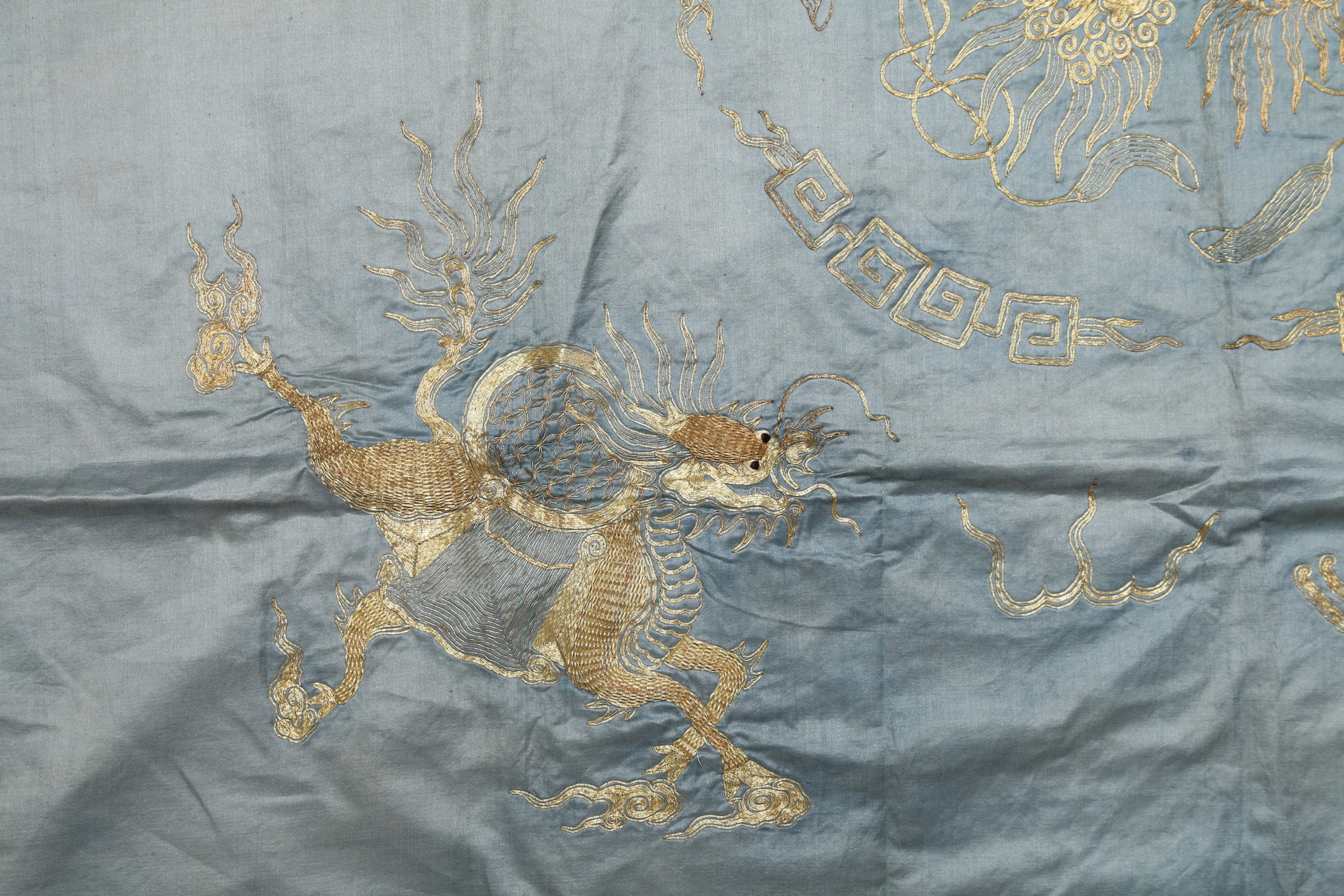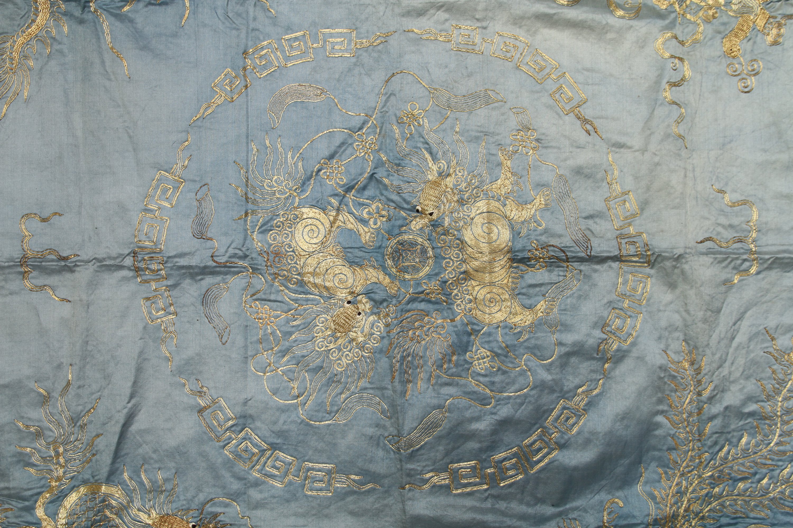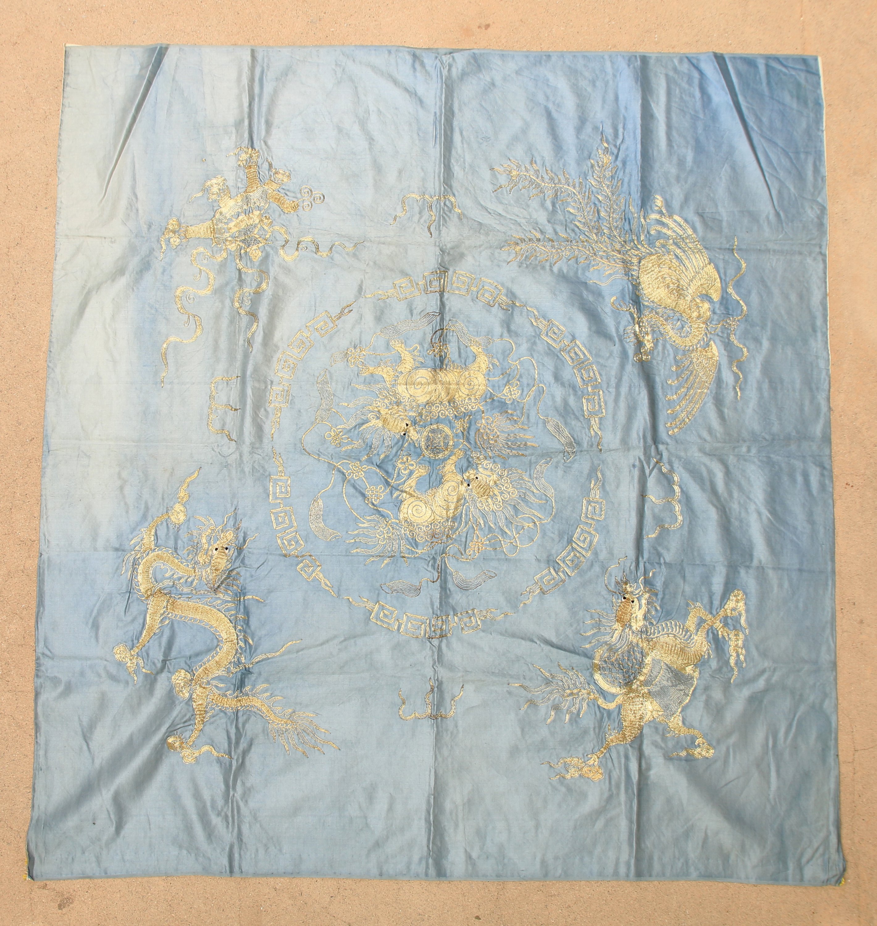CARRÉ de soie brodé de fils d'or en relief, lions dans un médaillon, avec dragon, tortue, héron, cheval aux écoinçons.