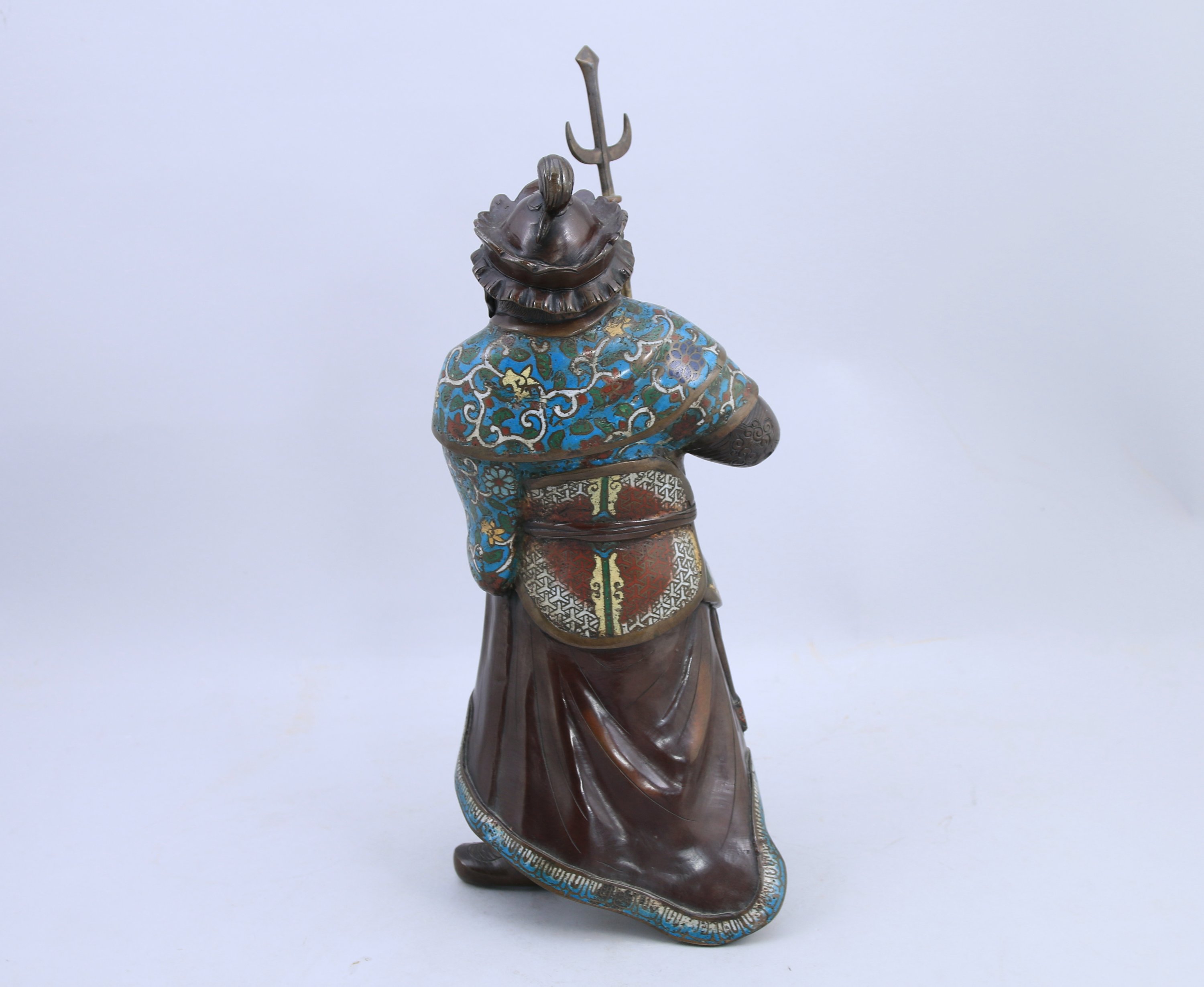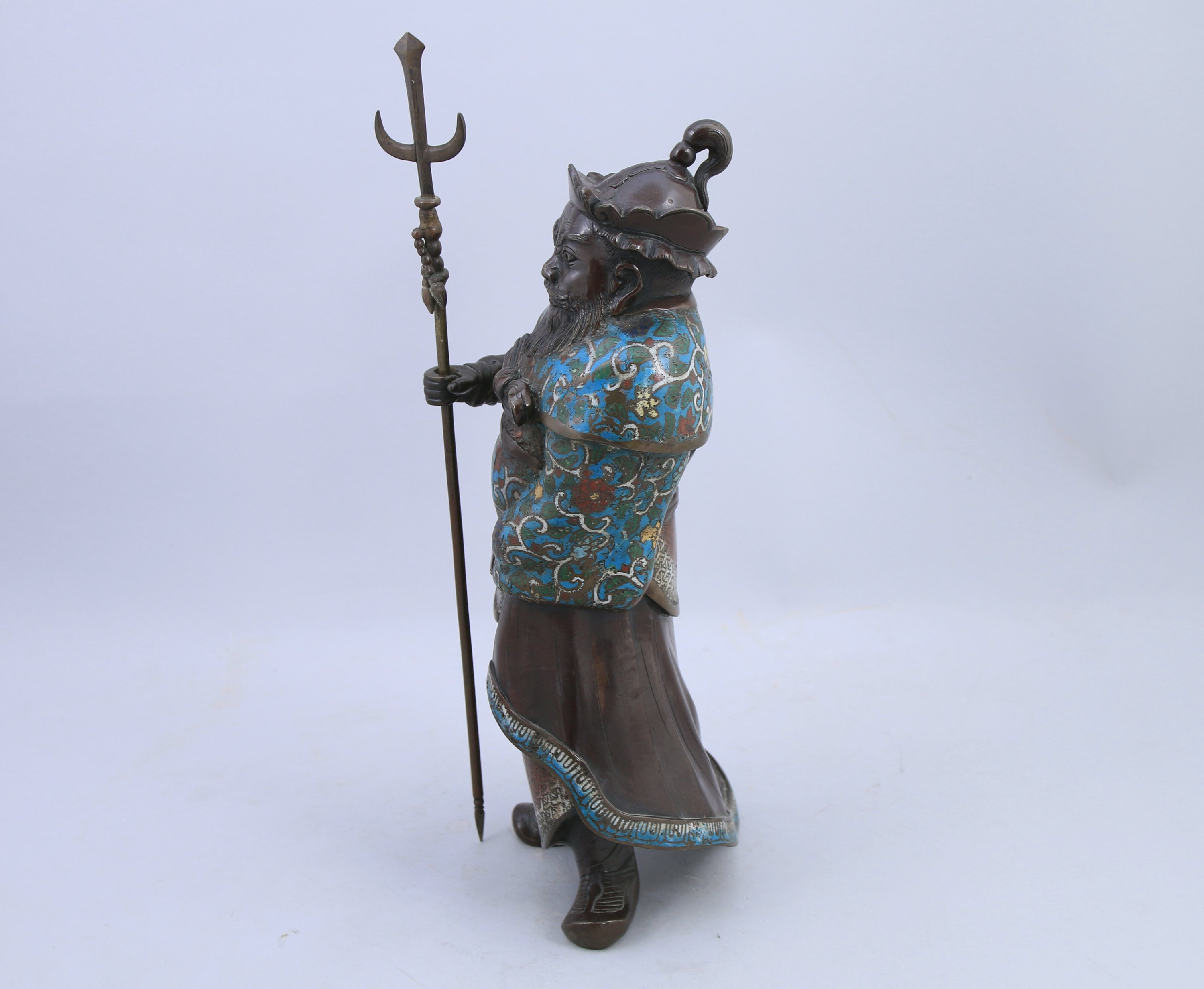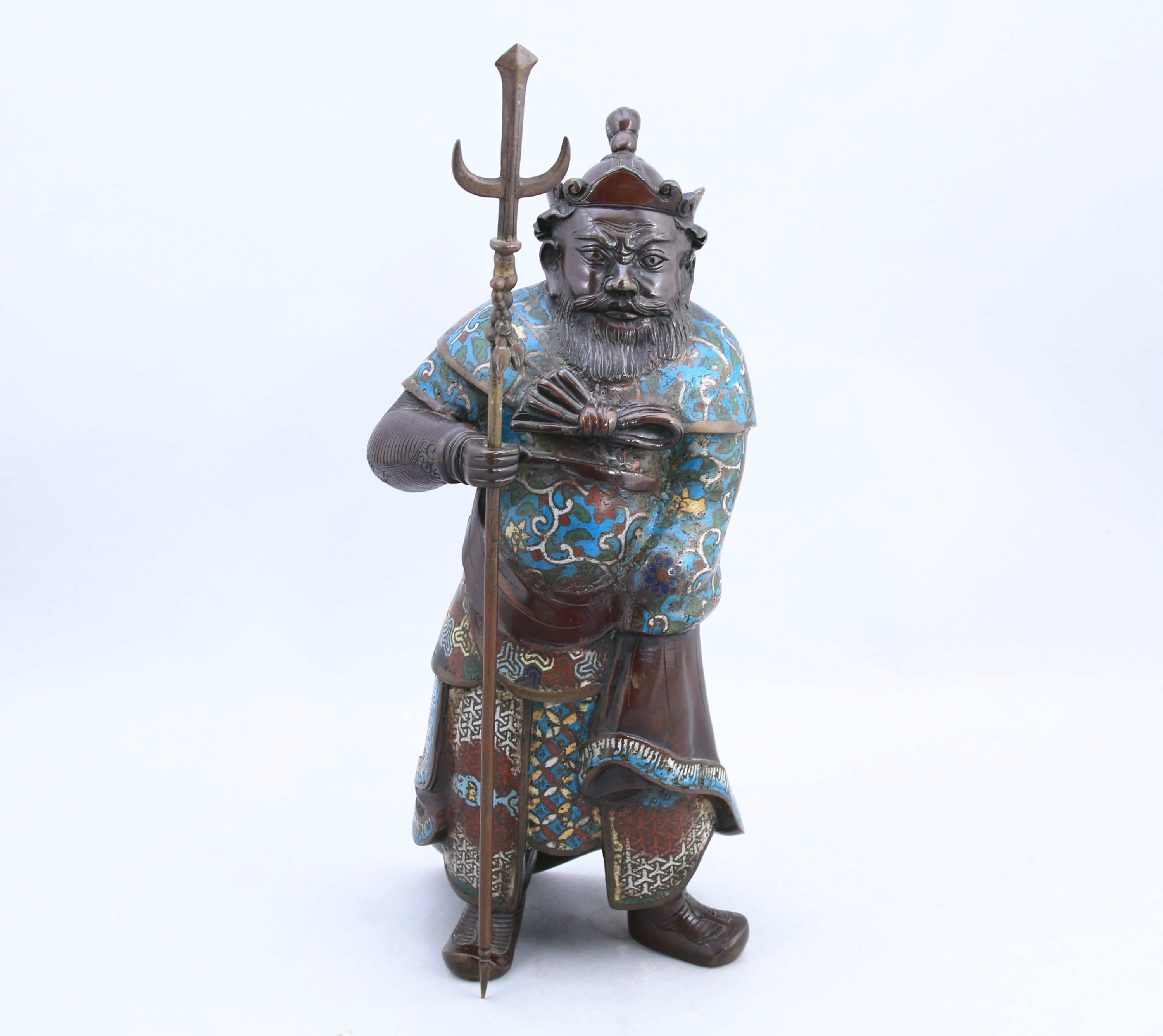 STATUETTE d'un EUNUQUE PORTANT les ATTRIBUTS de sa VIRILITÉ debout en bronze et émaux cloisonnés, tenant une hallebarde dans sa main droite à laquelle sont attachées ses testicules.