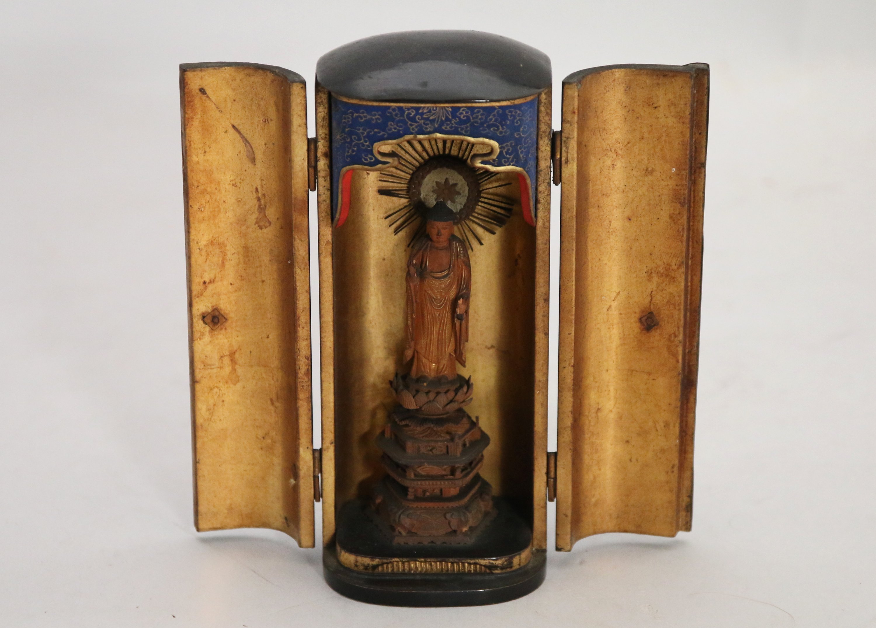 BUTSUDAN en bois laqué noir, à l'intérieur or, découvrant un bouddha debout devant une mandrole.