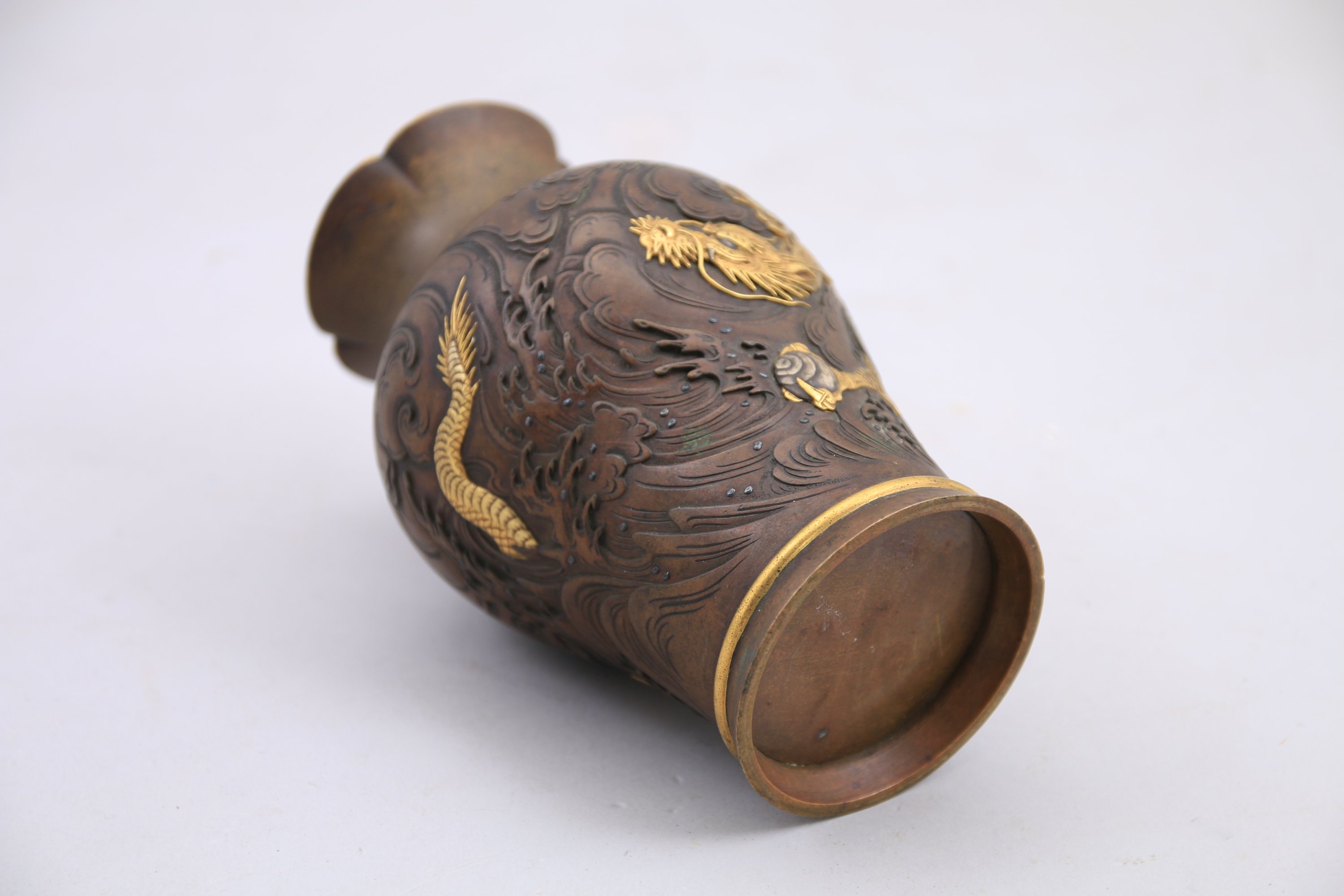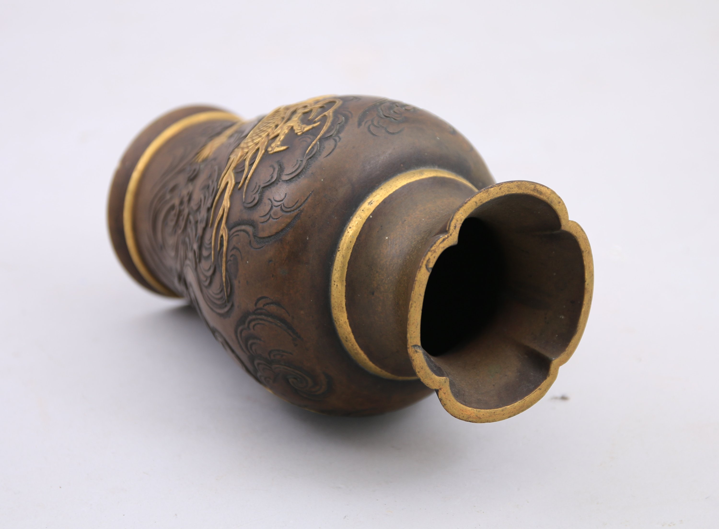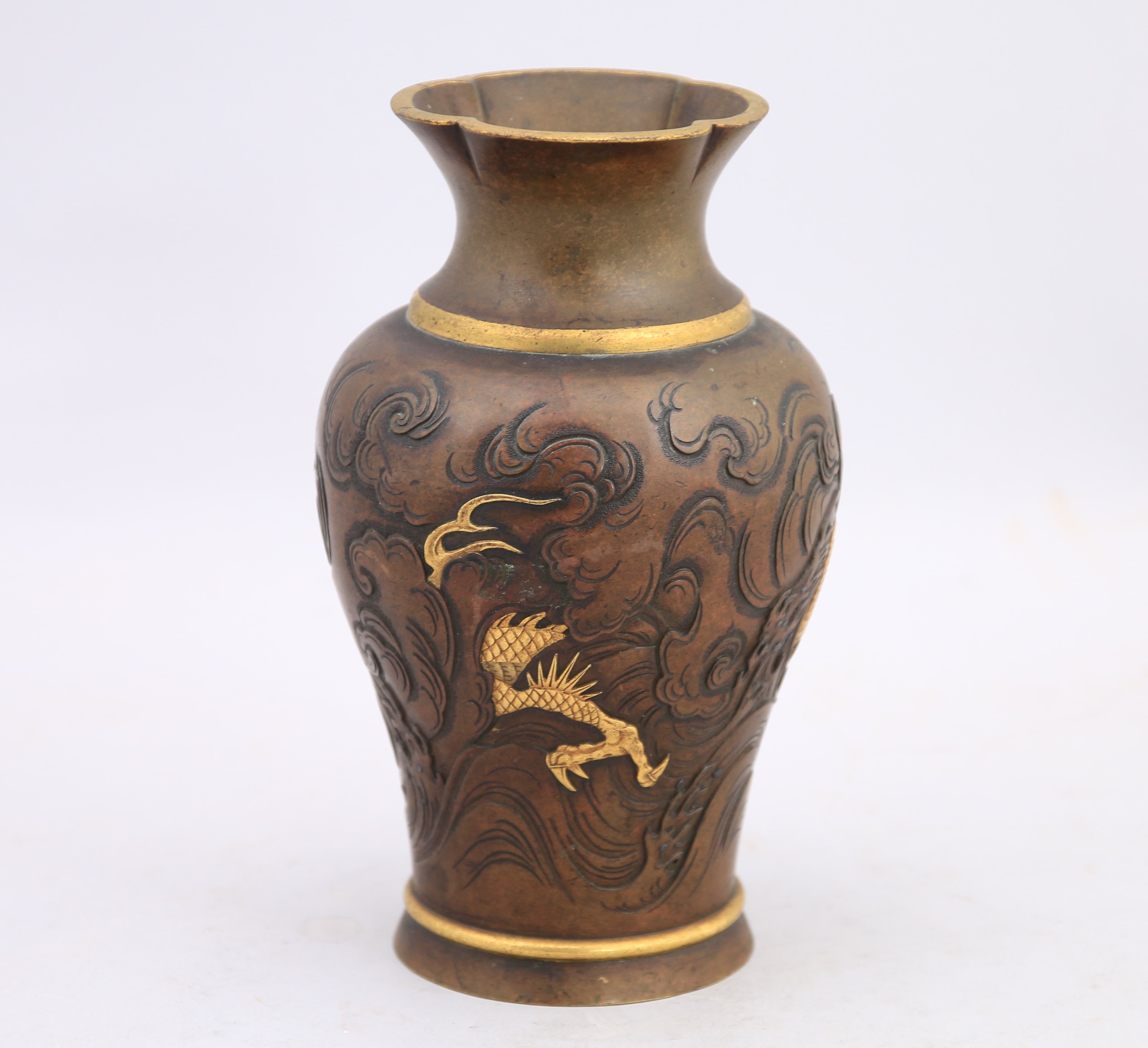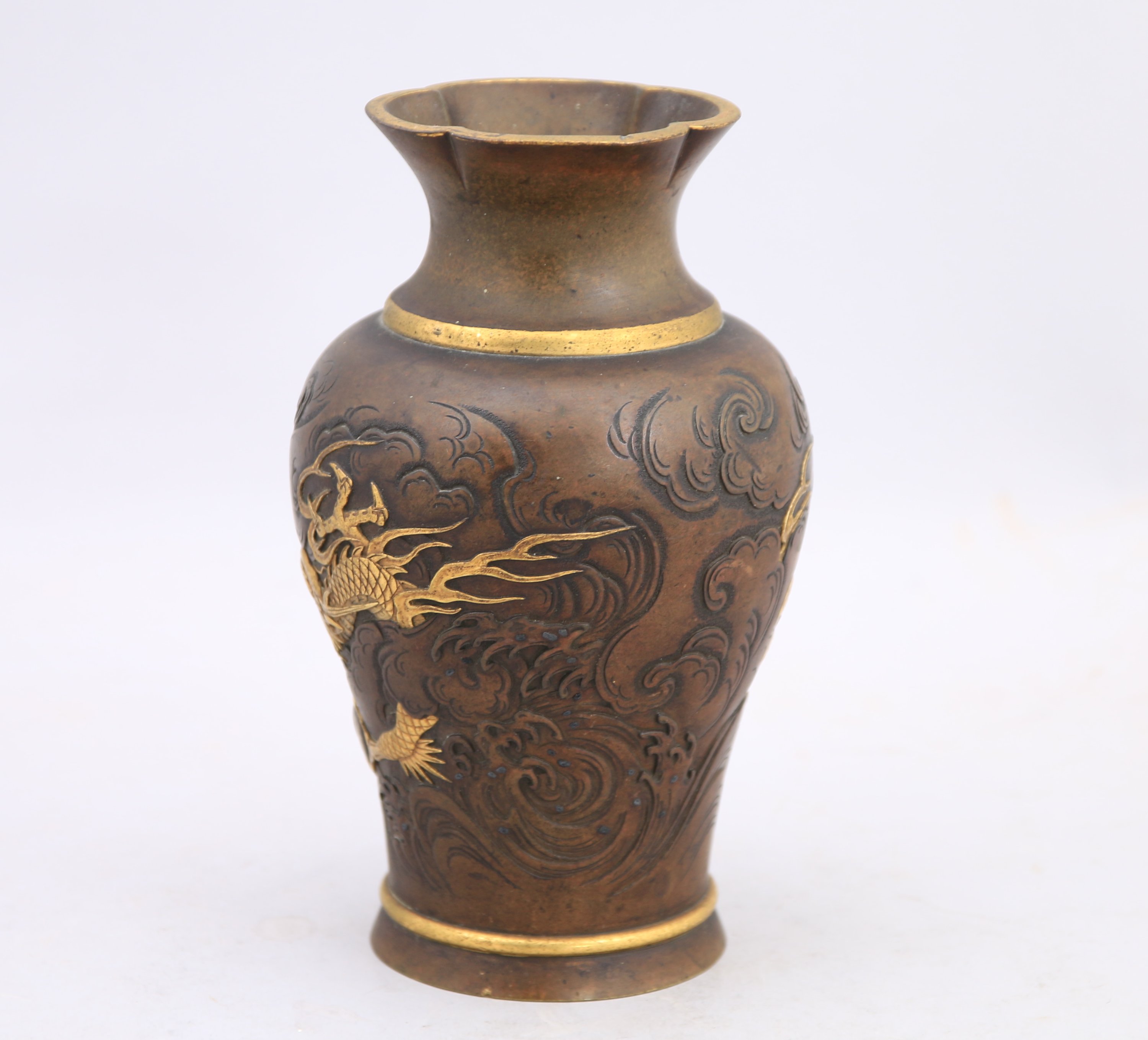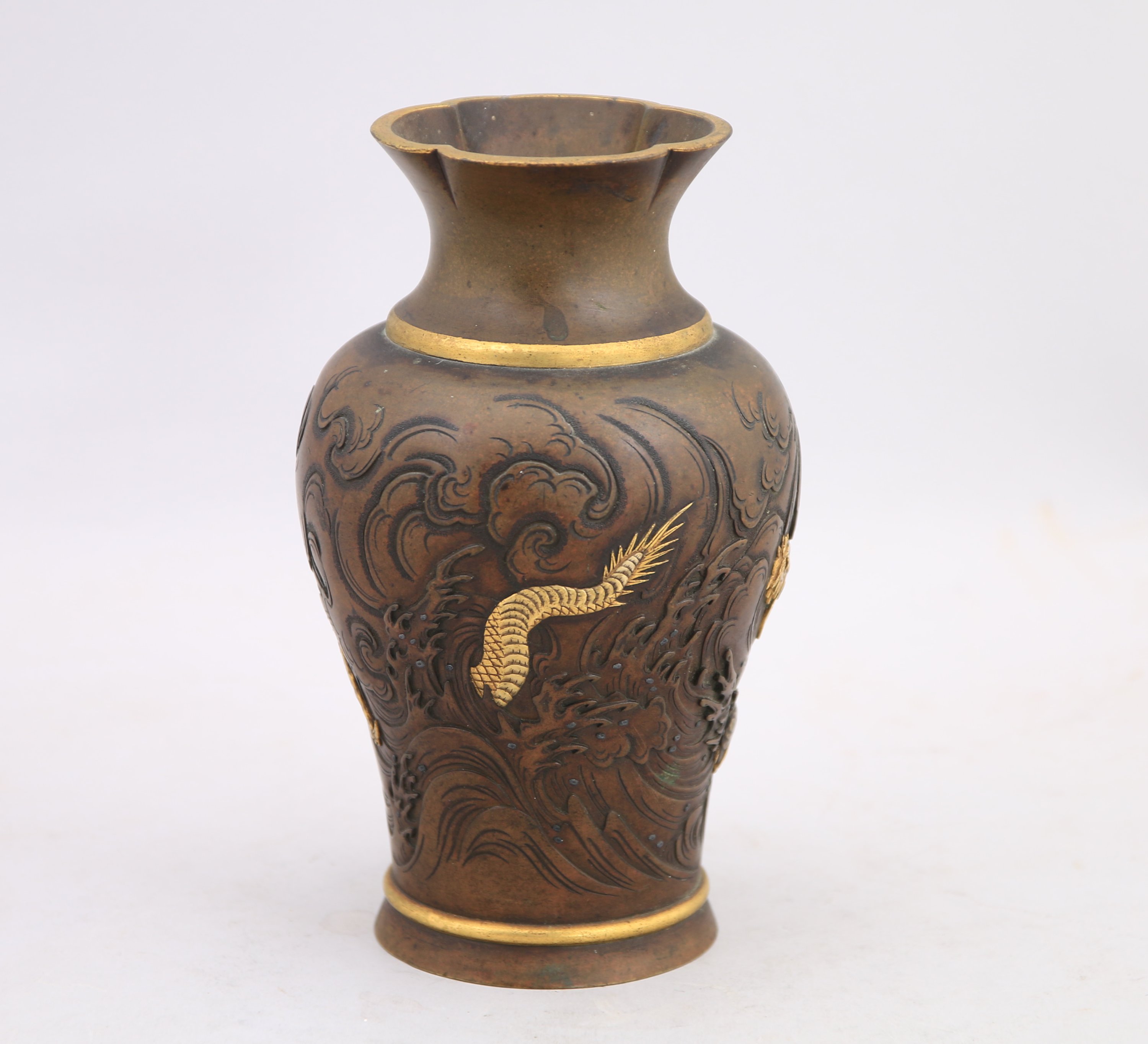 Petit VASE en bronze à patine brune, le col polylobé, à décor ciselé et en léger relief d'un dragon attrapant la perle dans les vagues déchainées.