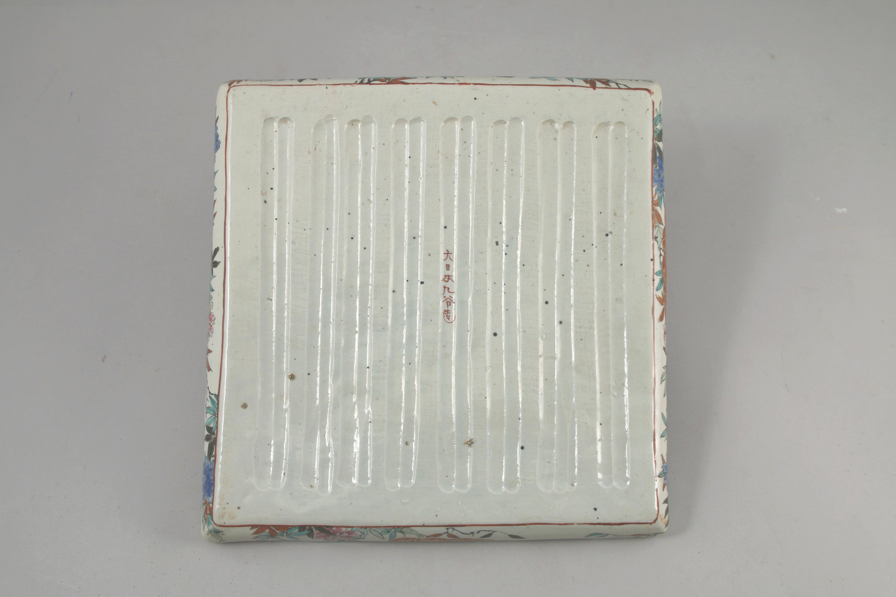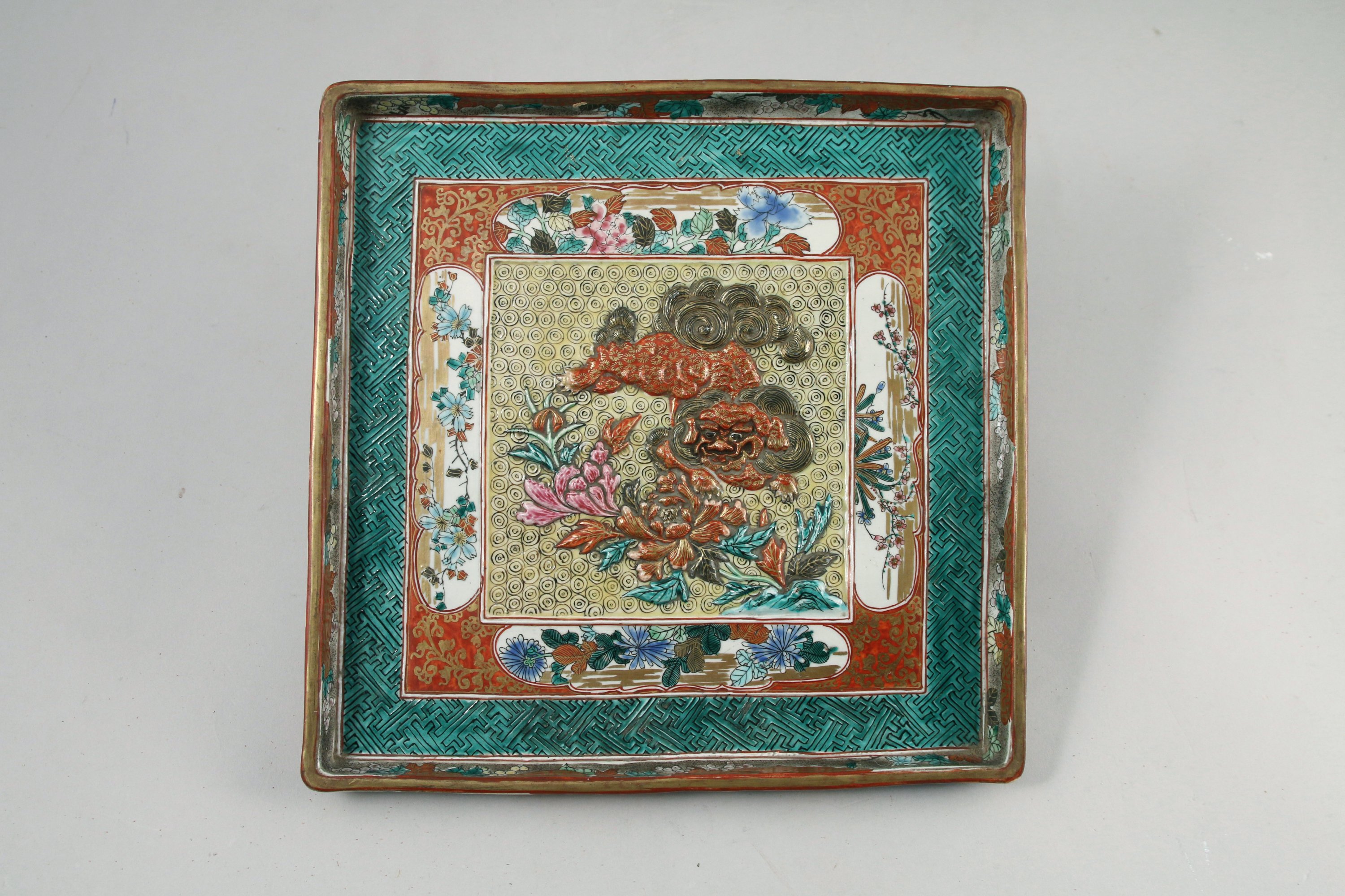PLATEAU carré à décor en relief d'un chien de fô et d'un lotus.