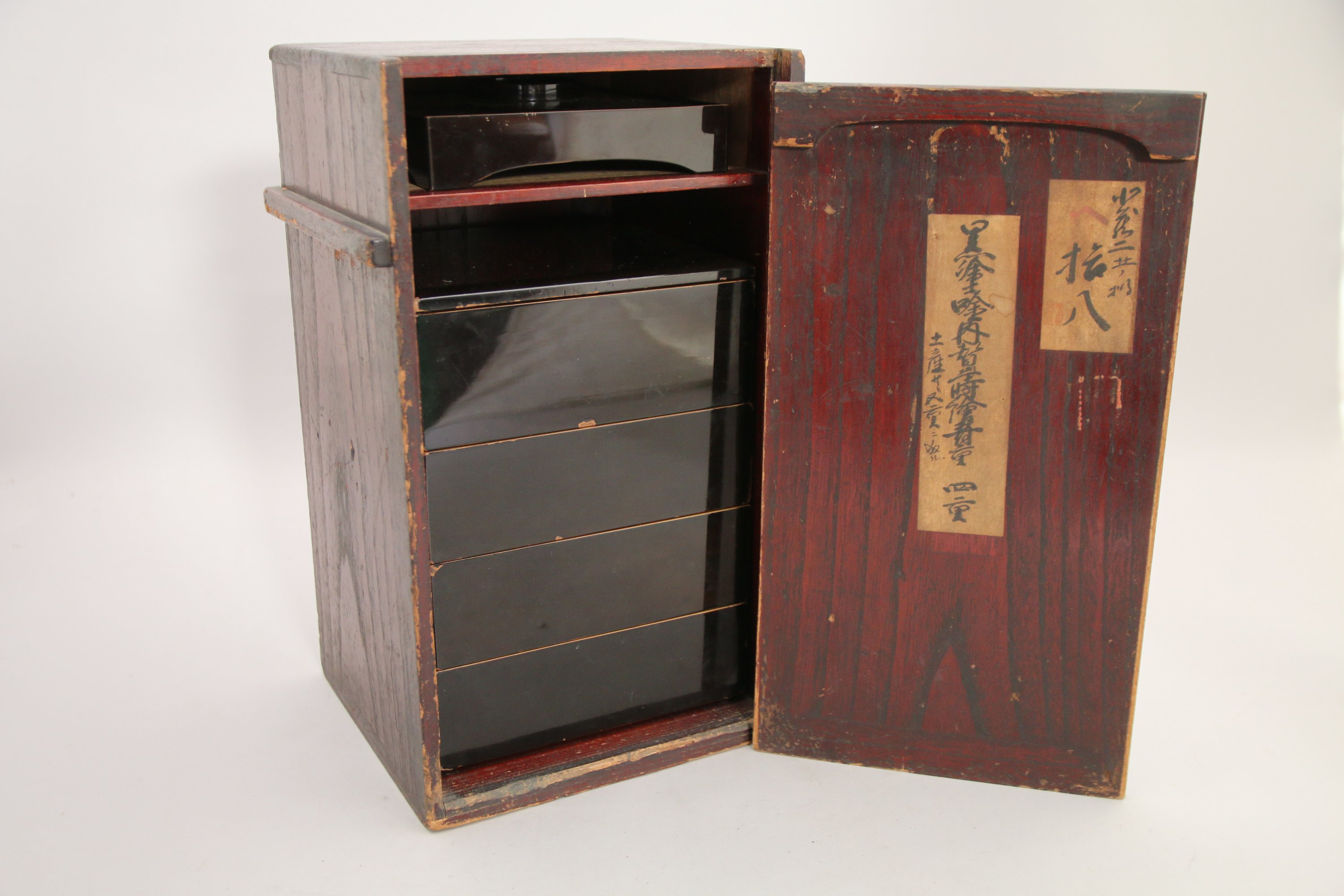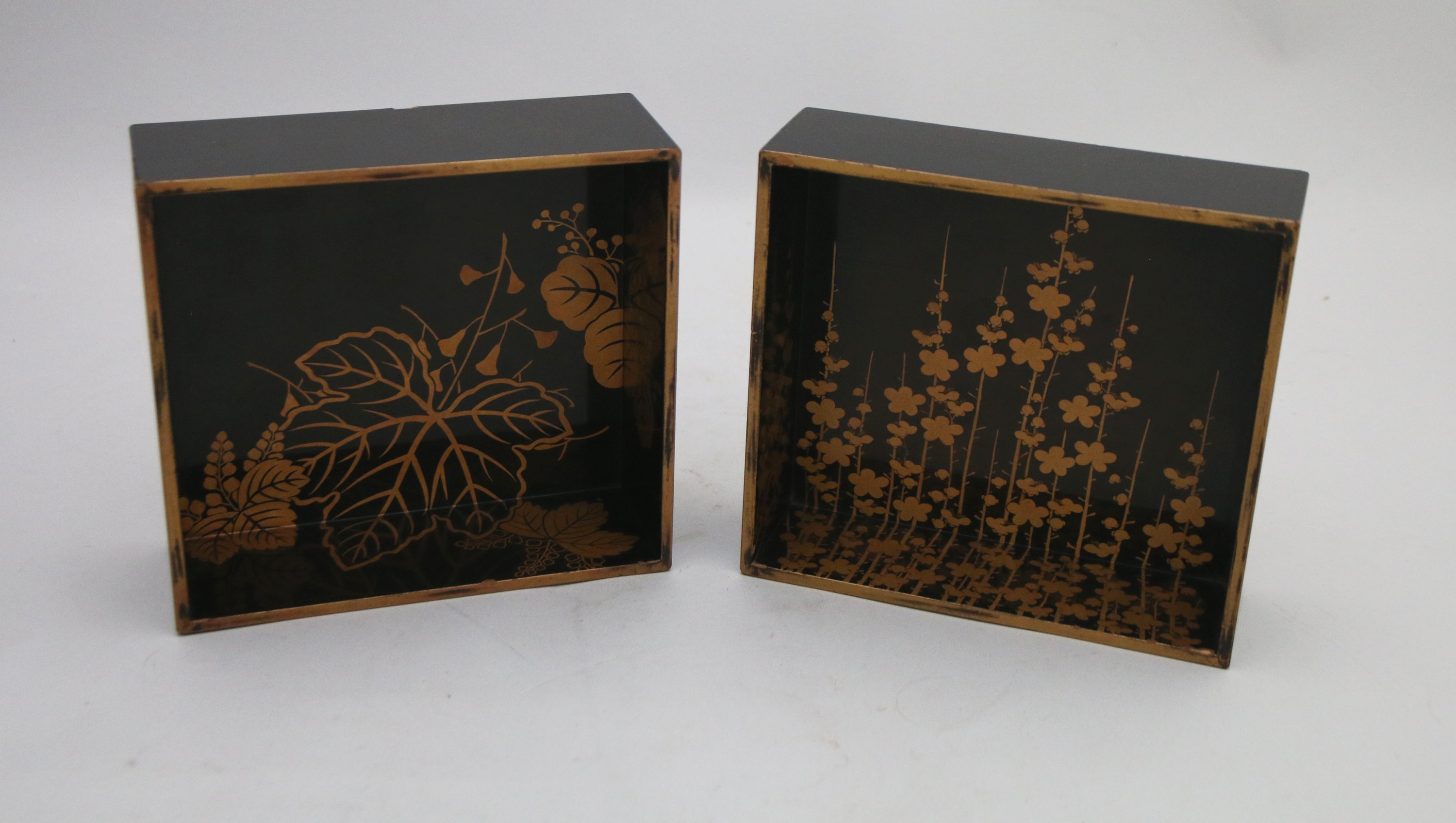 BOÎTE à quatre compartiments en laque noire décorée en hira maki-e de laque or à l'intérieur de pins, vagues, pruniers, paulownia.
