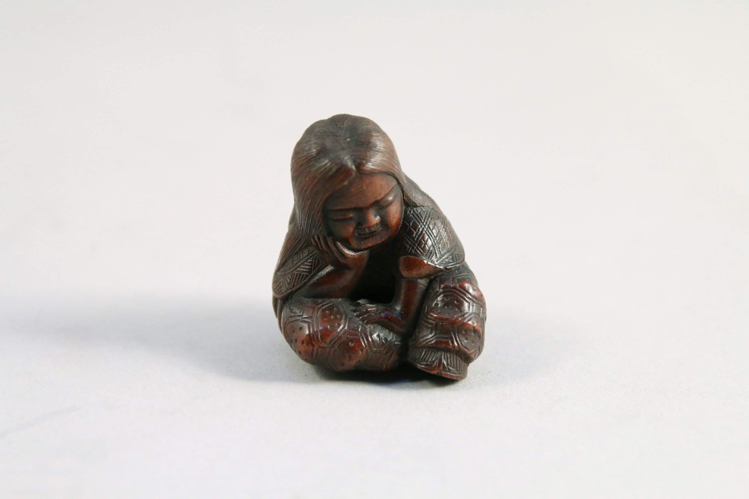NETSUKE en buis figurant Shojo assoupi, la tête reposant sur sa main droite.