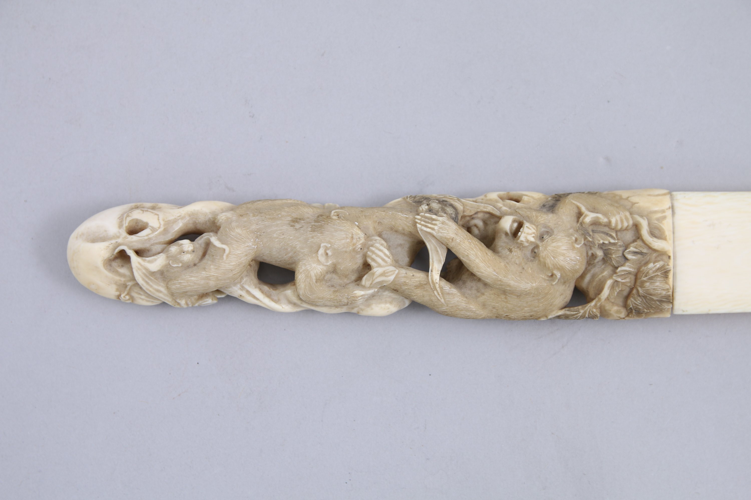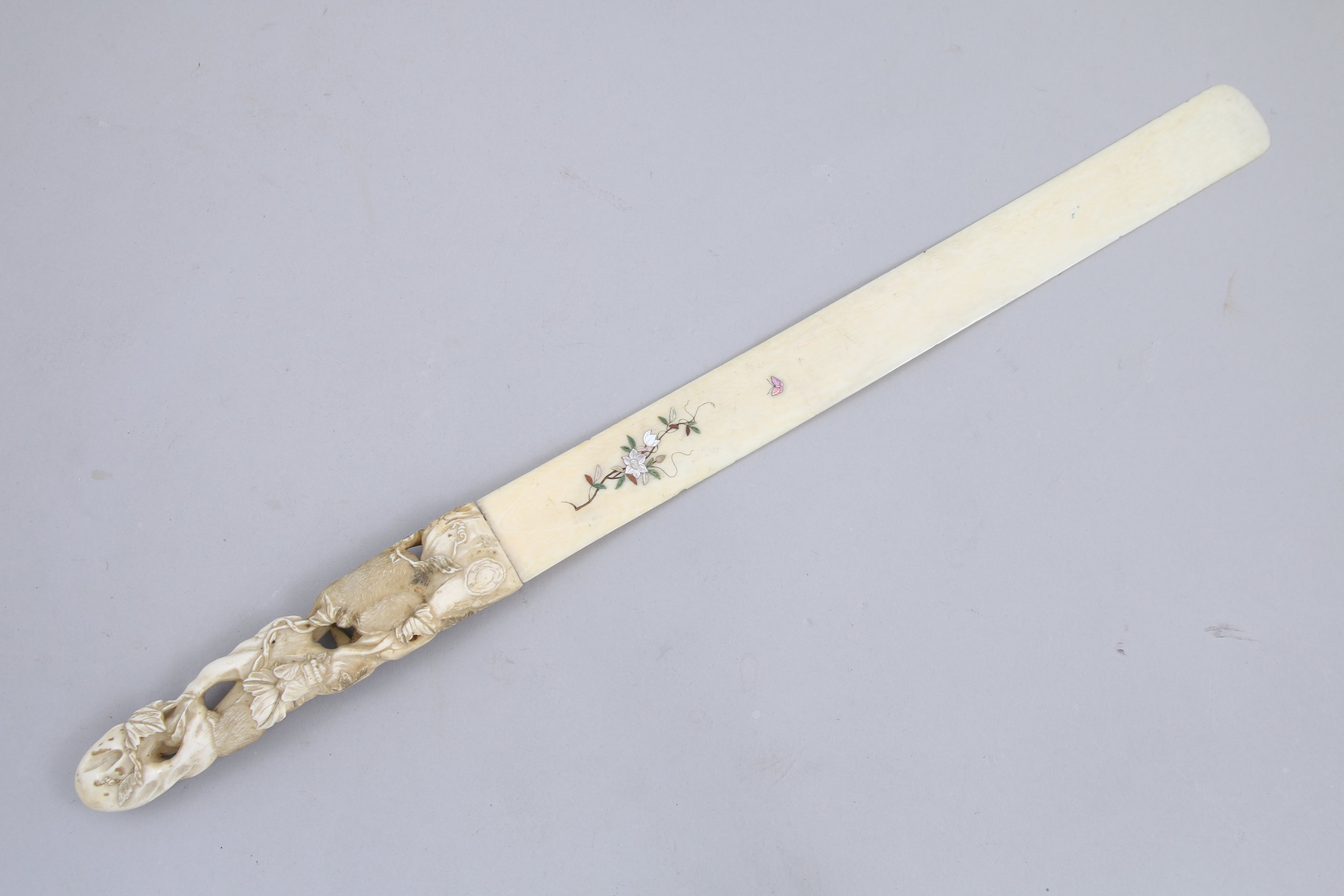 COUPE-PAPIER en ivoire, le manche à décor de singes se battant autour de chauves-souris dans un tronc d'arbre où se trouve des abeilles. La lame à décor incrusté en shibayama de nacre et corail de branches de chrysanthèmes survolés par un oiseau et papillon.