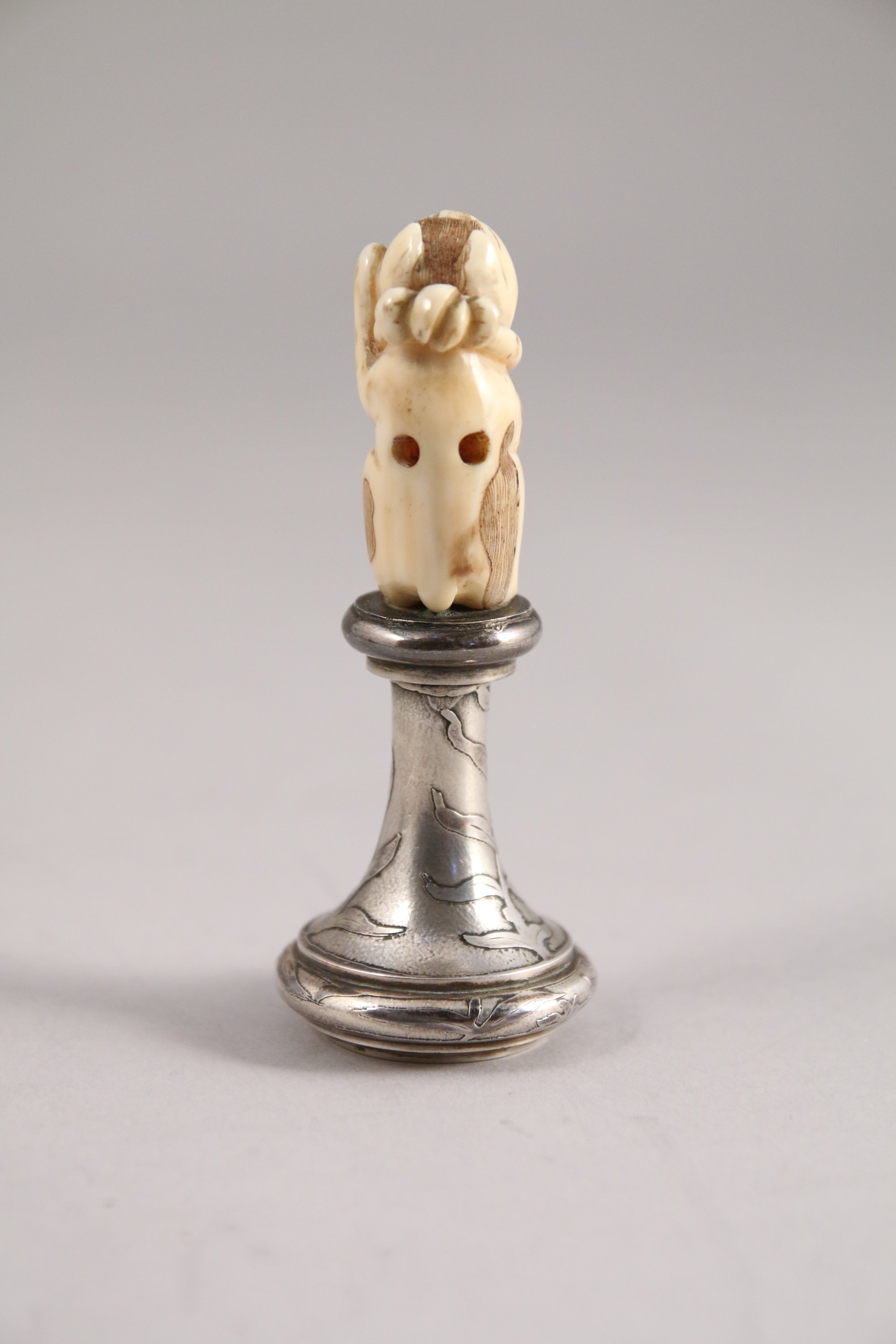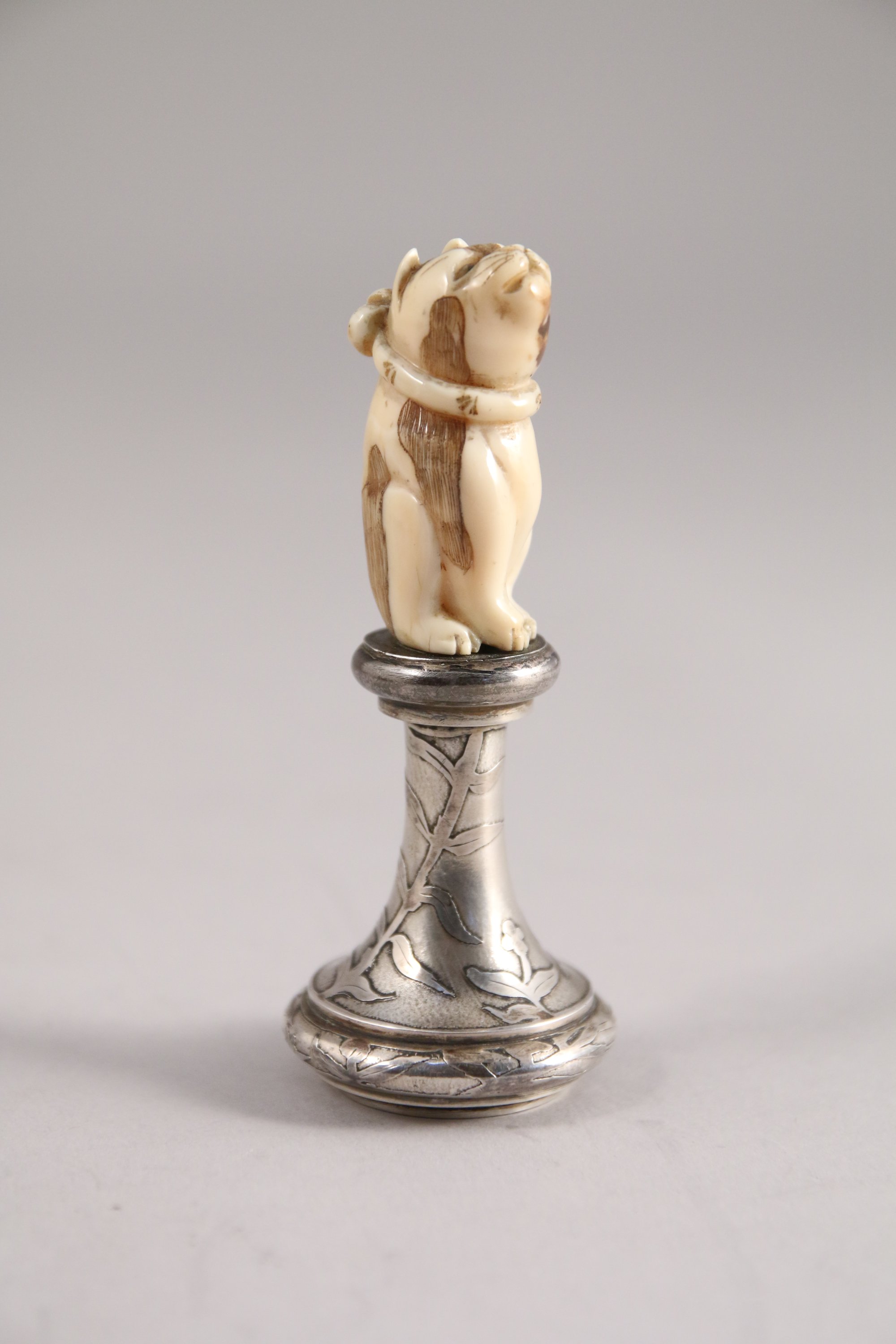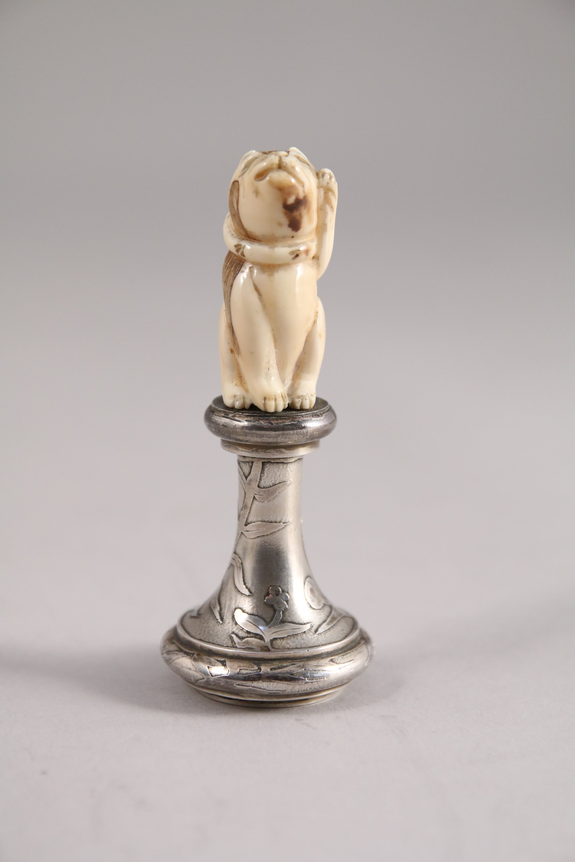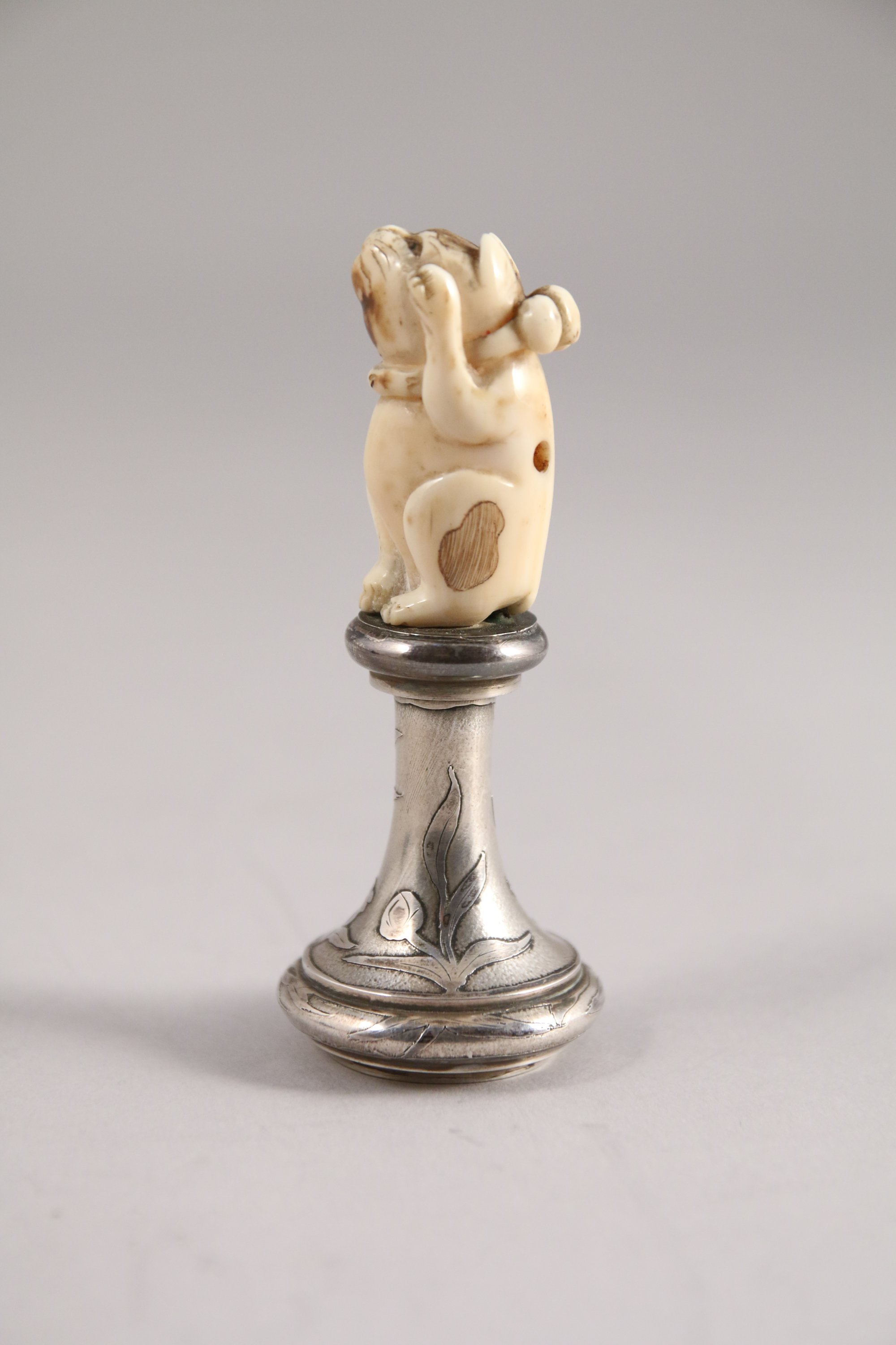 Petit OKIMONO en ivoire dans le style des netsuke, chat levant la patte monté sur un sceau à cacheter.