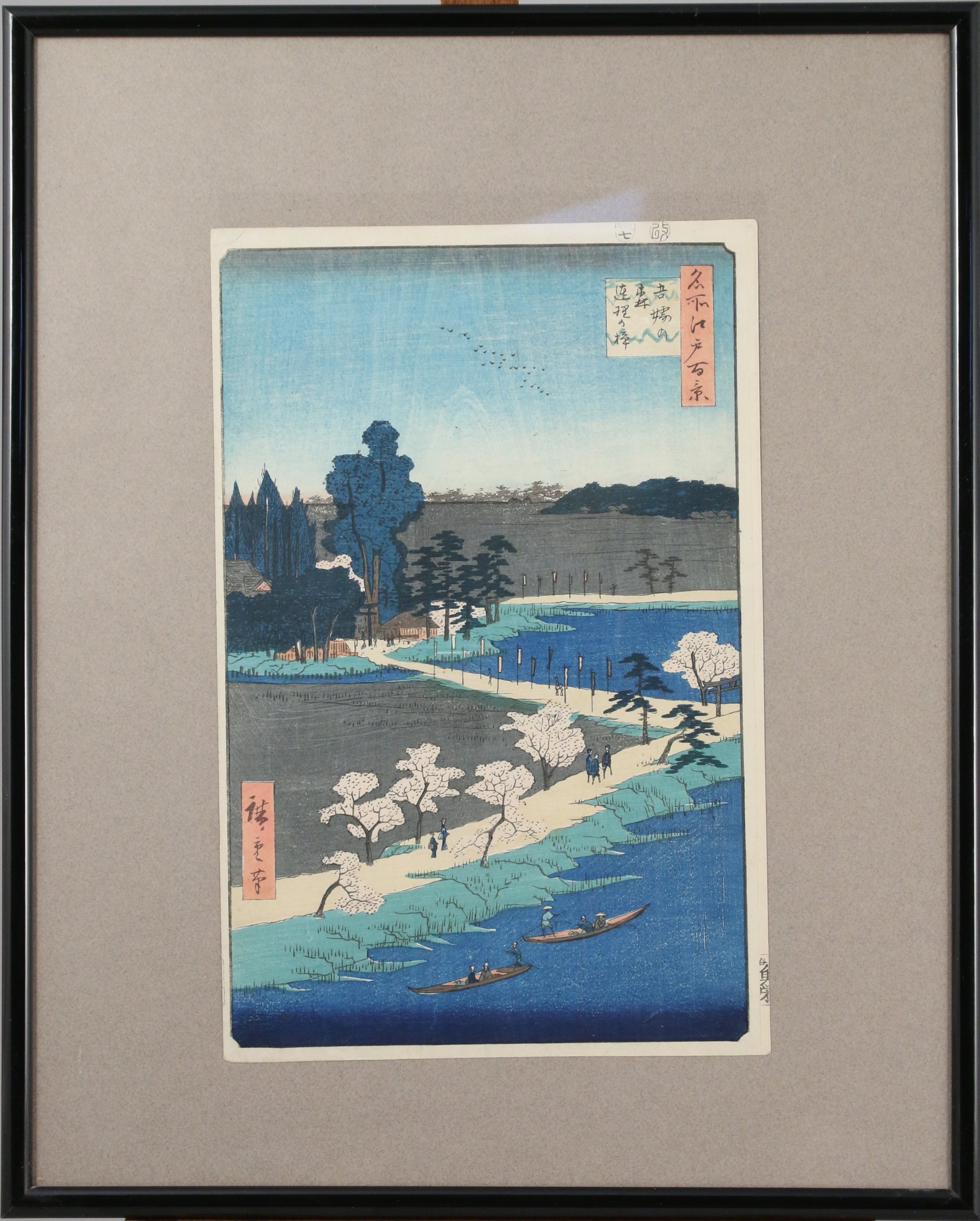 Deux OBAN-TATE-E de la série Meisho Edo hyakkei, les Cent vues d'Edo, le temple d'Azuma et le canal de Yotsugi-dori.