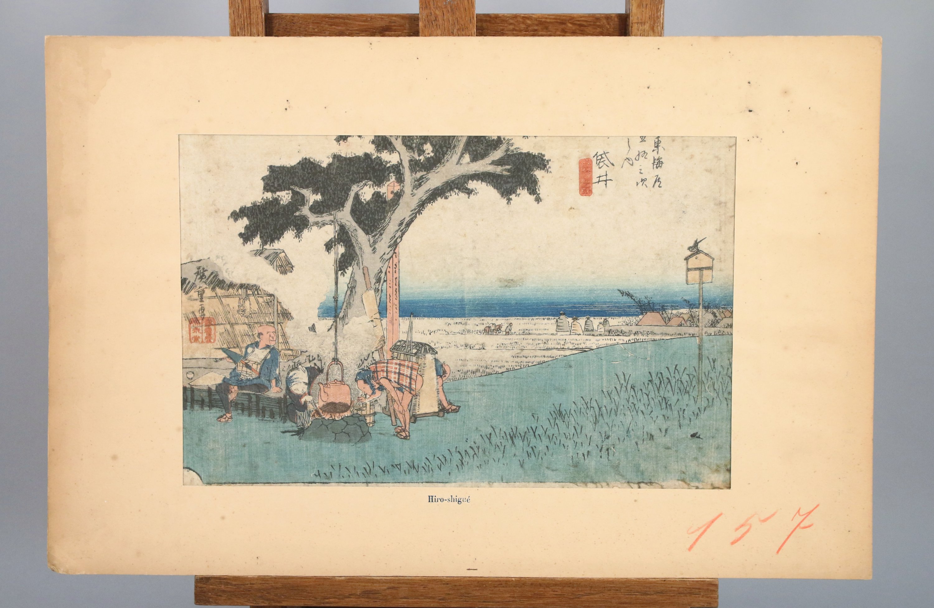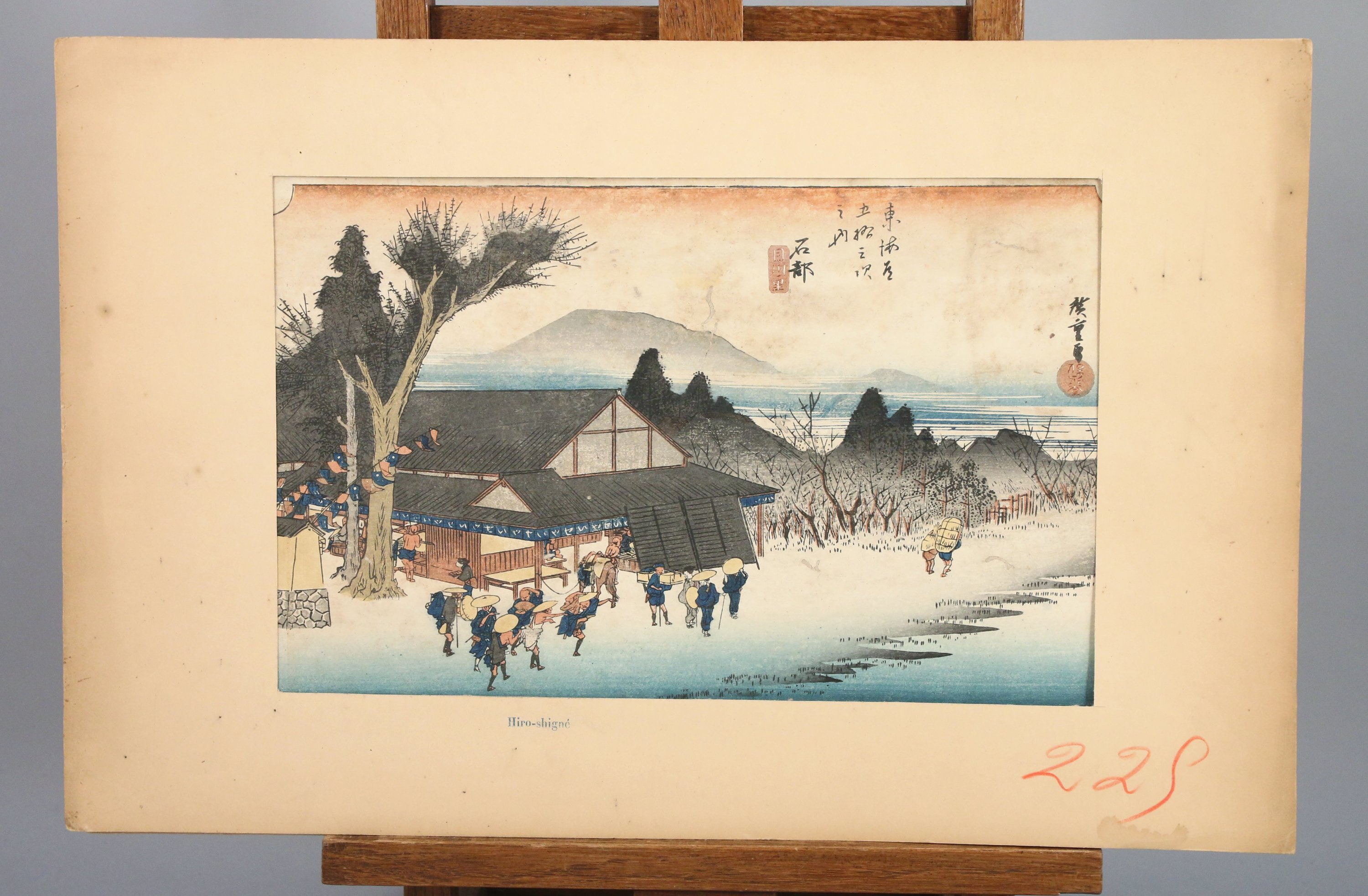 Cinq OBAN YOKO-E de la série Tokaido gojusan tsugi no uchi , Les cinquante-trois stations du Tokaido, stations Fujisawa, Ishibe, Kusatsu, Fukuroi, et un oban tate-e de la série Shinsen Edo Meisho, Nouvelles vues d'Edo, cerisiers en fleurs au temple Toeizan de Ueno. Tirages tardifs.