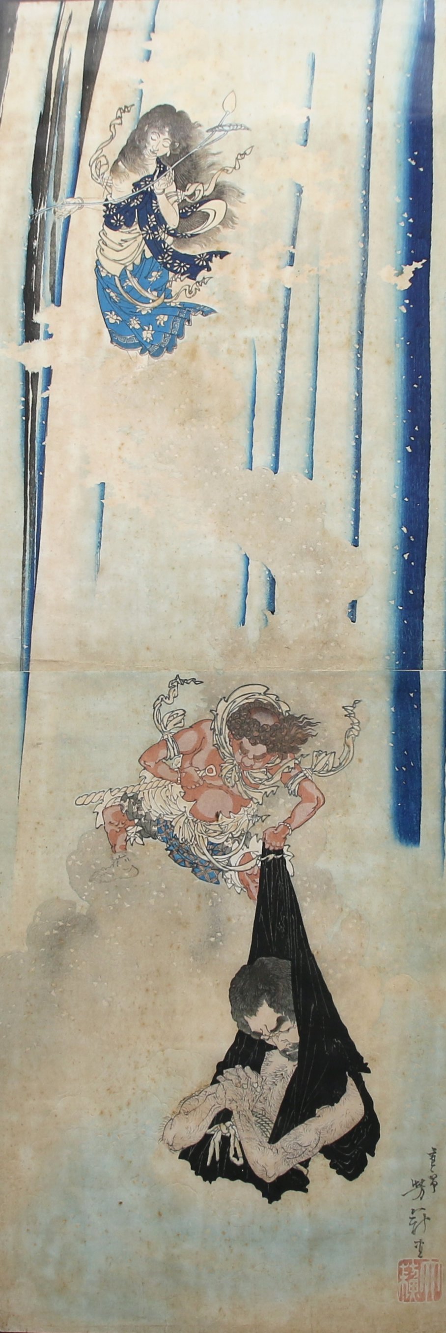 Double OBAN TATE-E, la pénitence de Mongaku, se tenant sous une cascade, Kannon au-dessus de lui. Signé Yoshitoshi suivi du sceau de l'artiste.