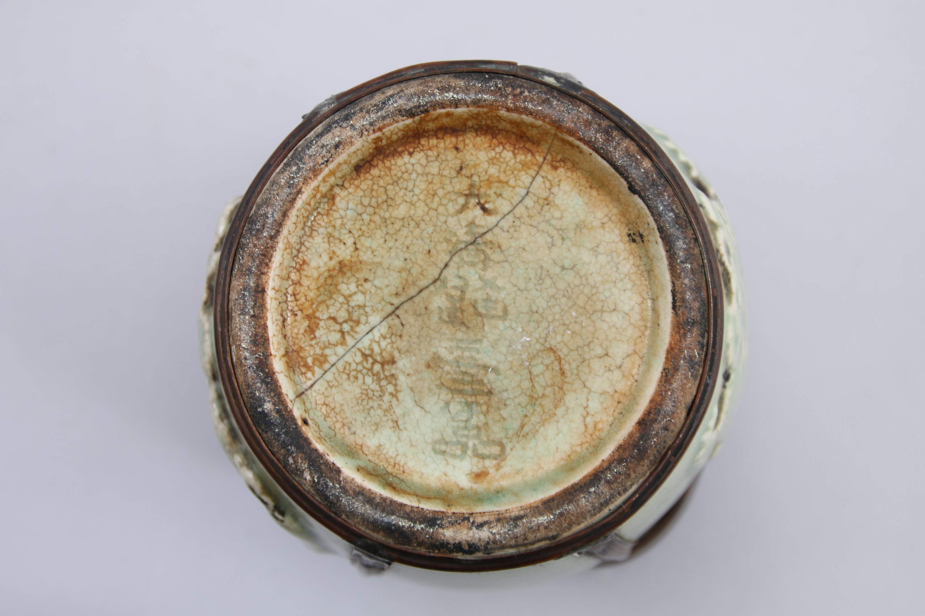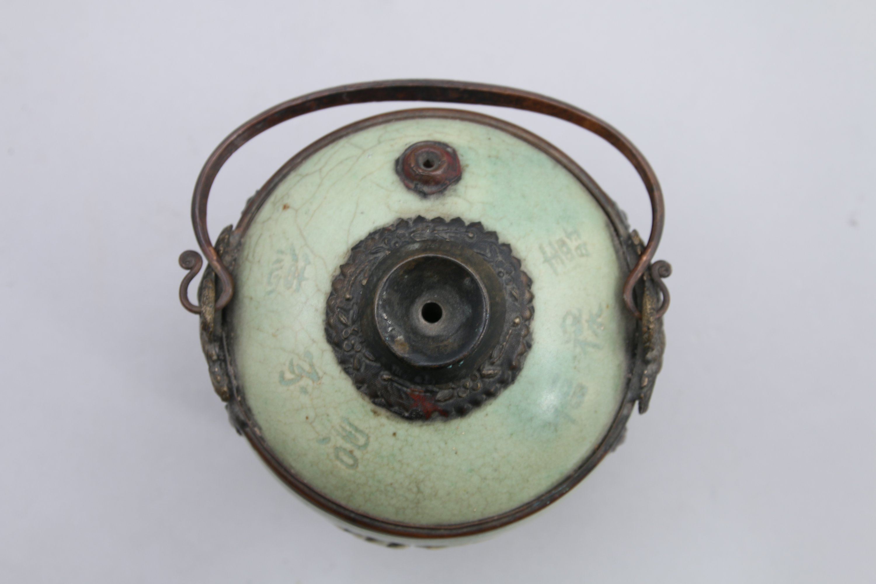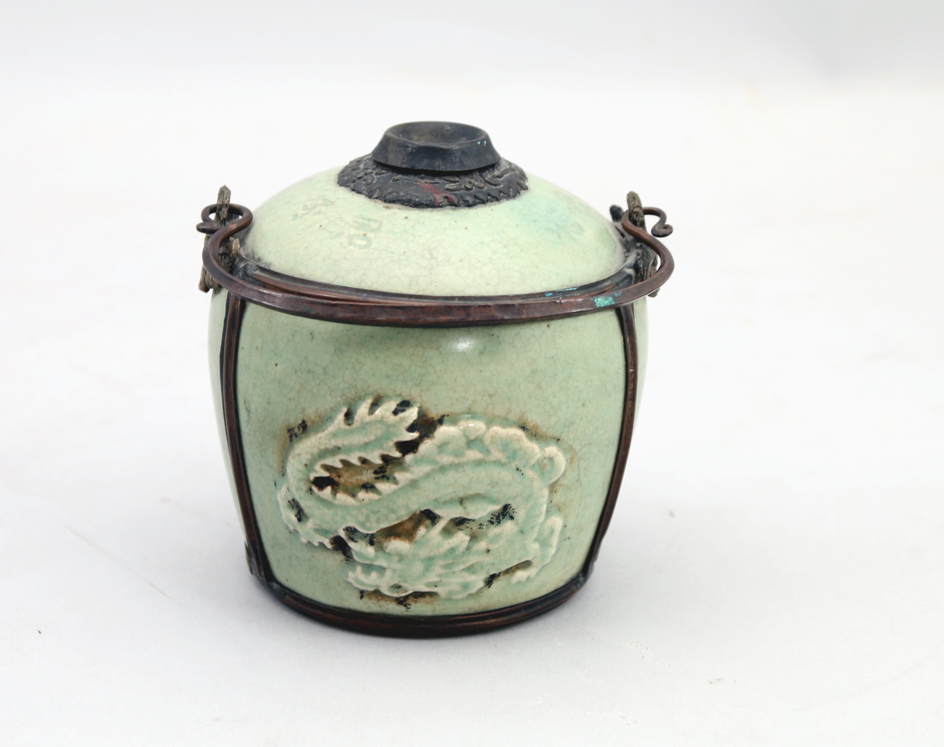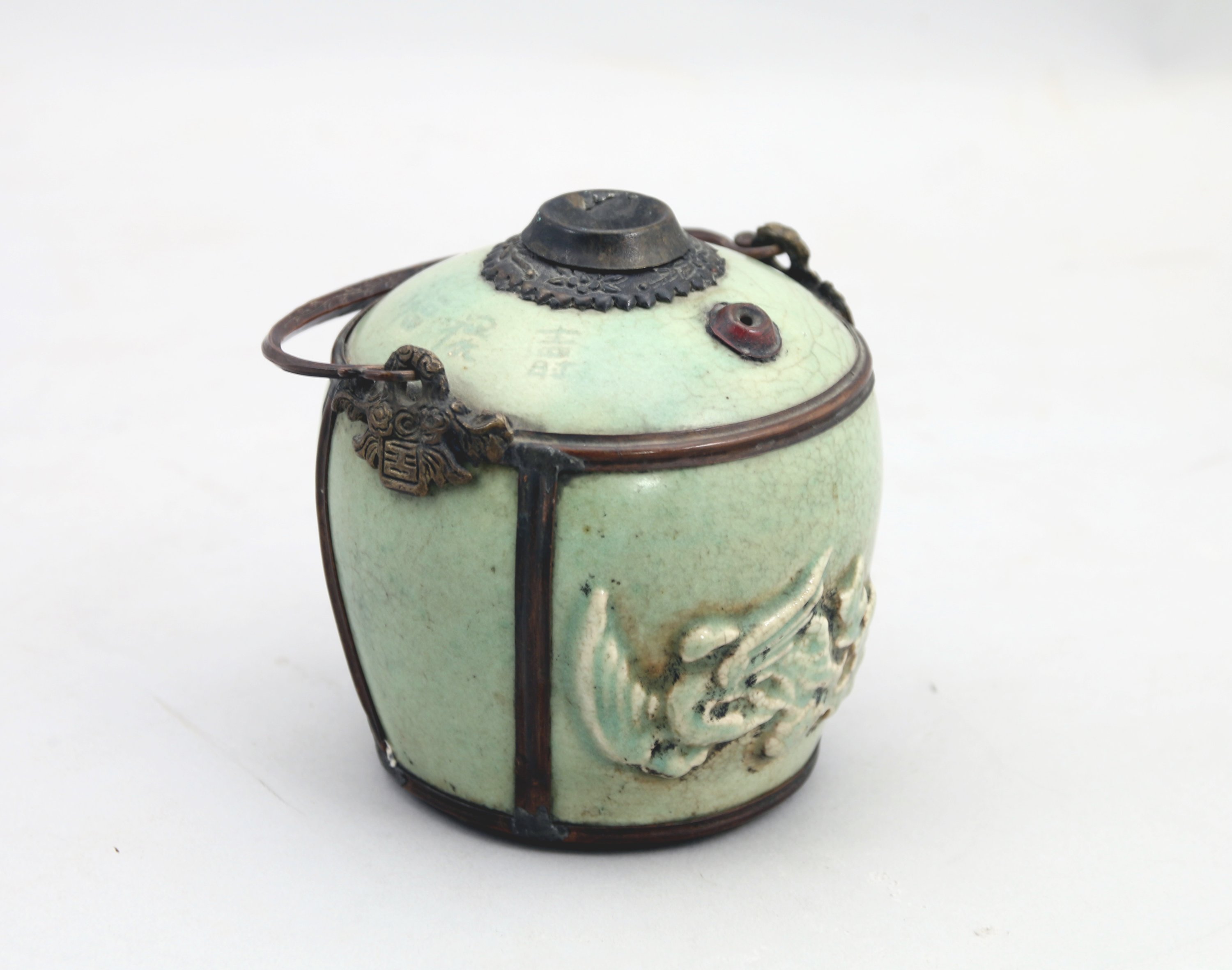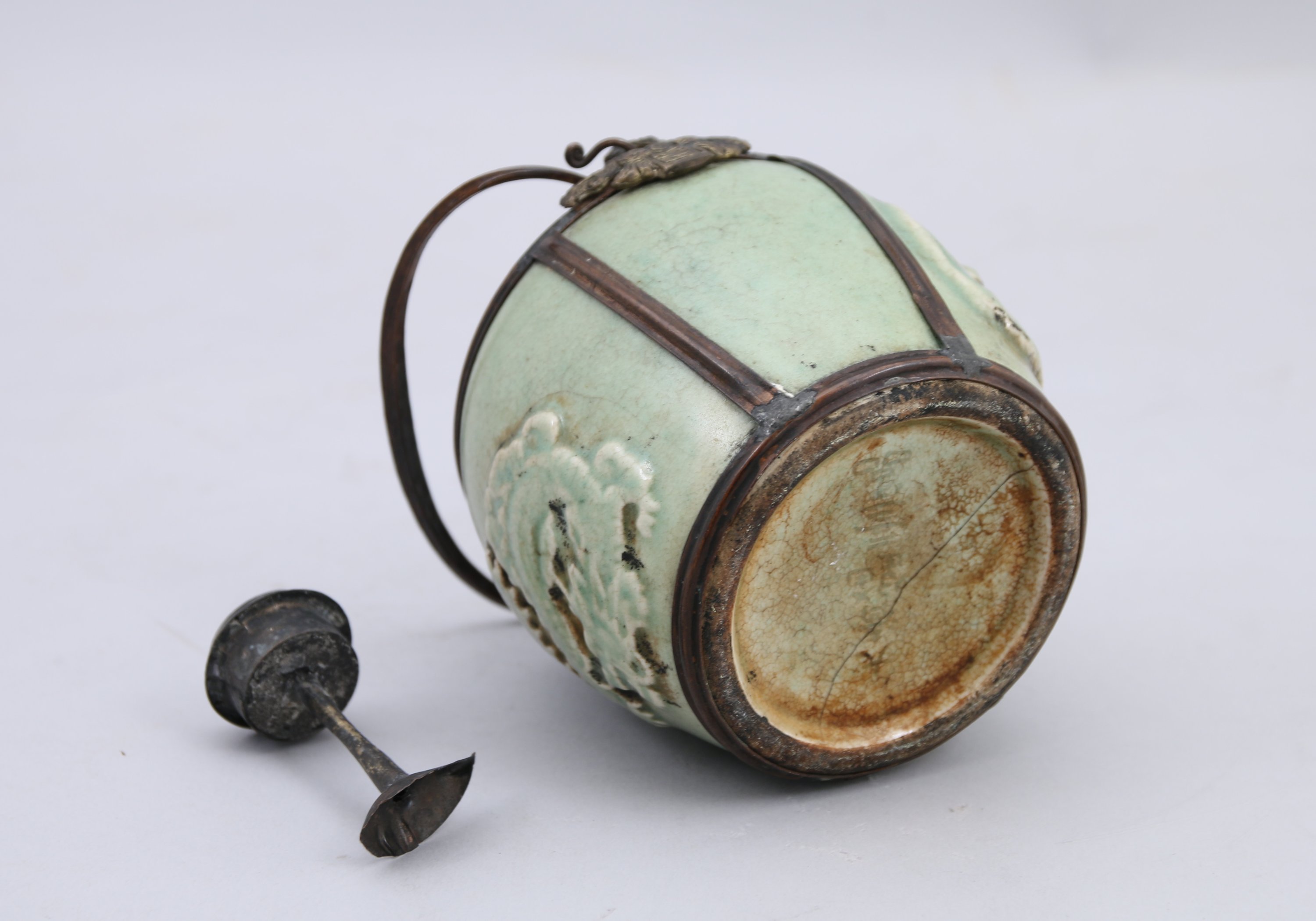 PIPE à EAU en grès émaillé céladon à décor appliqué en relief de dragon et phénix, monture en métal.