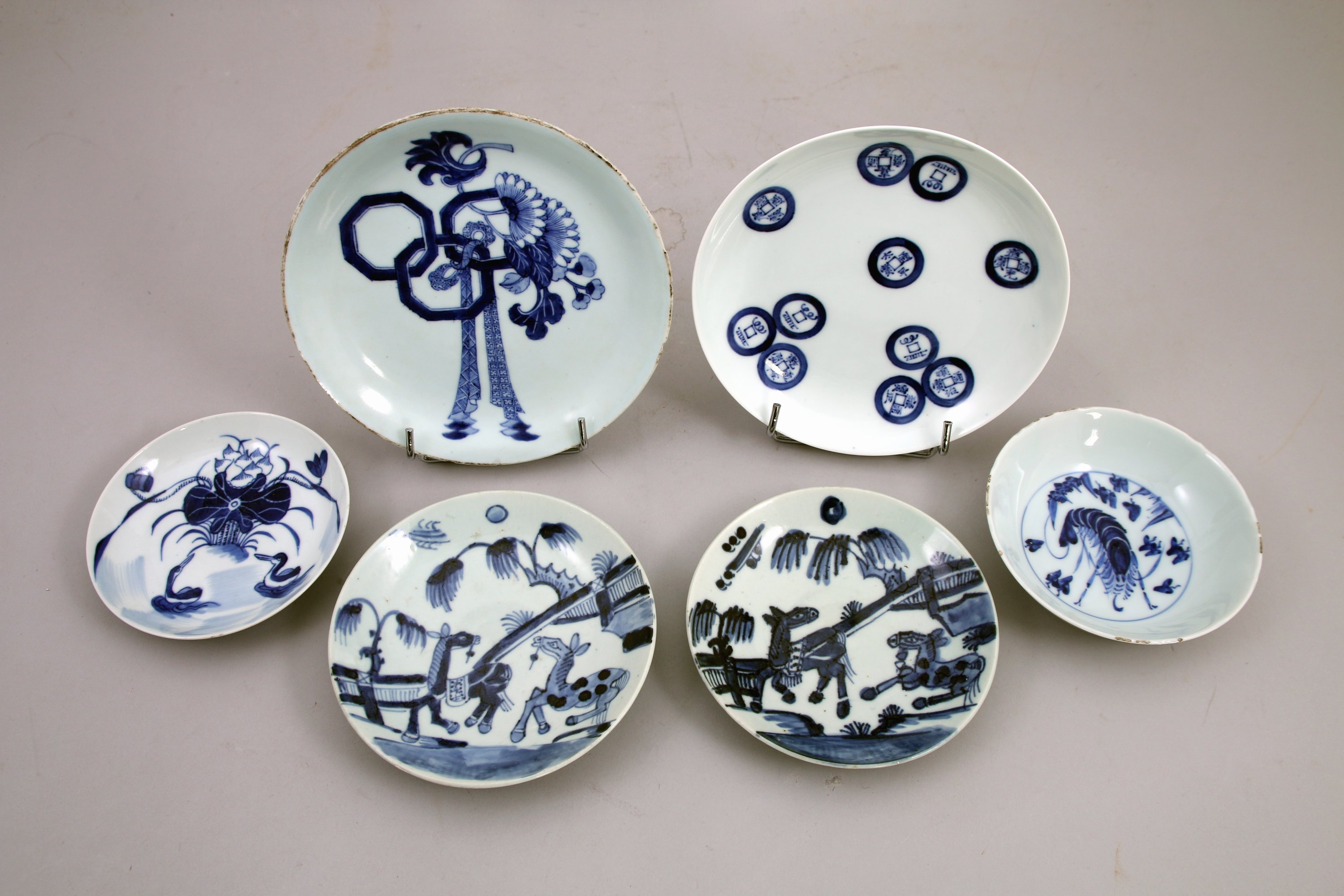 TROIS ASSIETTES et TROIS SOUCOUPES en porcelaine bleu blanc à décor de pièces de monnaie, chevaux, lotus et fleurs.