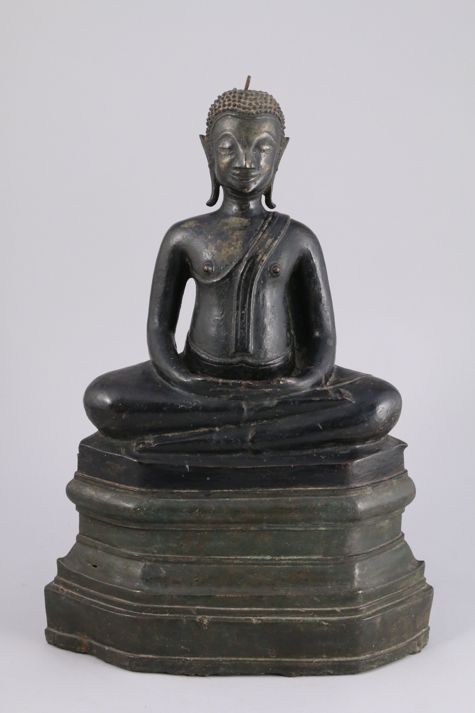 BOUDDHA en BRONZE à patine brune assis en padmasana sur son socle, les mains en bhumisparsa mudra (geste de la prise de la terre à témoin).