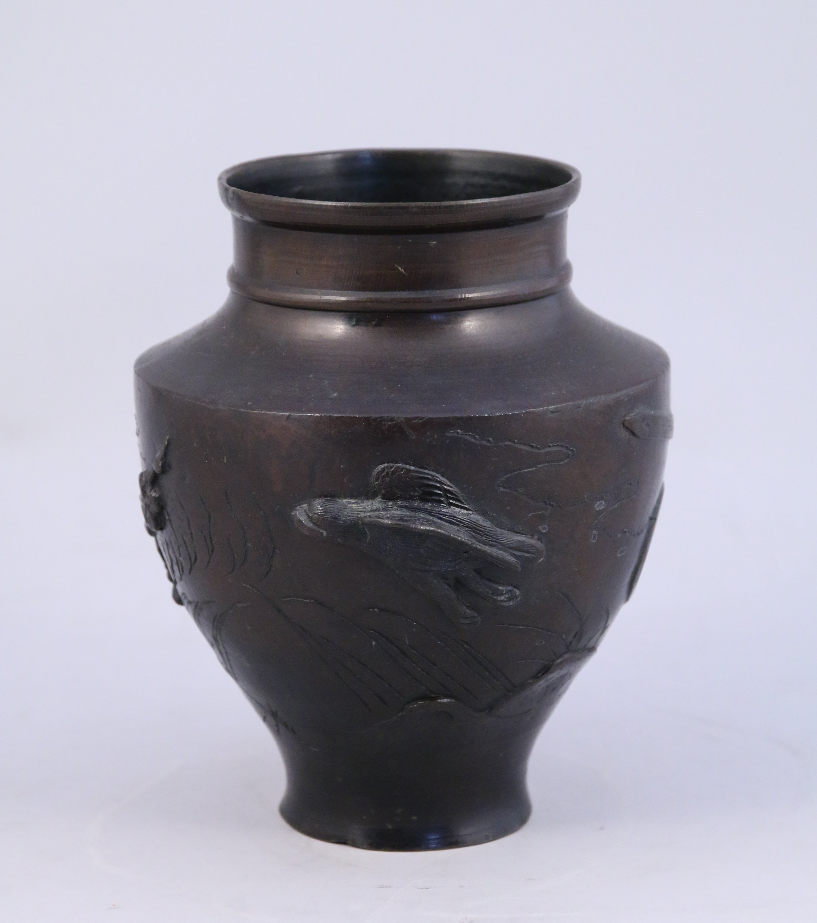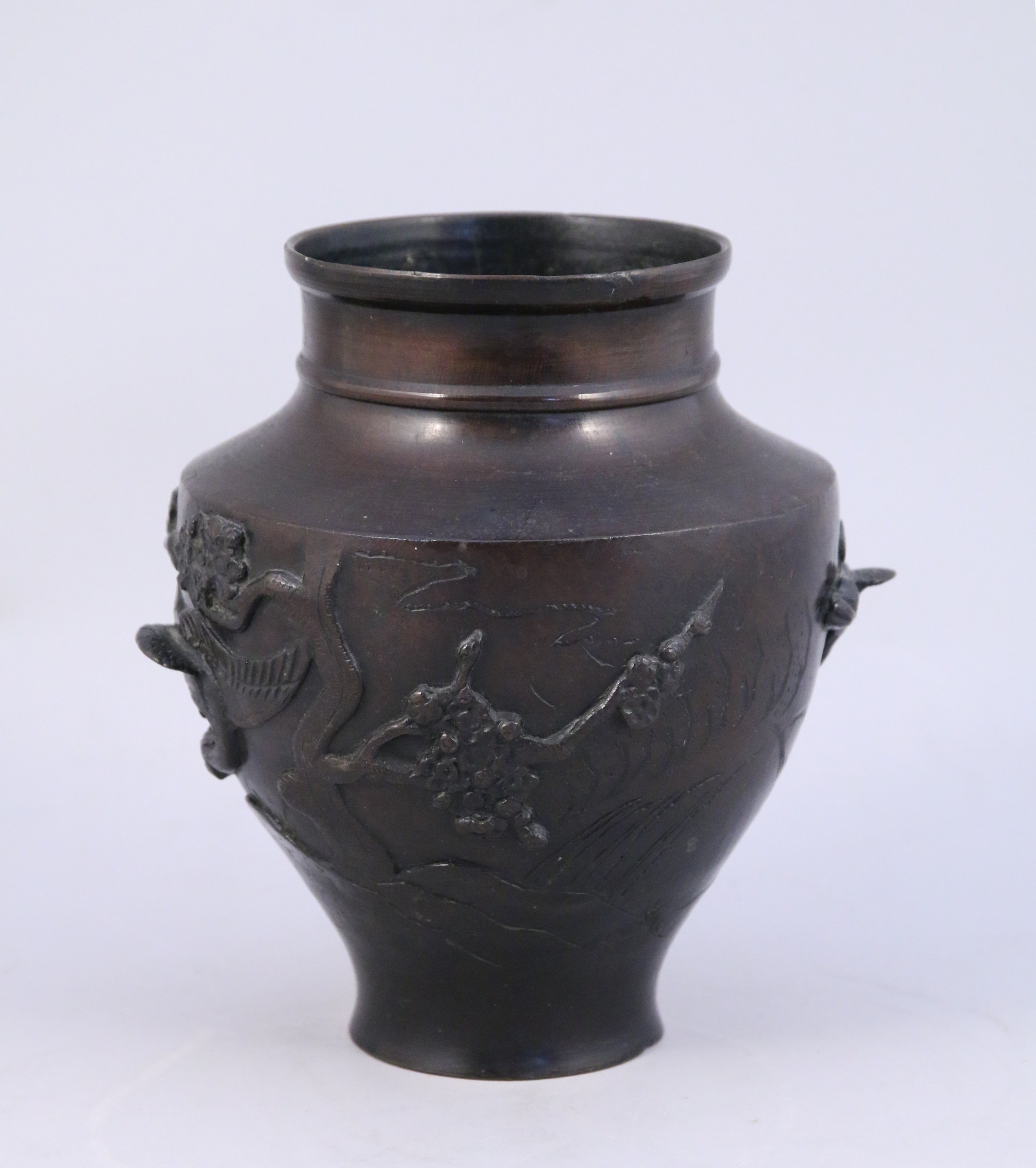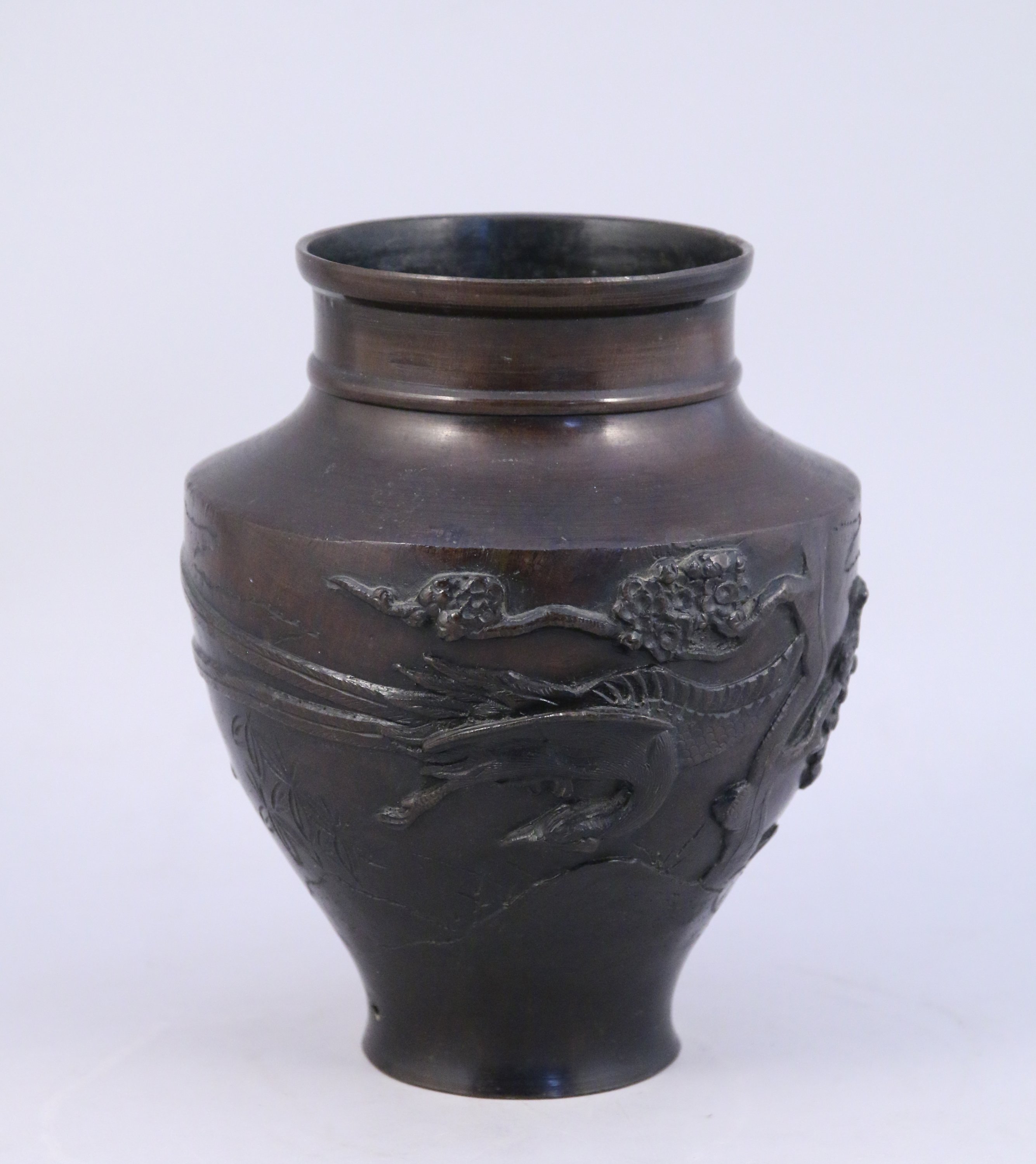 VASE balustre en bronze patiné à décor d'oiseaux dans un paysage. Cachet sous la base.