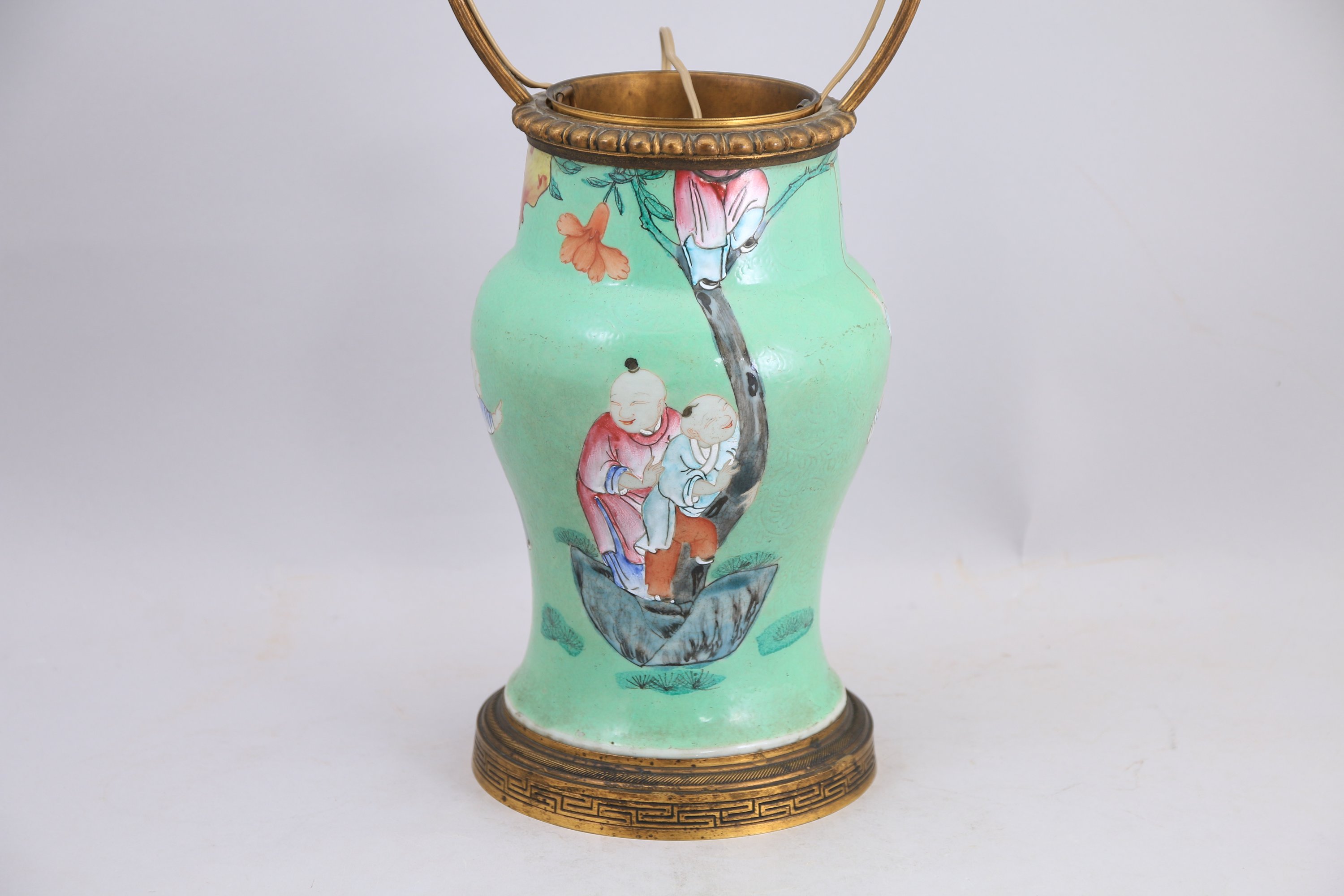 Vase en porcelaine à fond vert figurant des magots jouant deux par deux.