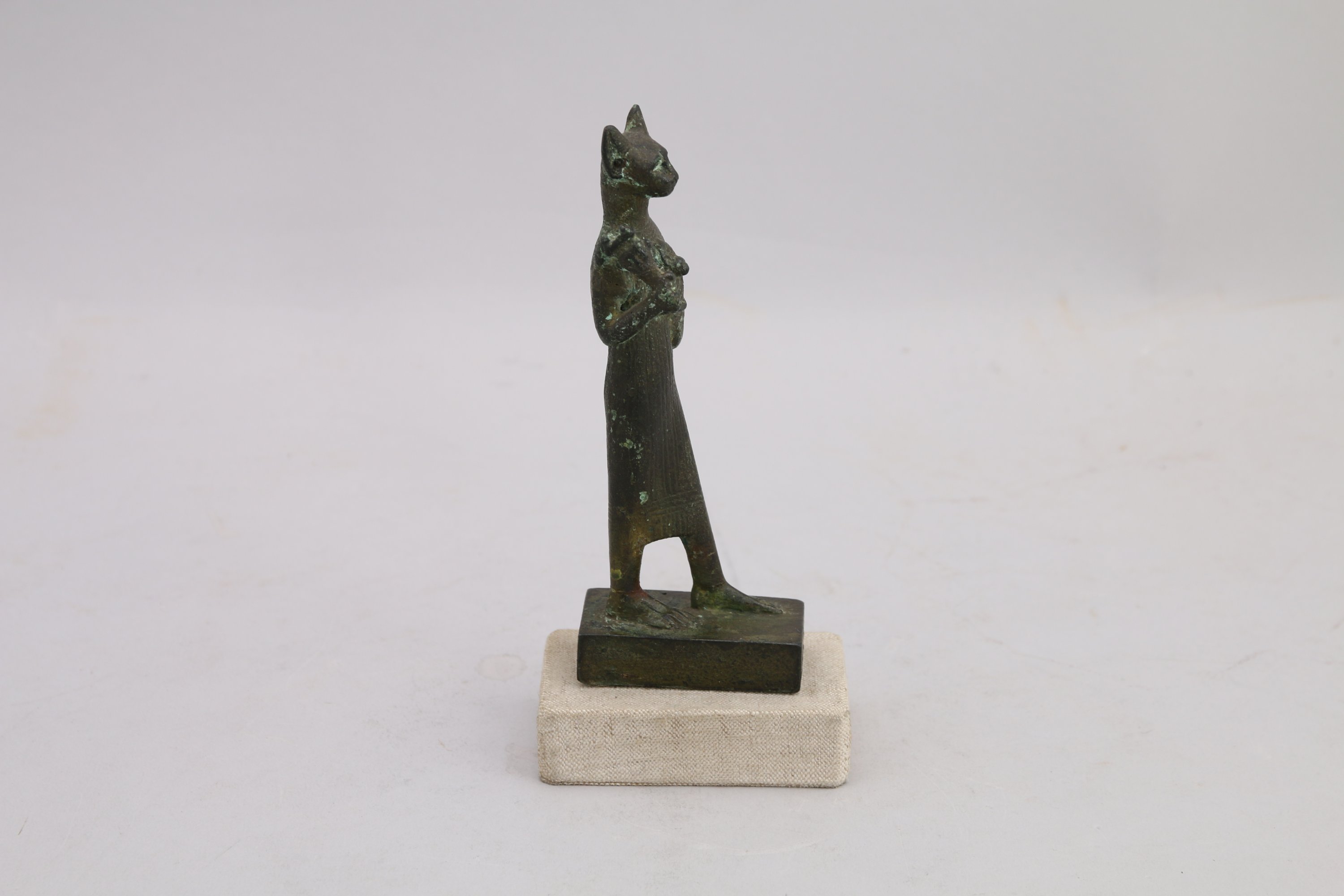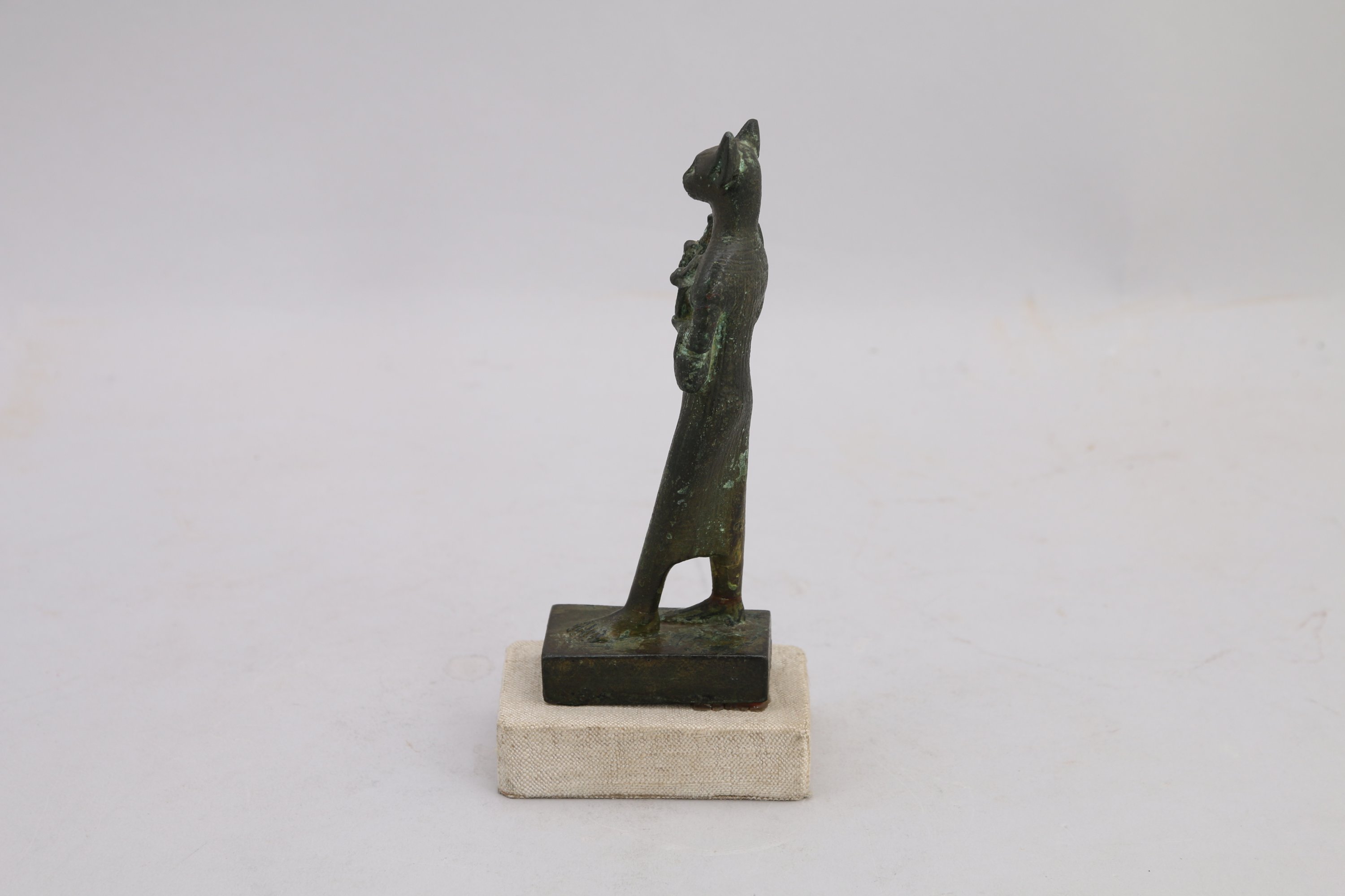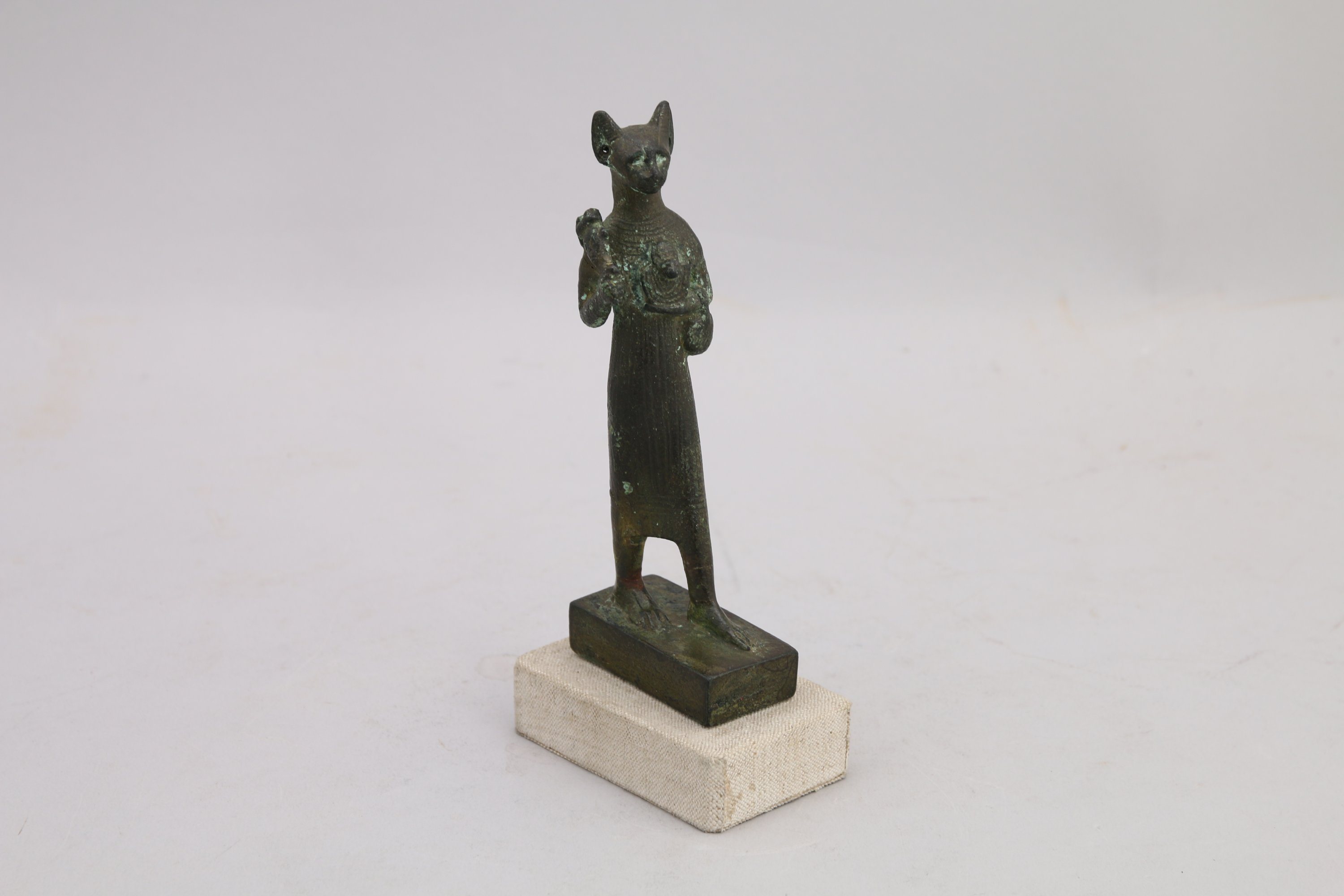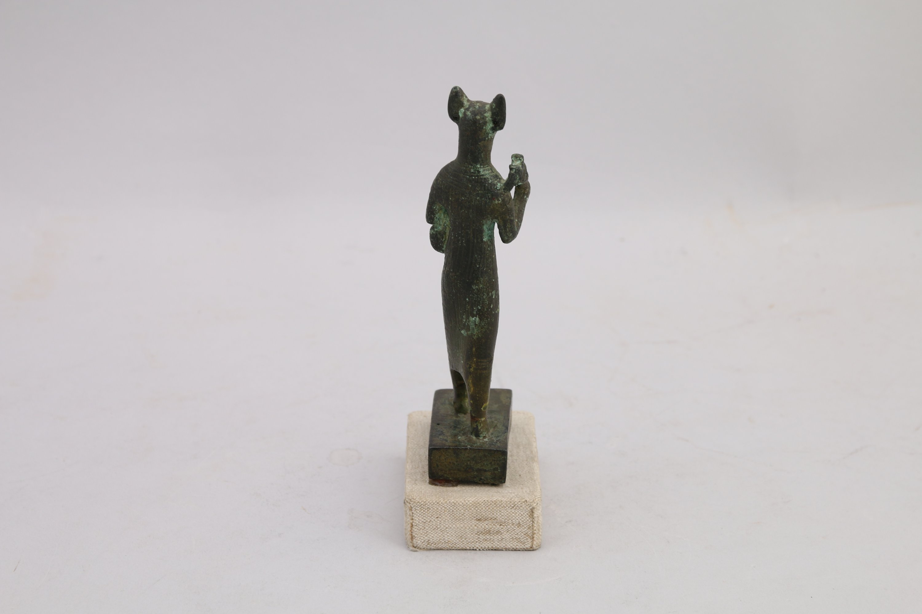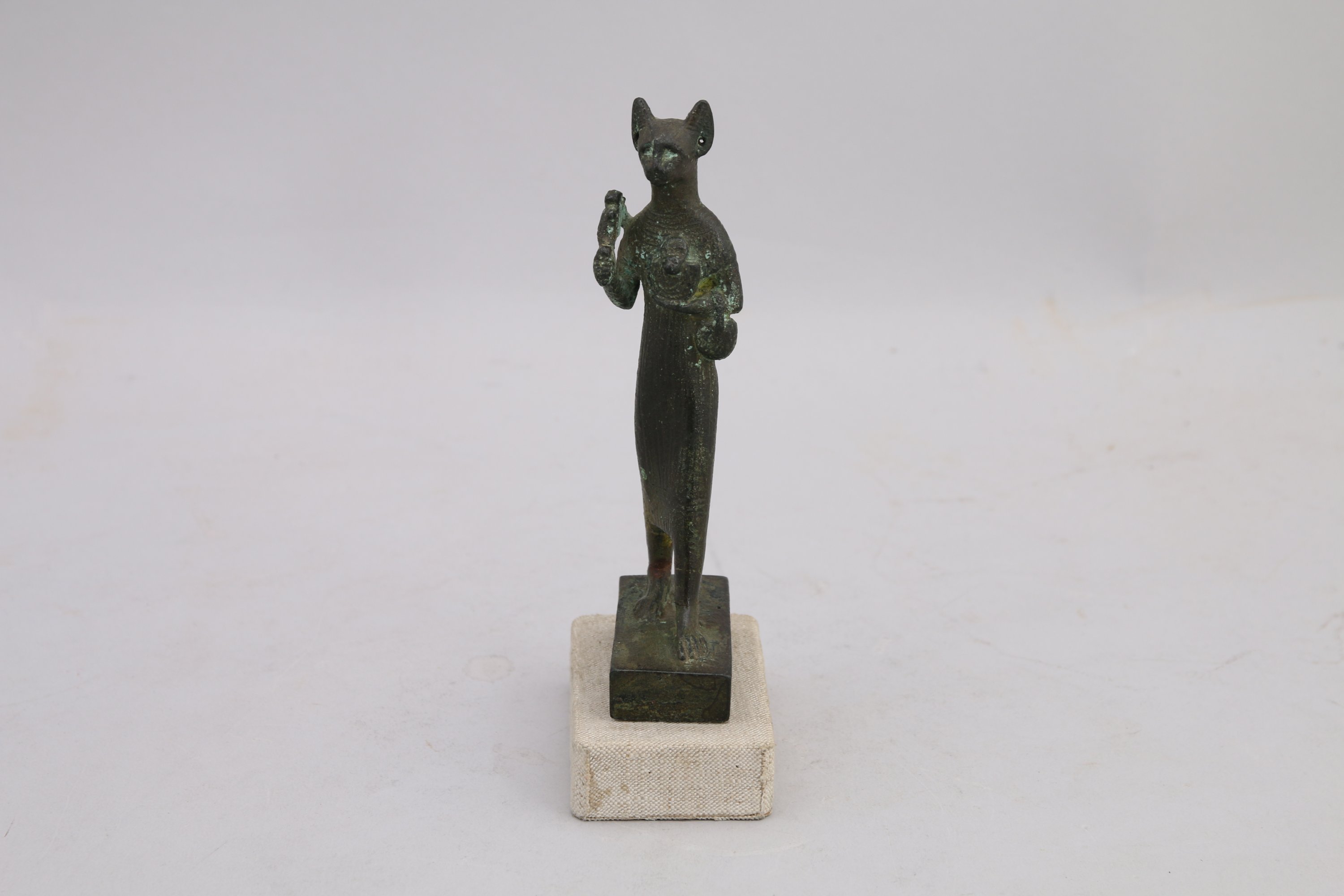 STATUETTE en bronze de la déesse Bastet sous la forme d’une chatte anthropomorphe, le pied gauche en avant, tenant un sistre, une égide et un panier. Oreilles percées pour recevoir des pendentifs.