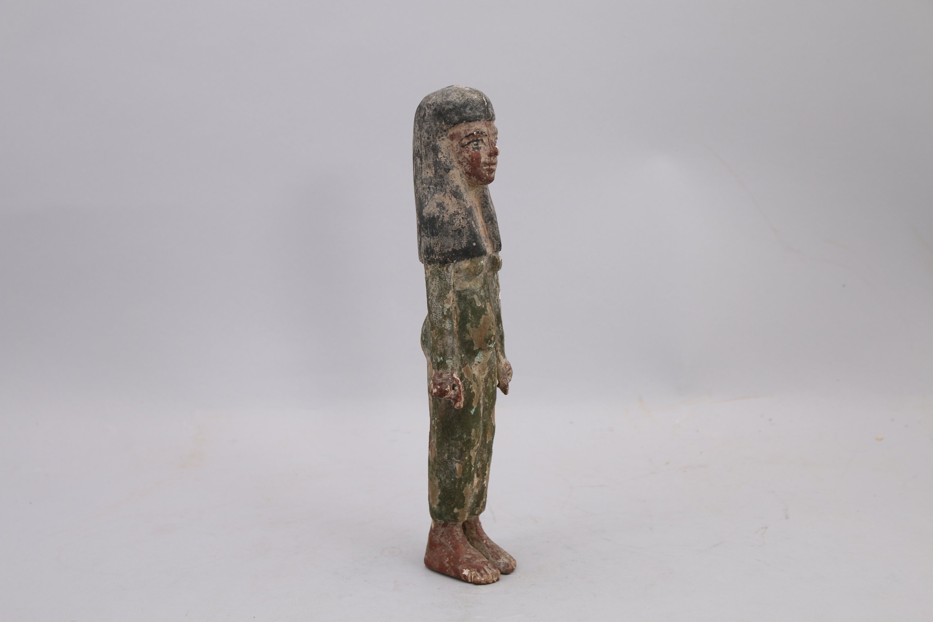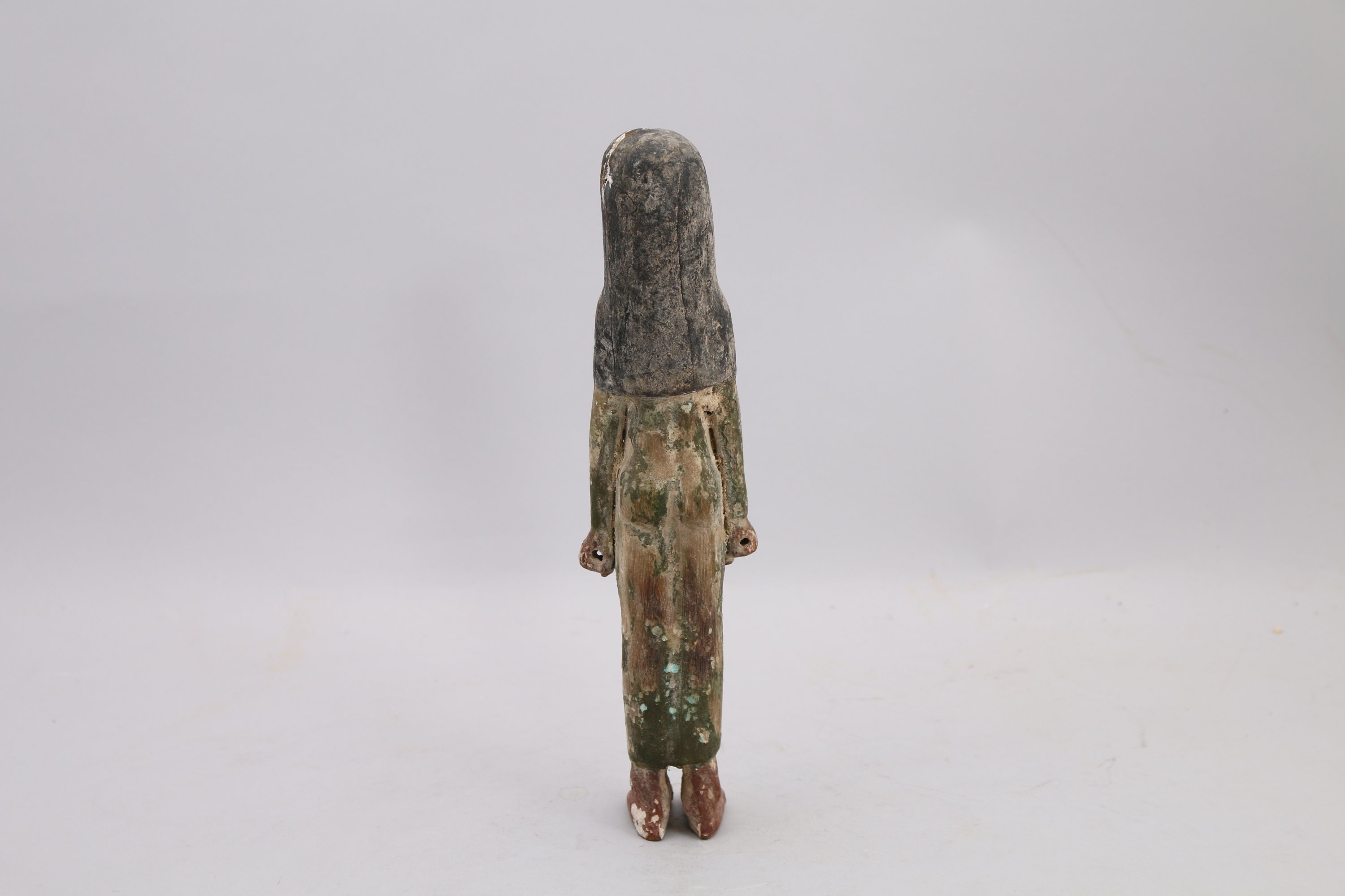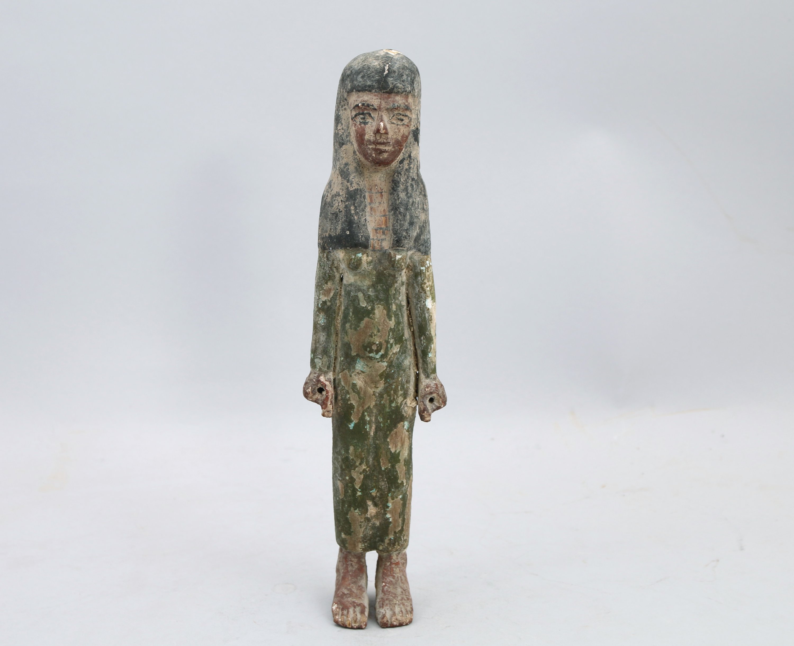 STATUETTE égyptienne en bois stuqué polychrome figurant une femme portant une perruque tripartite et une robe verte, les bras le long du corps. Les seins sont proéminents et le ventre arrondi, à la manière des représentations des reines lagides.