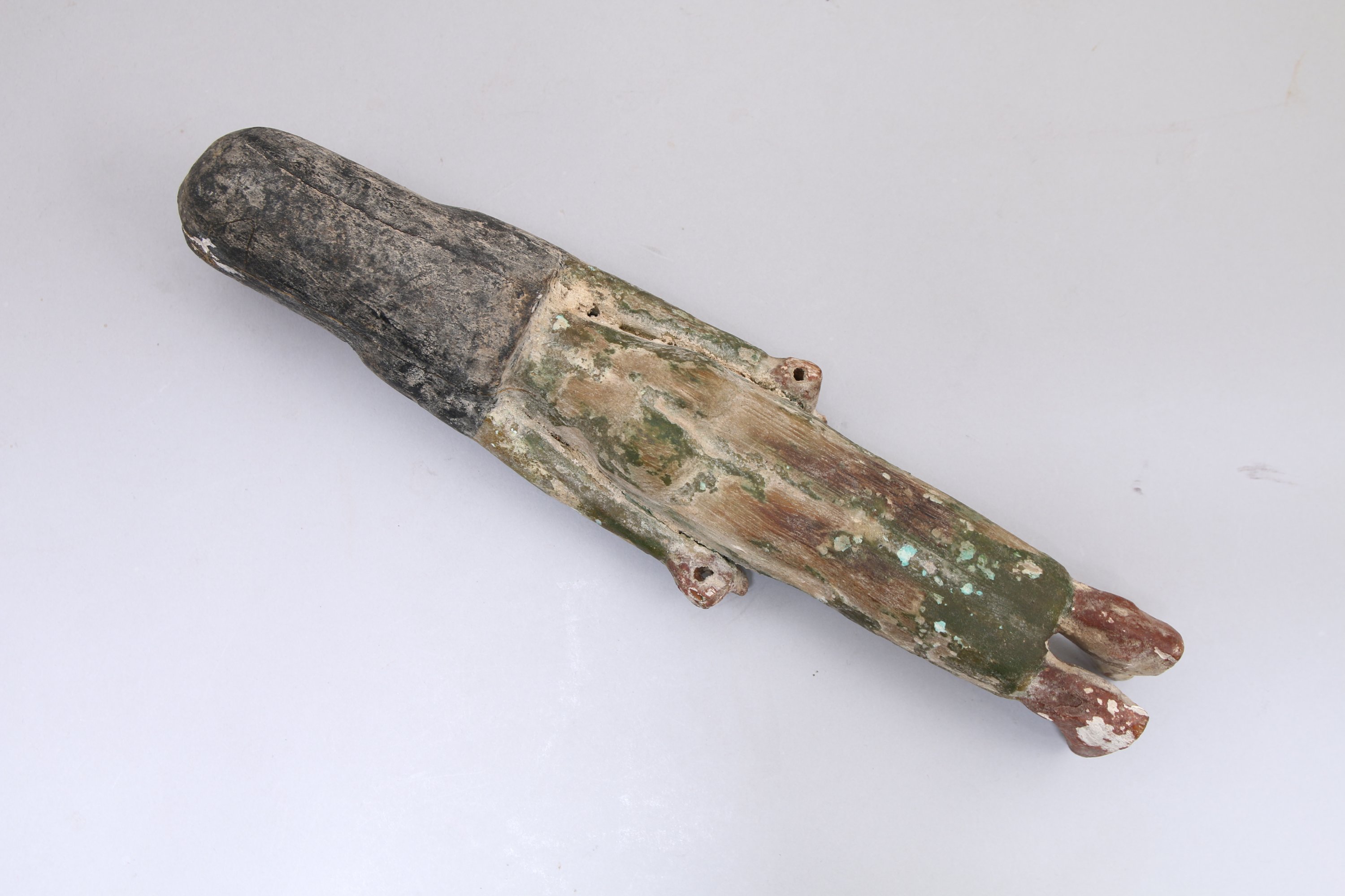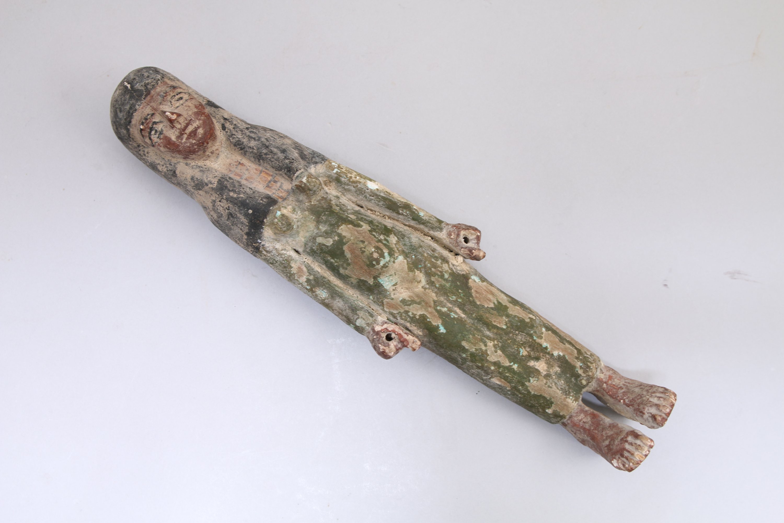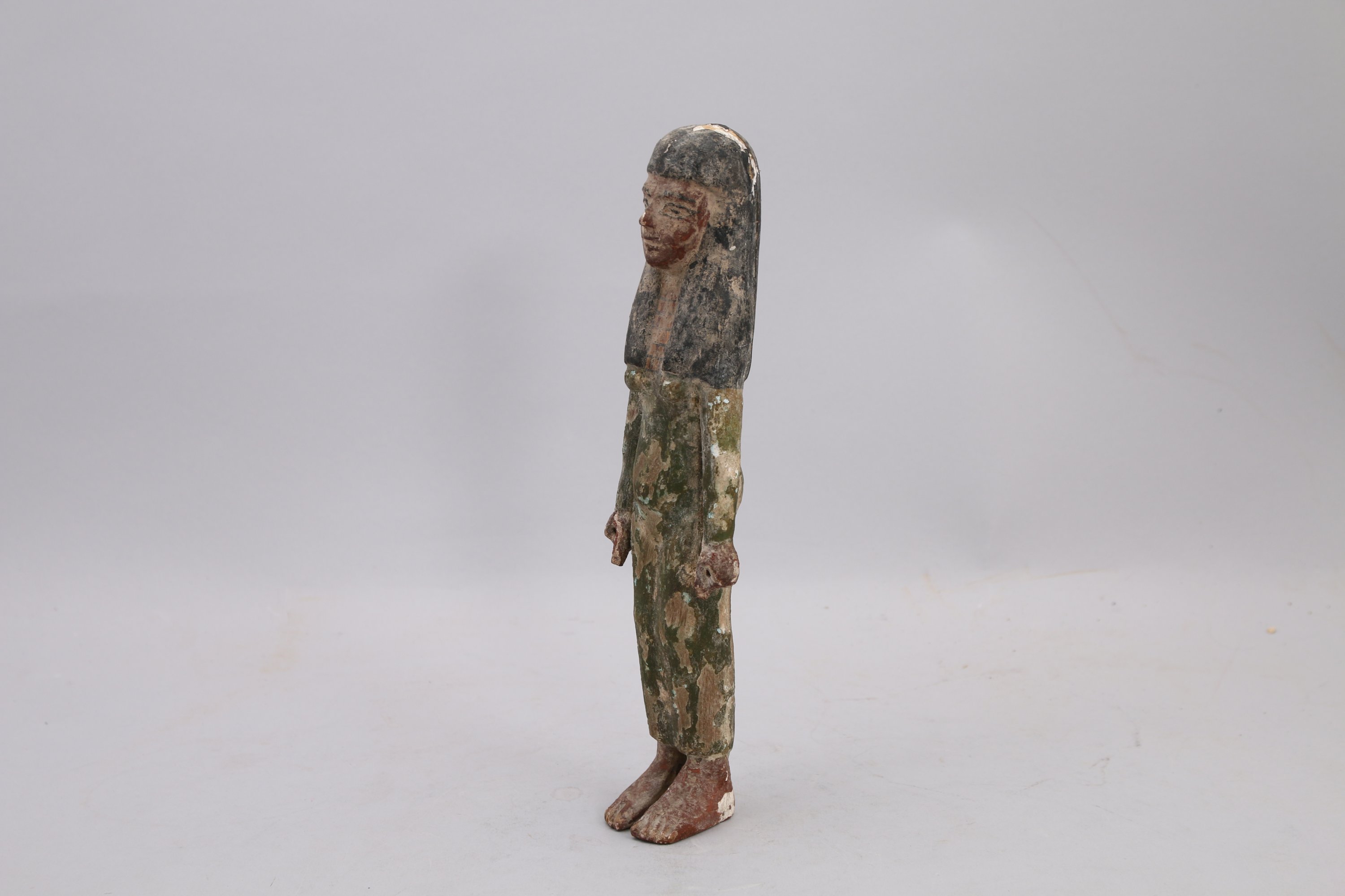 STATUETTE égyptienne en bois stuqué polychrome figurant une femme portant une perruque tripartite et une robe verte, les bras le long du corps. Les seins sont proéminents et le ventre arrondi, à la manière des représentations des reines lagides.