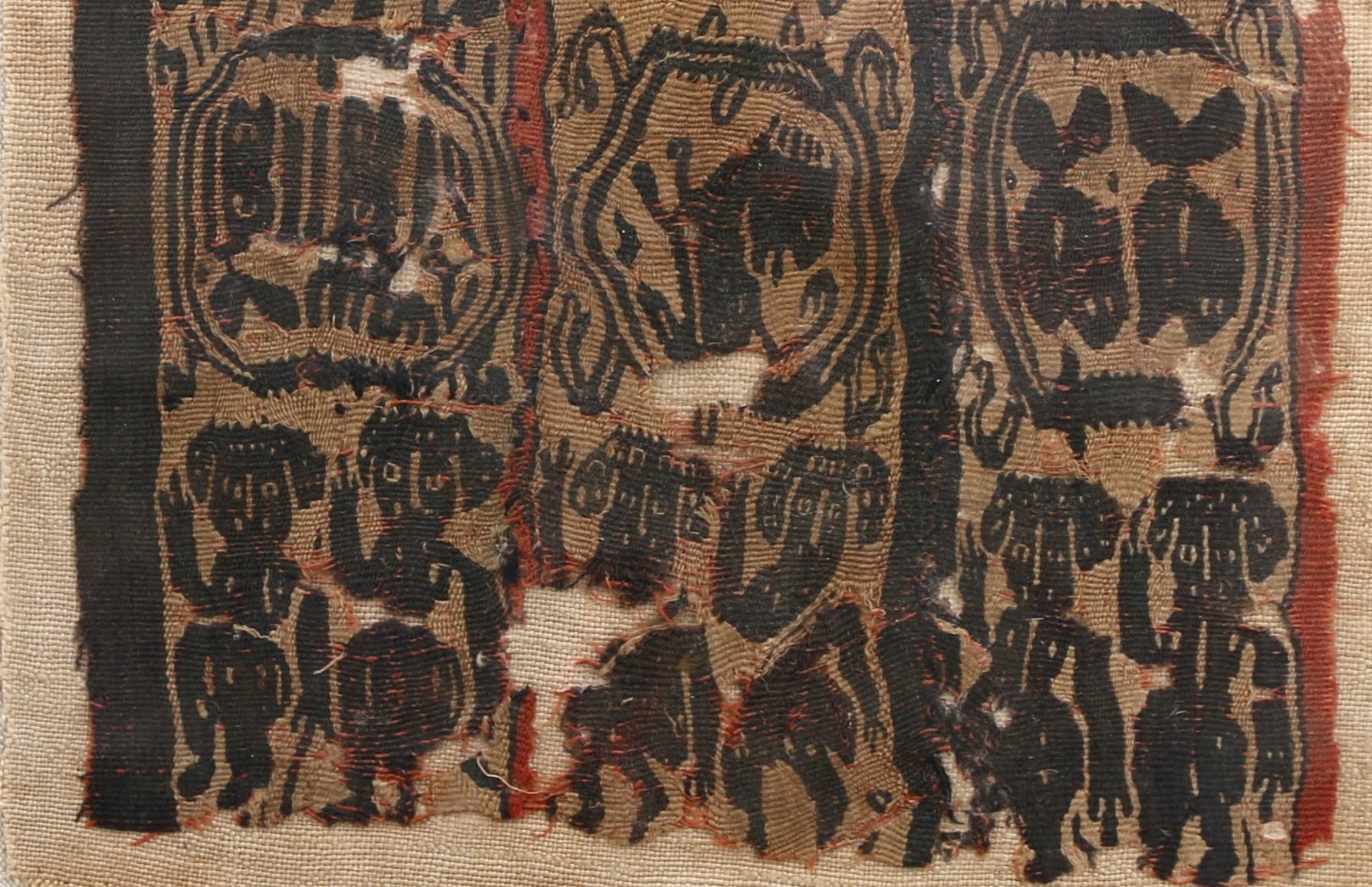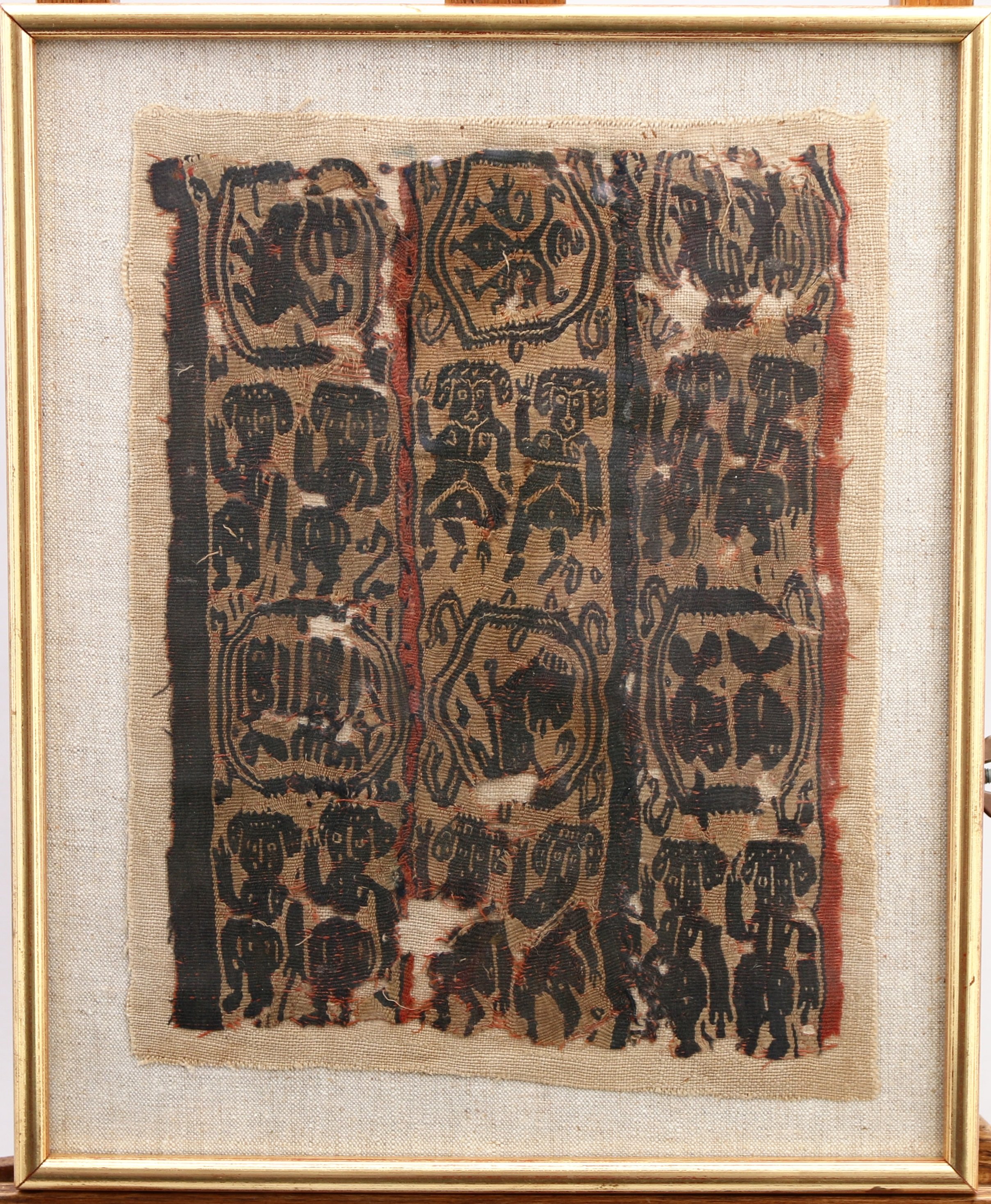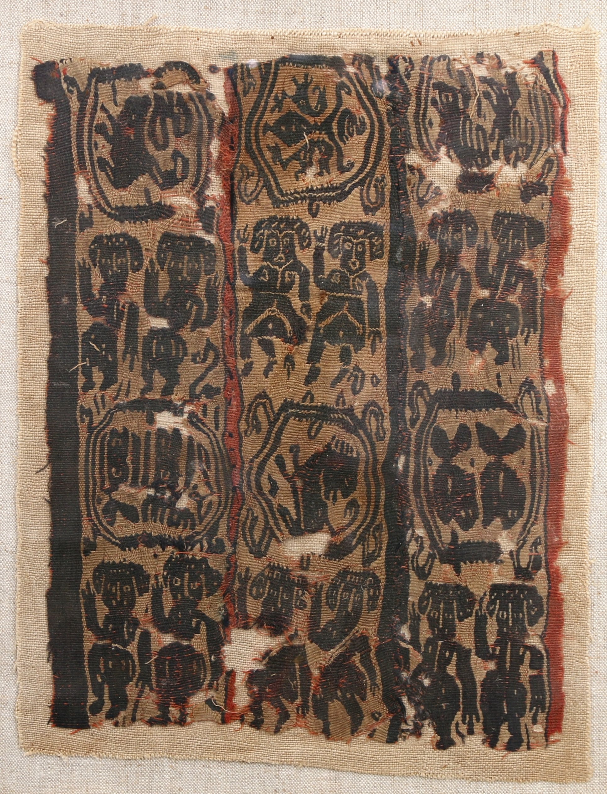 Fragment de tapisserie copte, fond bis, décor noir de trois bandes de personnages et animaux (lion et lapins), poissons ou canards dans des médaillons
