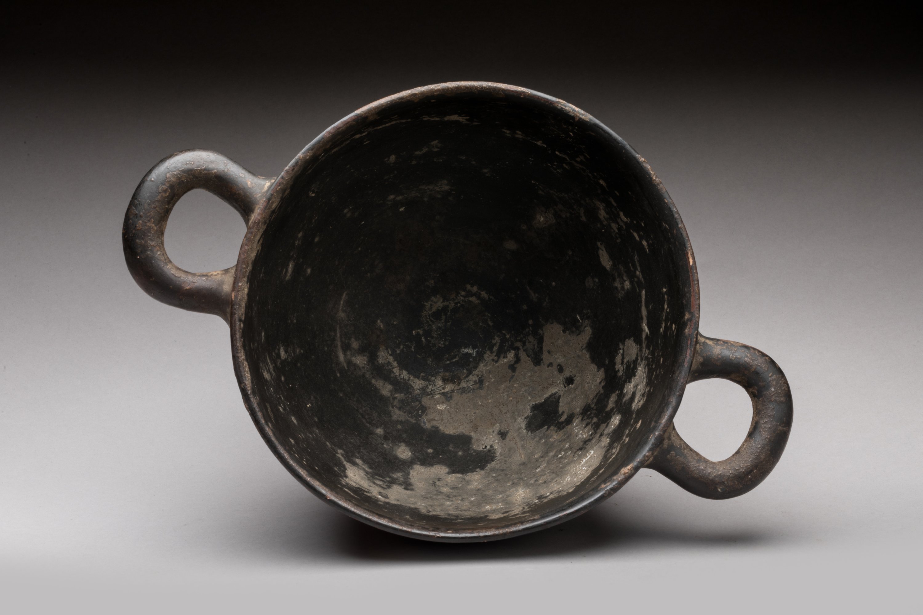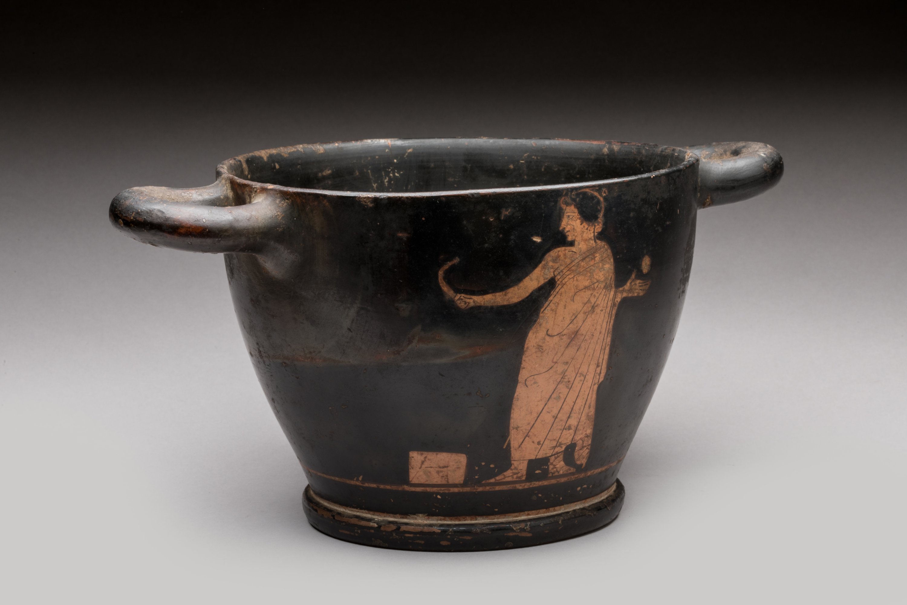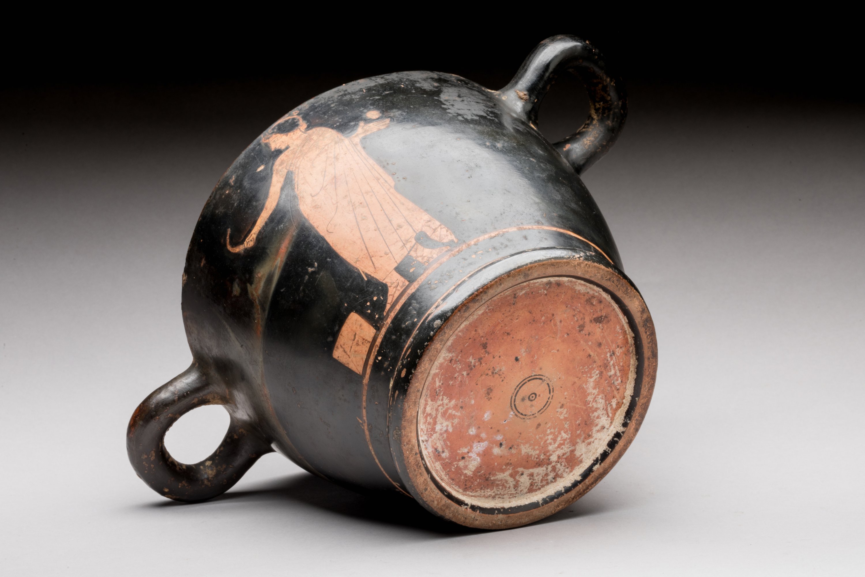 SKYPHOS ATTIQUE à FIGURES ROUGES au JEU de BALLE. Sur une face, un jeune homme vêtu d'un himation, tenant un strigile dans sa main droite et une balle dans sa main gauche, une boîte à ses pieds. Sur l'autre face, une jeune fille drapée regardant dans la direction du jeune homme, une balle et un ustensile suspendus derrière sa tête, une boîte au sol devant elle. Trois cercles peints sous la base.