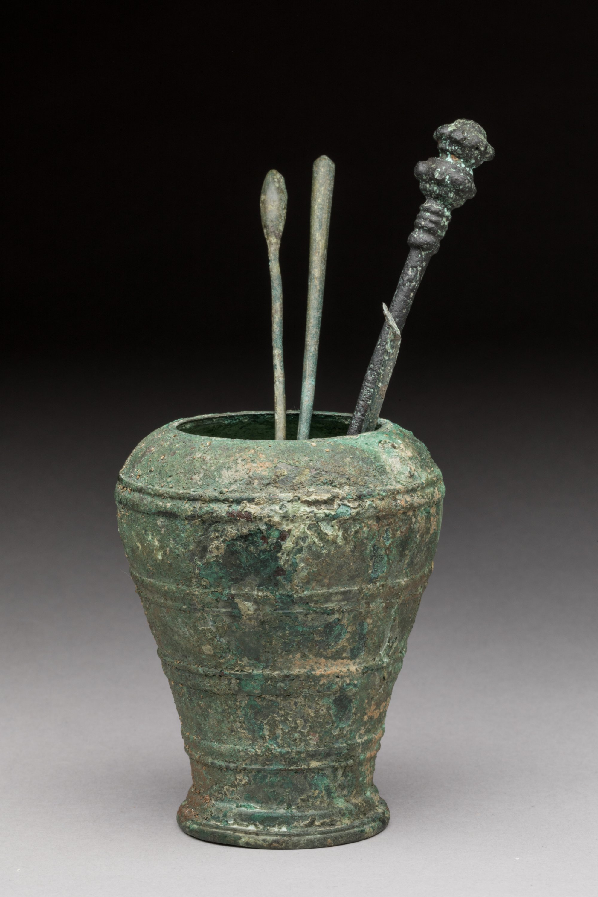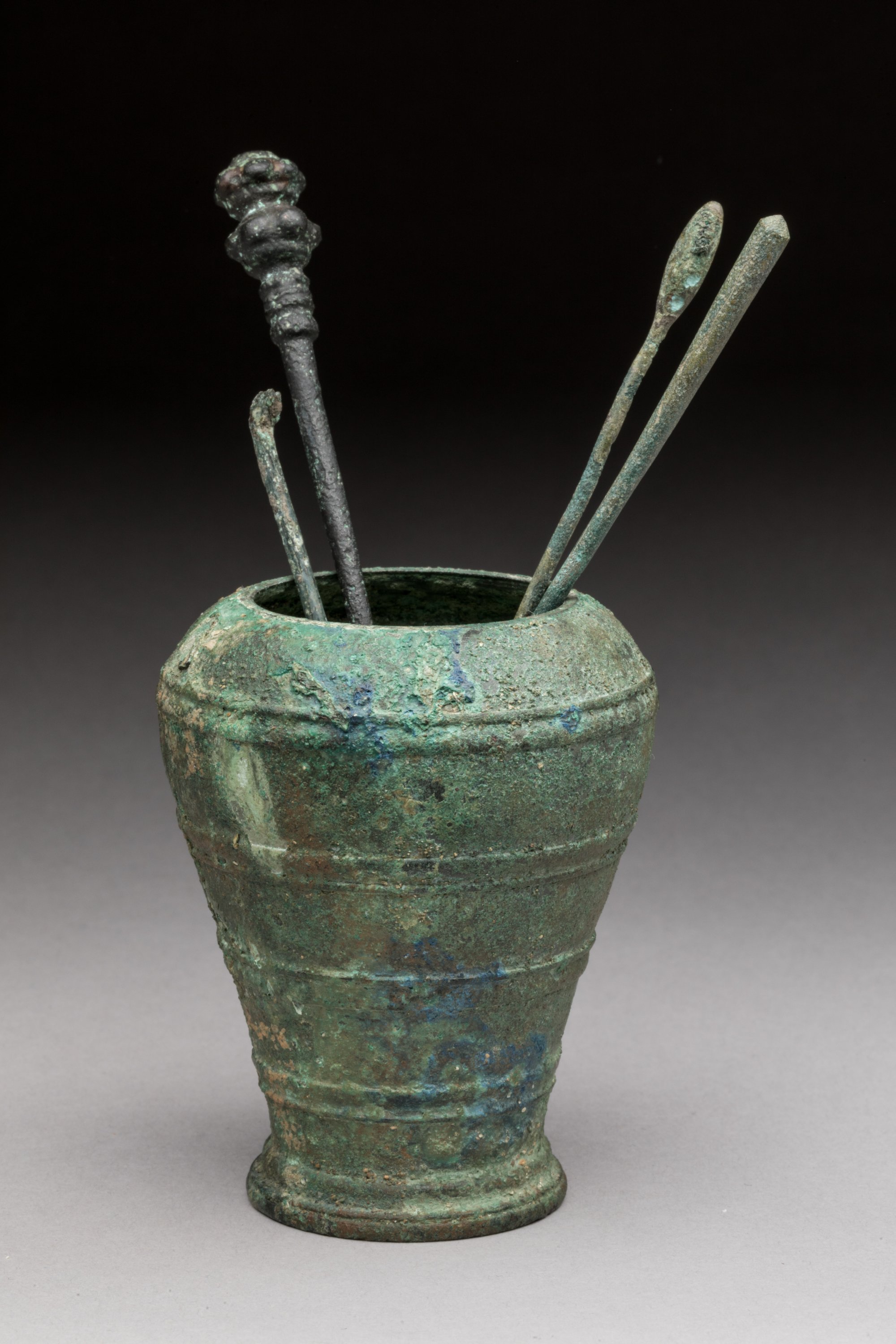 Un petit VASE et quatre AIGUILLES/USTENSILES antiques en bronze.