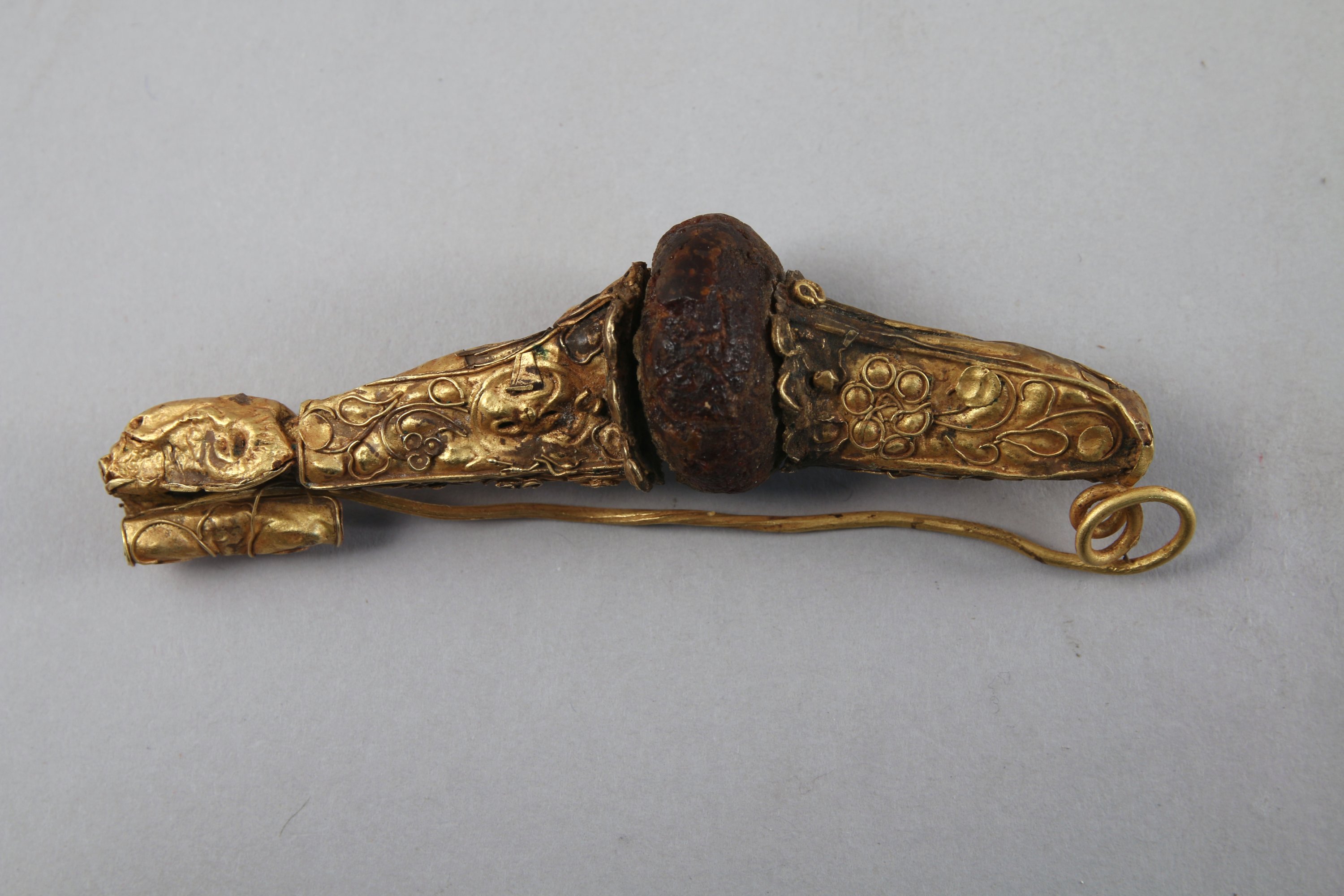 Curieuse FIBULE en or avec une perle dambre et décor de rinceaux, de têtes de Gorgones tirant la langue et dune tête de bélier à la pointe.