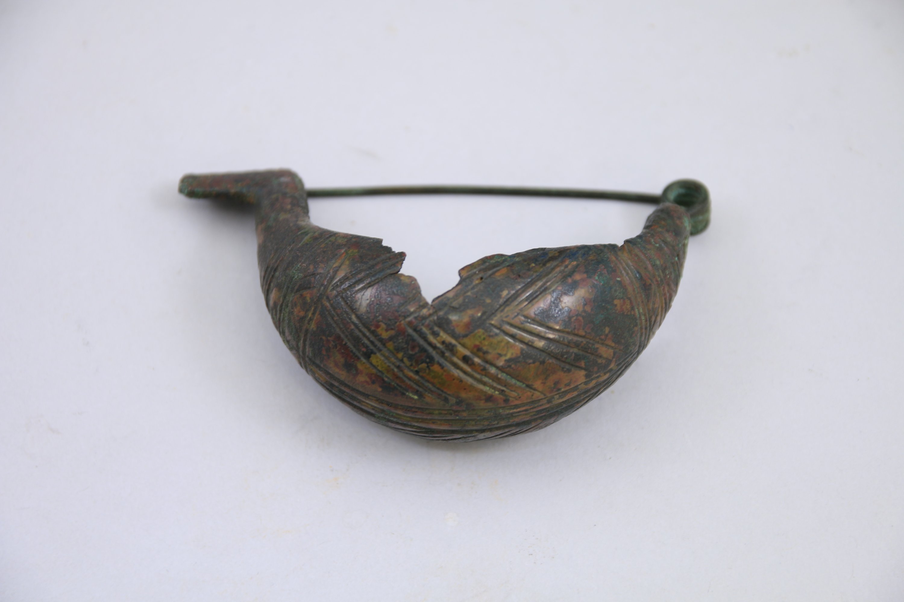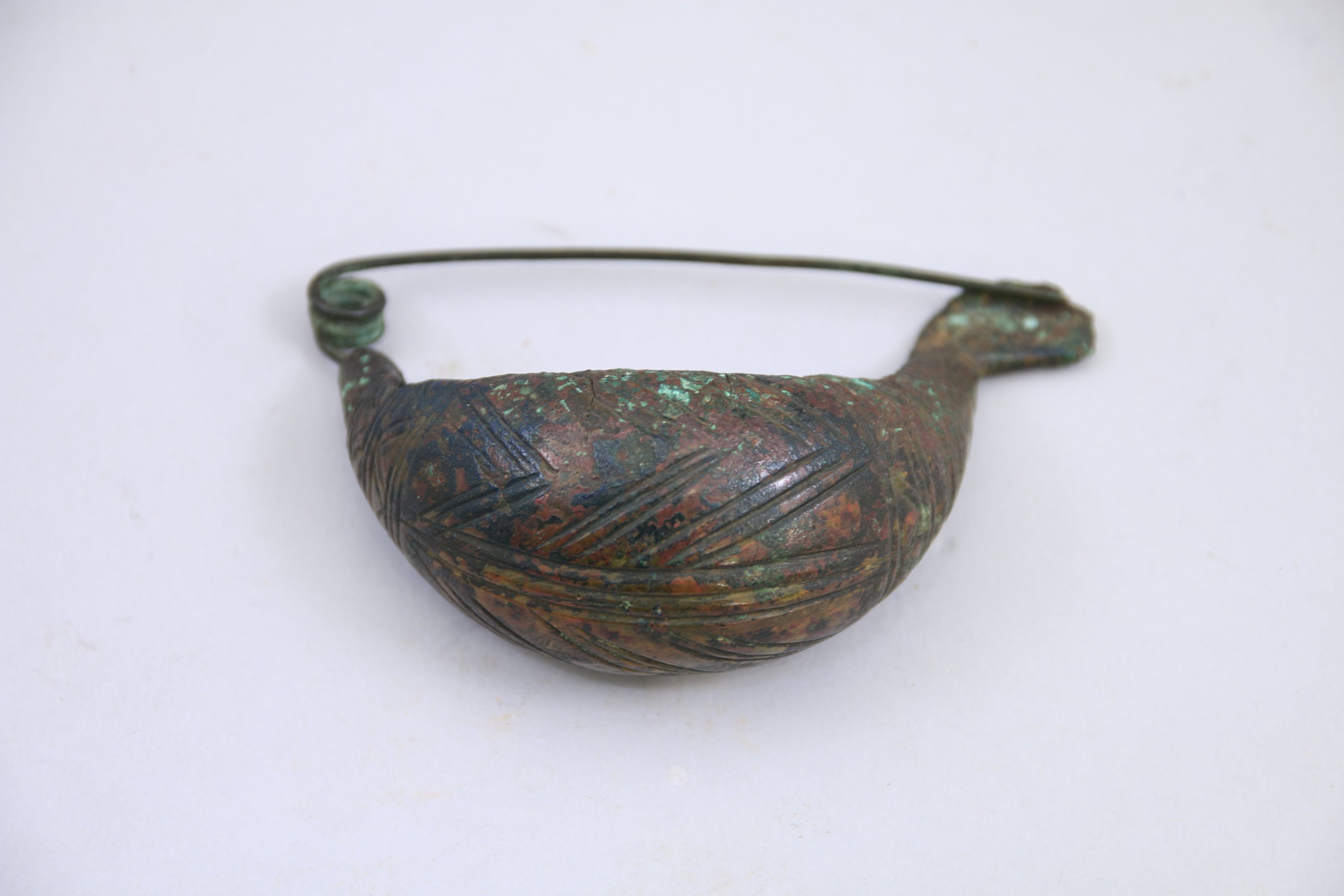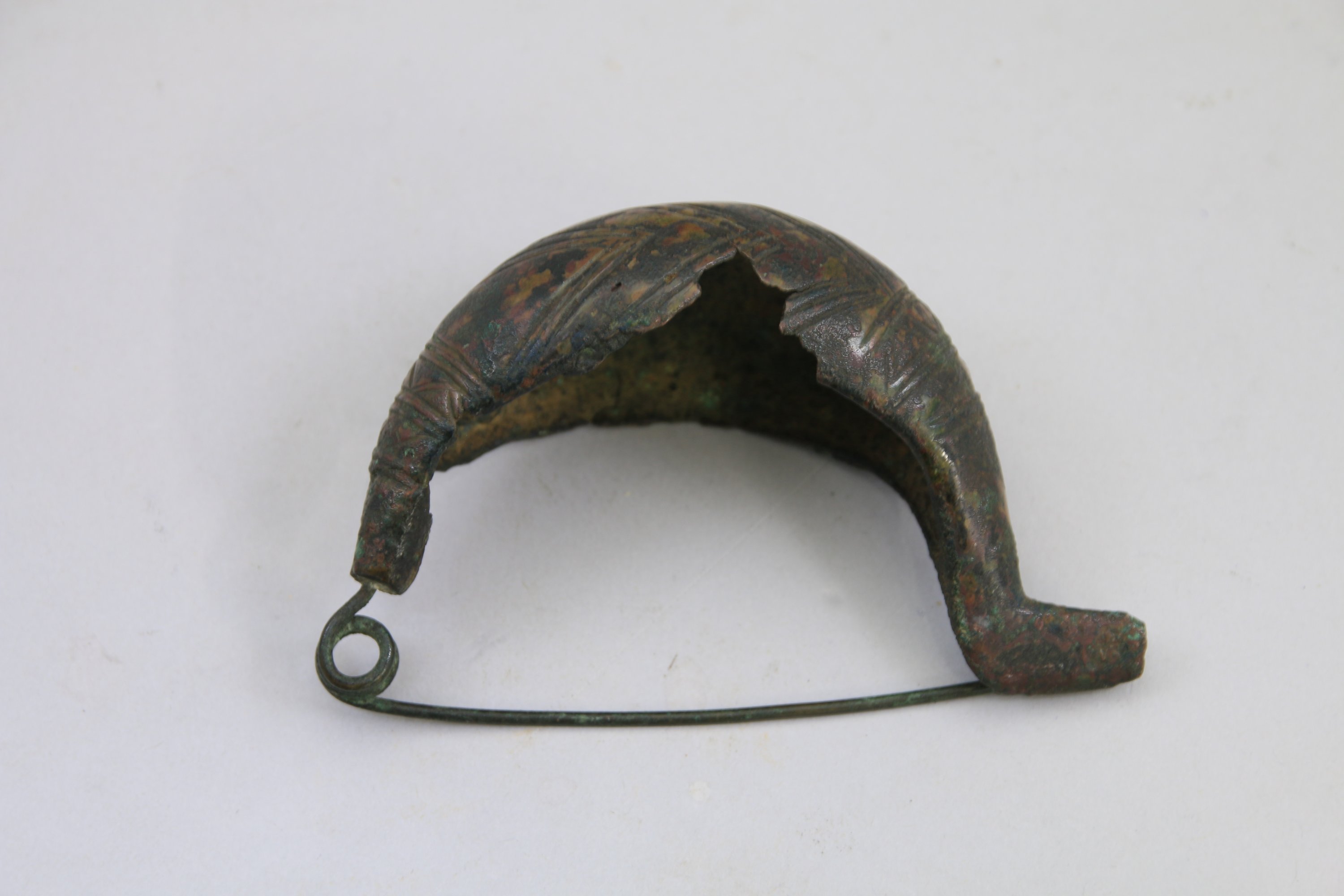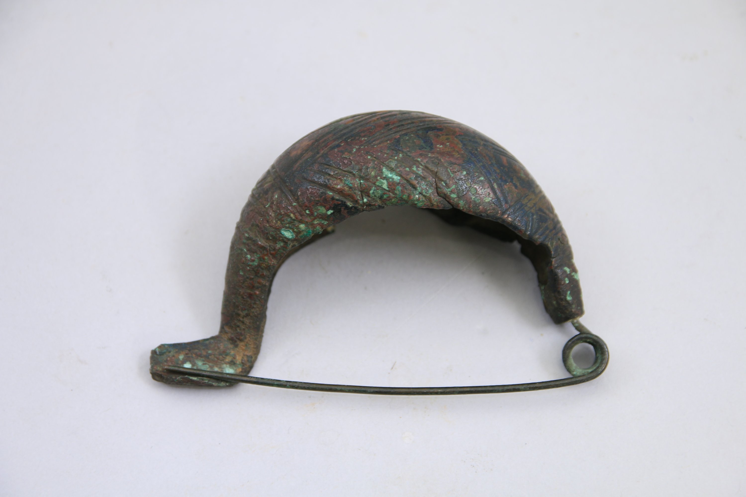 FIBULE « sangsue » en bronze à arc cintré renflé avec décor géométrique incisé.